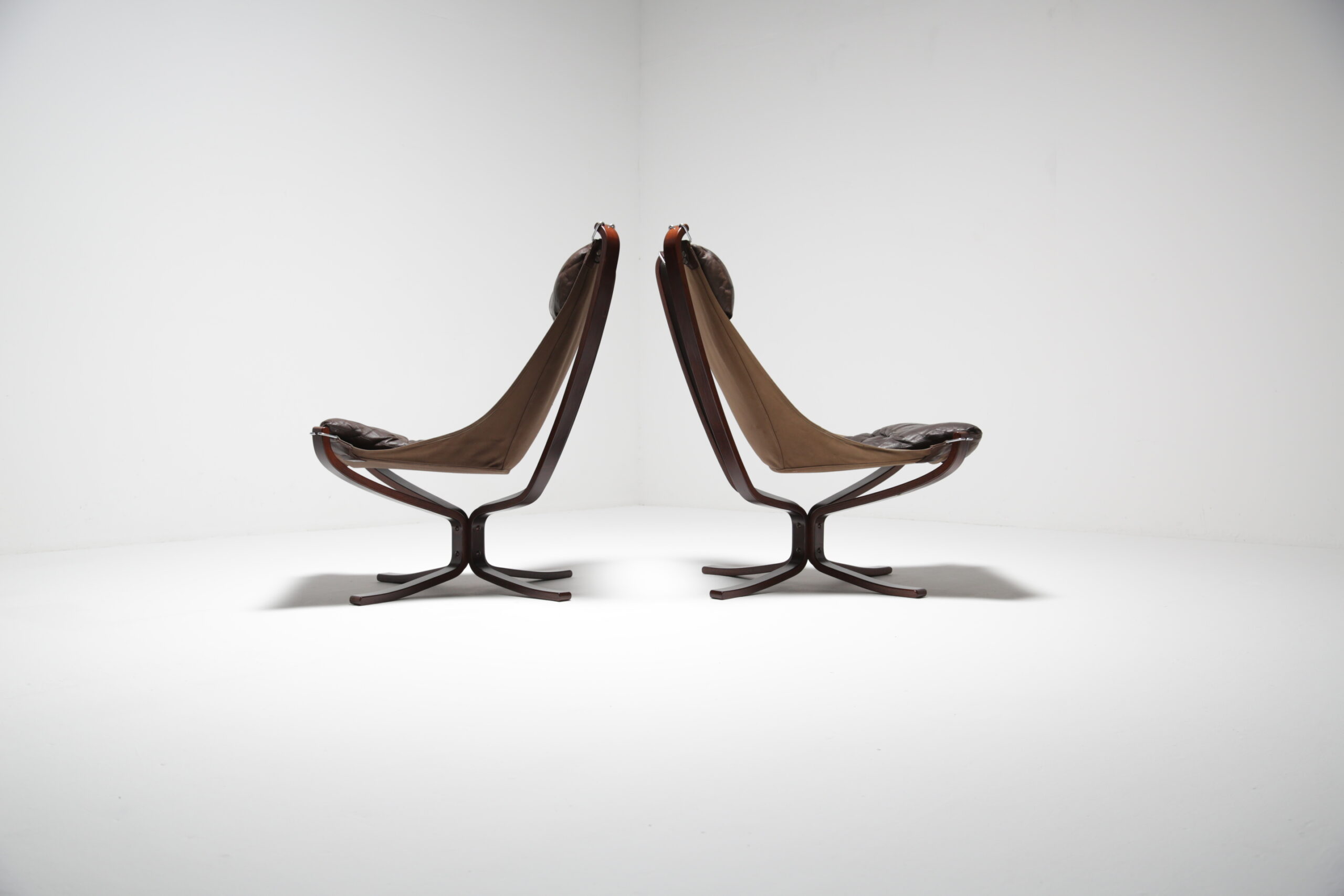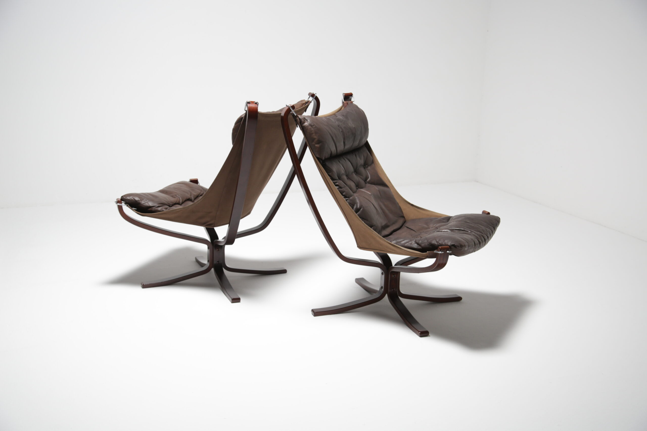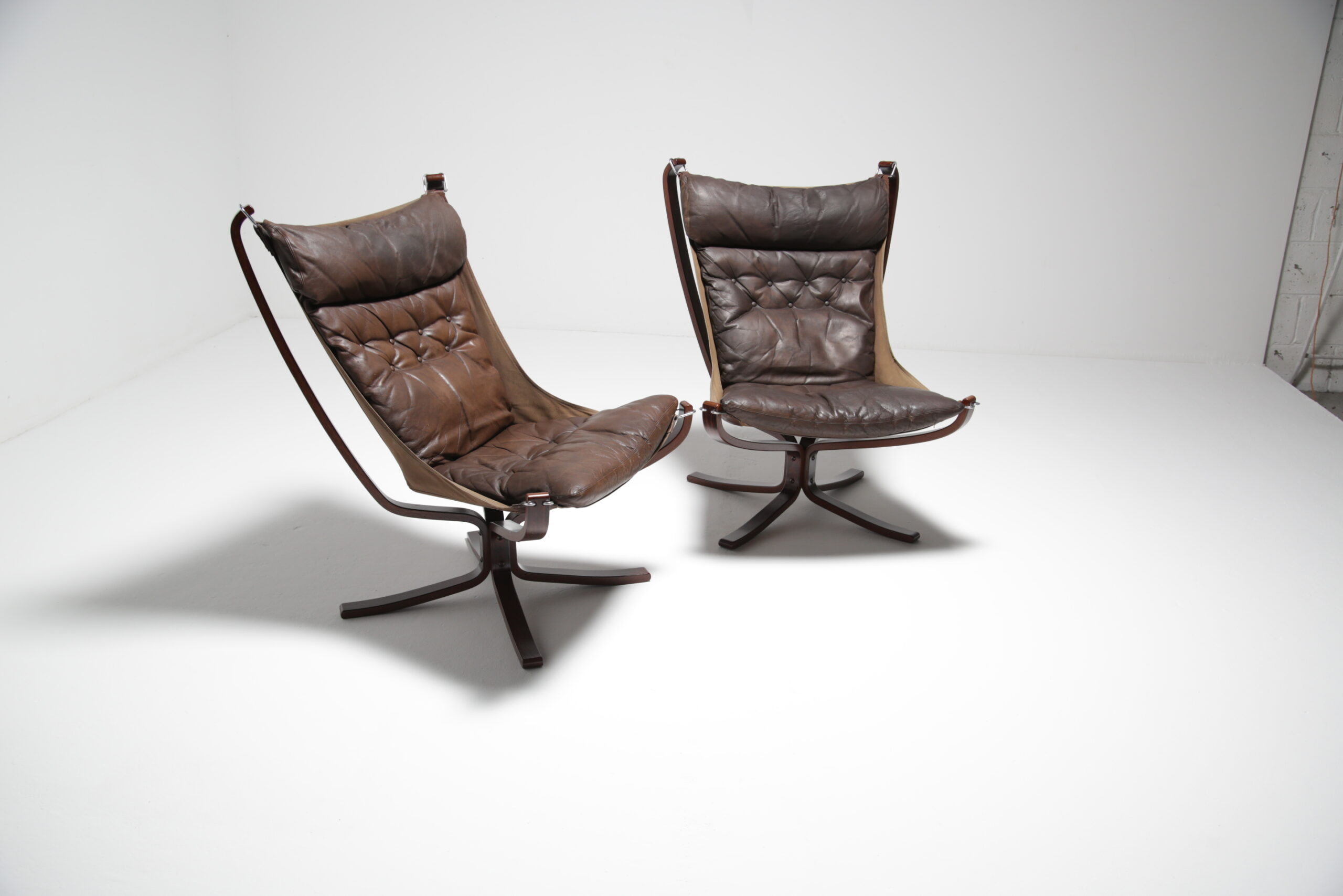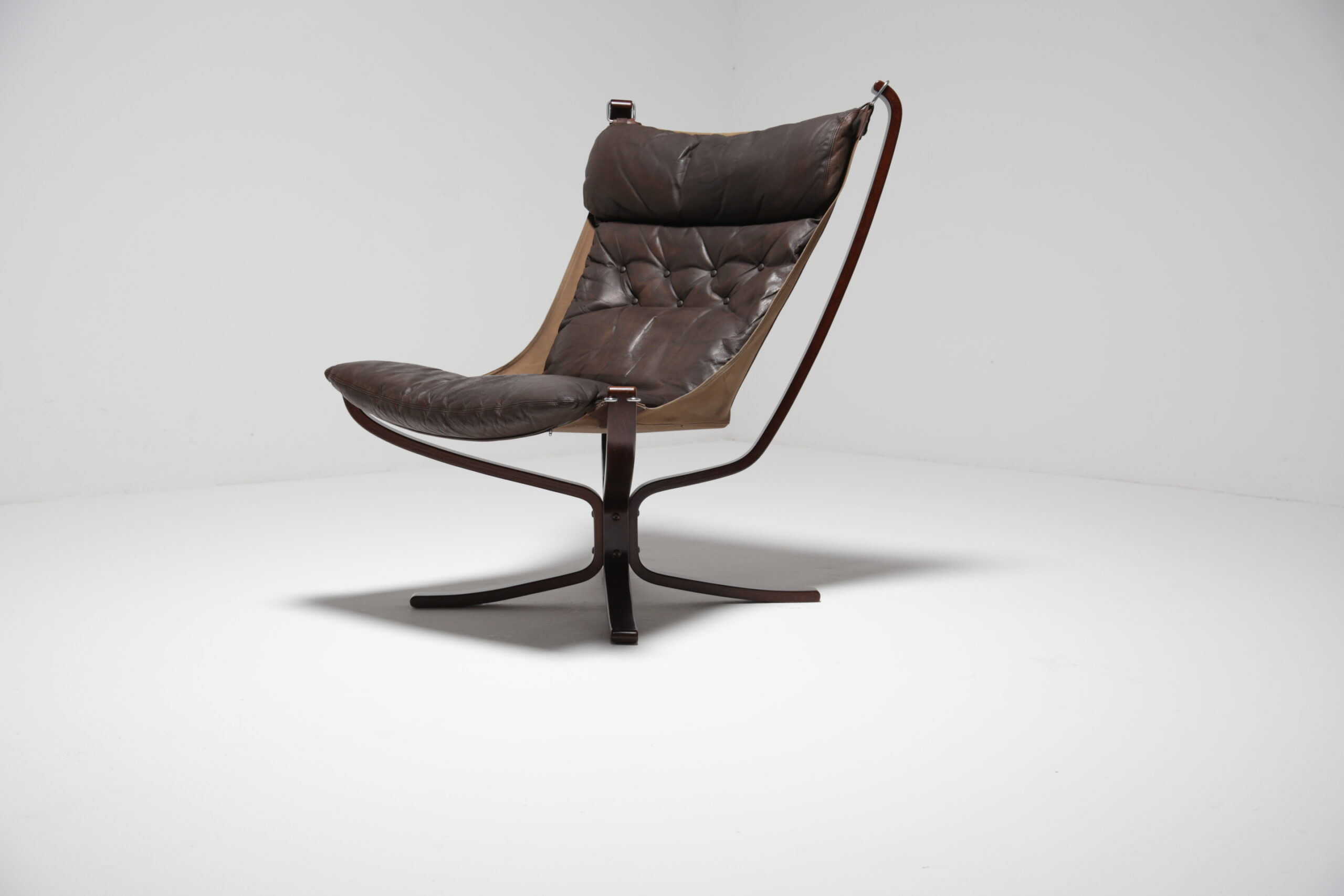 Discover the timeless elegance of our Vintage Brown Leather Falcon Chairs, designed by Sigurd Ressell for Vatne Mobler in the 1970s. These high-back chairs, featuring stained beech bentwood frames and original brown buttoned leather, blend iconic design with unmatched comfort. Fully restored to their former glory. They promise a unique seating experience that adds a touch of vintage charm to any space.