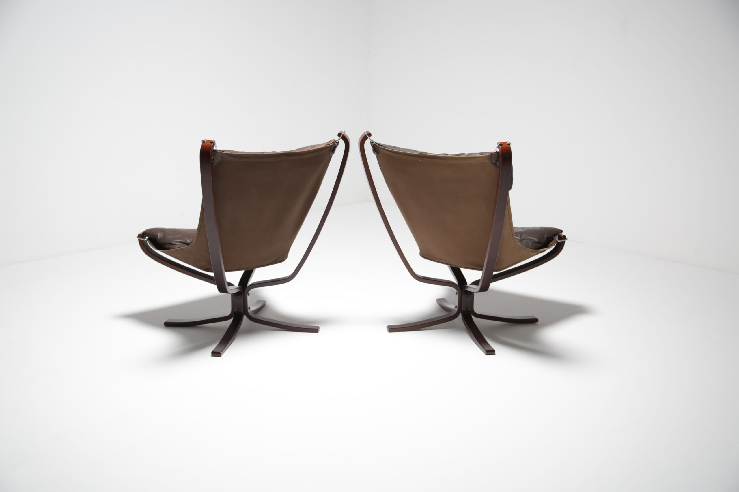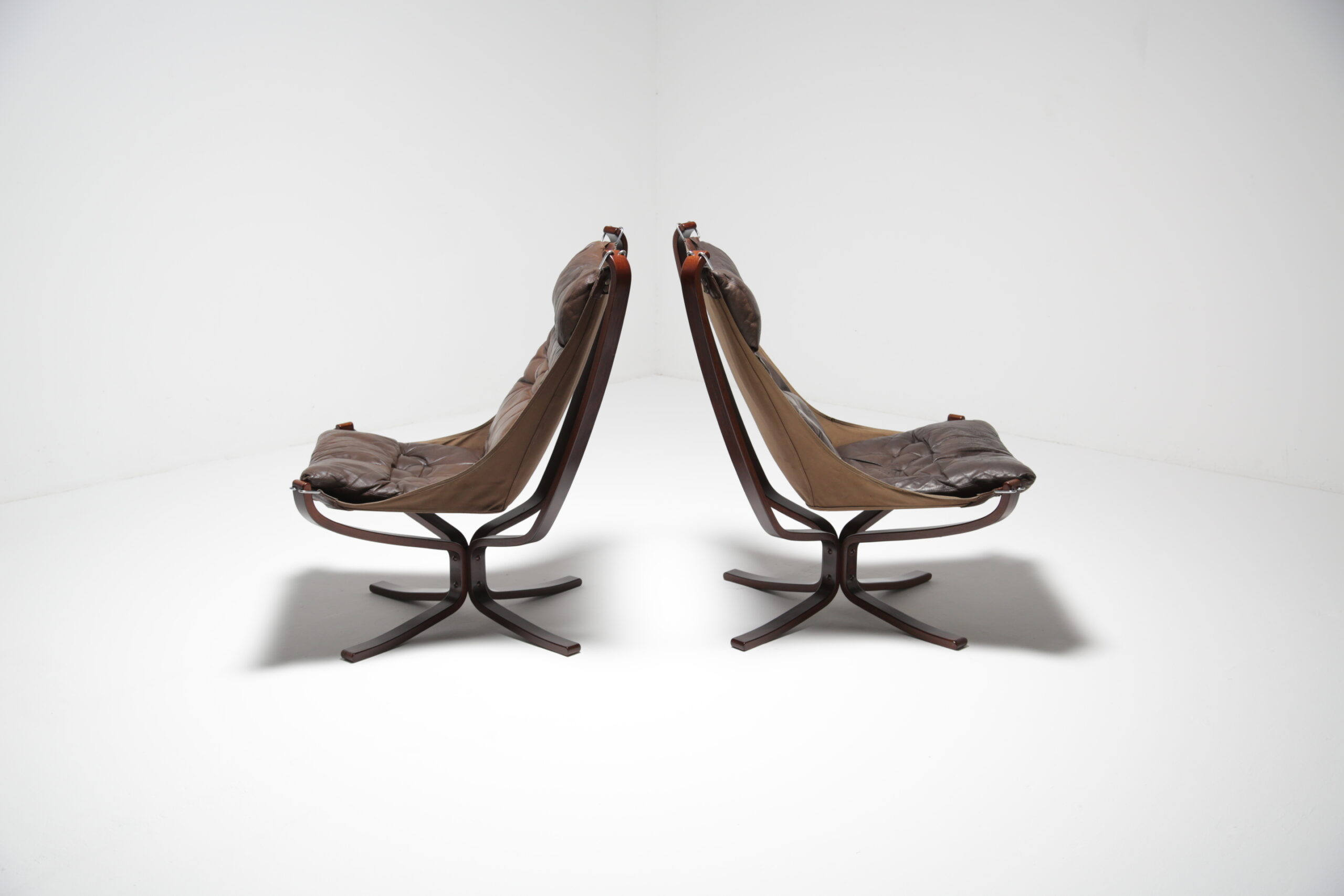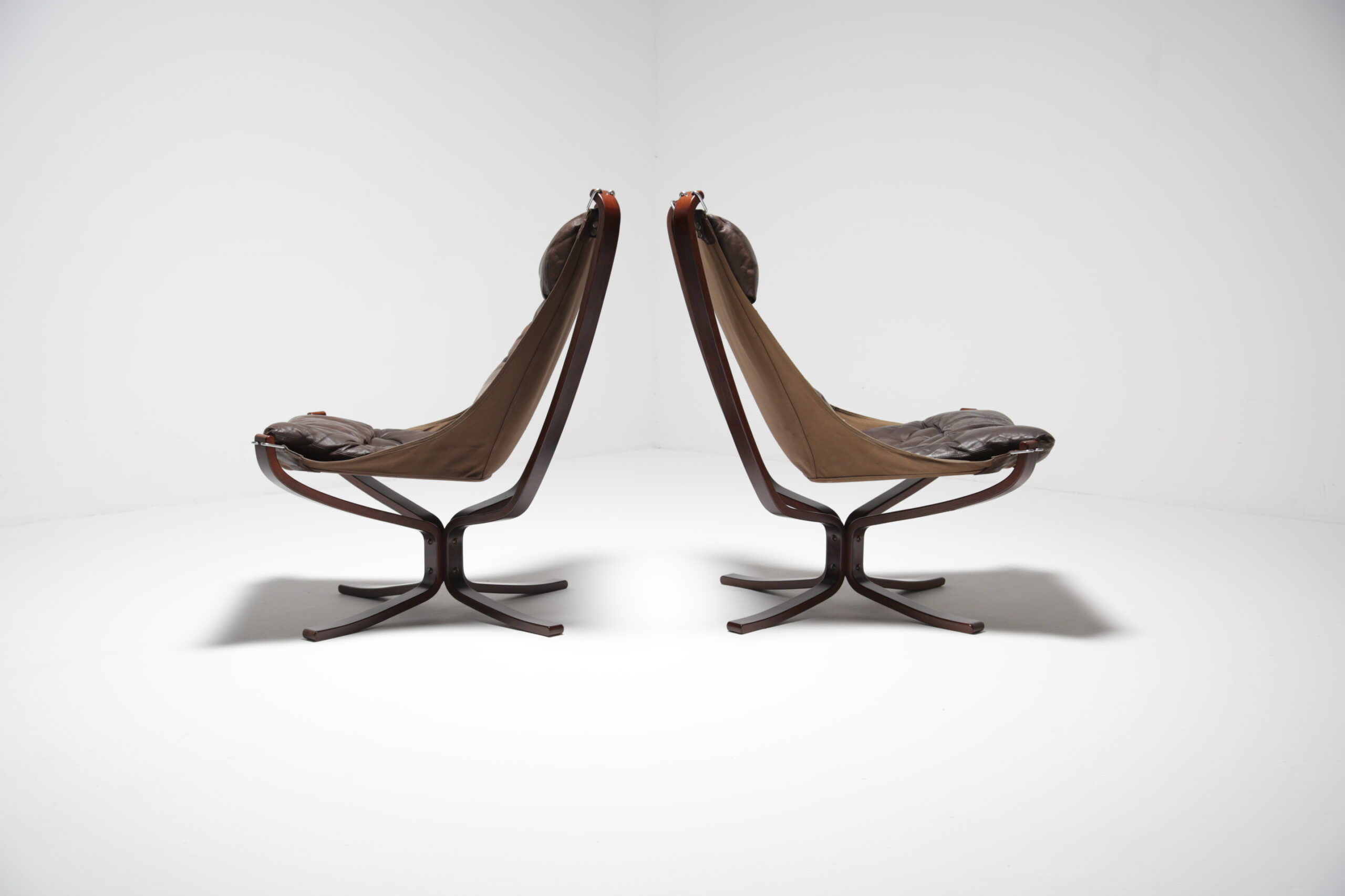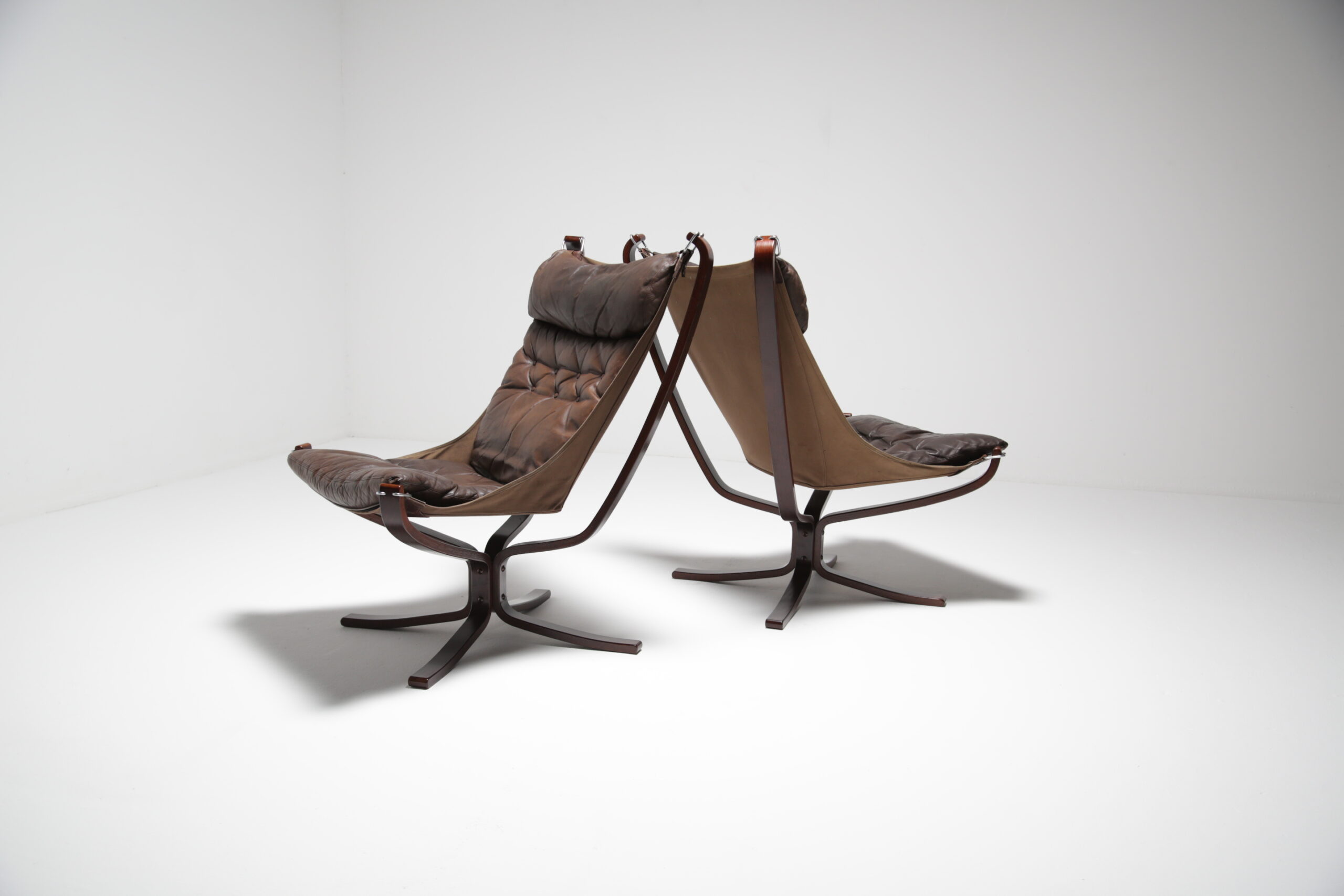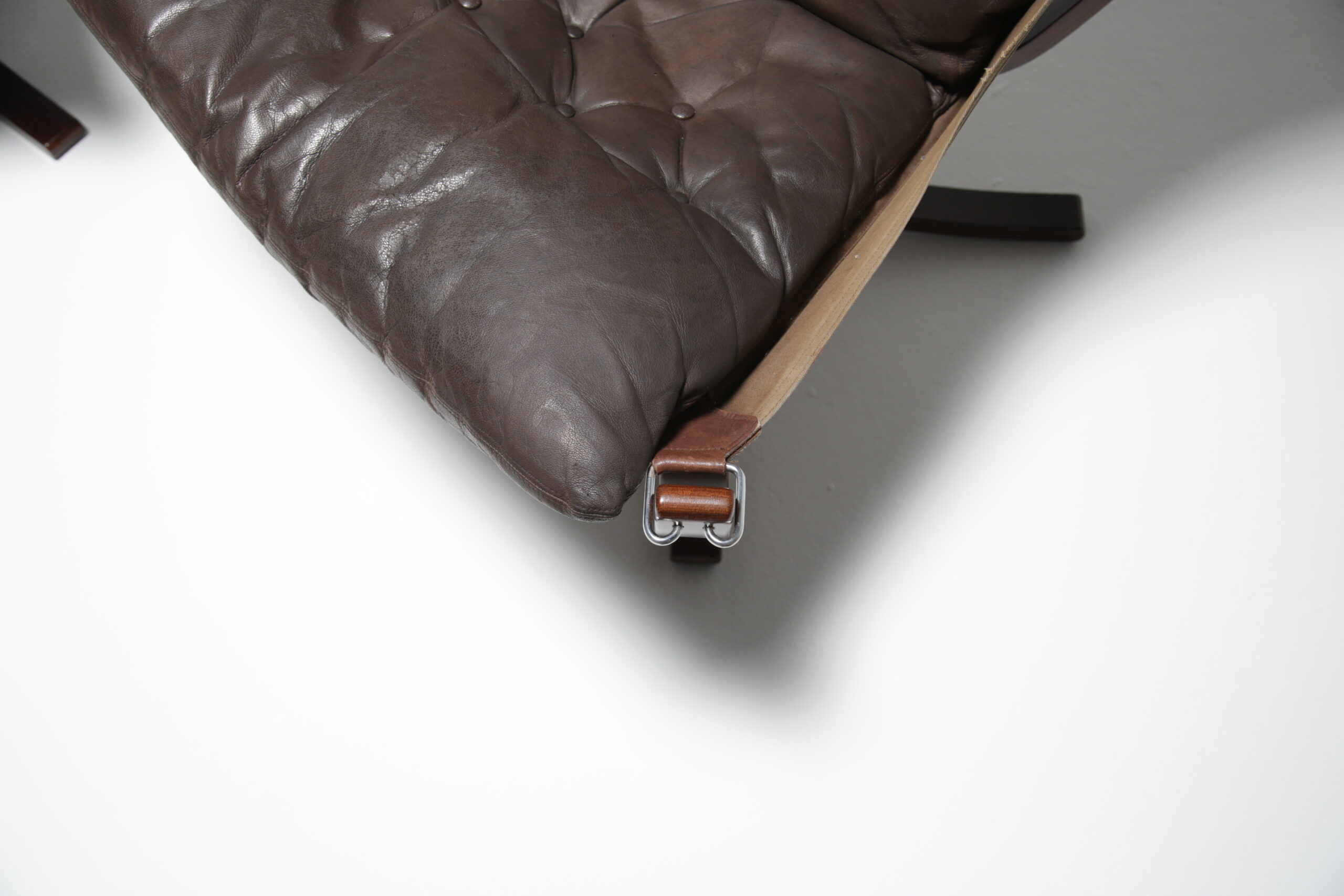 Discover the timeless elegance of our Vintage Brown Leather Falcon Chairs, designed by Sigurd Ressell for Vatne Mobler in the 1970s. These high-back chairs, featuring stained beech bentwood frames and original brown buttoned leather, blend iconic design with unmatched comfort. Fully restored to their former glory. They promise a unique seating experience that adds a touch of vintage charm to any space.