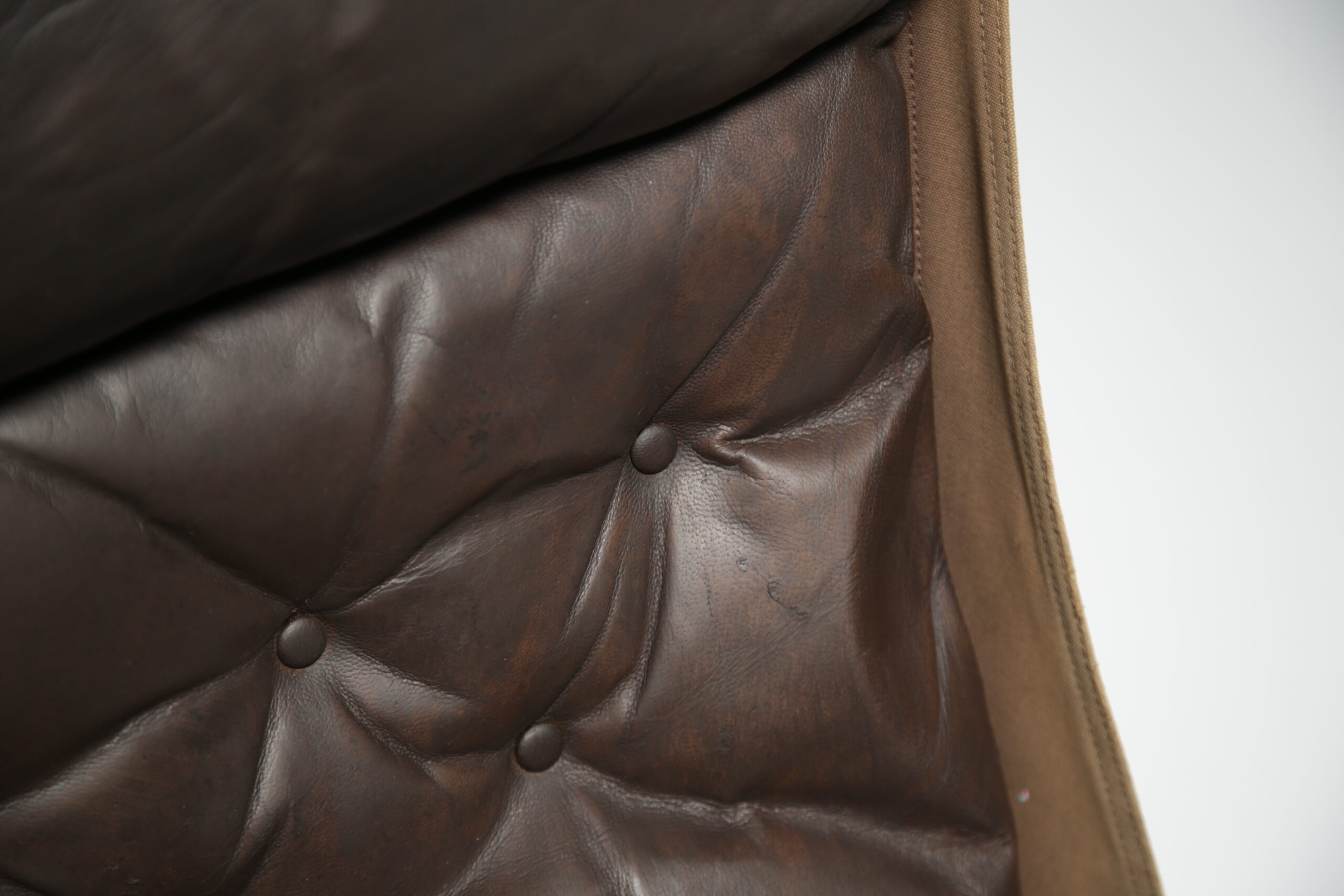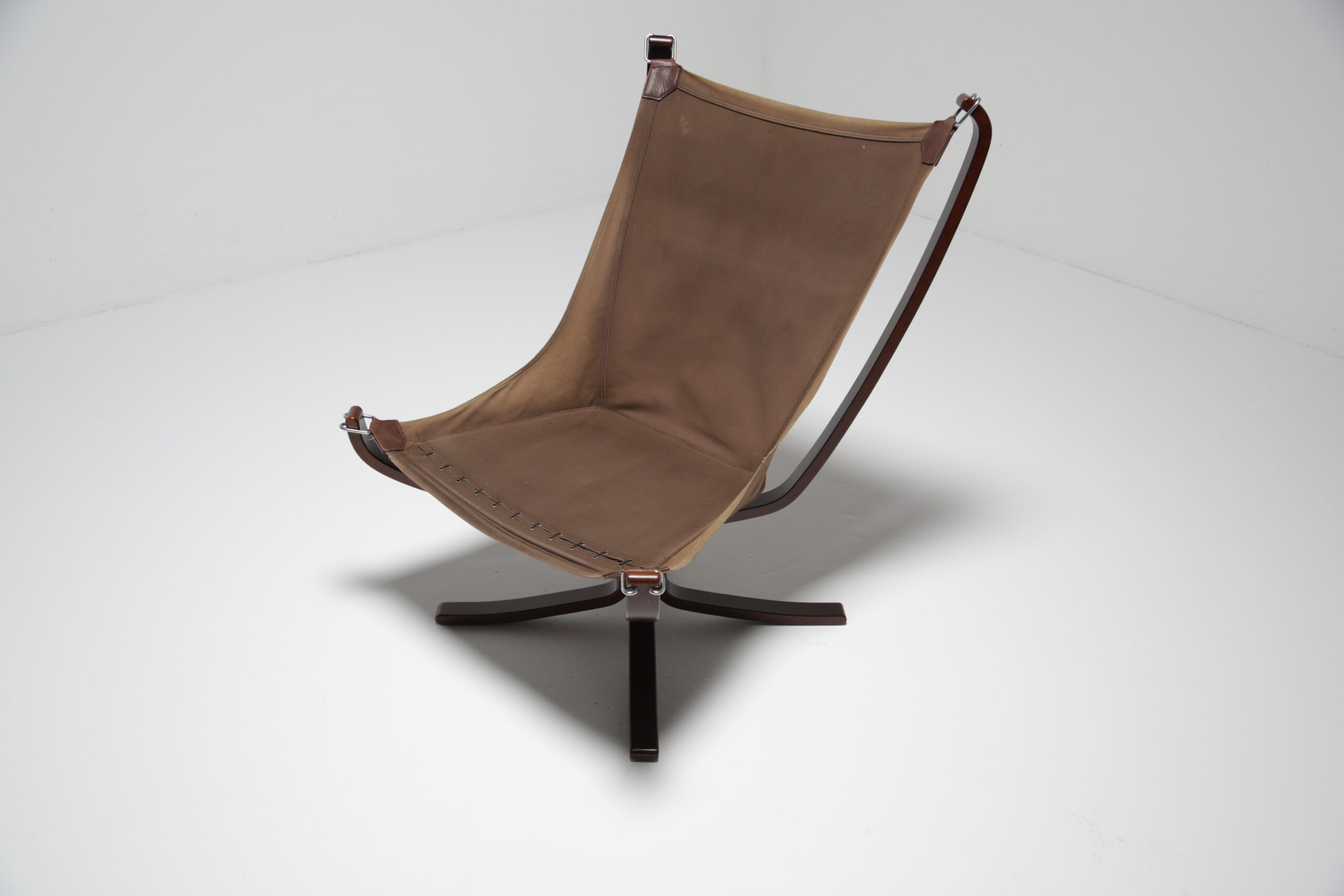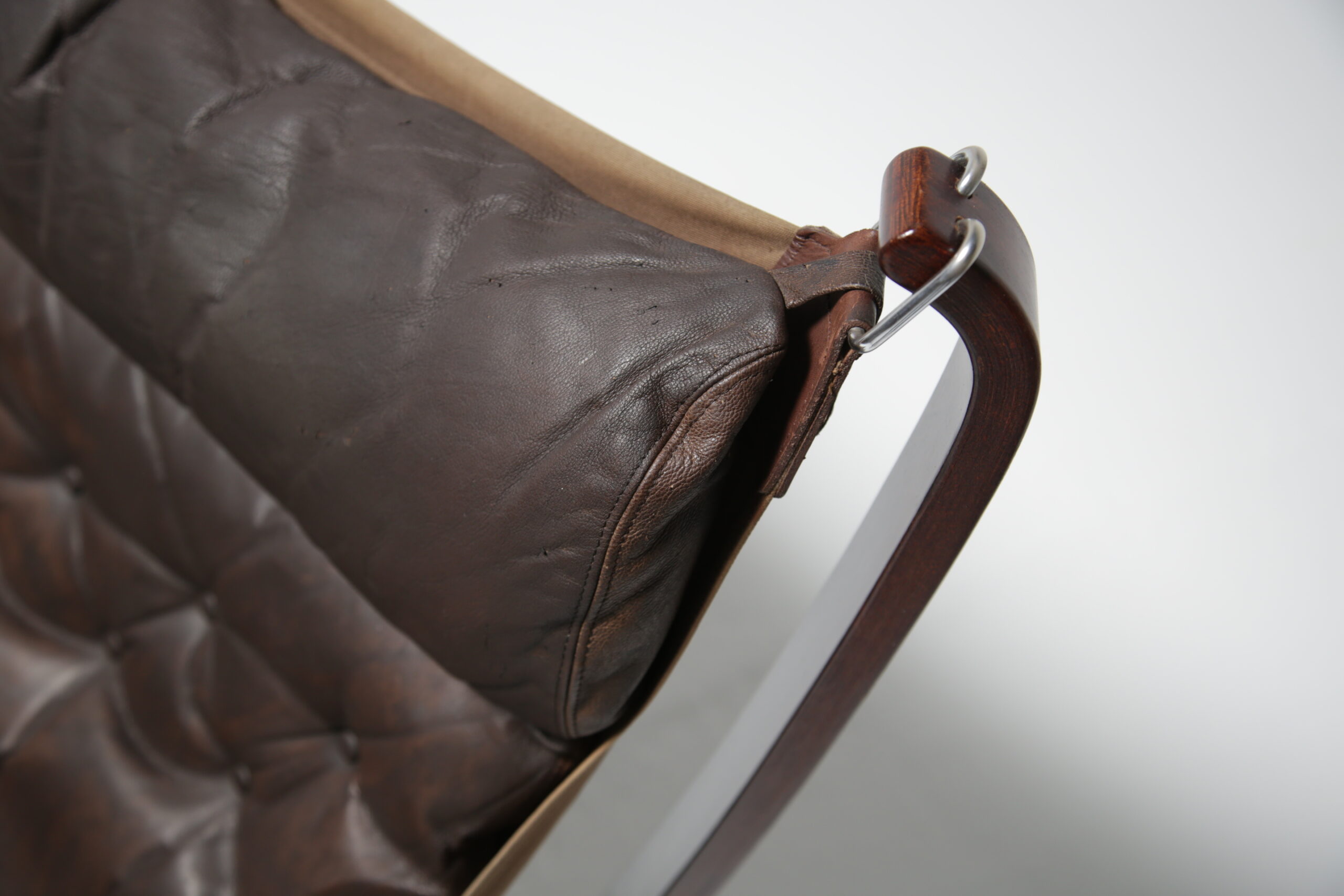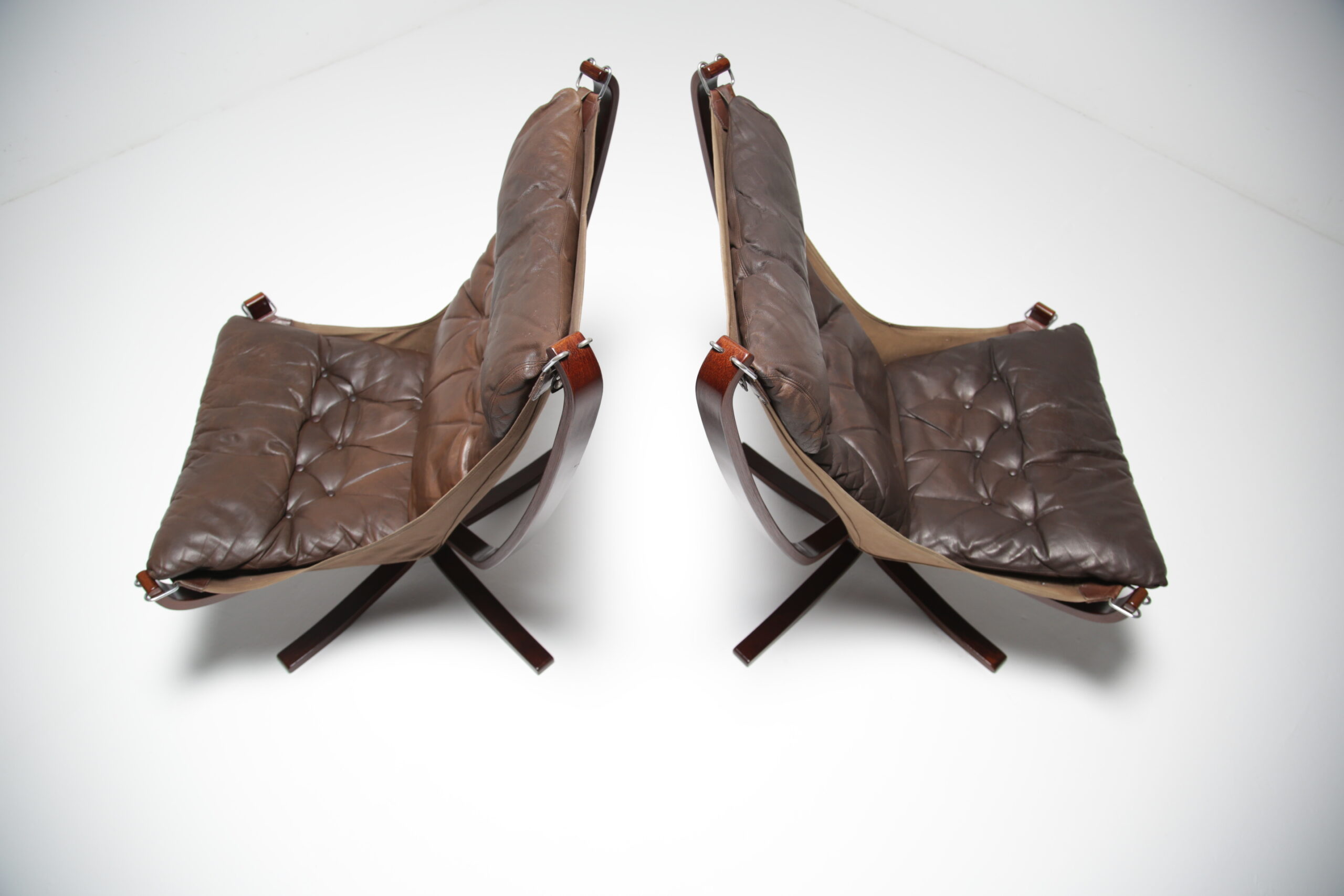 Discover the timeless elegance of our Vintage Brown Leather Falcon Chairs, designed by Sigurd Ressell for Vatne Mobler in the 1970s. These high-back chairs, featuring stained beech bentwood frames and original brown buttoned leather, blend iconic design with unmatched comfort. Fully restored to their former glory. They promise a unique seating experience that adds a touch of vintage charm to any space.