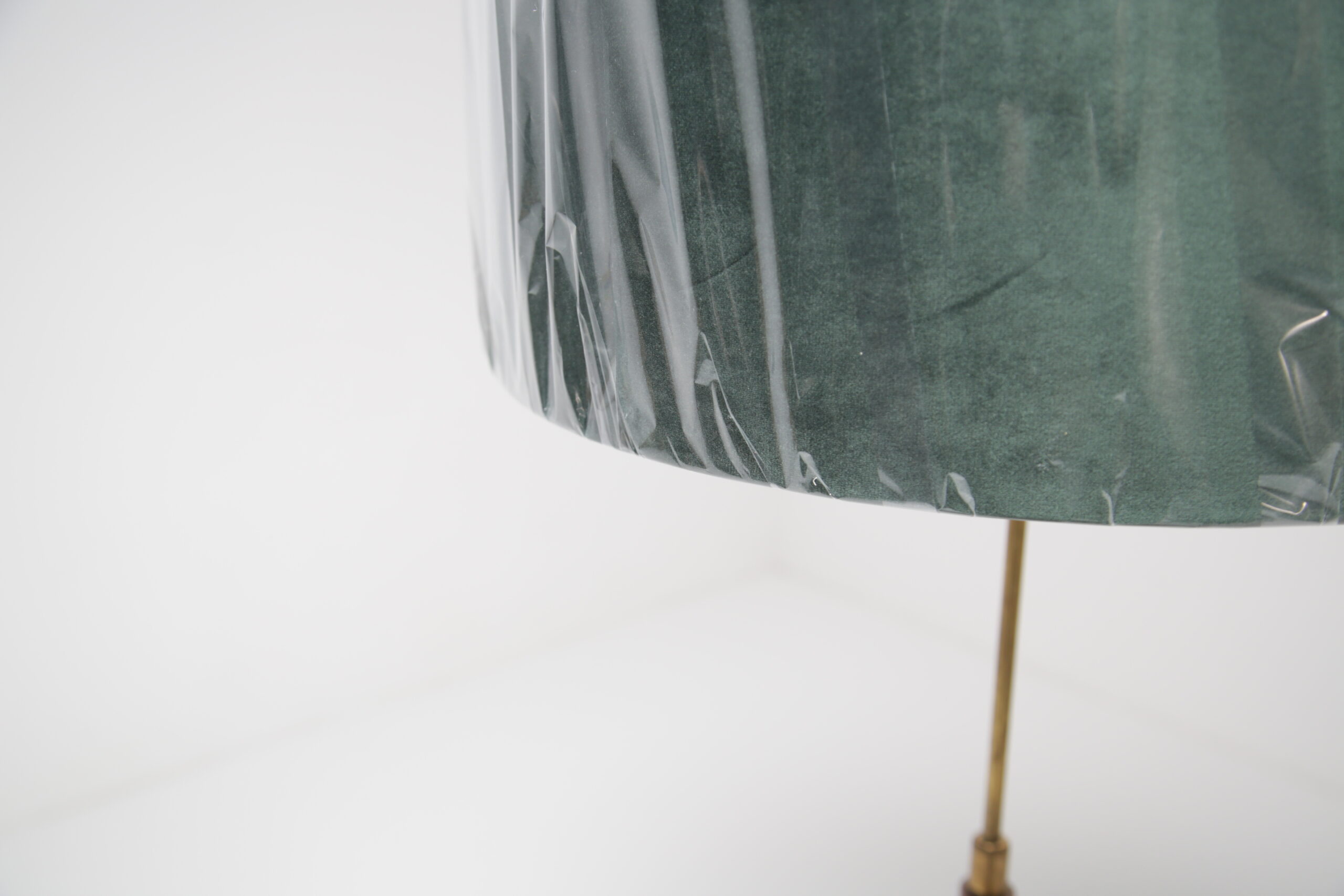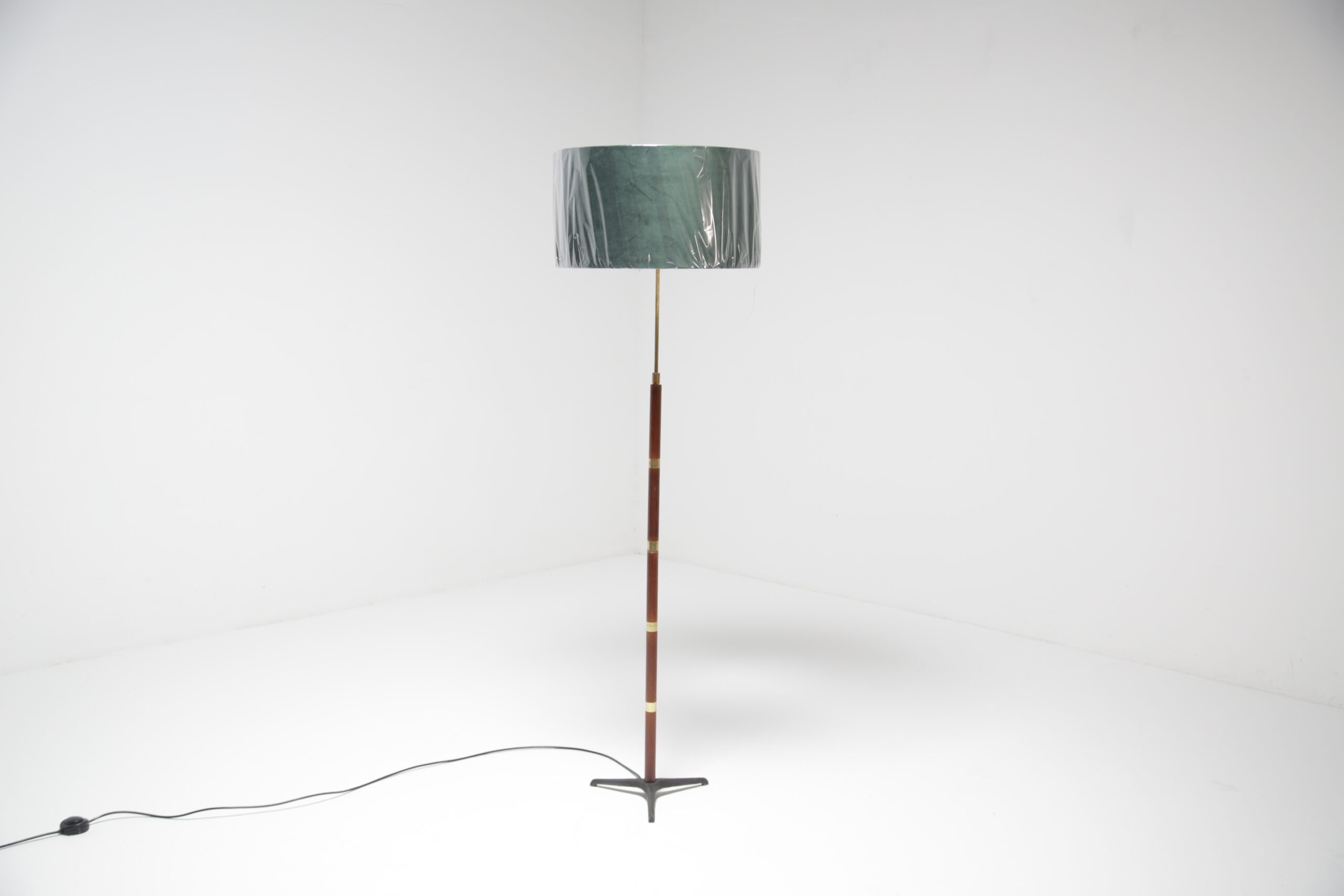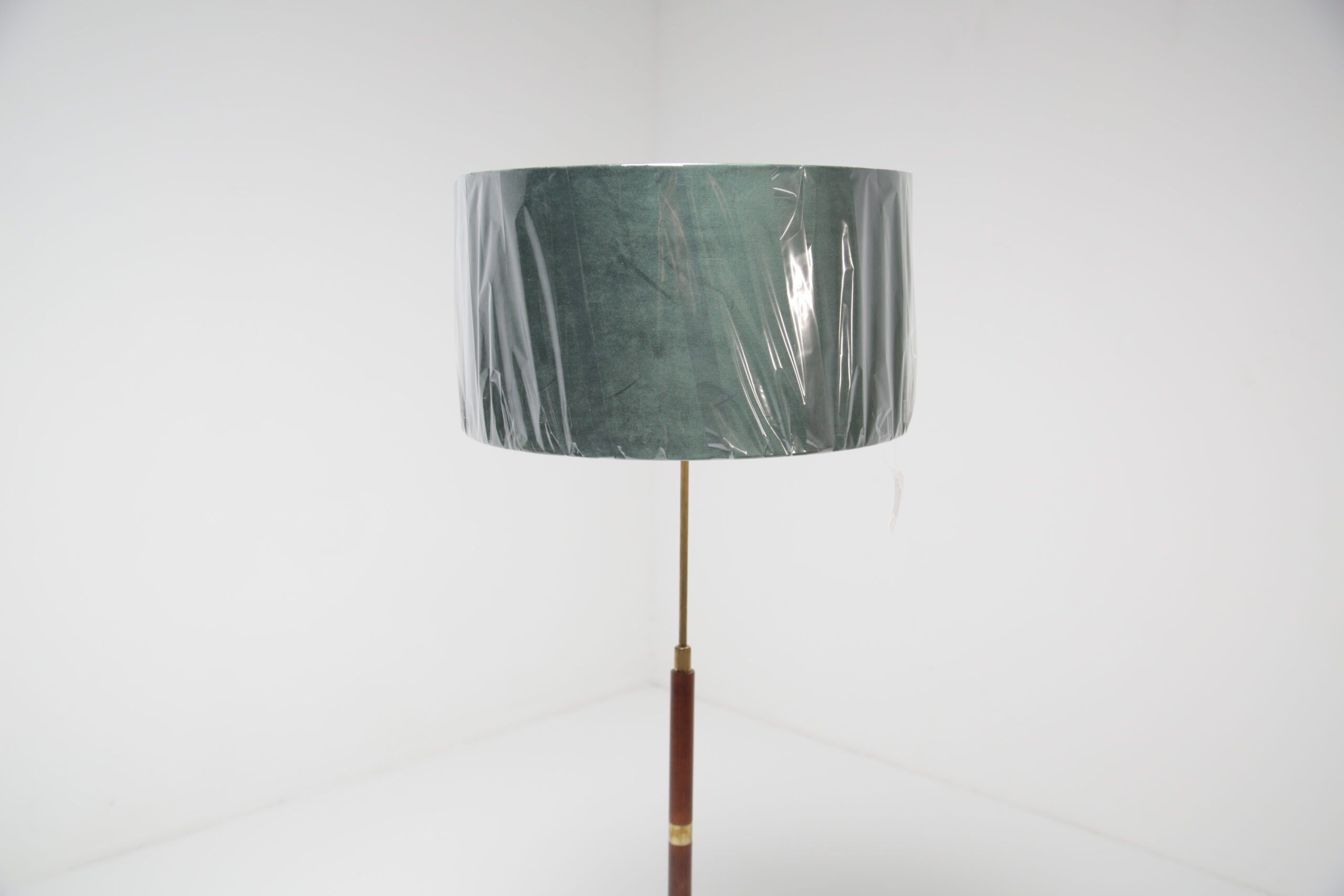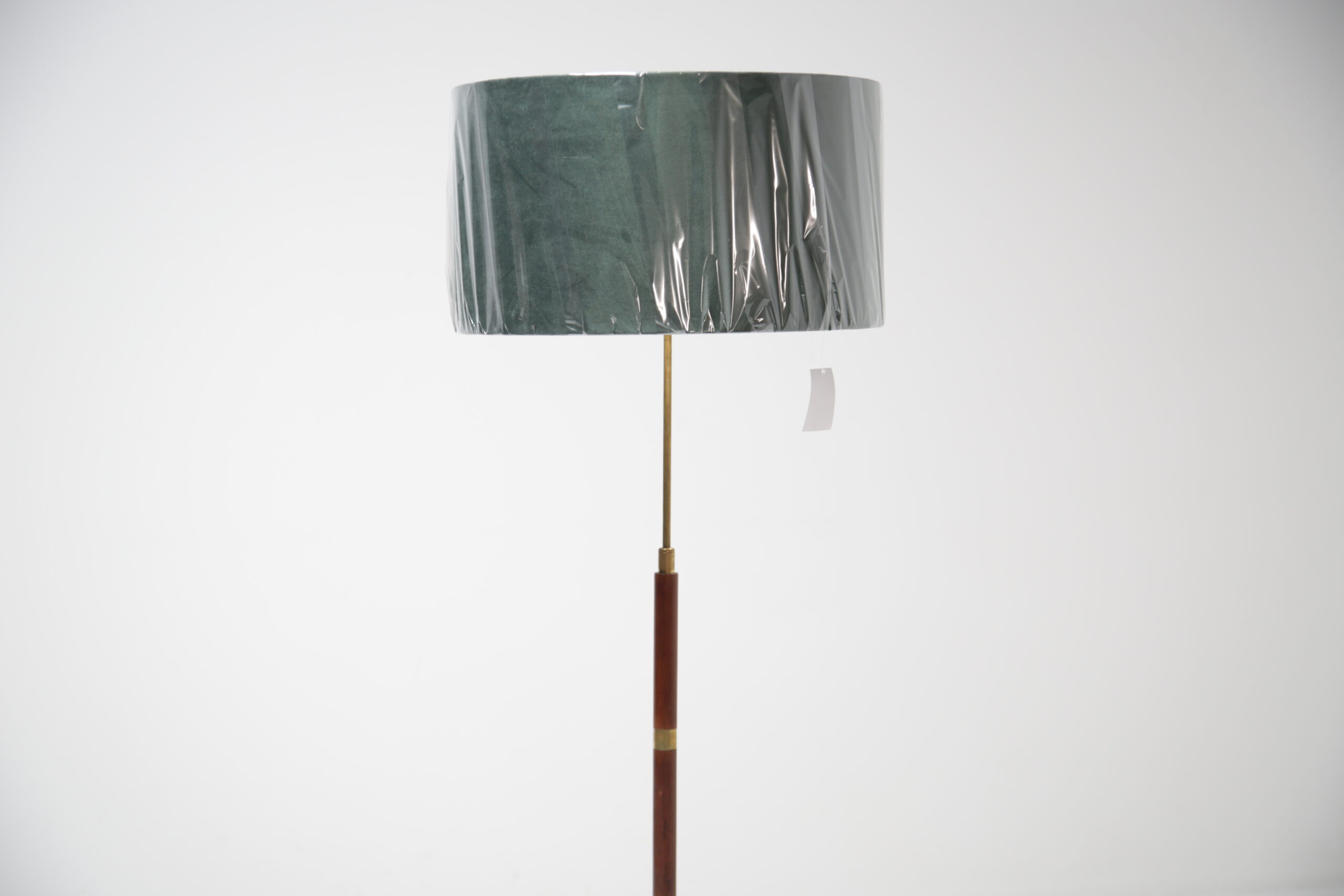 Illuminate your space with the elegant Vintage Rosewood and Brass Floor Lamp from Denmark, crafted in the 1970s. This sophisticated floor lamp features a unique triangular metal base, rosewood with brass elements, and a modern green velvet shade. It’s perfect for adding a warm, inviting ambiance to any room.