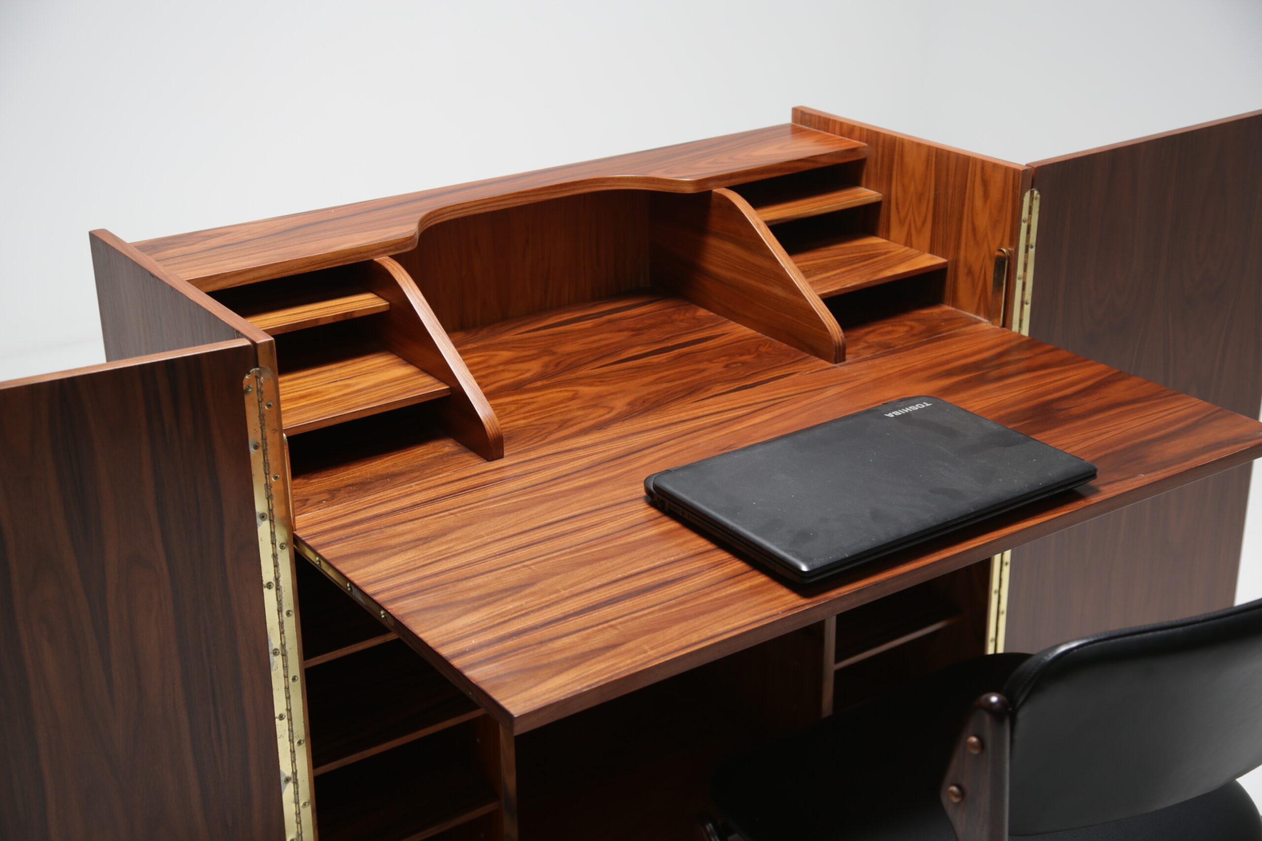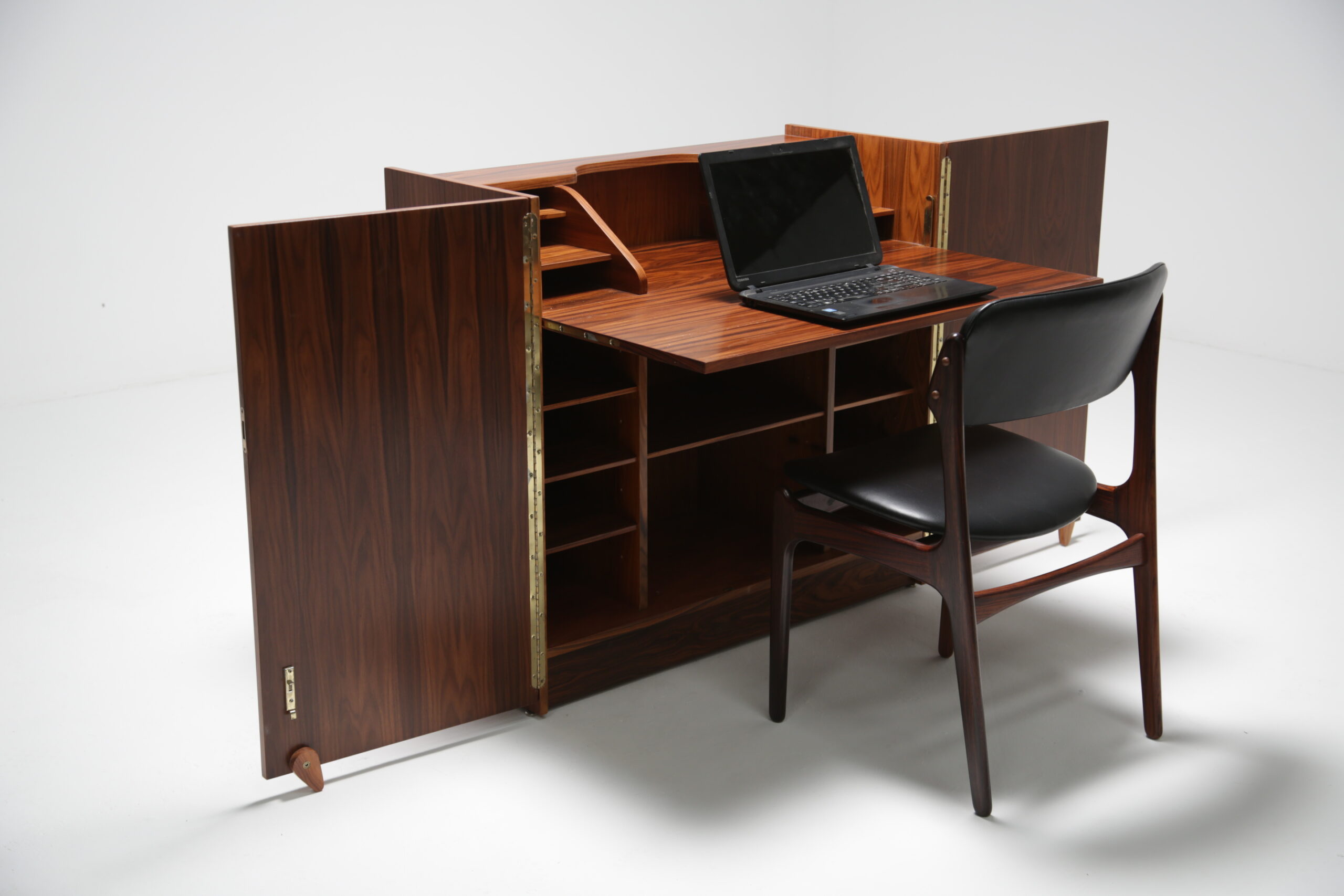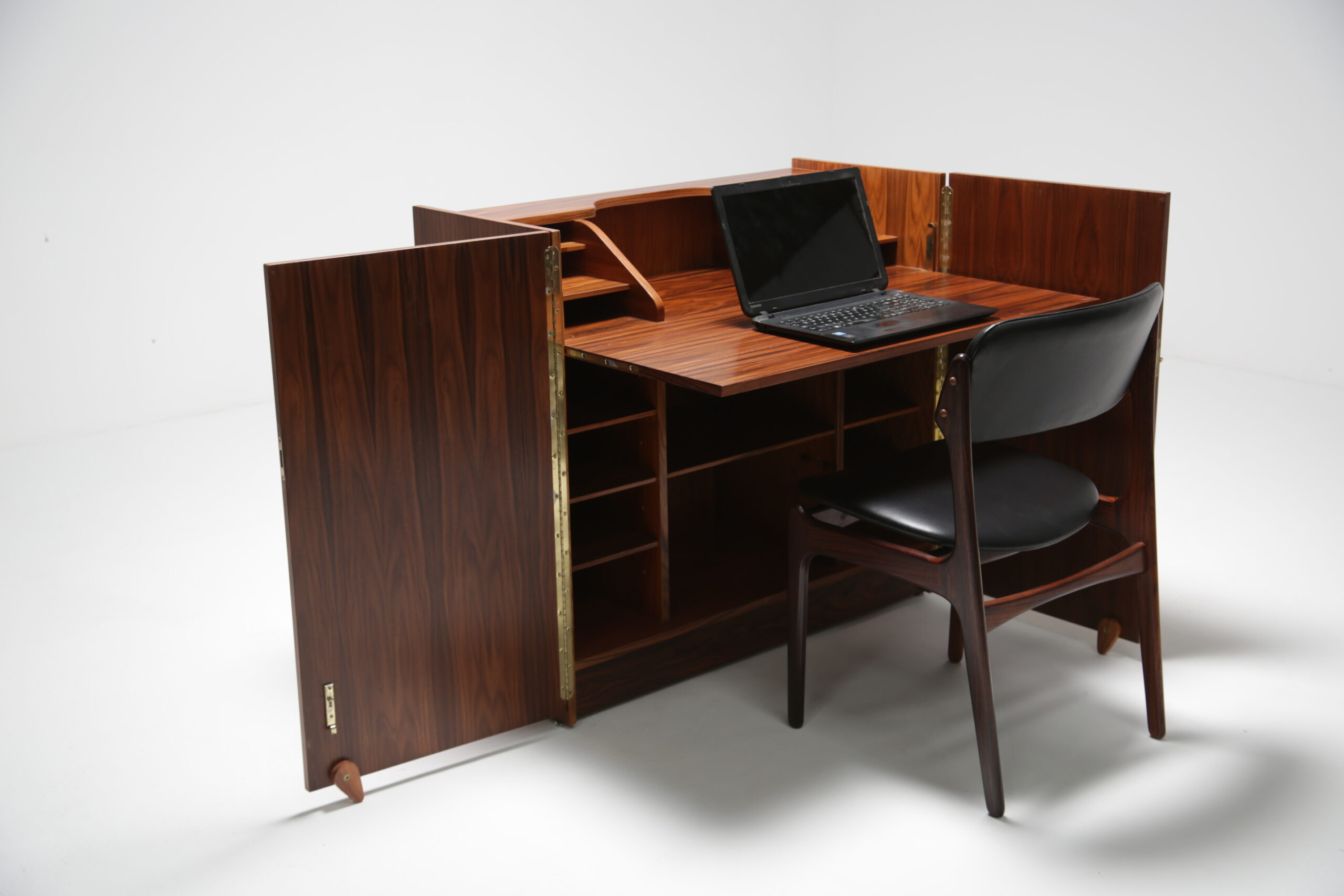 A rosewood magic box desk that changes from a plain cupboard style rosewood piece of furniture to a highly functional desk. When you open the two door the top flips over 180 degrees to create a desk top. There are little cubby holes for stationary and below there are larger areas that will hold files and other paperwork. The two doors have movable stoppers on the base of the doors which will hold the doors in place while using the desk. Fully refurbished. Lovely rosewood grain and brass hardware. Pricing includes delivery anywhere in Ireland. Worldwide shipping available.