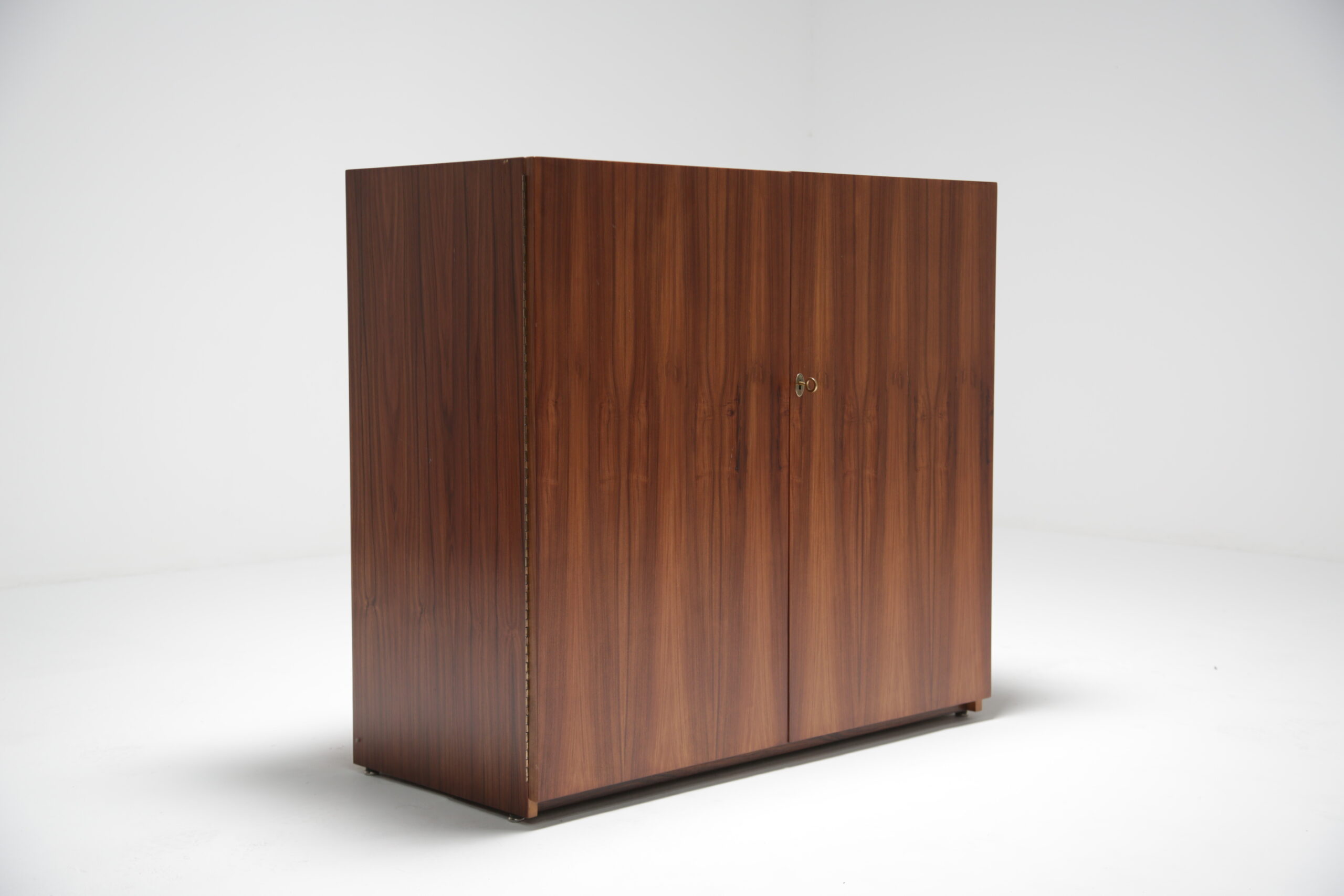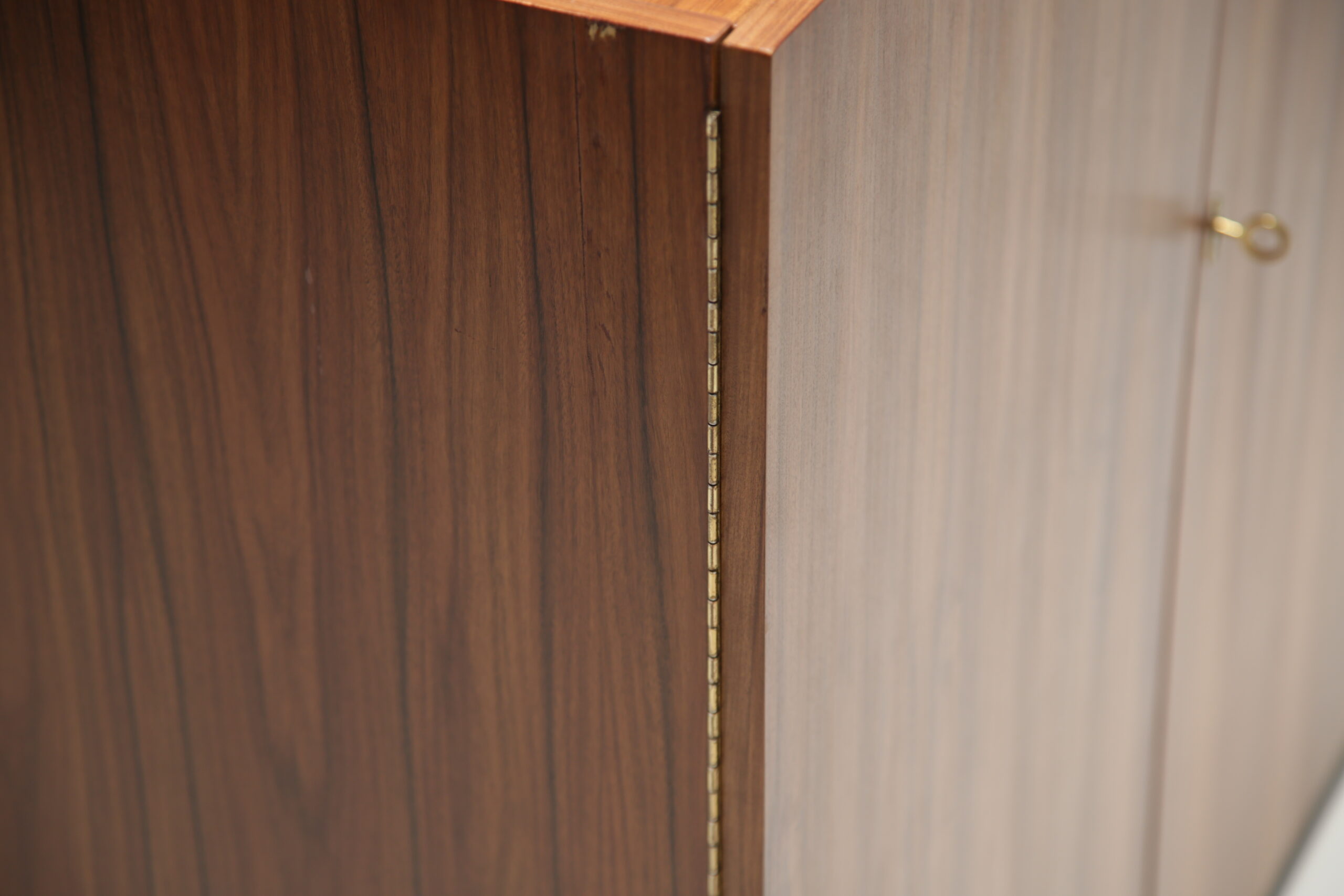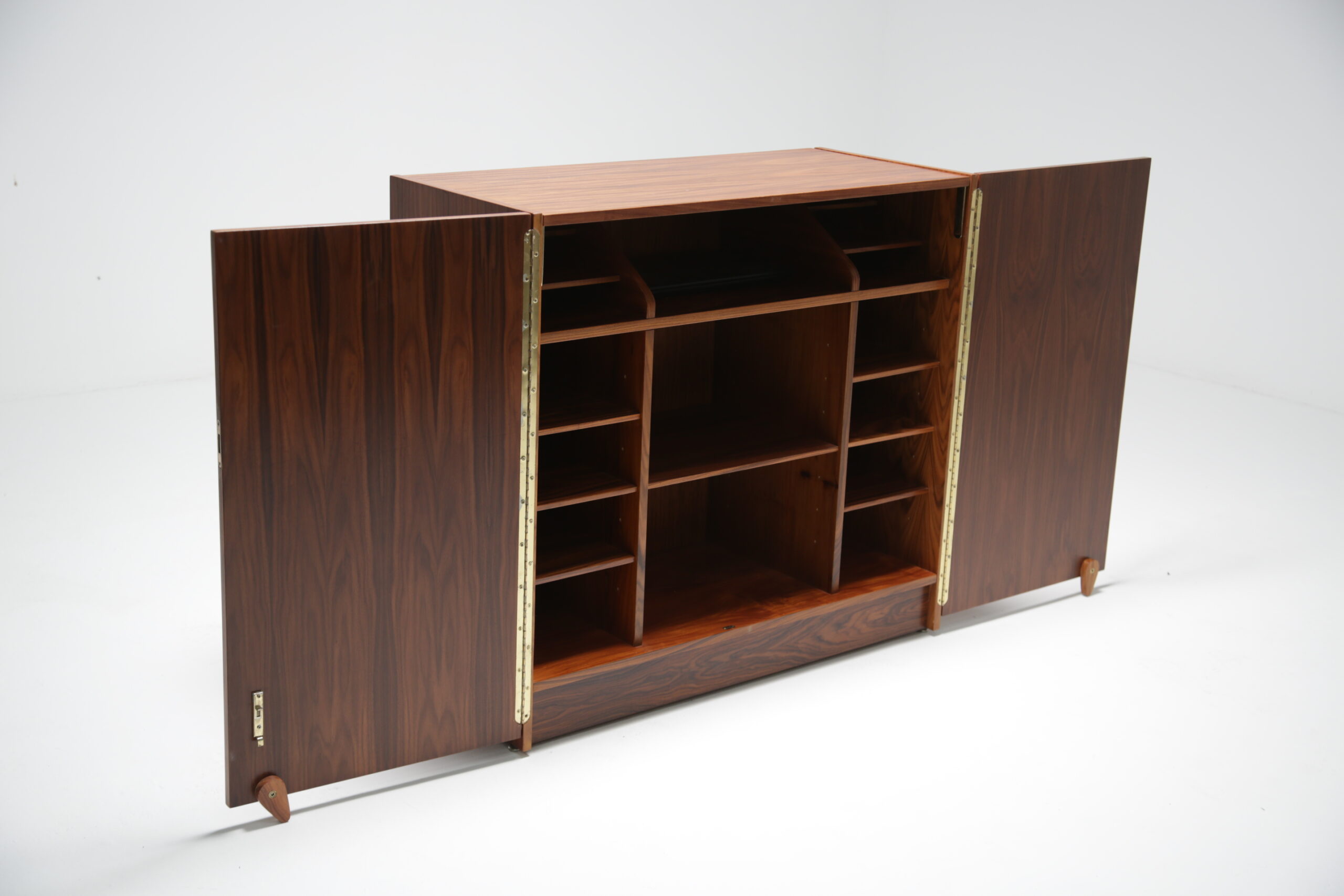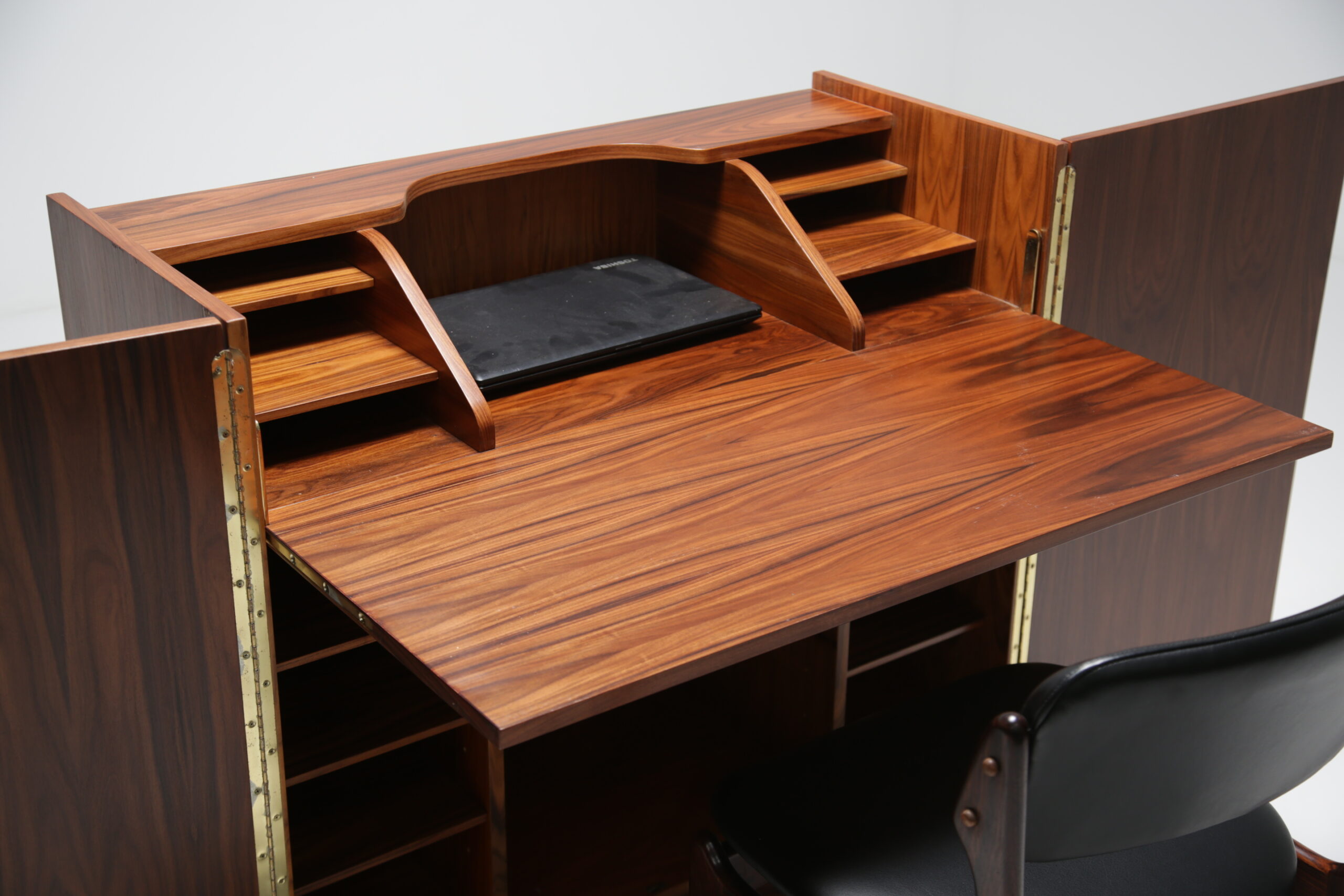 A rosewood magic box desk that changes from a plain cupboard style rosewood piece of furniture to a highly functional desk. When you open the two door the top flips over 180 degrees to create a desk top. There are little cubby holes for stationary and below there are larger areas that will hold files and other paperwork. The two doors have movable stoppers on the base of the doors which will hold the doors in place while using the desk. Fully refurbished. Lovely rosewood grain and brass hardware. Pricing includes delivery anywhere in Ireland. Worldwide shipping available.