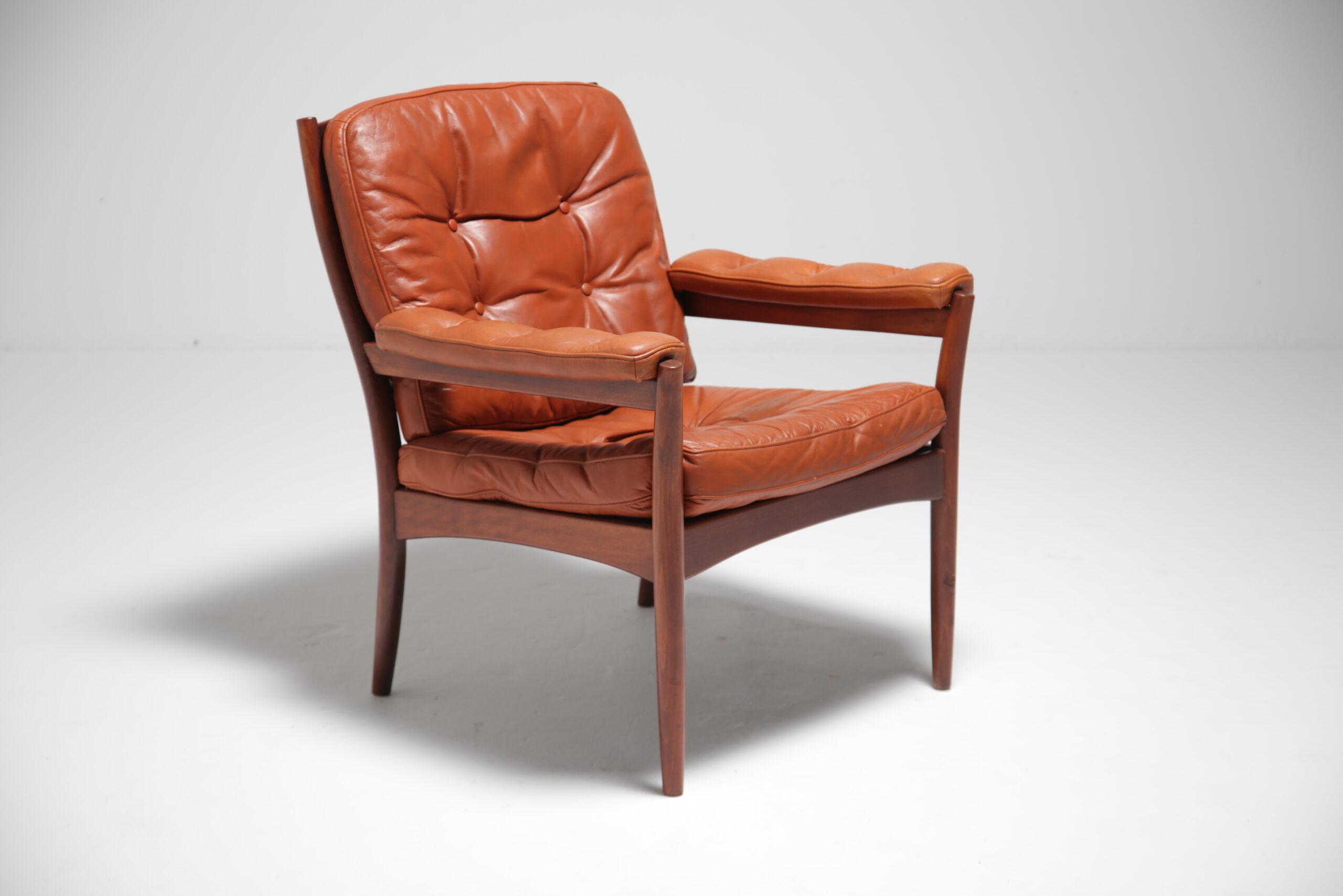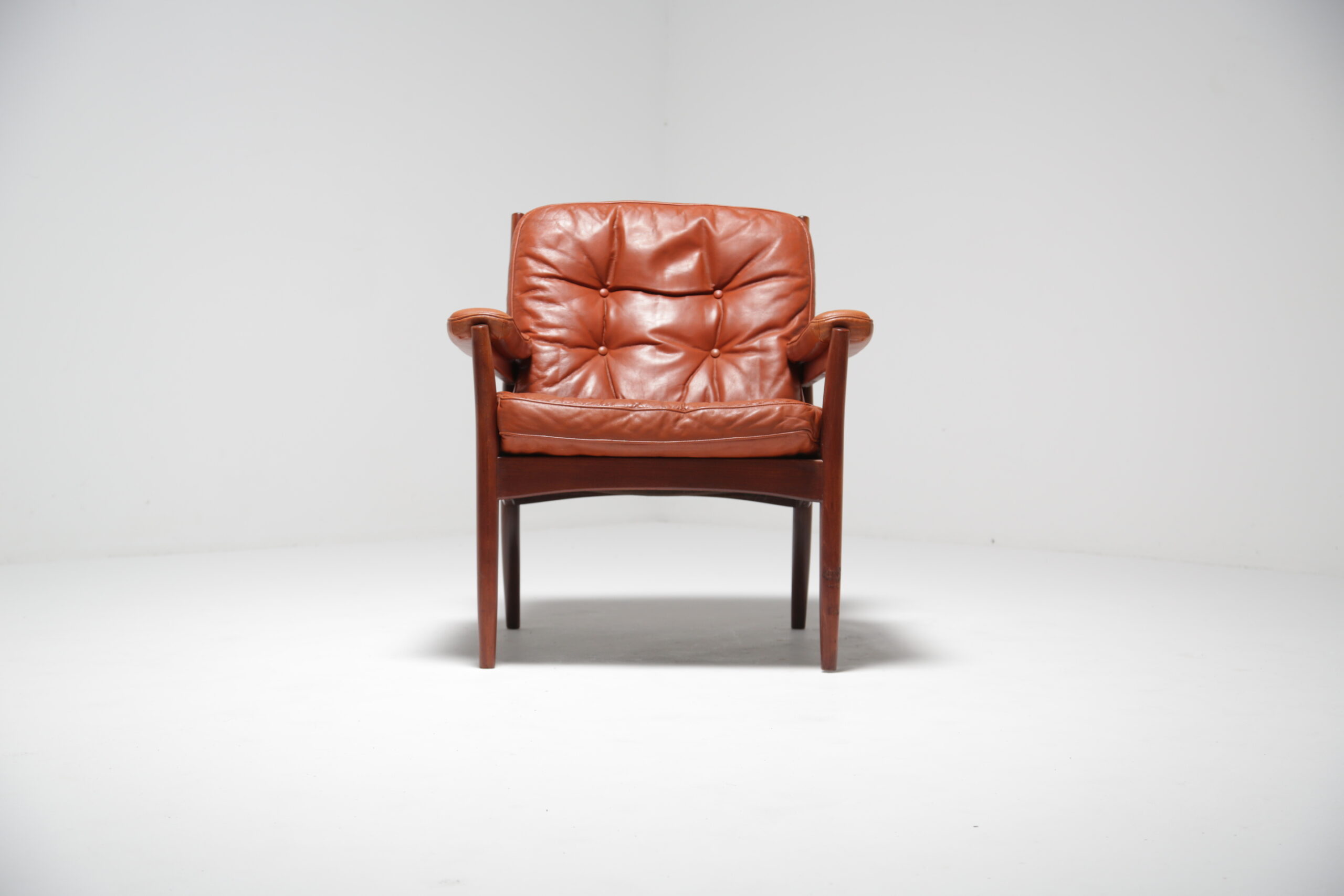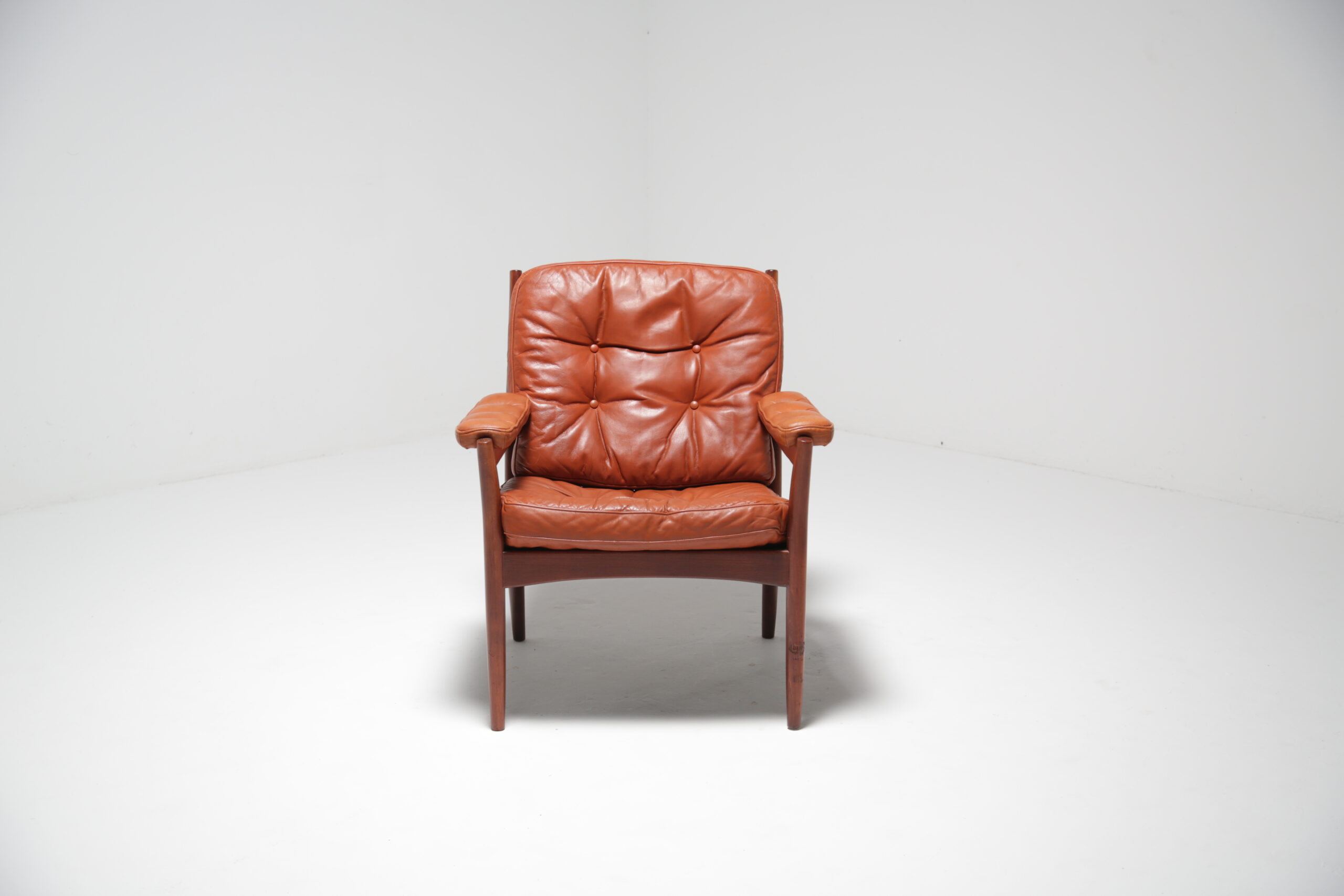 This comfortable armchair was imported from Sweden and features a dark teak stained frame paired with loose tan leather cushions. They were manufactured by the Swedish furniture makers “Gote Mobler” in the 1950s and has a nice sleek design all around. They would be perfect for a living room or a relaxation area.
