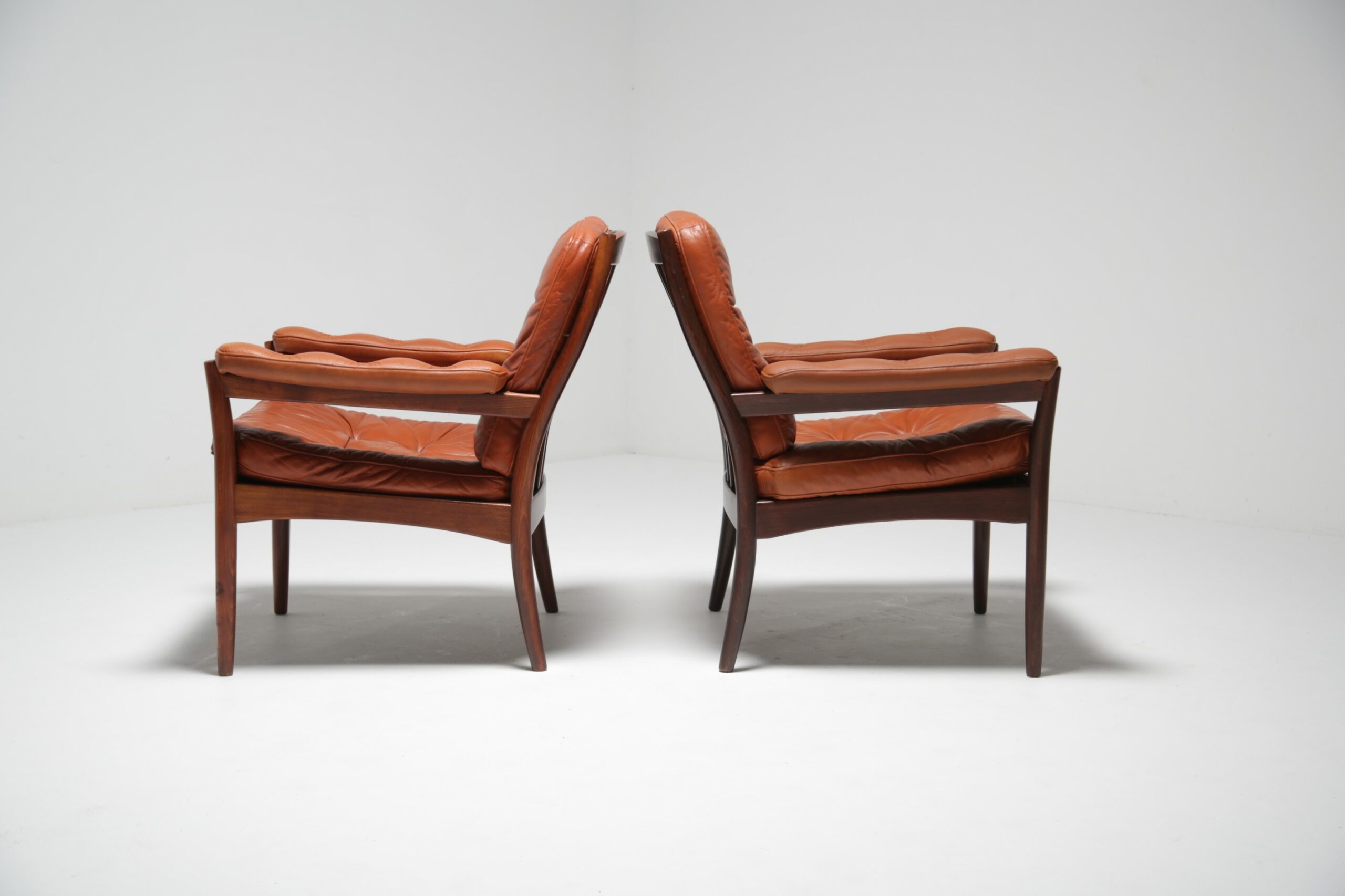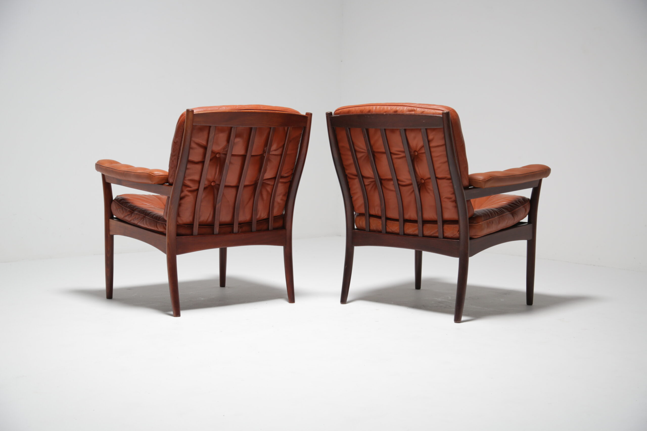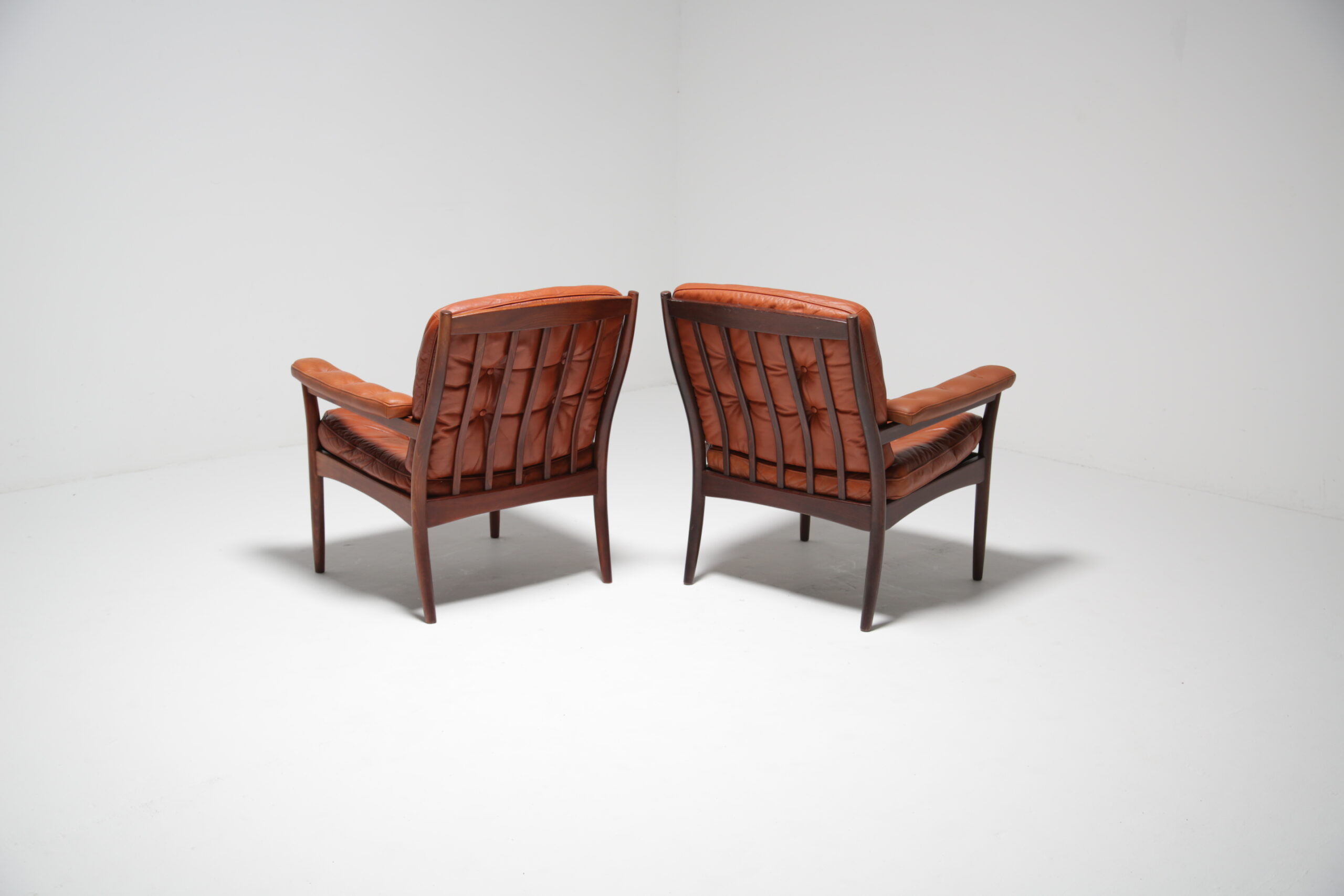 This comfortable armchair was imported from Sweden and features a dark teak stained frame paired with loose tan leather cushions. They were manufactured by the Swedish furniture makers “Gote Mobler” in the 1950s and has a nice sleek design all around. They would be perfect for a living room or a relaxation area.