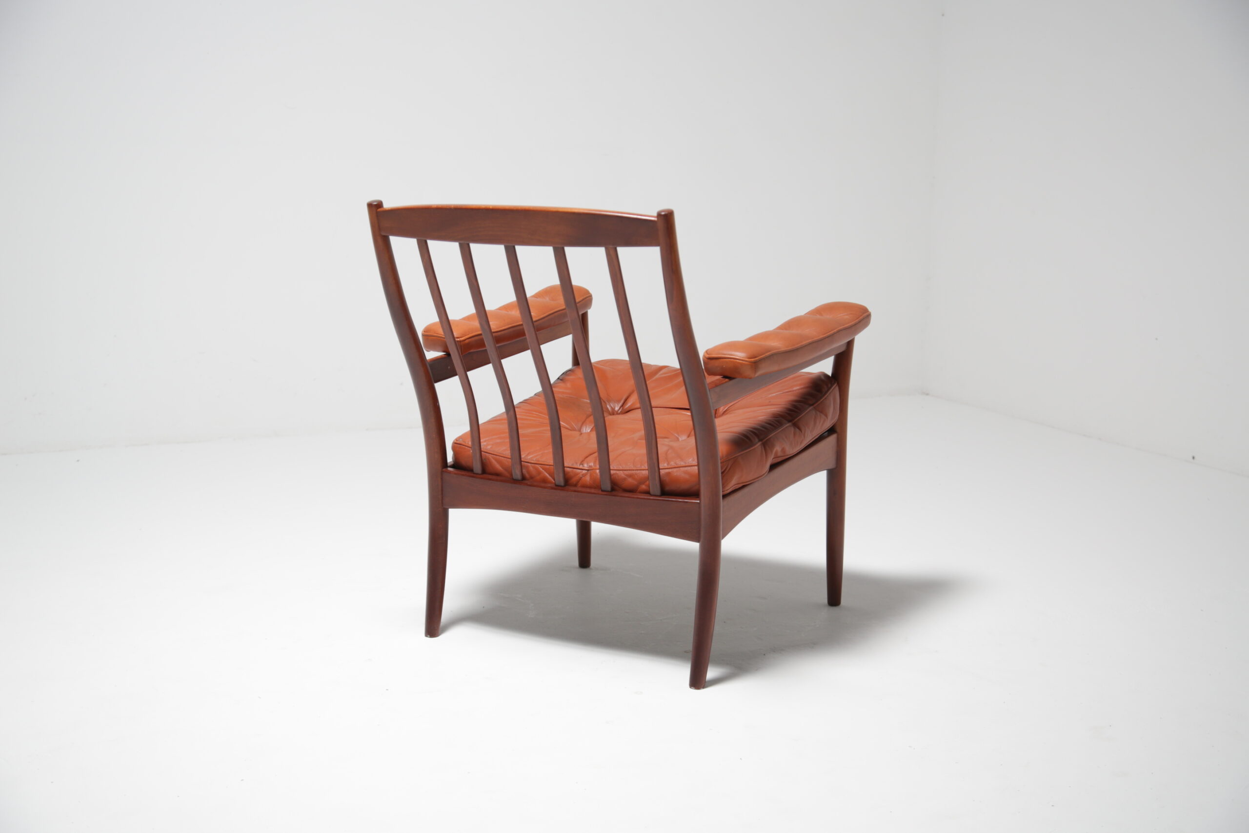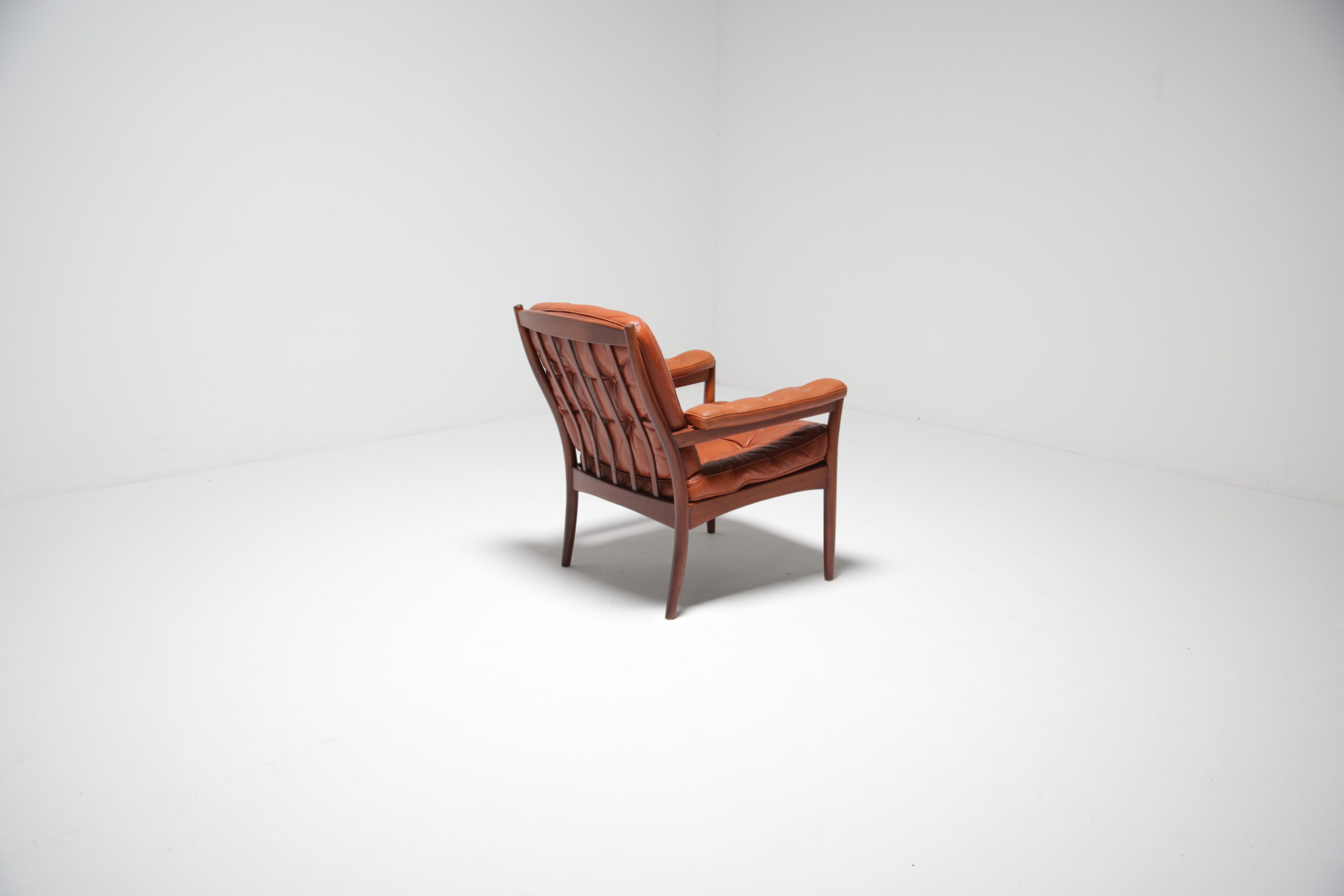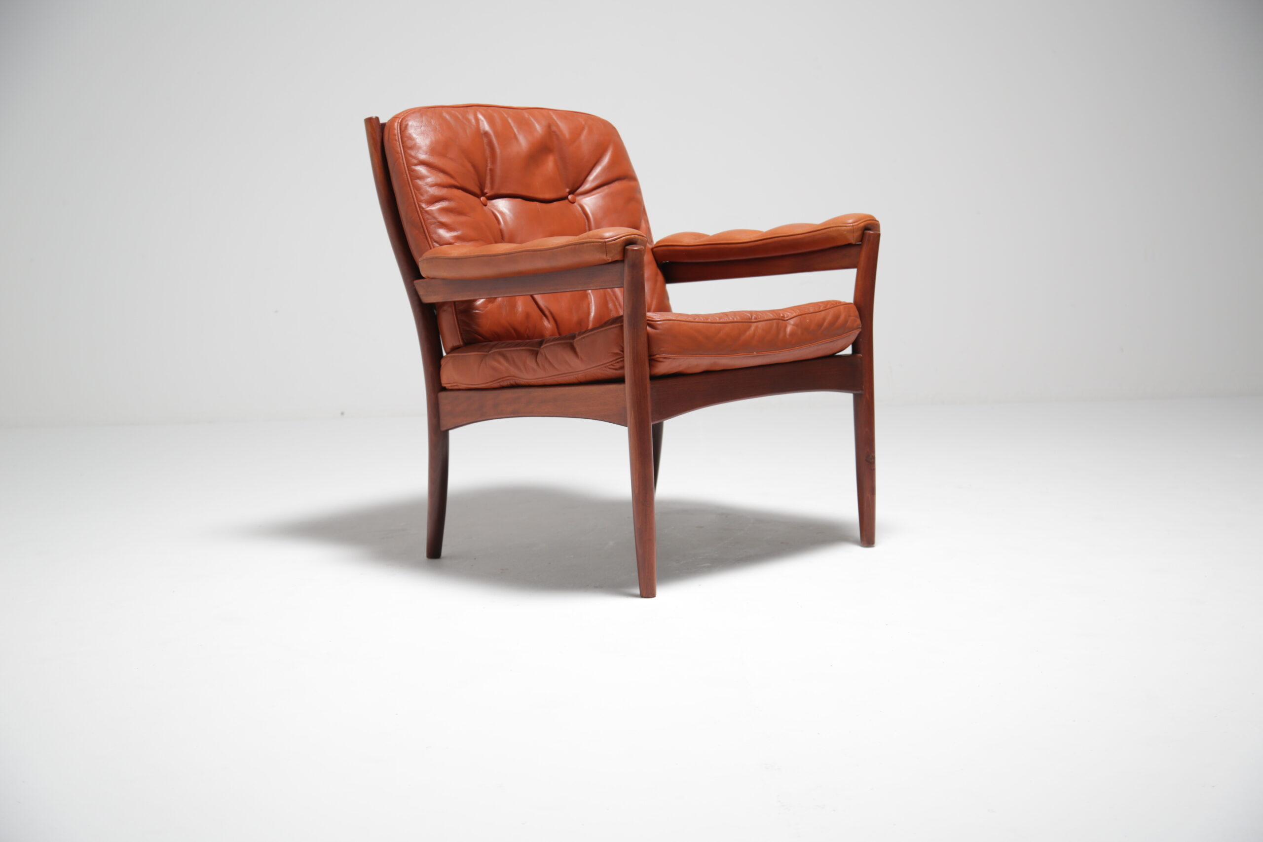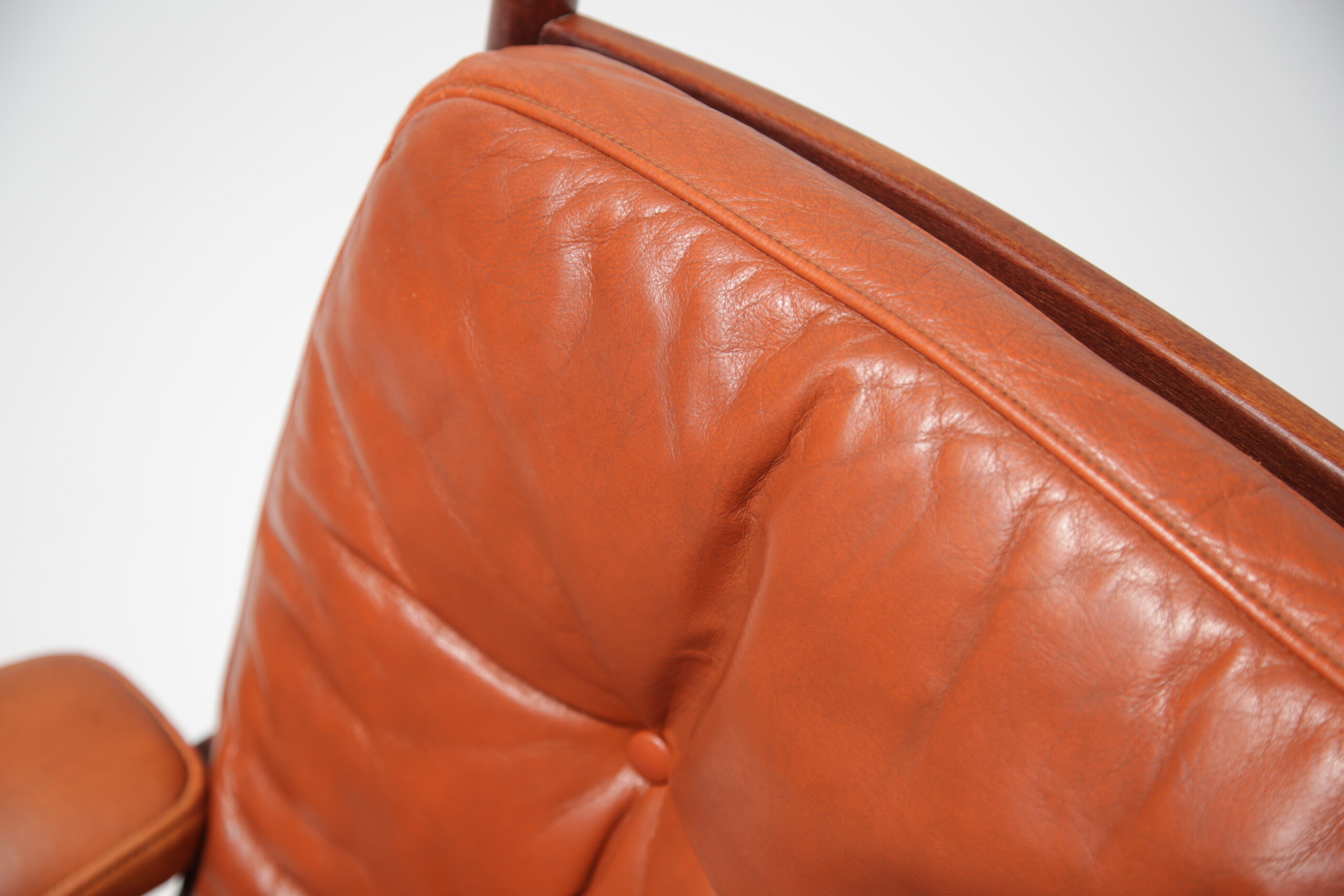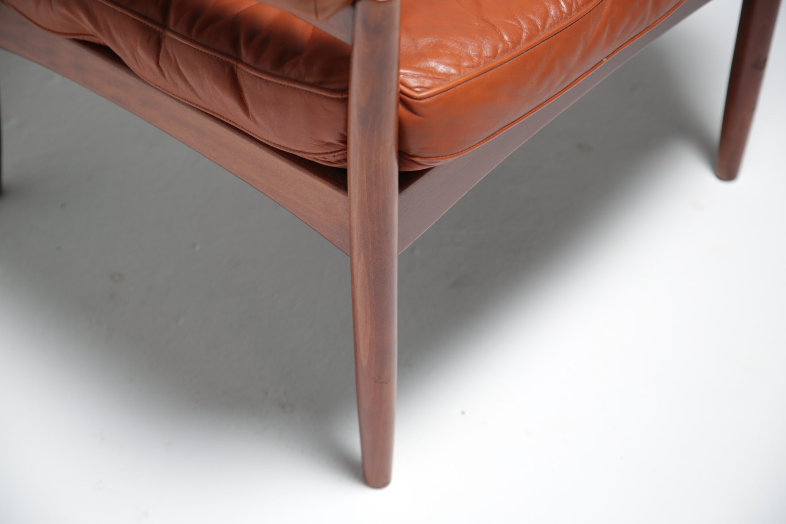 Immerse yourself in the luxury of this armchair. This Swedish-designed piece features a sleek, dark teak frame complemented by plush tan leather cushions, ideal for adding a touch of vintage elegance to any living space or office.