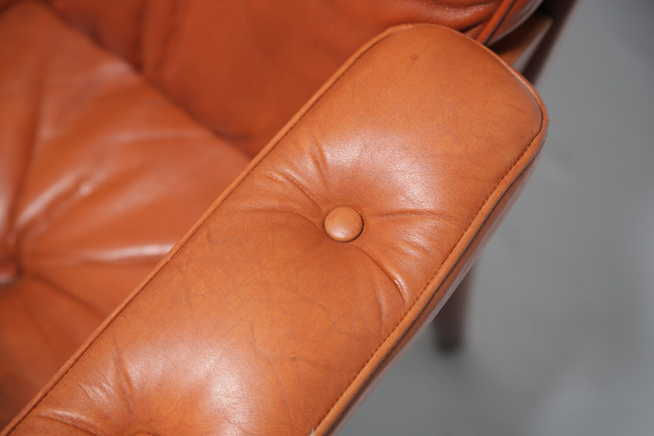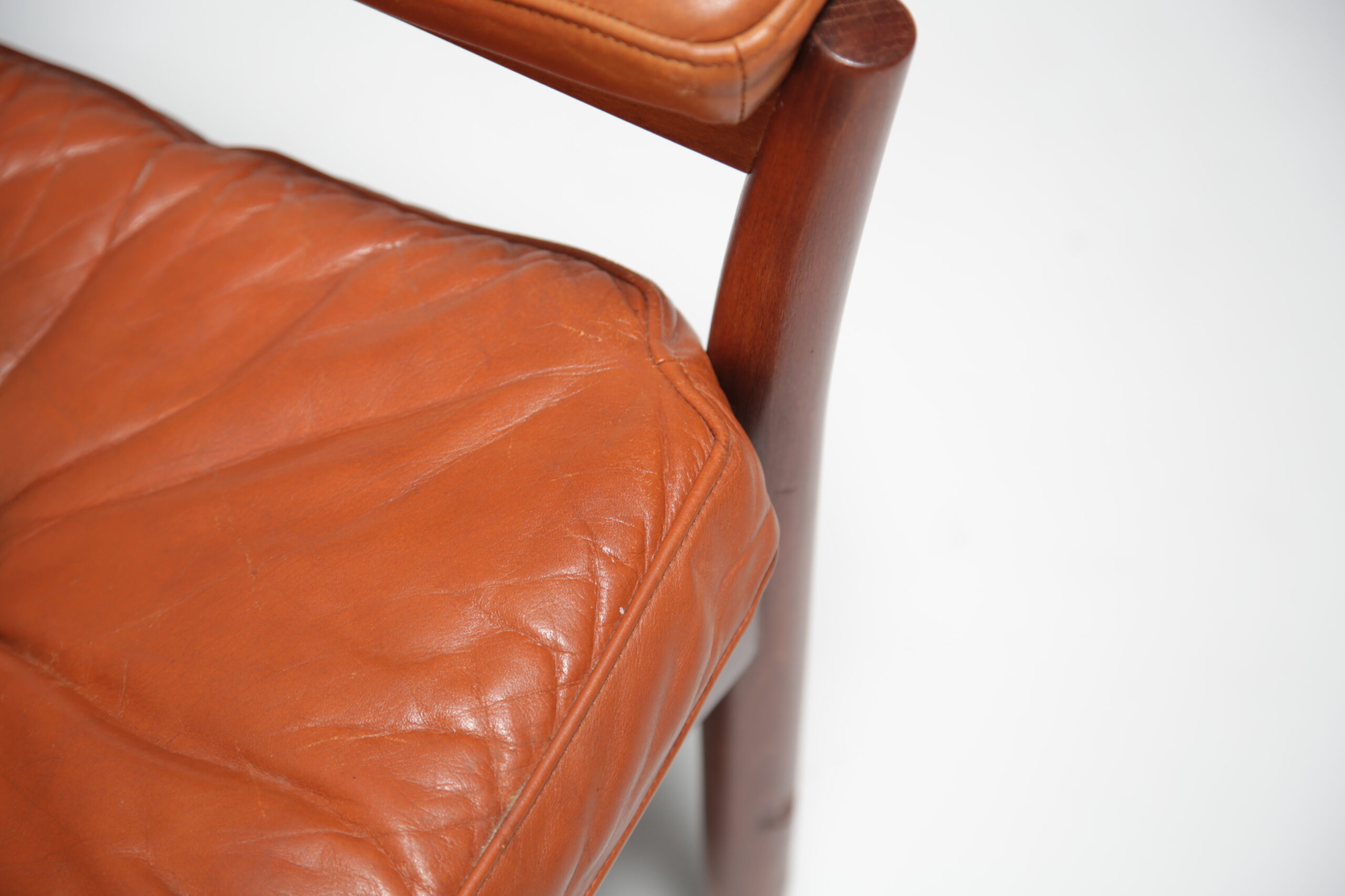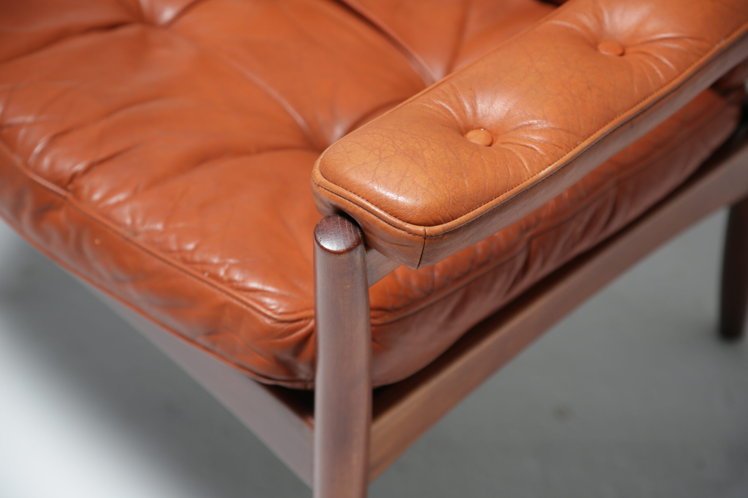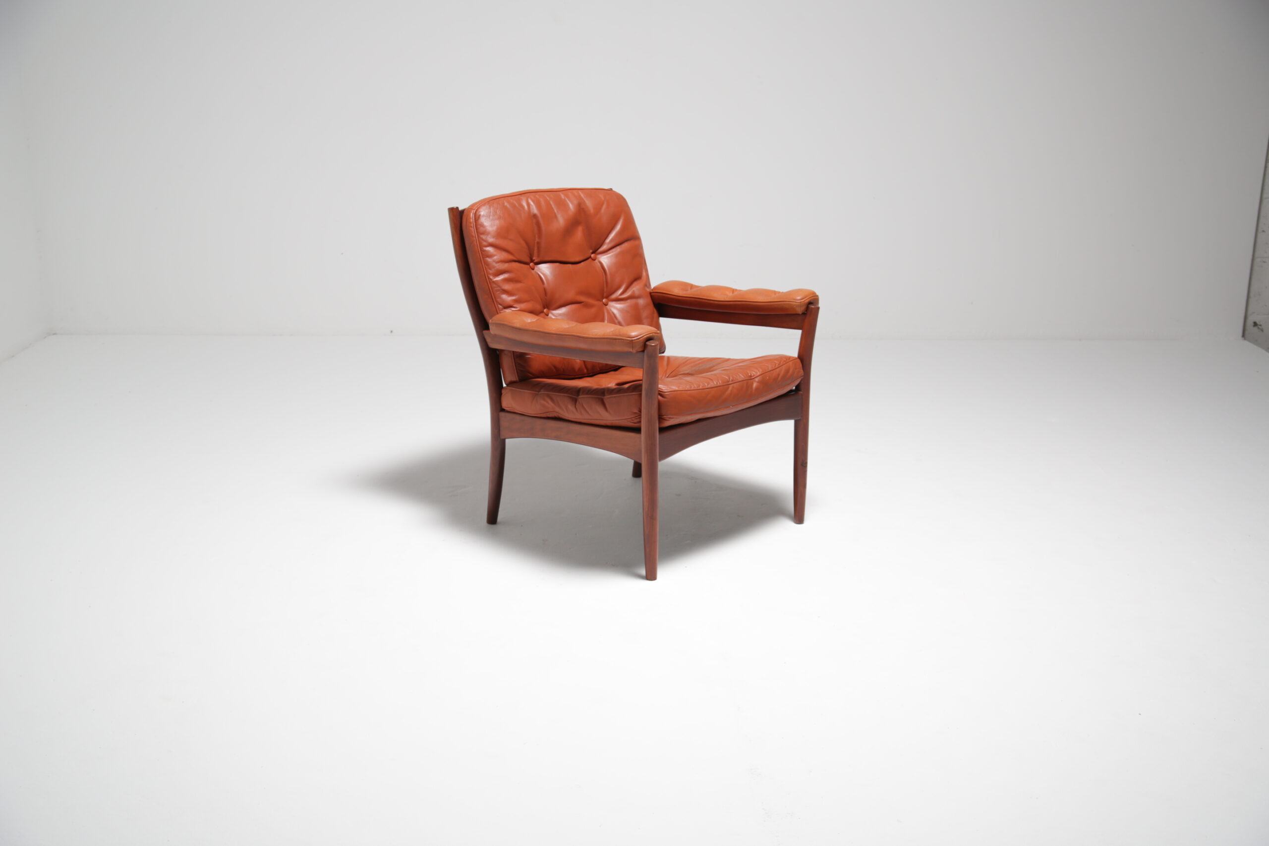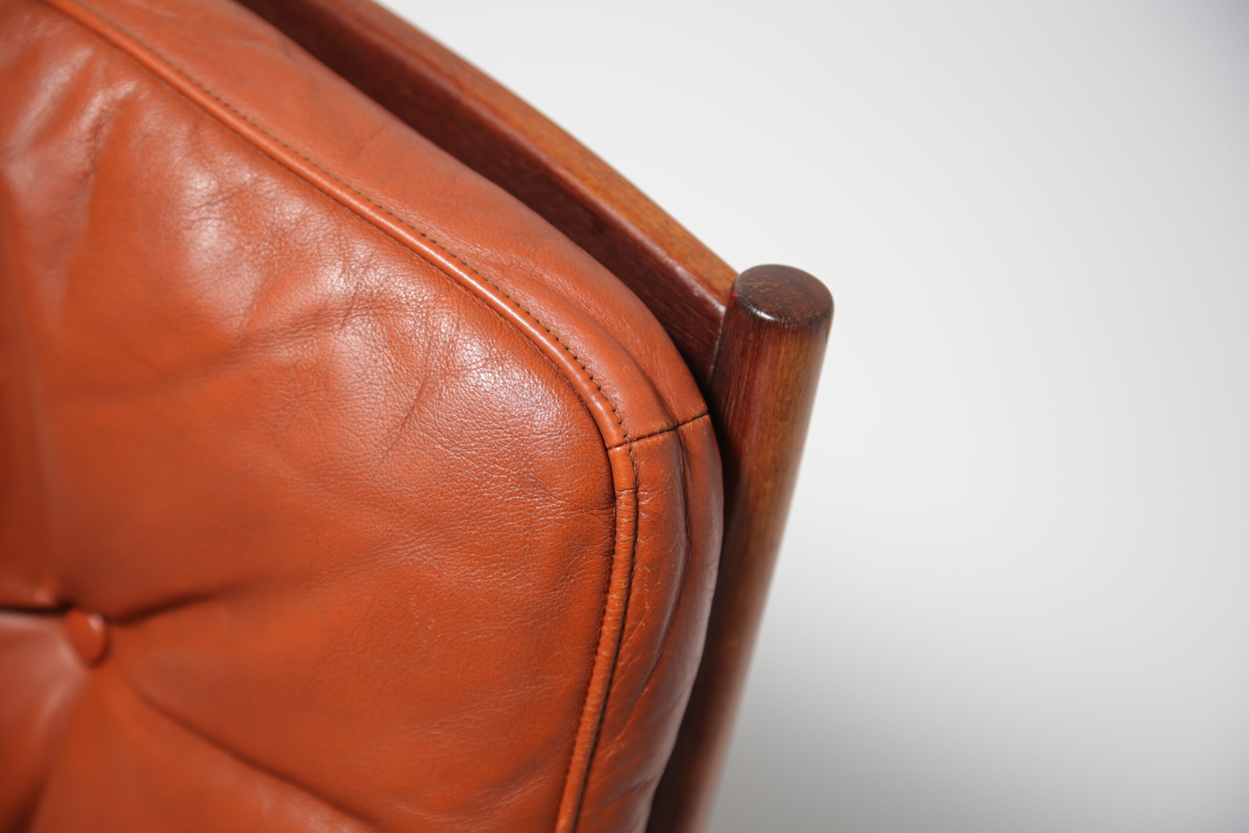 Immerse yourself in the luxury of this armchair. This Swedish-designed piece features a sleek, dark teak frame complemented by plush tan leather cushions, ideal for adding a touch of vintage elegance to any living space or office.
