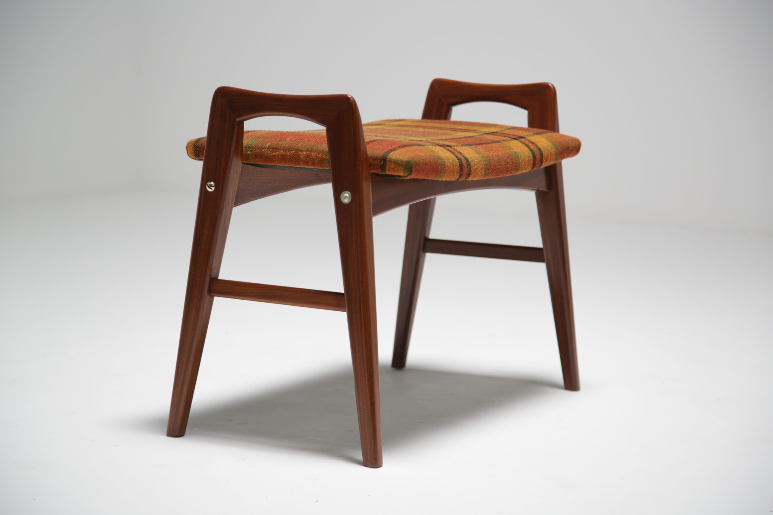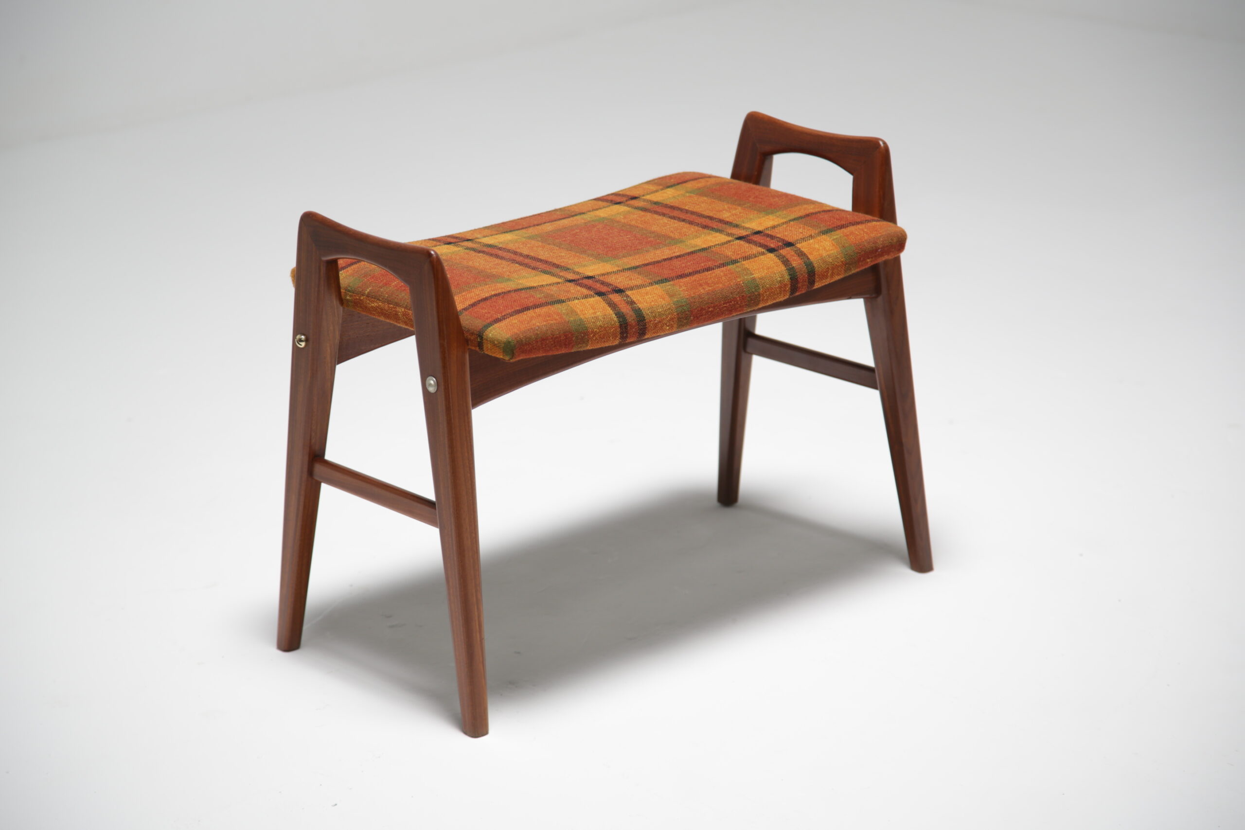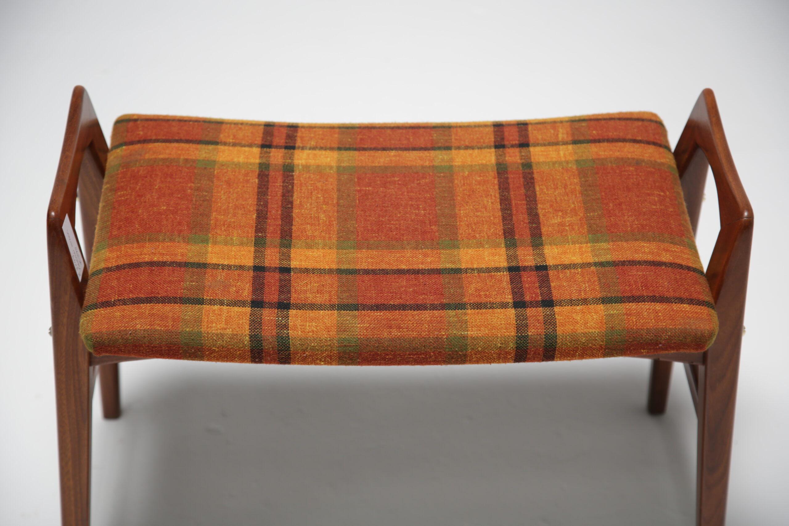 A teak vanity stool with original tartan fabric. We have fully restored the teak and we replaced the upholstery foam and cleaned the tartan fabric. The stool sides come high up over the seat forming two handles on the side that make the stool easy to pull in under you or easy to move. These high sides are also very tactile and nice to touch while sitting on the stool. The stool could be used as a vanity stool, piano stool, extra seat or bedroom stool. Fully refurbished. Worldwide shipping available.