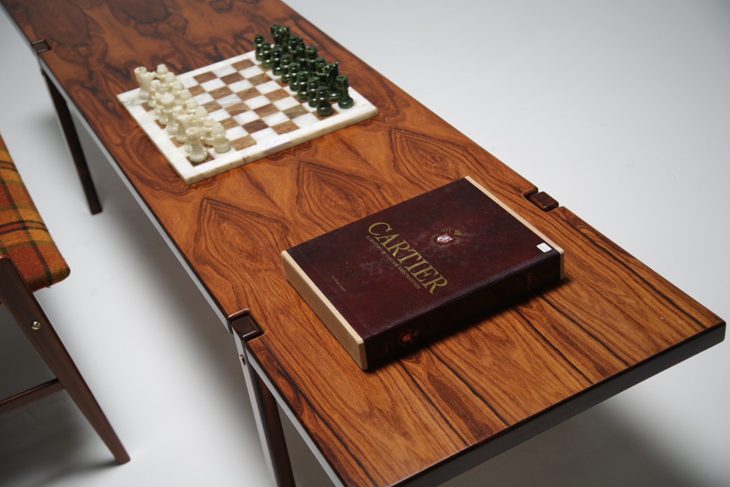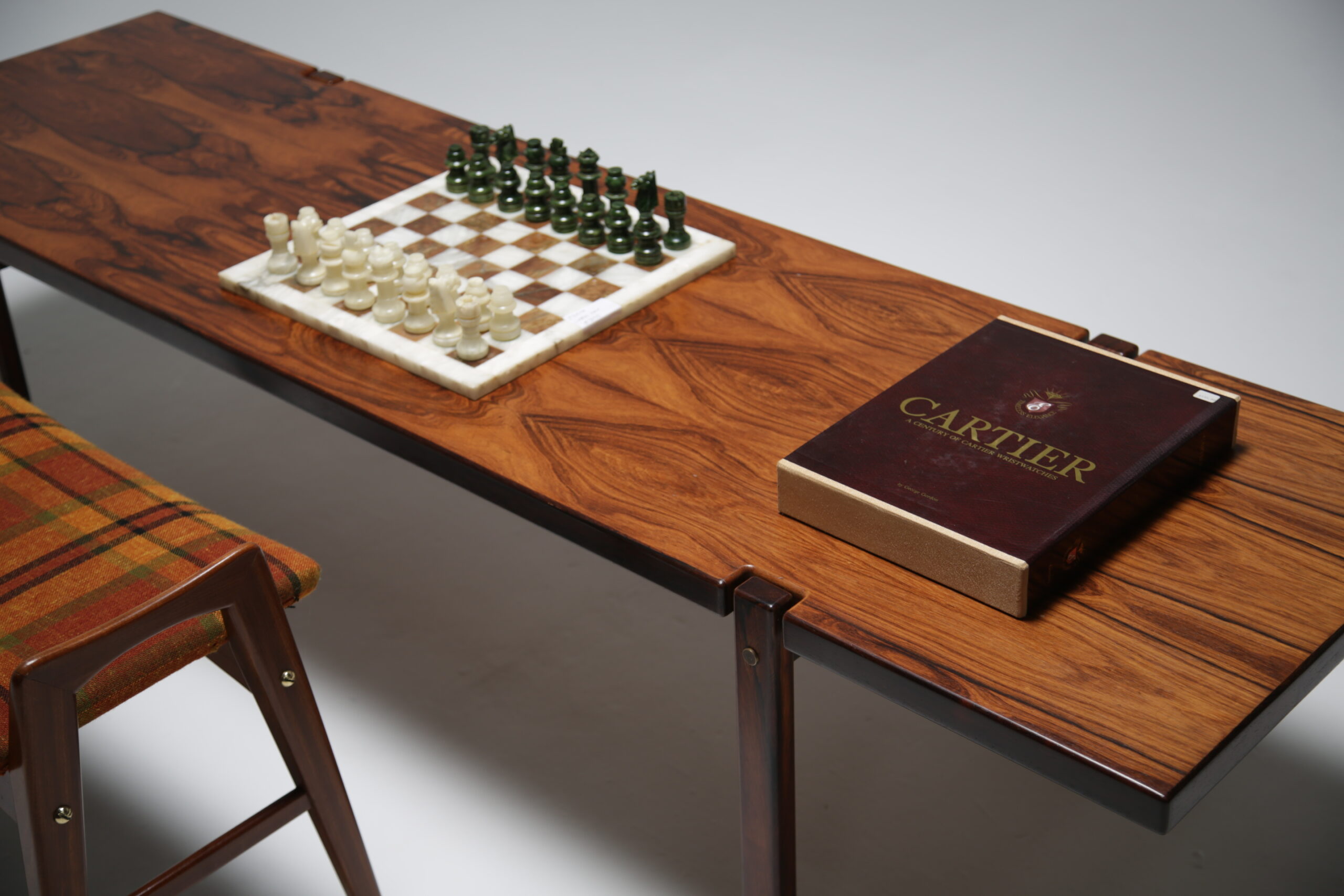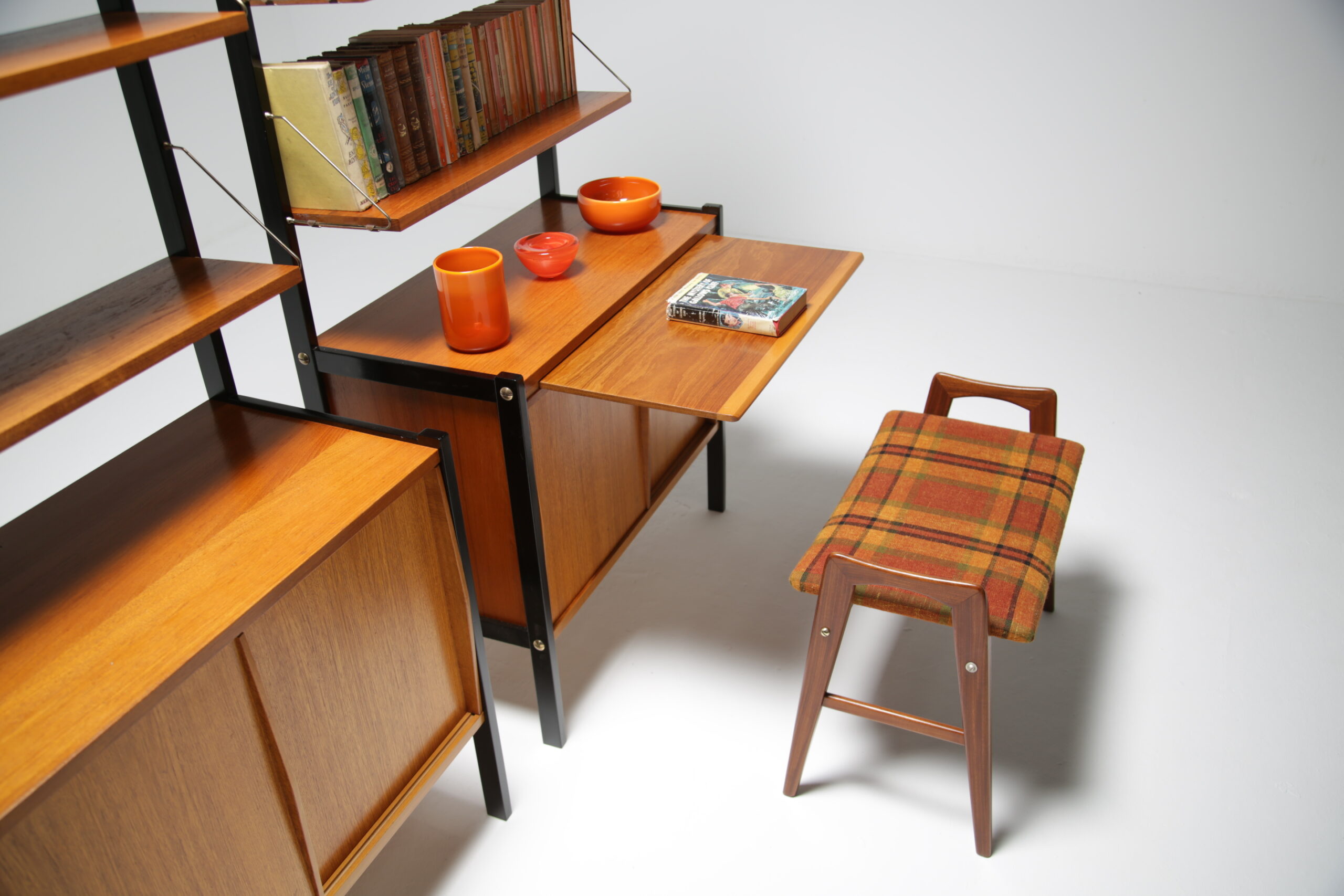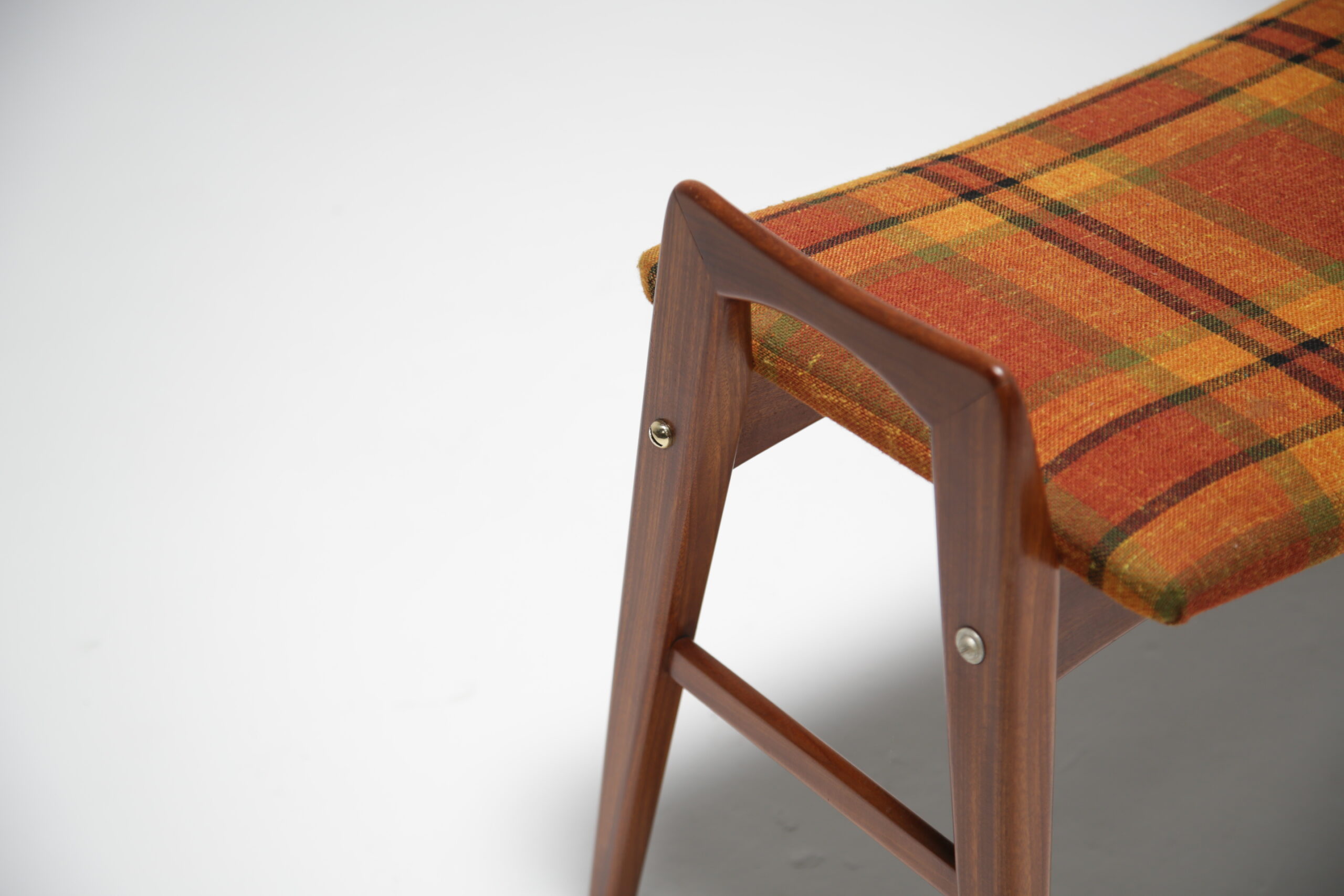 A teak vanity stool with original tartan fabric. We have fully restored the teak and we replaced the upholstery foam and cleaned the tartan fabric. The stool sides come high up over the seat forming two handles on the side that make the stool easy to pull in under you or easy to move. These high sides are also very tactile and nice to touch while sitting on the stool. The stool could be used as a vanity stool, piano stool, extra seat or bedroom stool. Fully refurbished. Worldwide shipping available.