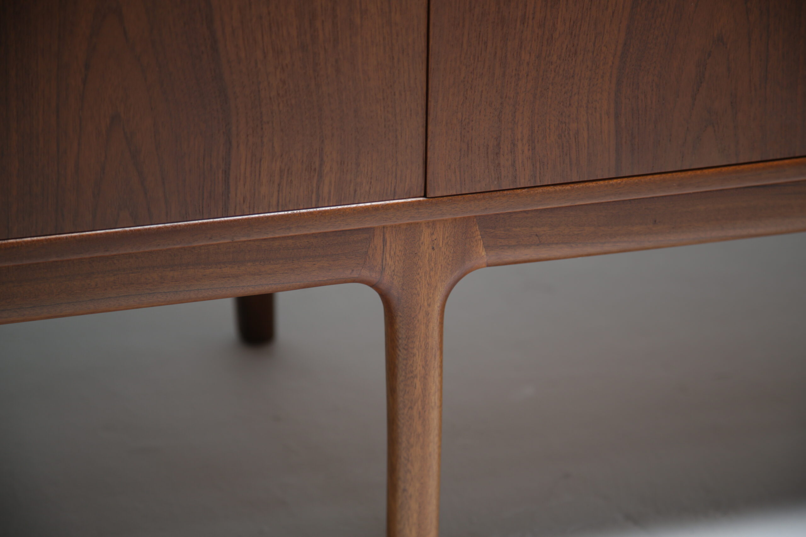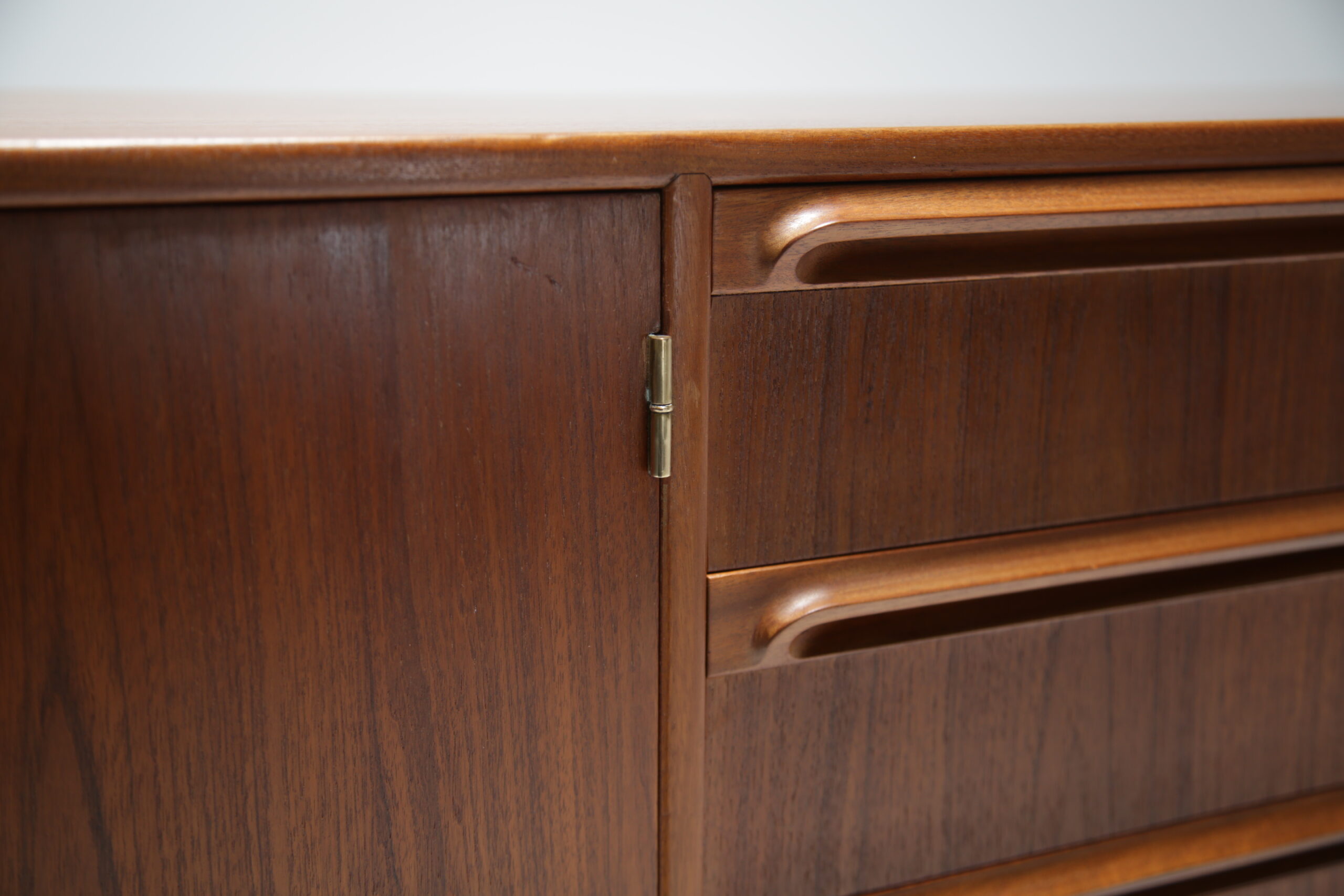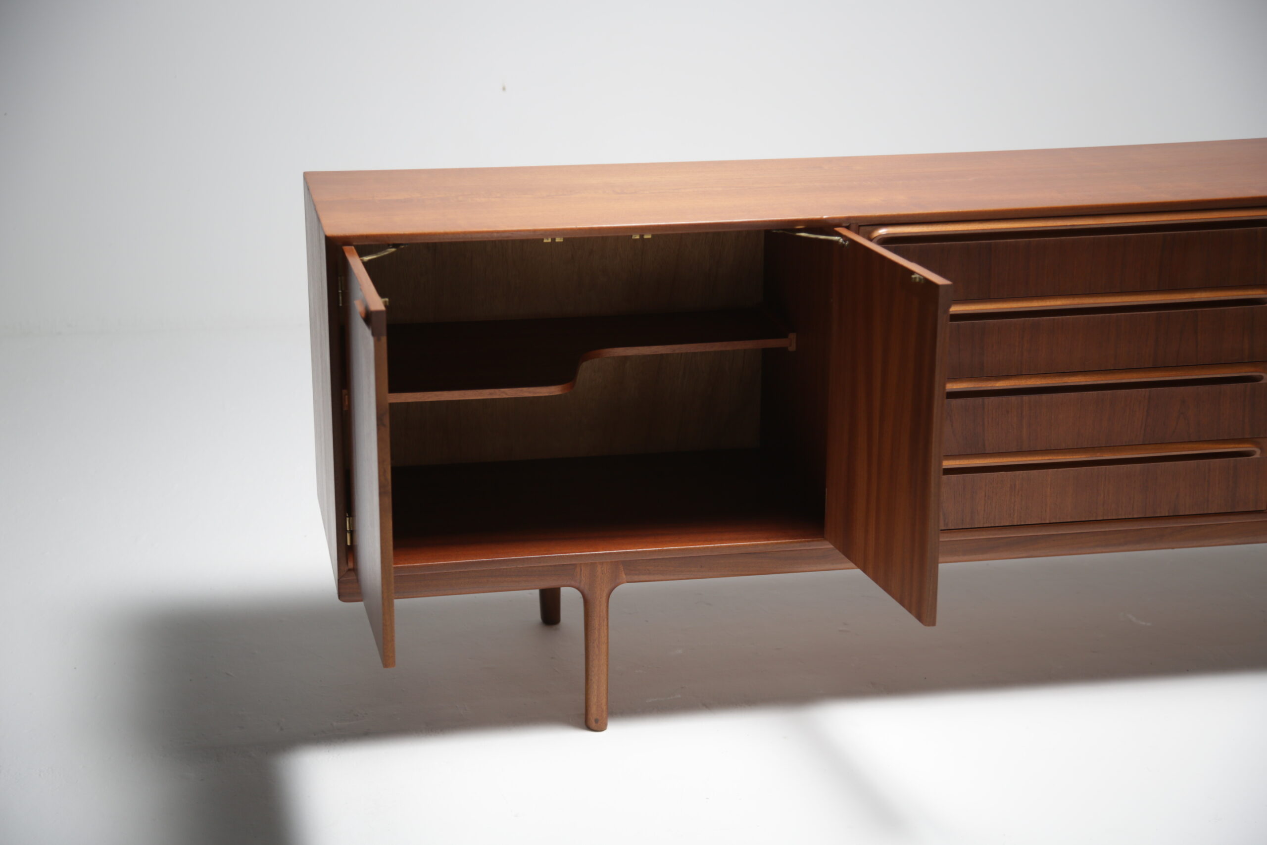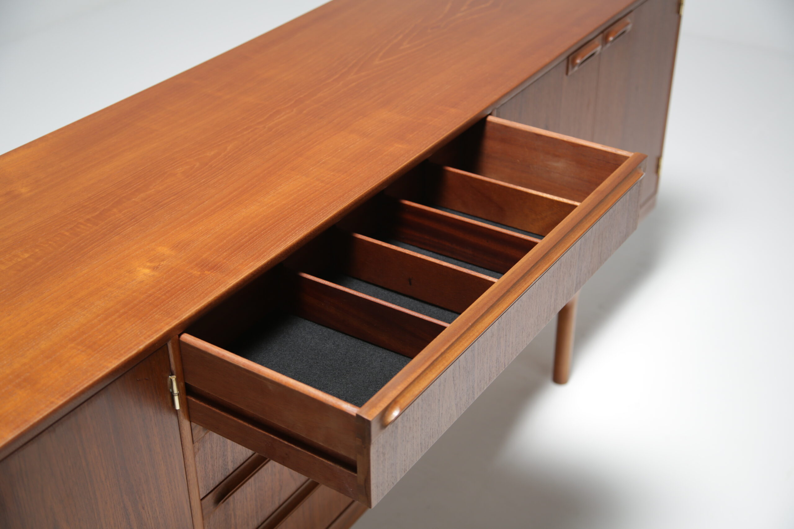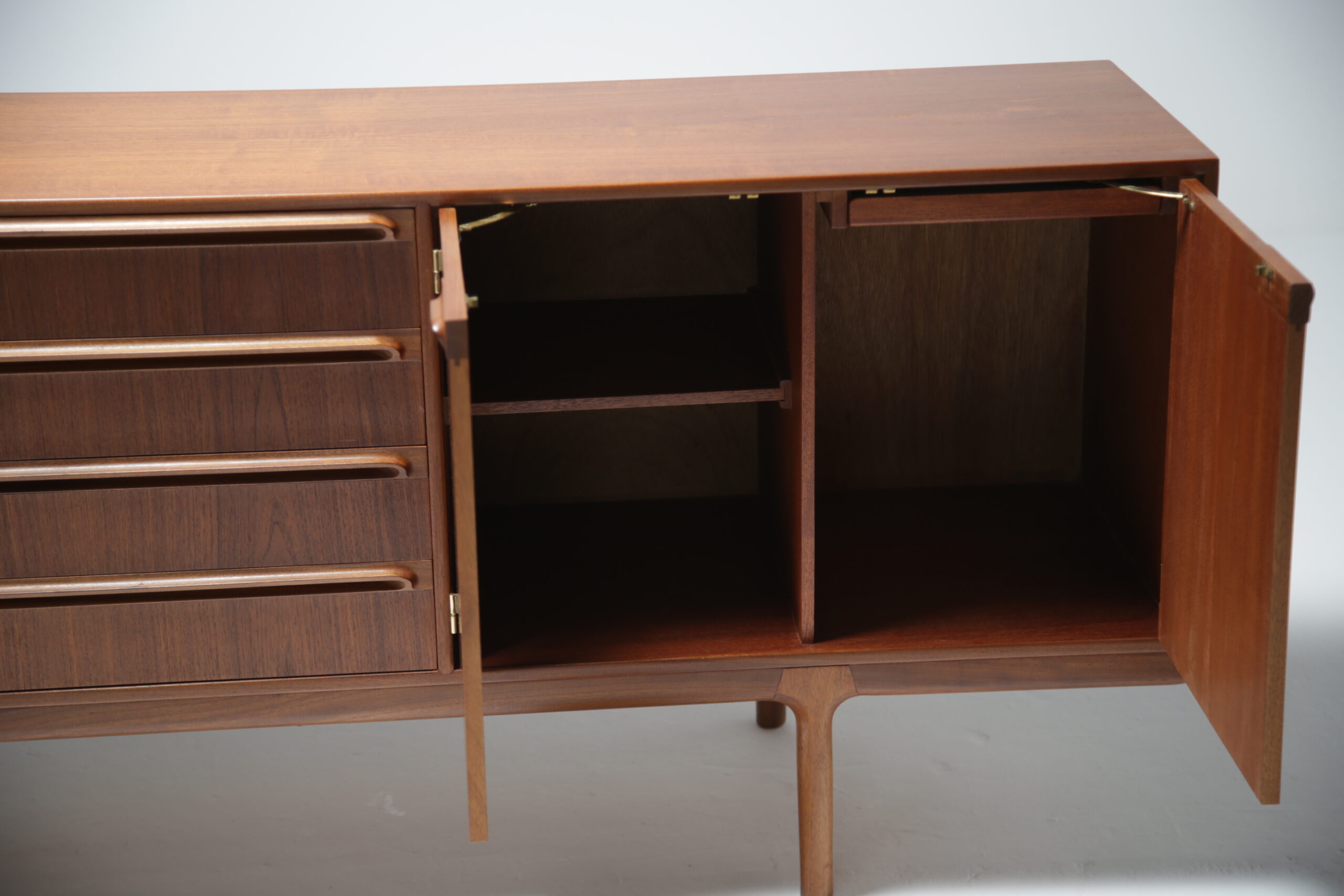 McIntosh of Kirkaldy, Scotland is a well-respected company known for their high-quality and beautifully designed furniture, particularly their sideboards. This particular piece, a teak sideboard, is no exception. The sideboard features two large cupboard spaces on either side of a set of four drawers, providing ample storage space. The left-hand cupboard is particularly noteworthy, featuring a bar section with McIntosh’s signature Formica slide-out cocktail shelf. The shelf not only adds a touch of drama when mixing drinks, but also protects the piece from spills and can be conveniently slid away when not in use. This sideboard has been expertly restored to retain its vintage look and feel, while also ensuring it is in excellent condition.