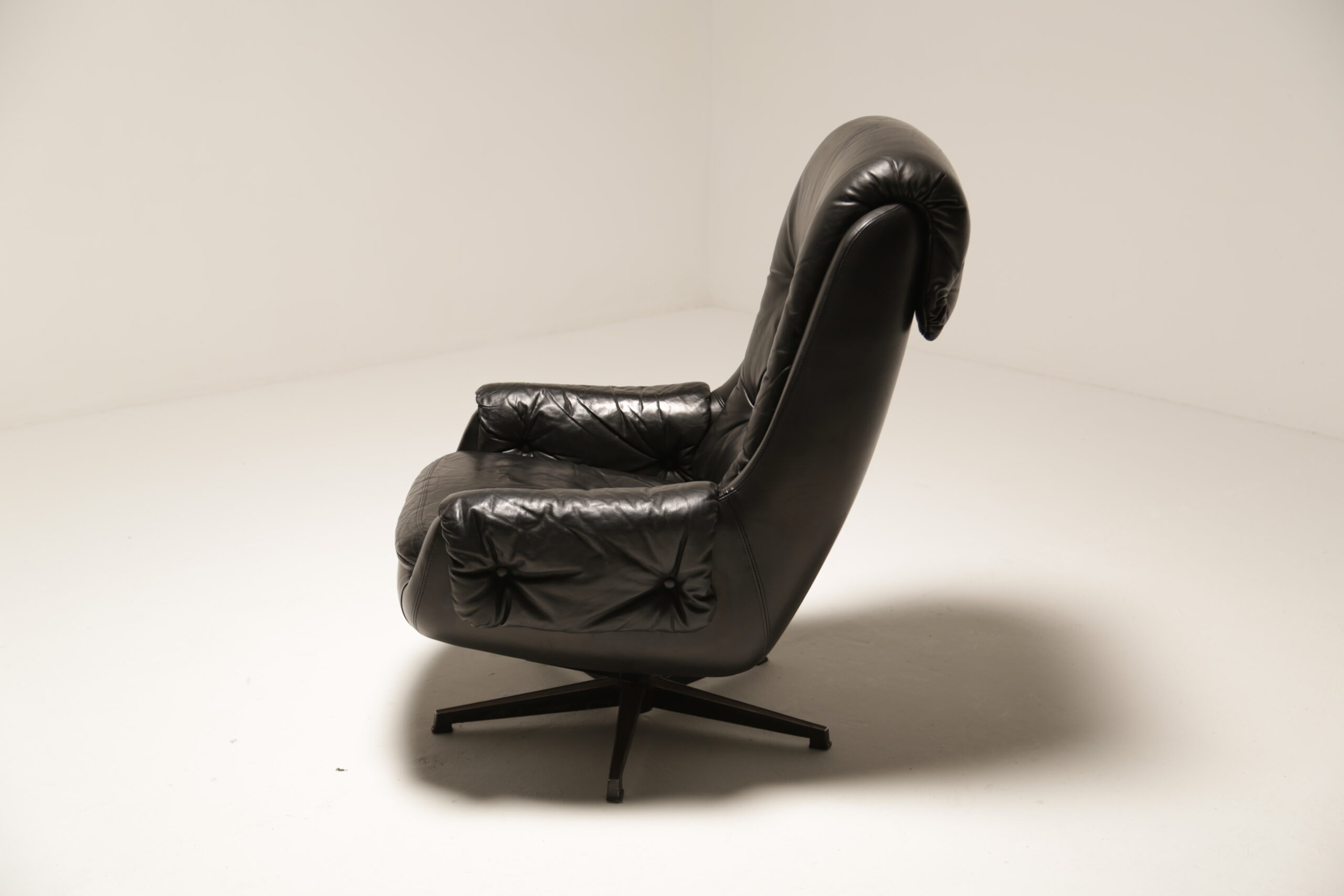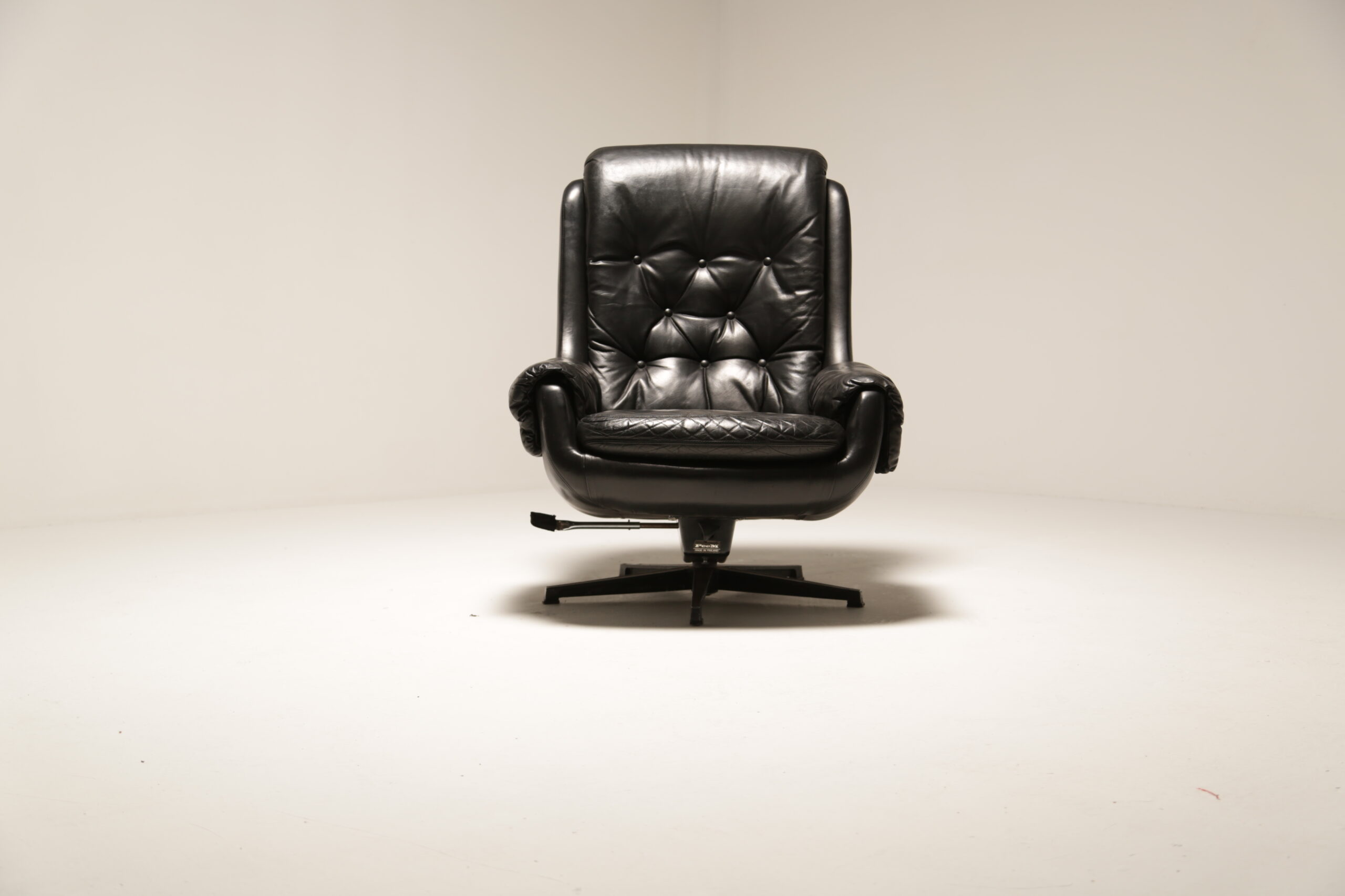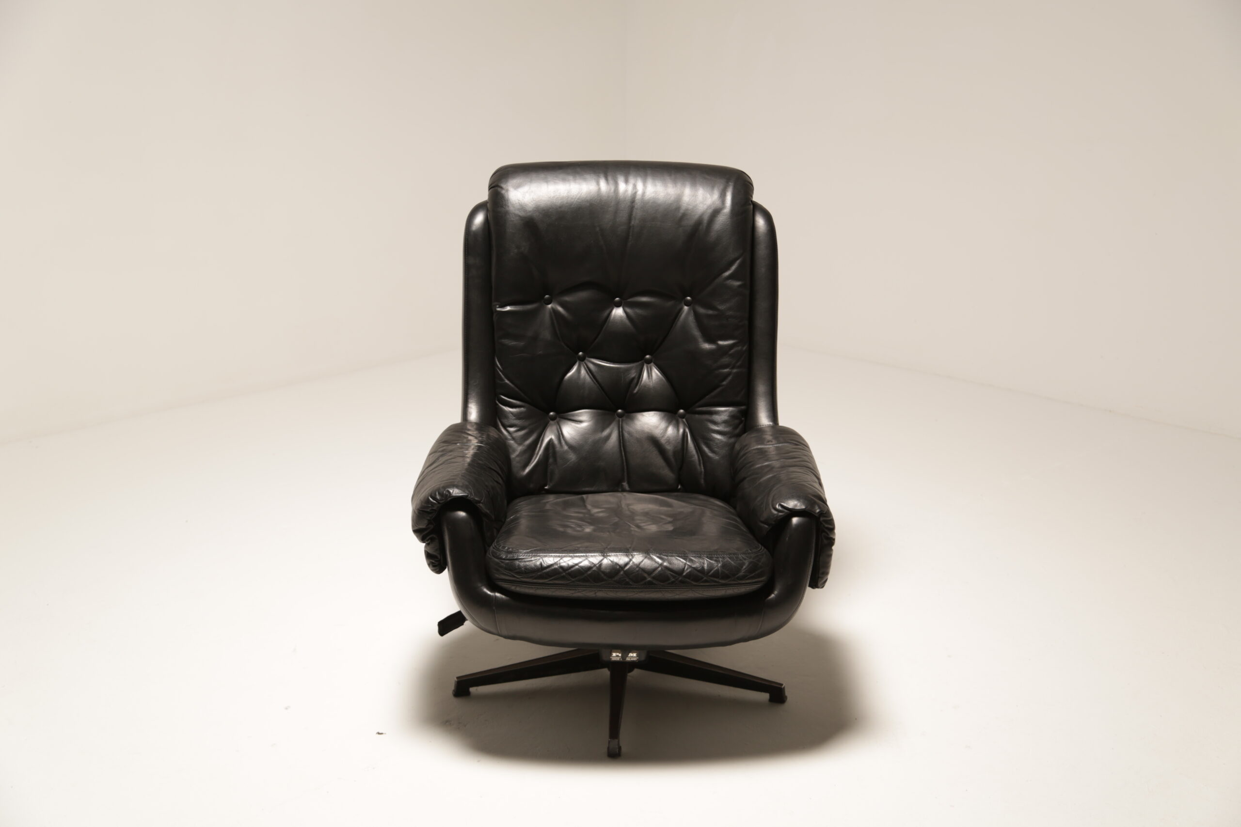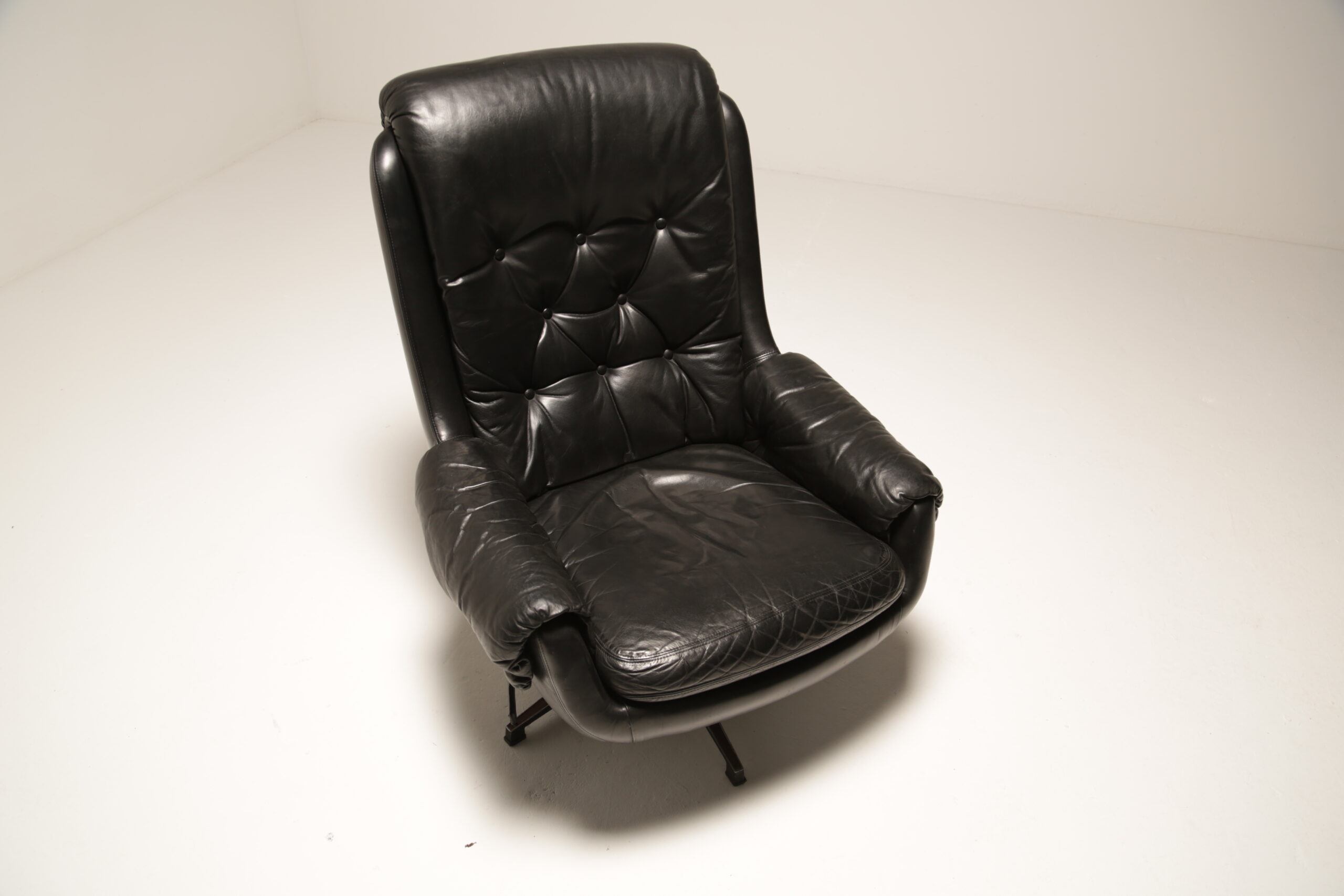 Gorgeous vintage patina black leather swivel arm chair which reclines. What more could you ask for? 🙂 Super comfortable to sit in for reading, watching your favorite TV show or just to relax in after a long day of being out and about.