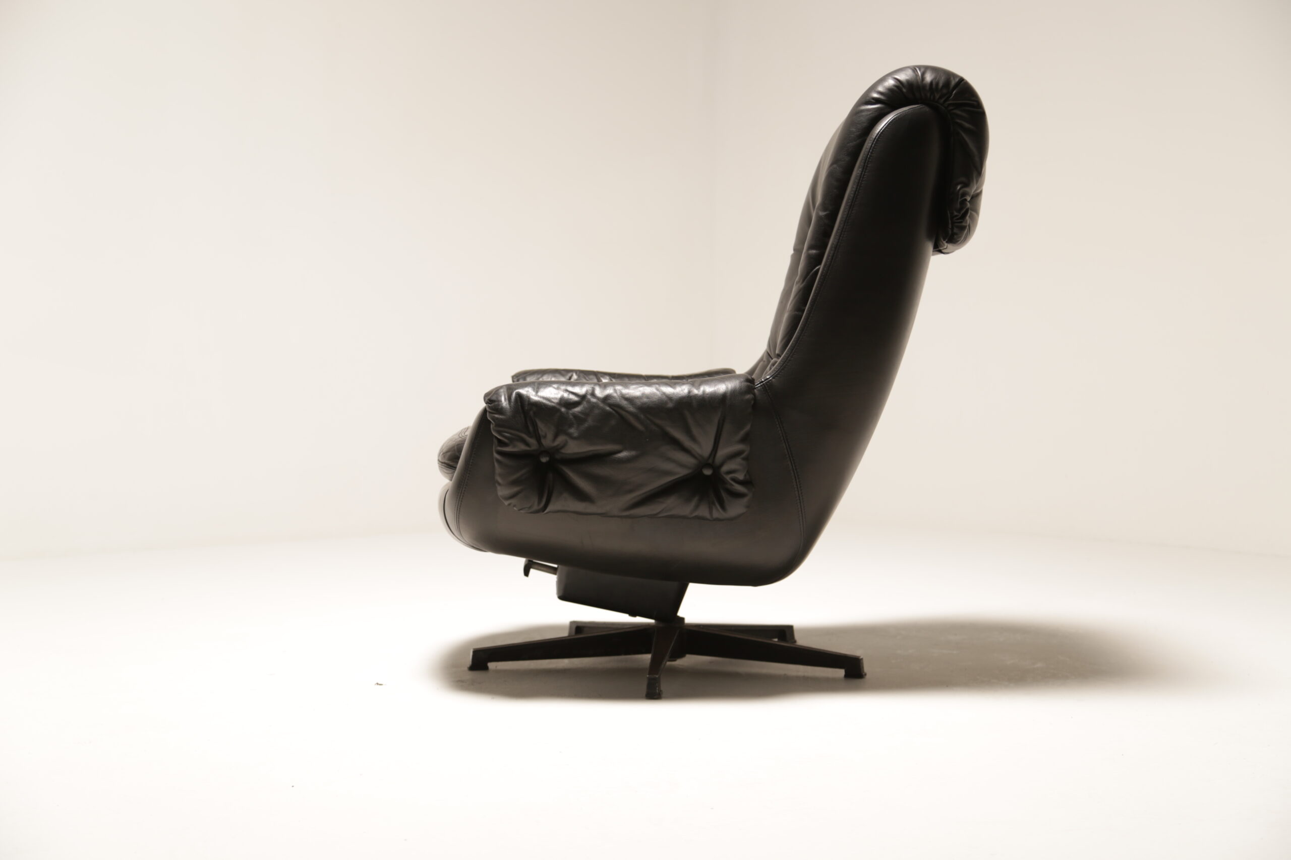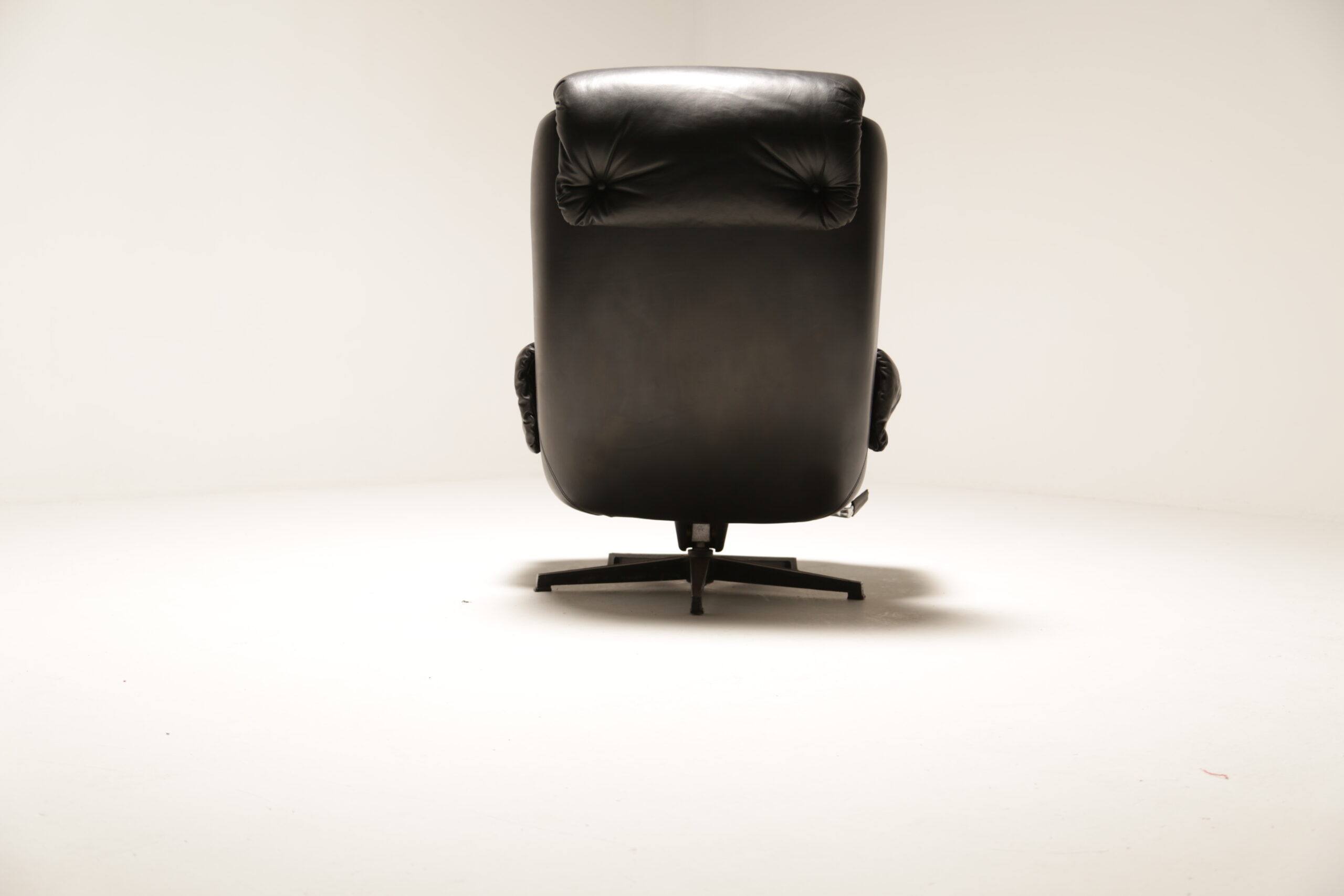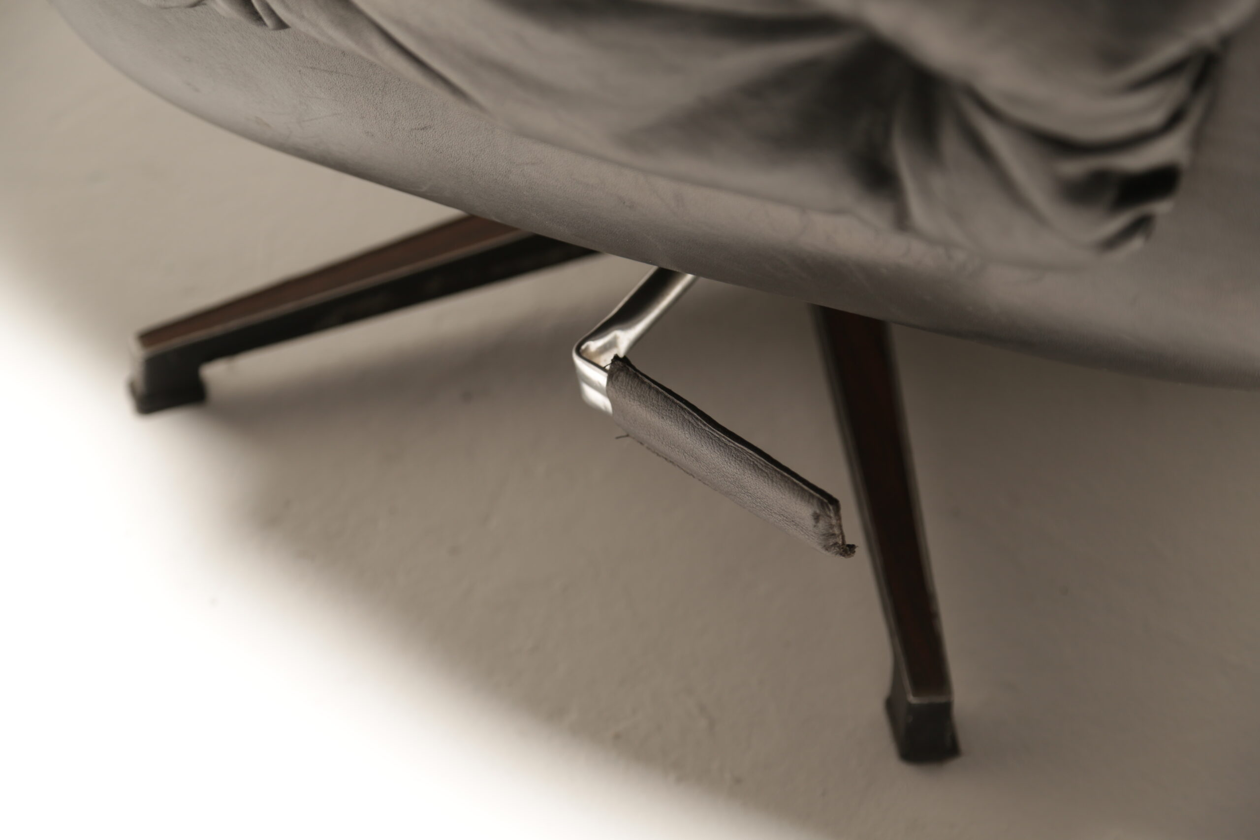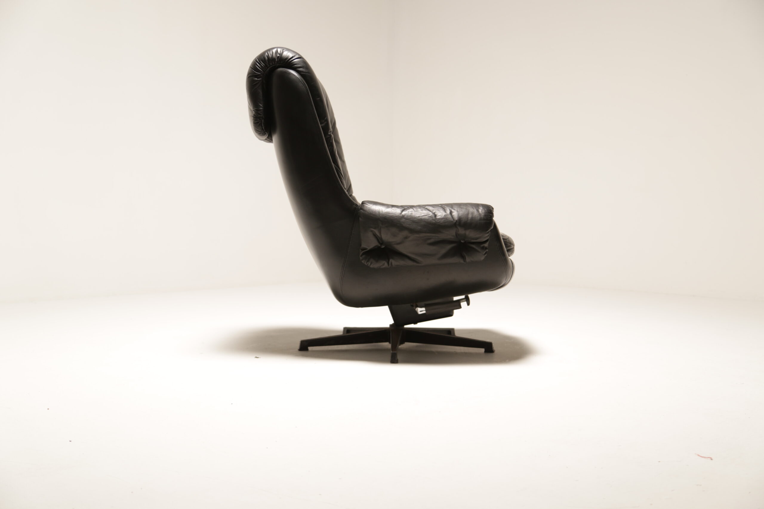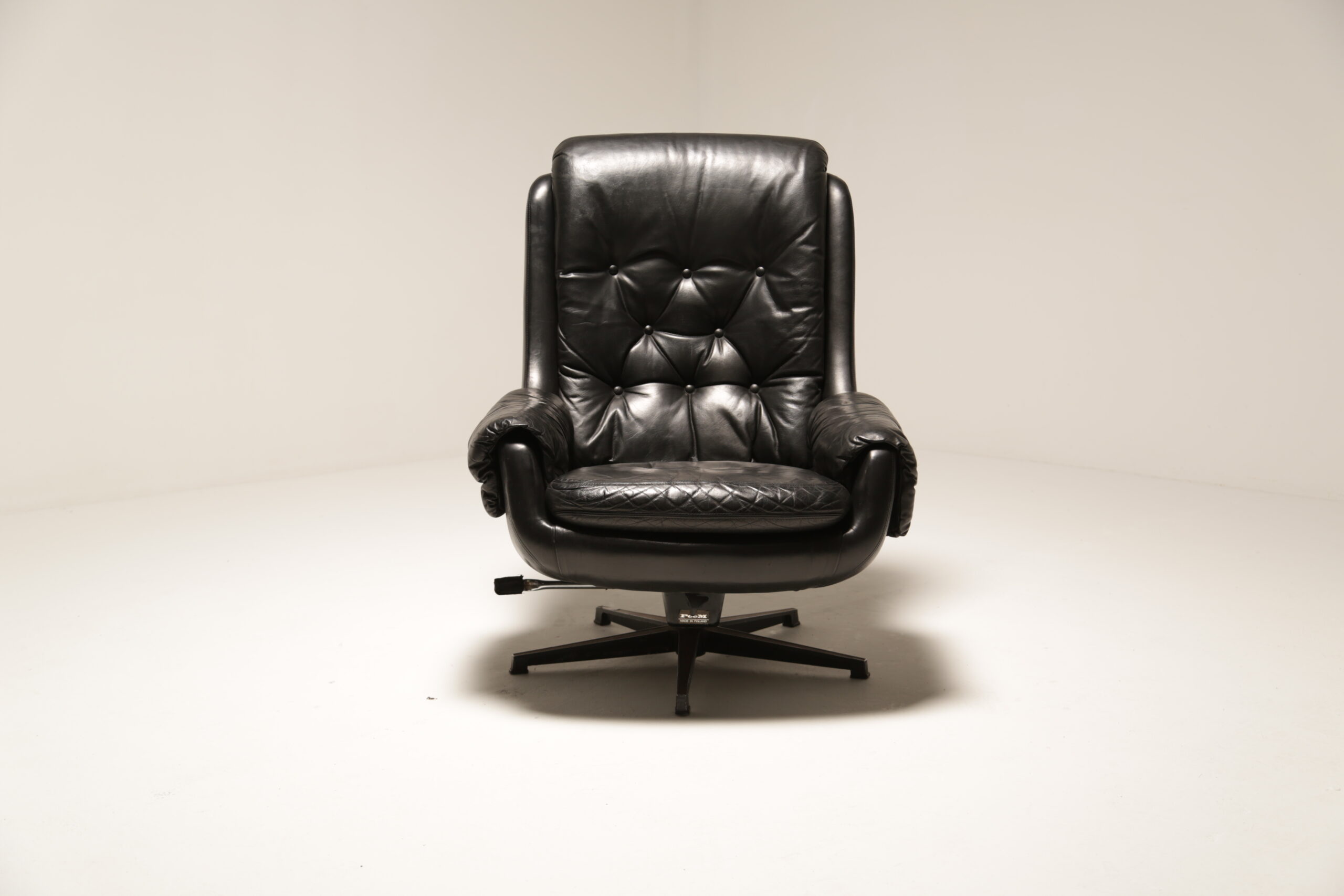 Gorgeous vintage patina black leather swivel arm chair which reclines. What more could you ask for? 🙂 Super comfortable to sit in for reading, watching your favorite TV show or just to relax in after a long day of being out and about.