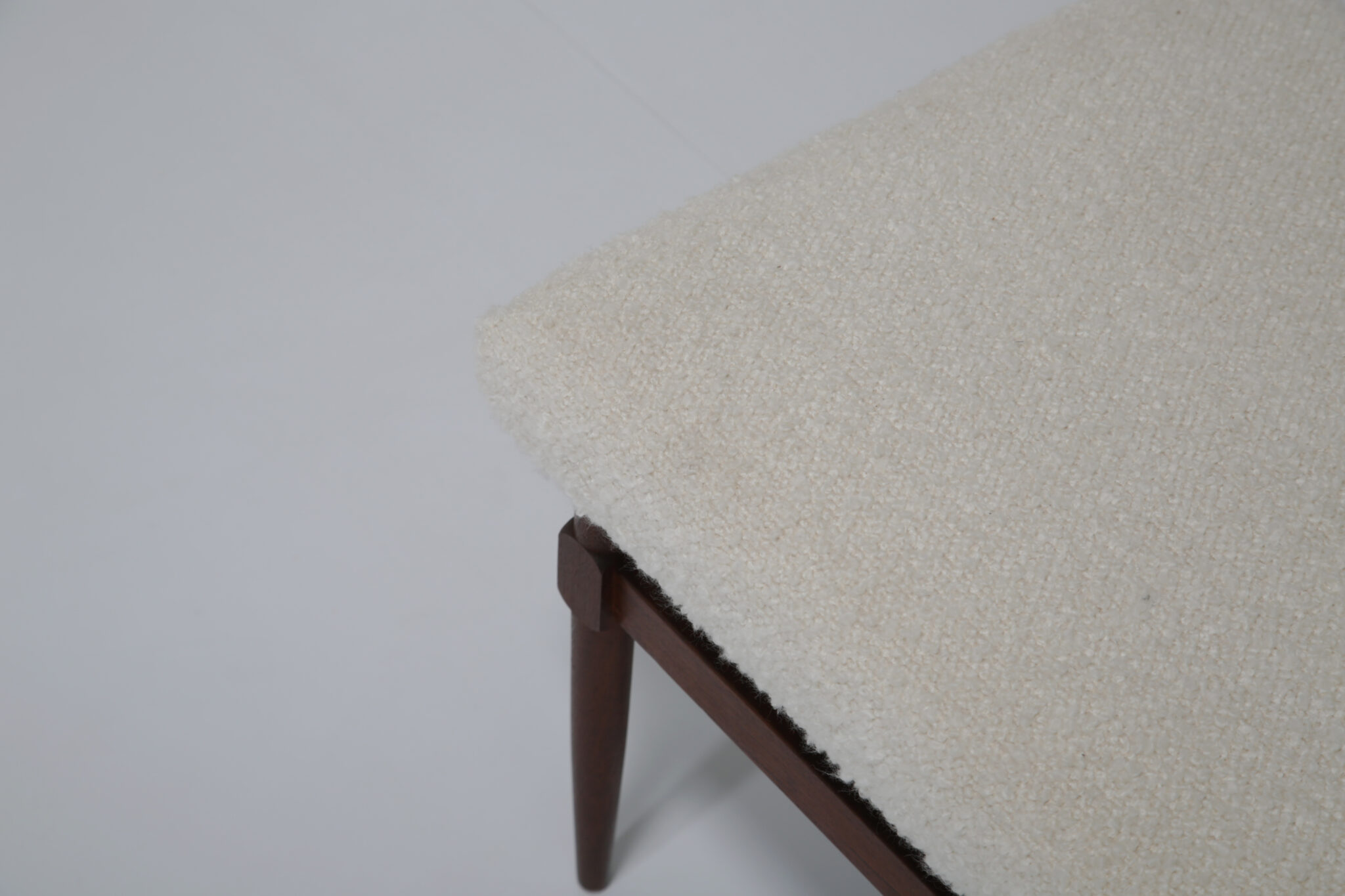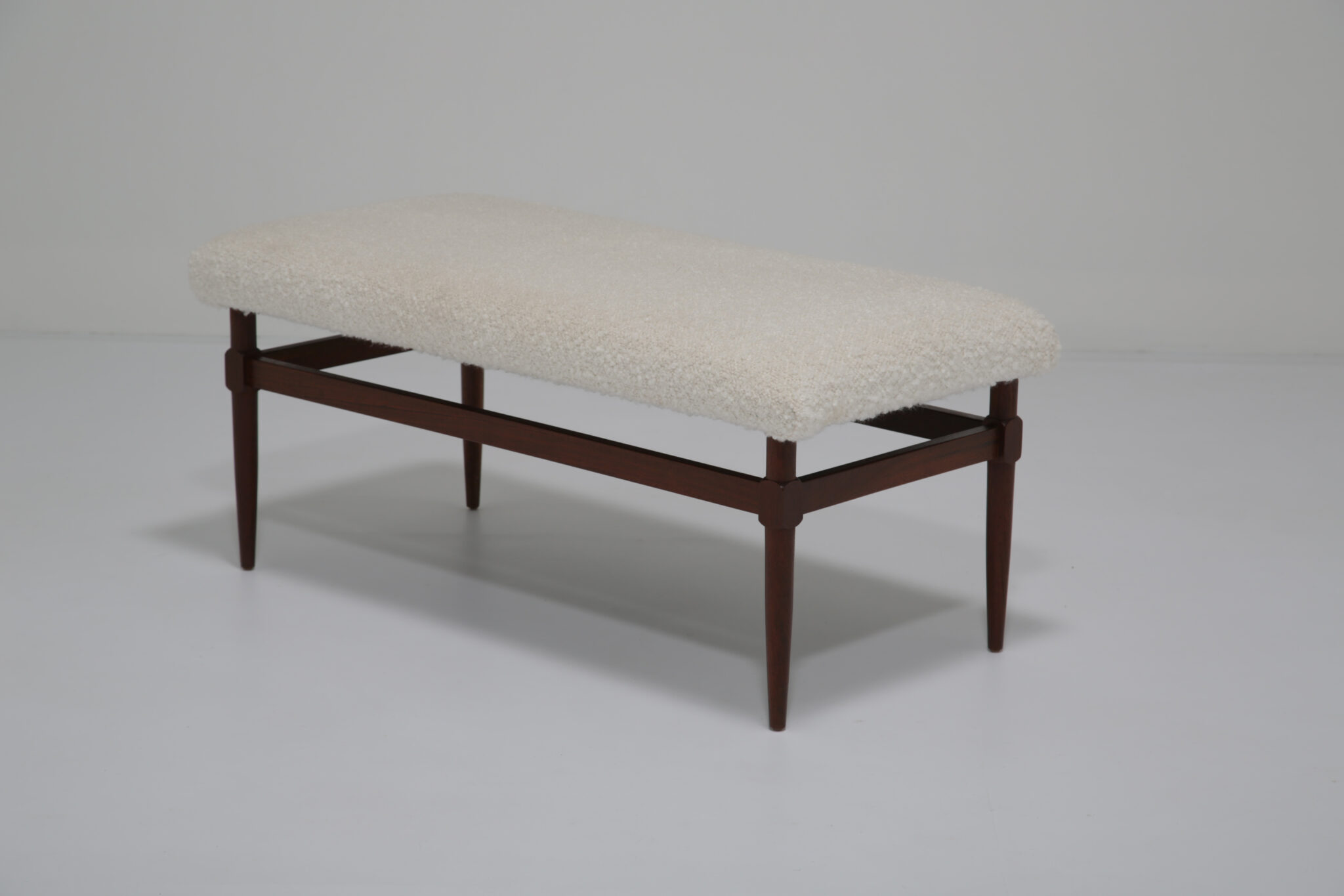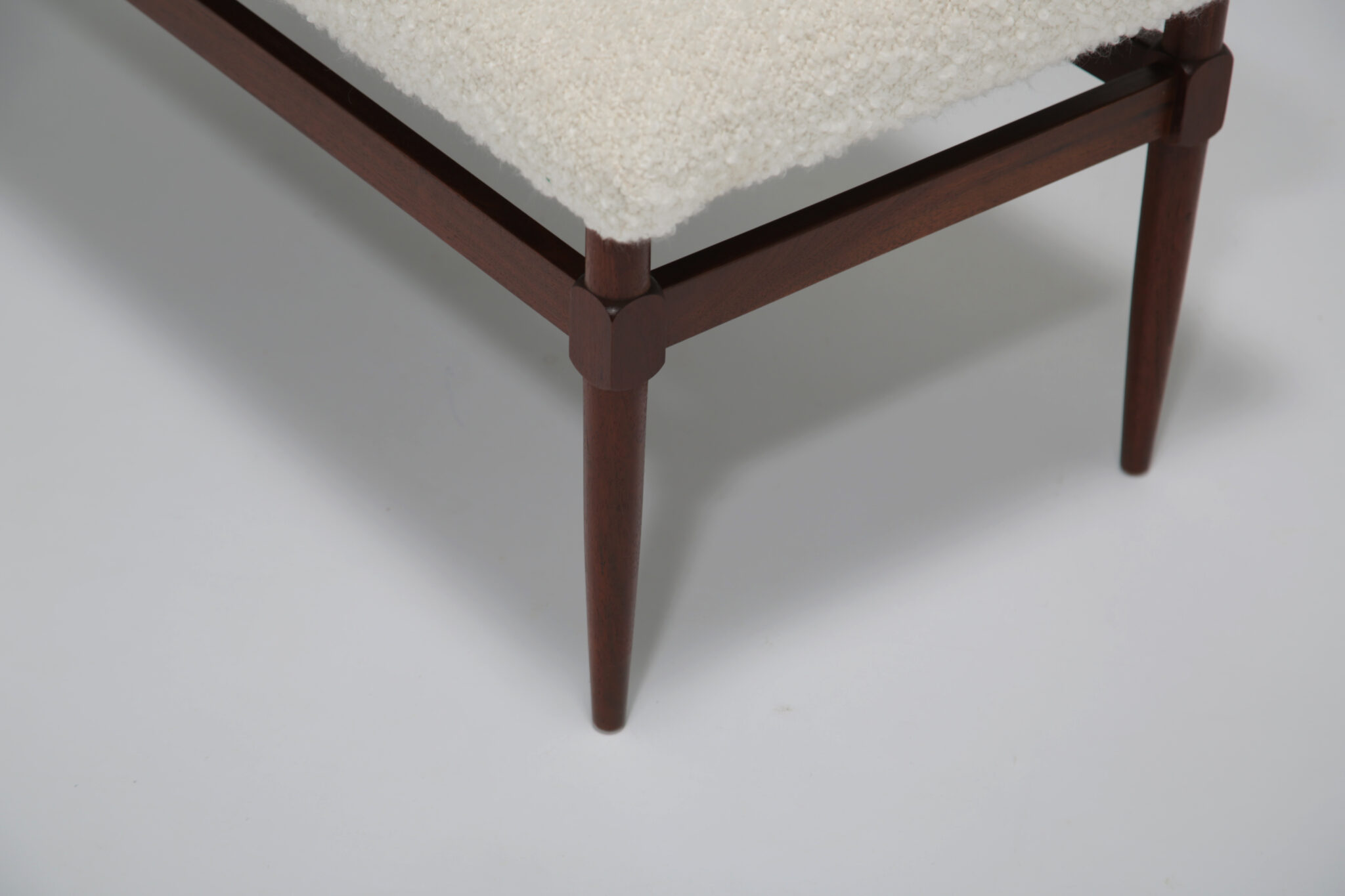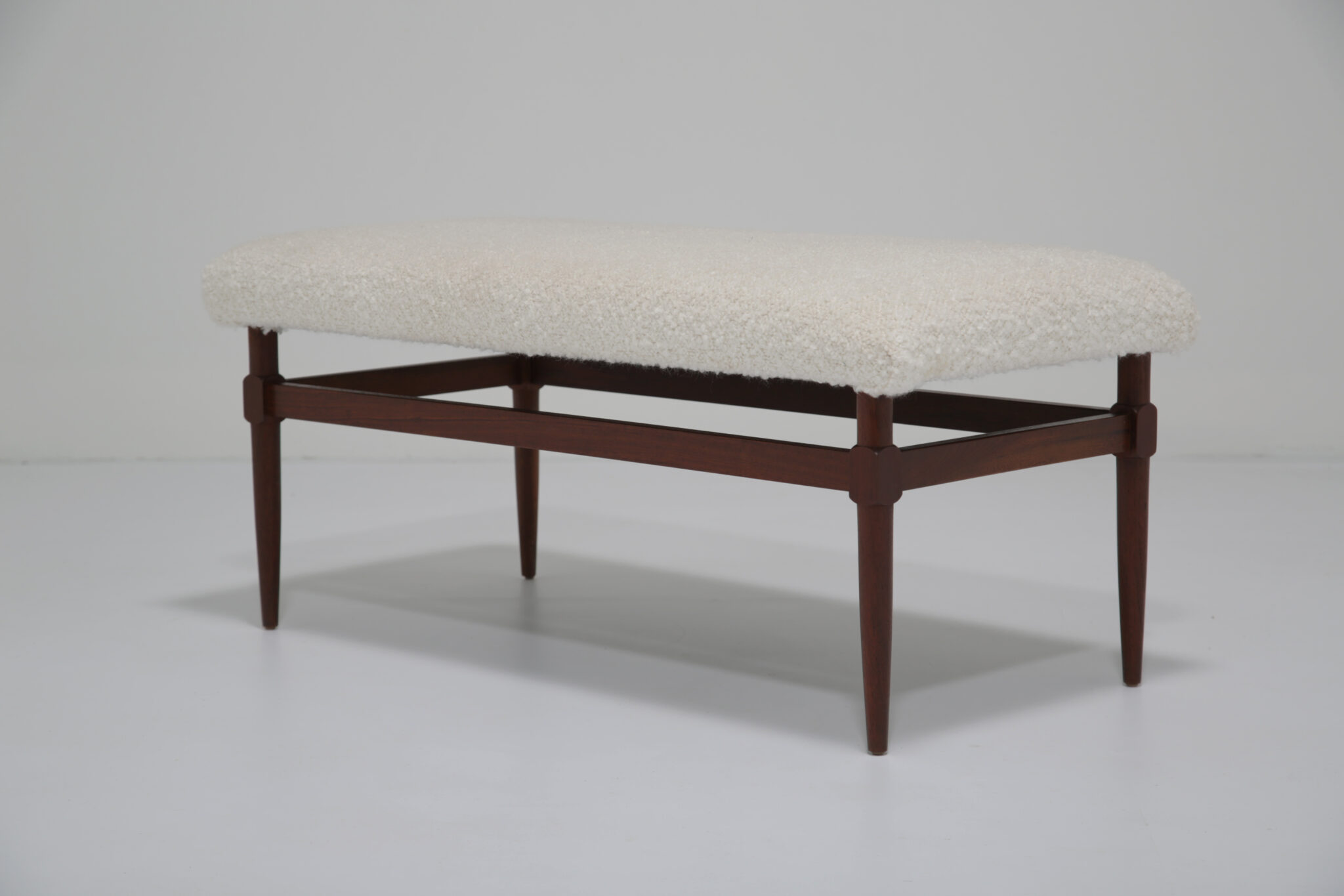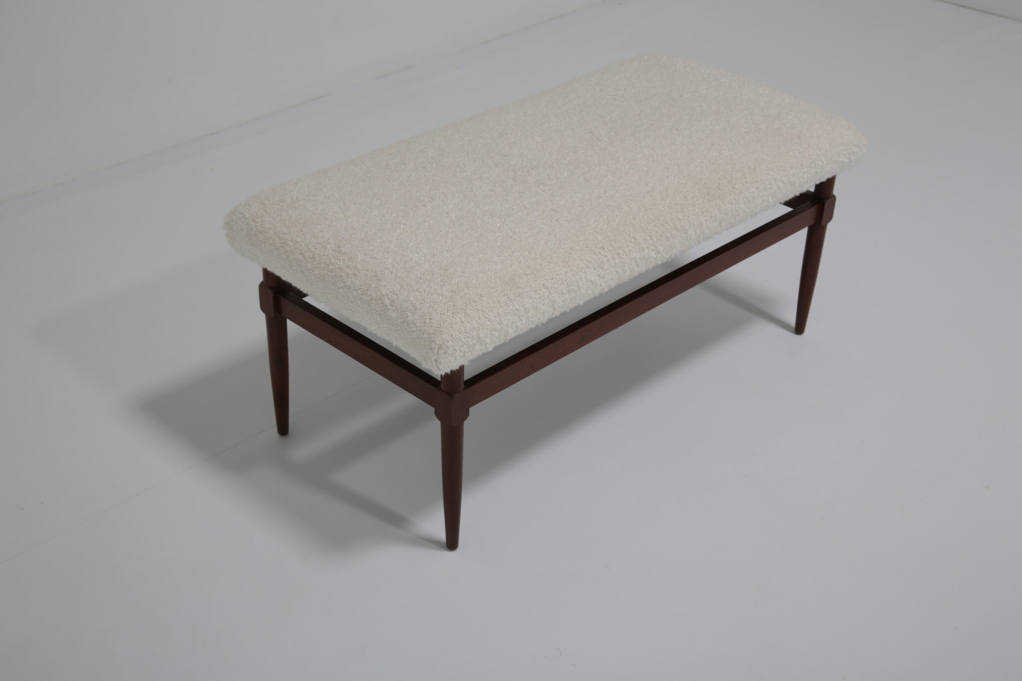 Looking for the perfect bench seat for the end of your bed, your vanity table, living room or even a hallway? This beauty could be the one you are looking for. The seat is upholstered in a lovely white bouclé and sits on a restored walnut frame, a stunning combination. The design is minimalist with nicely rounded and tapered legs. This piece was imported from the States and have been transformed to a piece to be loved and cherished for many years to come.