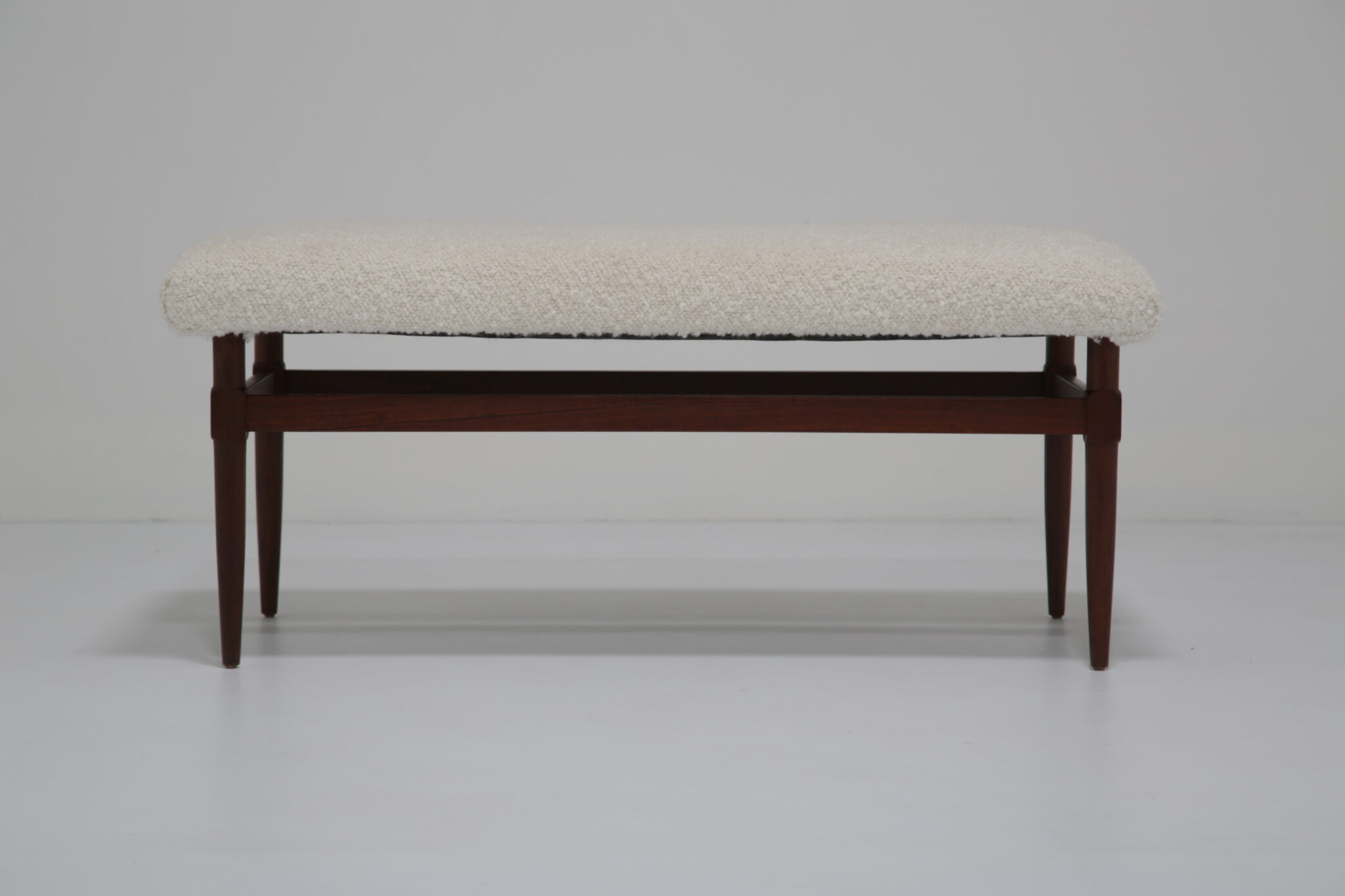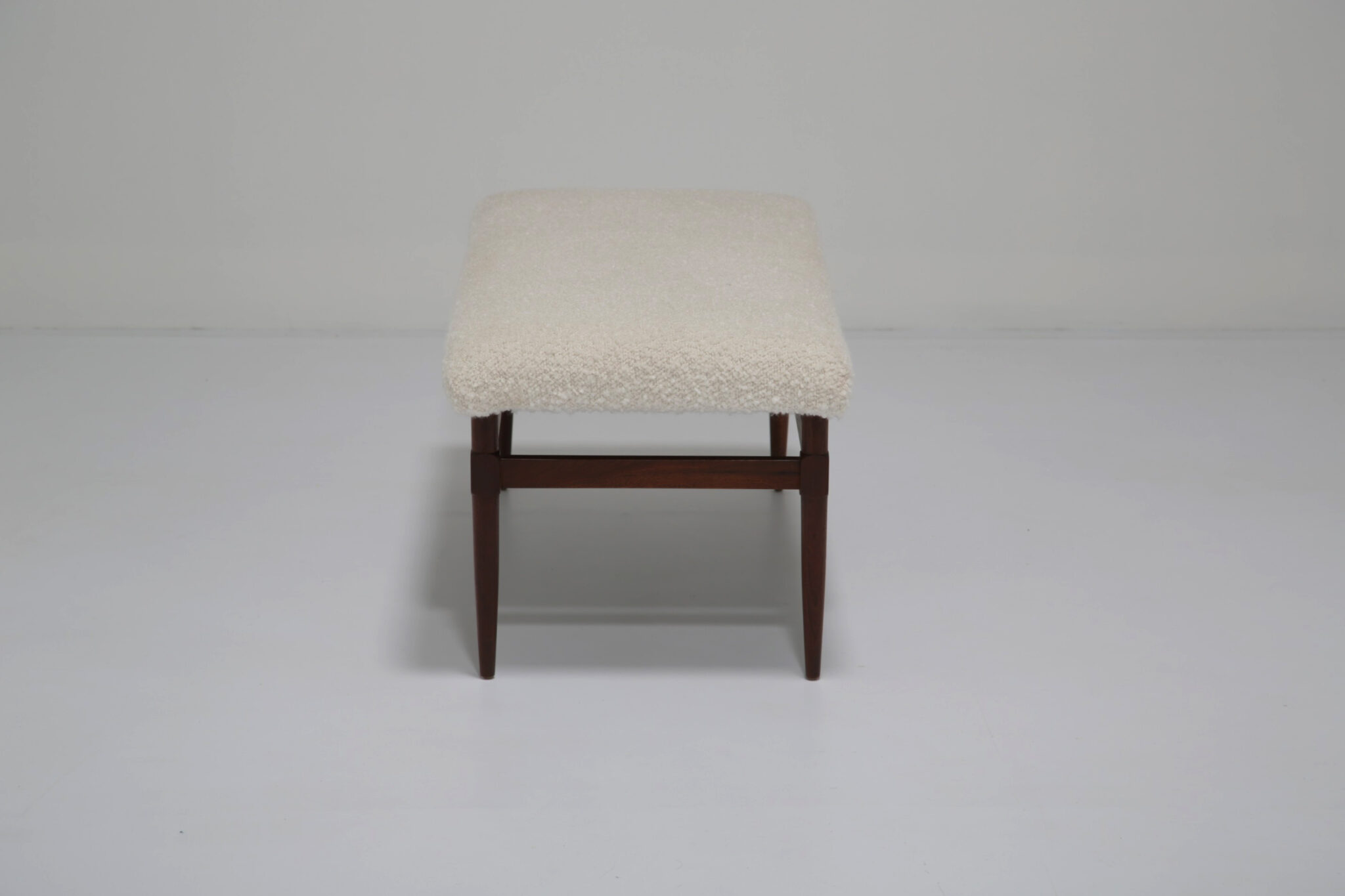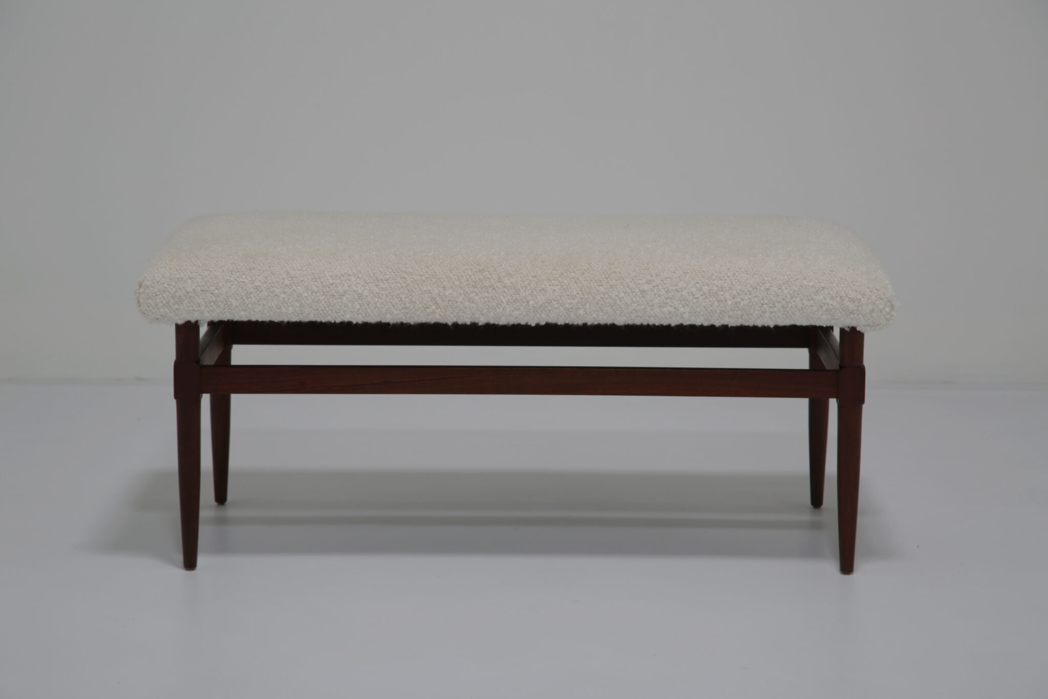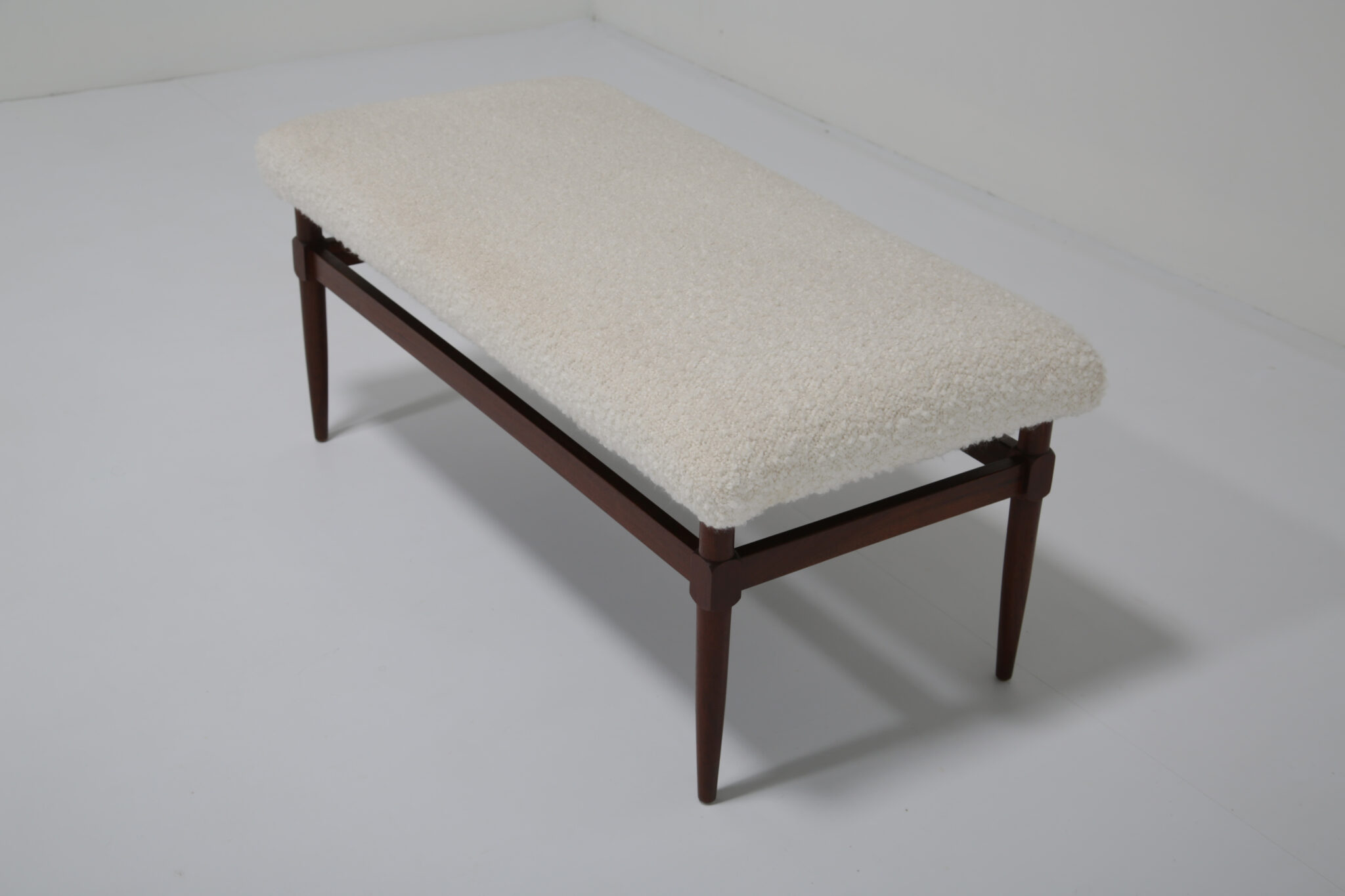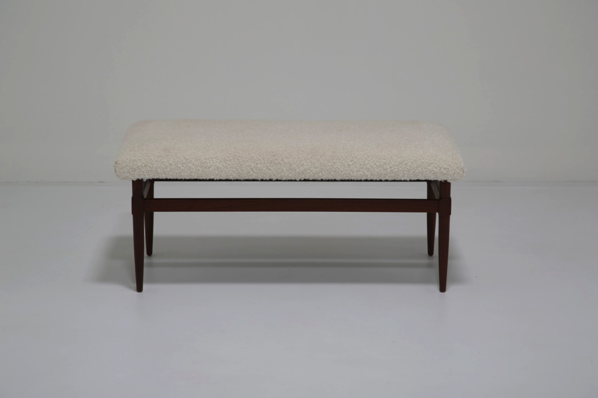 Looking for the perfect bench seat for the end of your bed, your vanity table, living room or even a hallway? This beauty could be the one you are looking for. The seat is upholstered in a lovely white bouclé and sits on a restored walnut frame, a stunning combination. The design is minimalist with nicely rounded and tapered legs. This piece was imported from the States and have been transformed to a piece to be loved and cherished for many years to come.