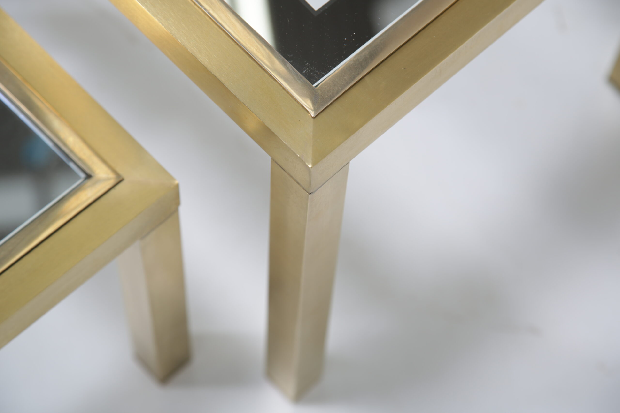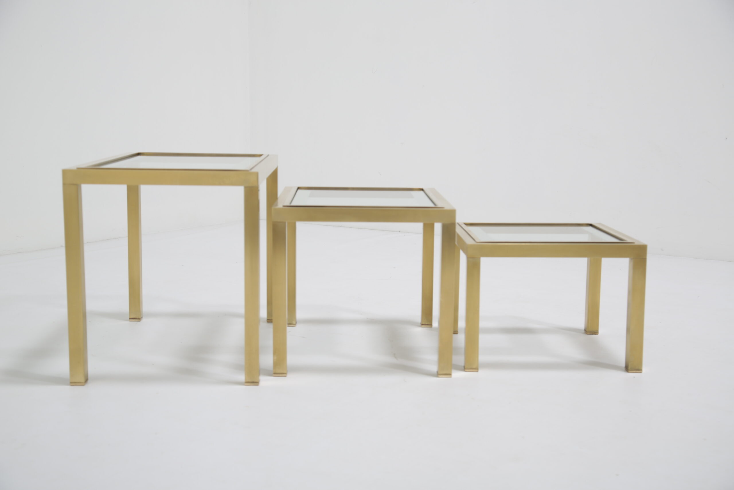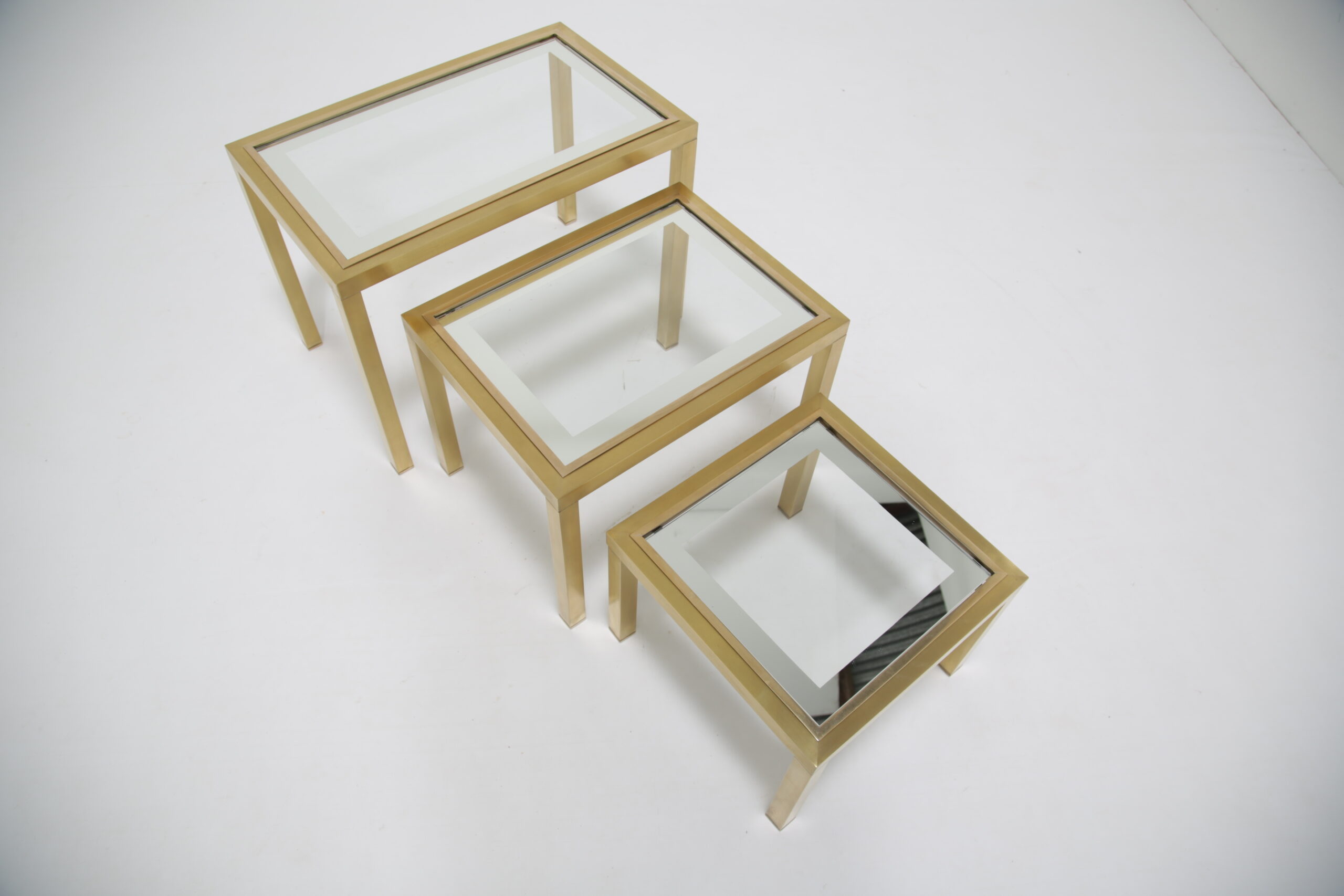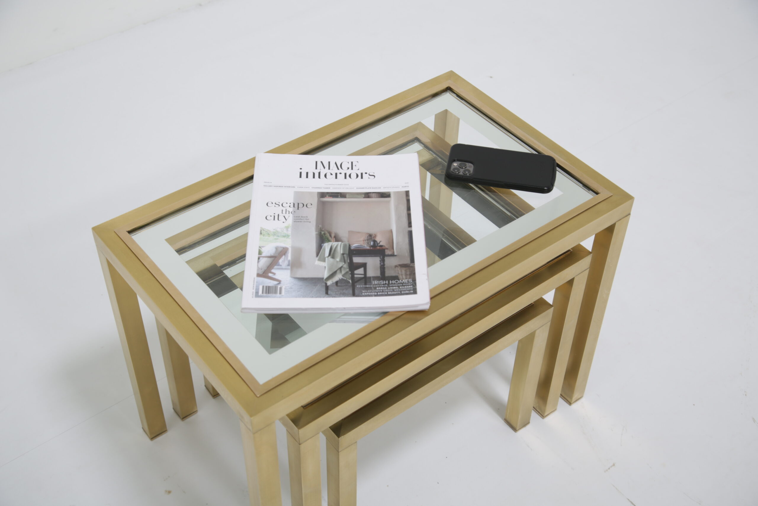 Take a look at these stunning nest of tables in brass with mirrored and clear glass inserts that slots nicely into the frame. These tables are manufactured in solid brass and has been professionally polished for a nice clean finish. Perfect for a living room space that requires extra tables or even for a commercial place such as a lounge or office. Designer remains unknown but these were purchased in Italy.