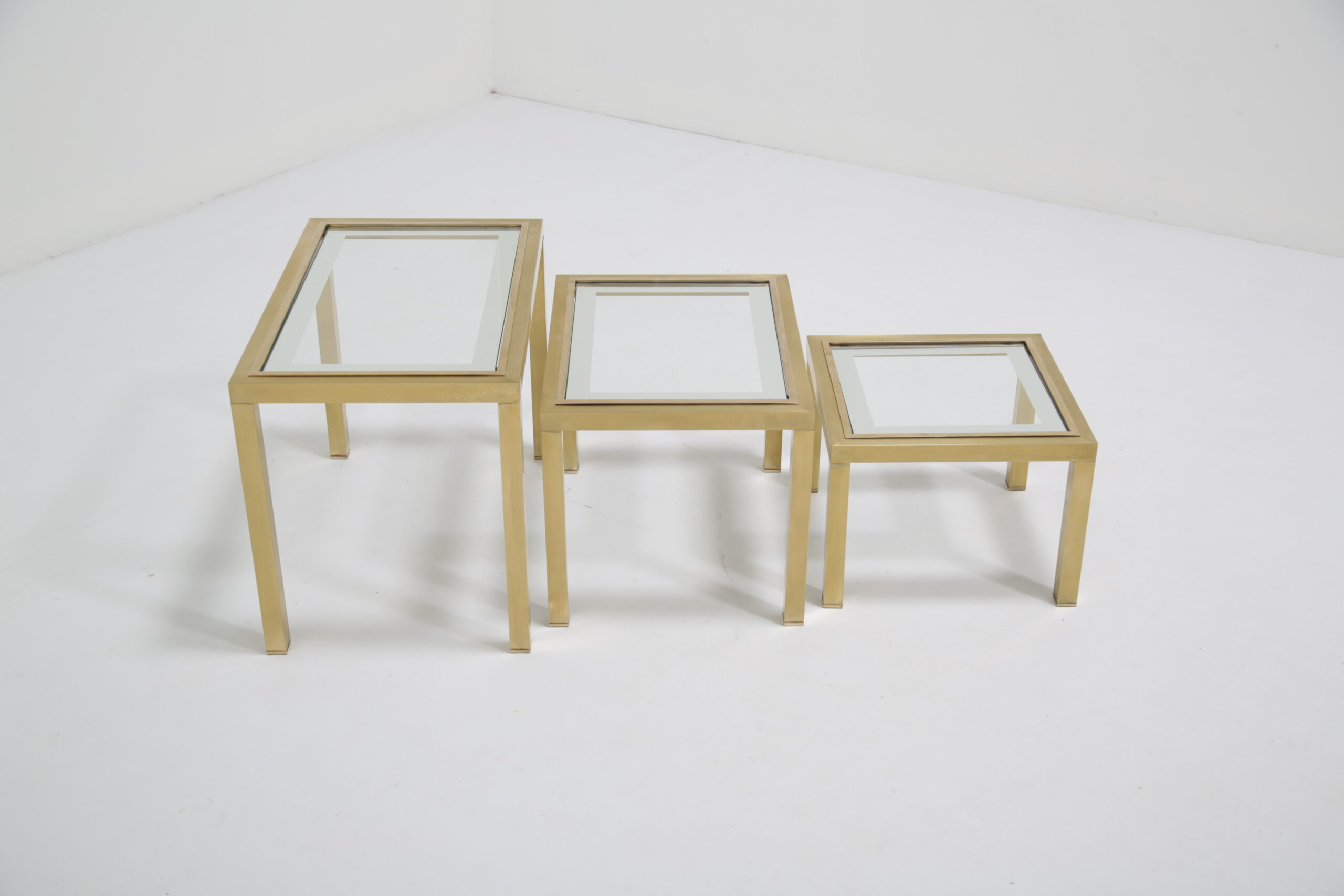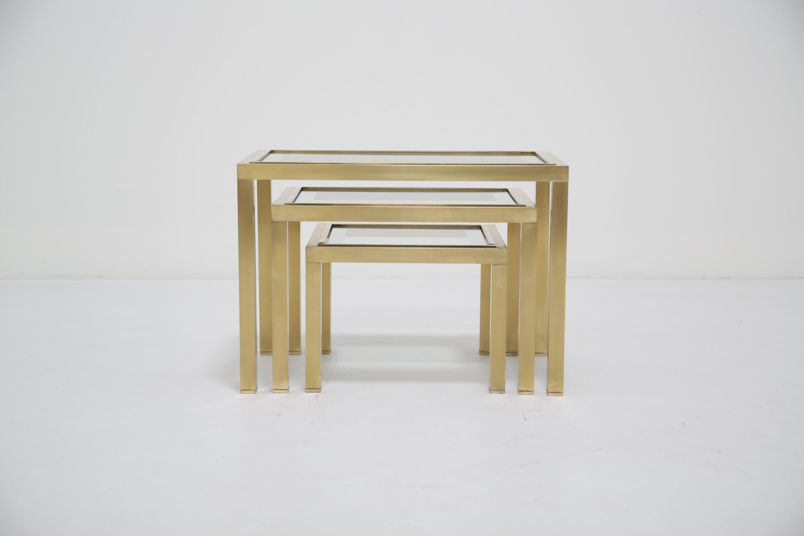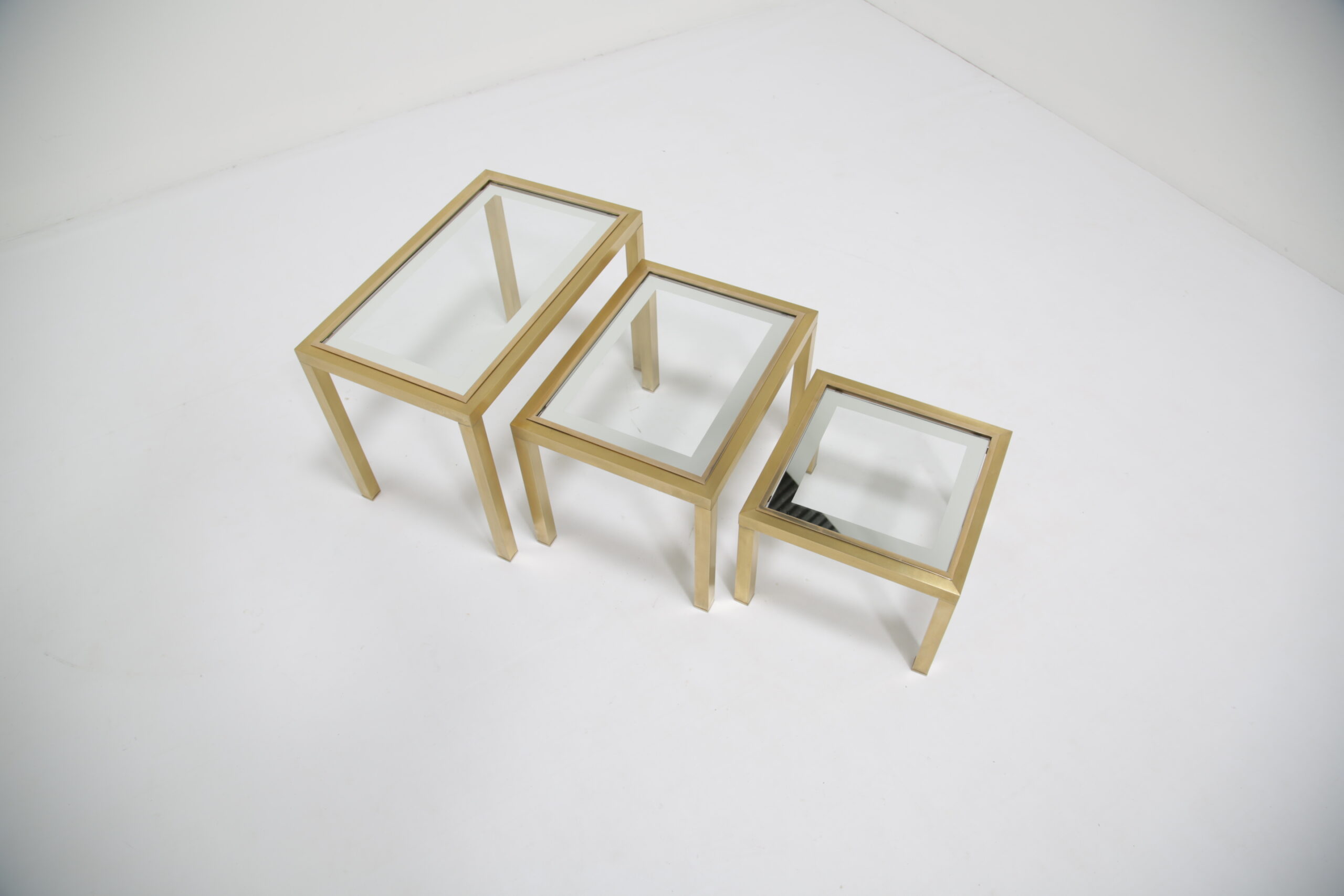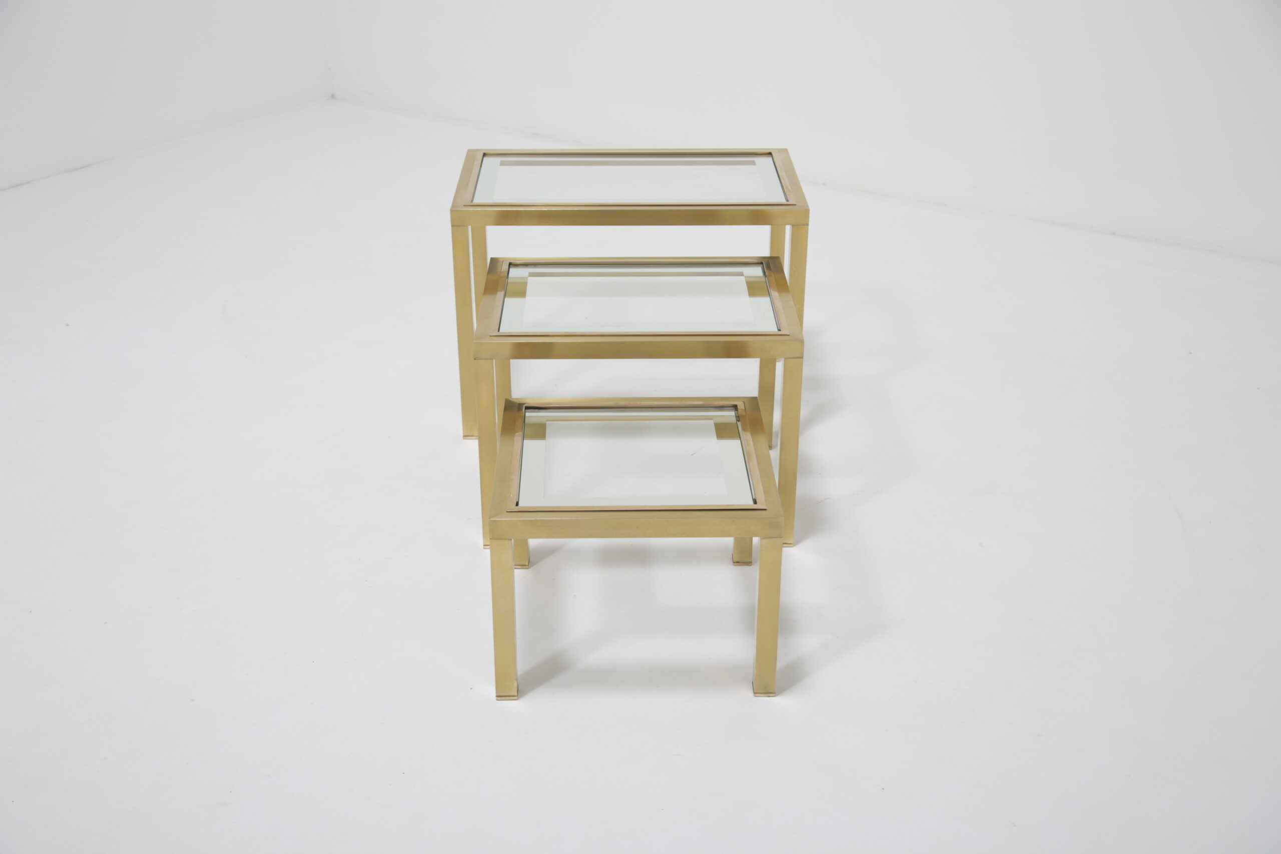 Take a look at these stunning nest of tables in brass with mirrored and clear glass inserts that slots nicely into the frame. These tables are manufactured in solid brass and has been professionally polished for a nice clean finish. Perfect for a living room space that requires extra tables or even for a commercial place such as a lounge or office. Designer remains unknown but these were purchased in Italy.