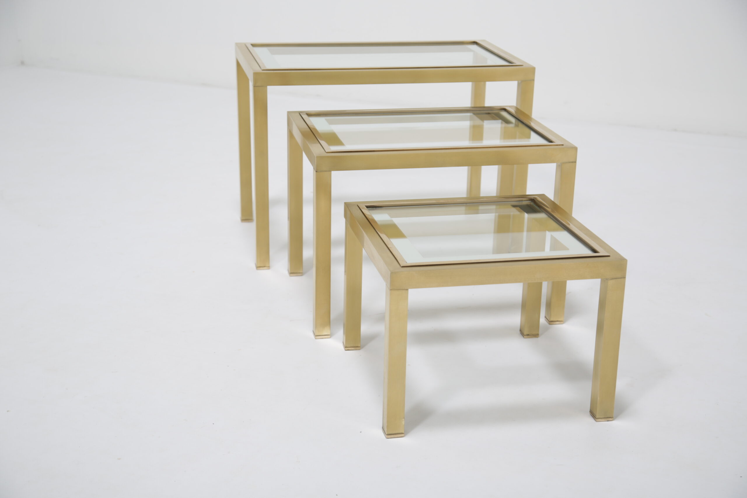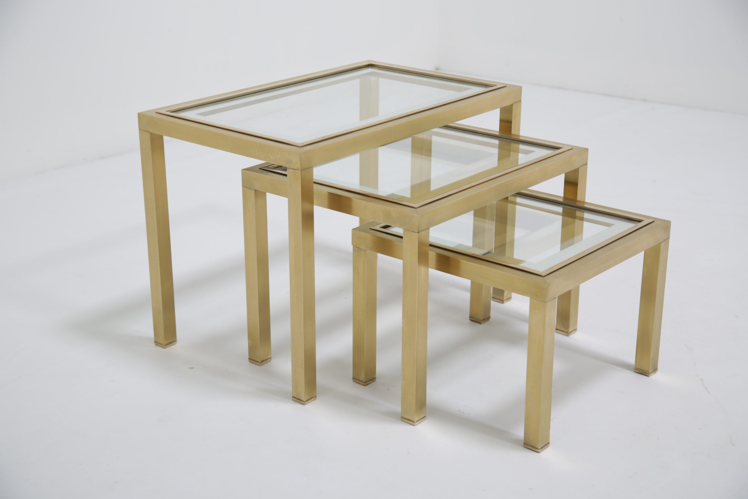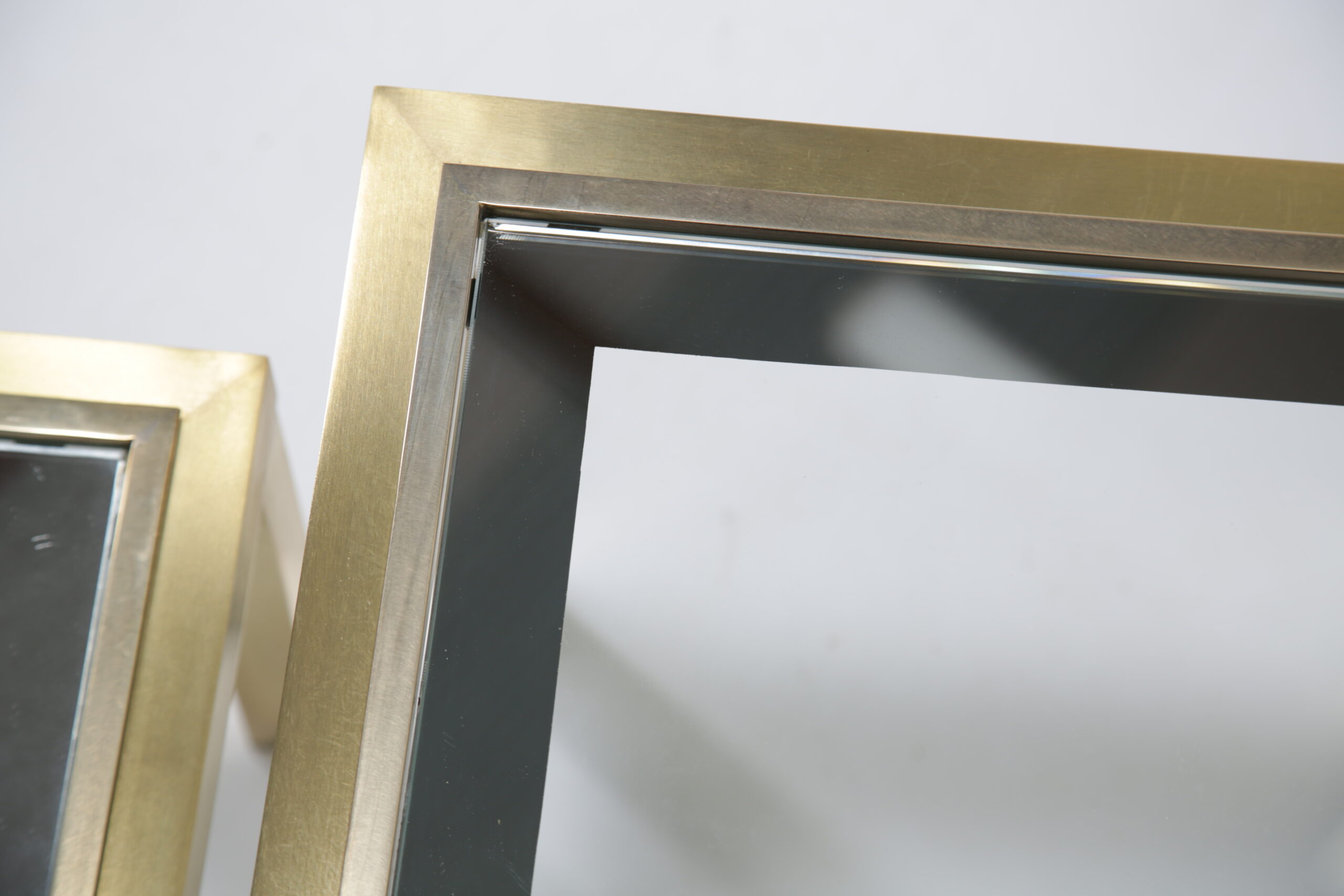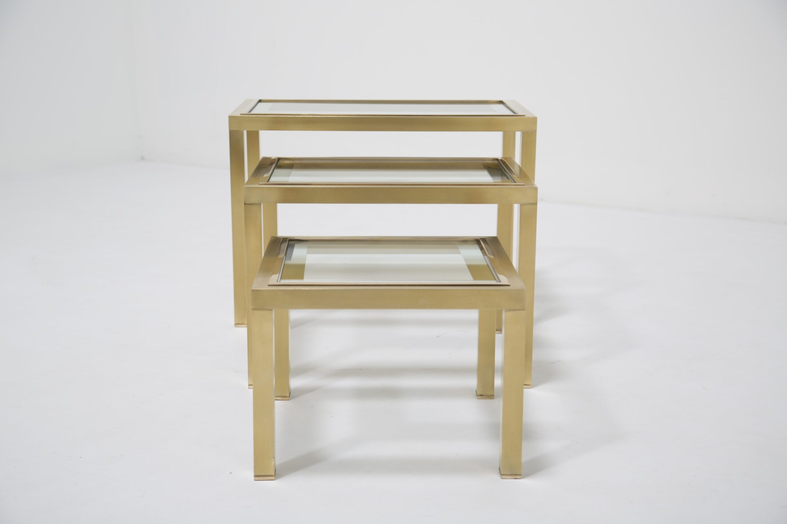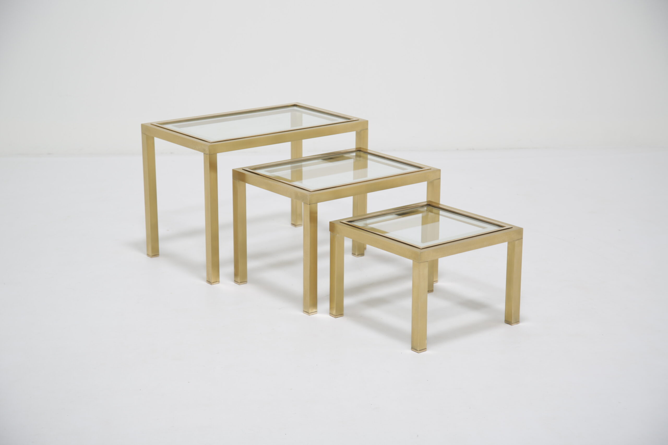 Take a look at these stunning nest of tables in brass with mirrored and clear glass inserts that slots nicely into the frame. These tables are manufactured in solid brass and has been professionally polished for a nice clean finish. Perfect for a living room space that requires extra tables or even for a commercial place such as a lounge or office. Designer remains unknown but these were purchased in Italy.