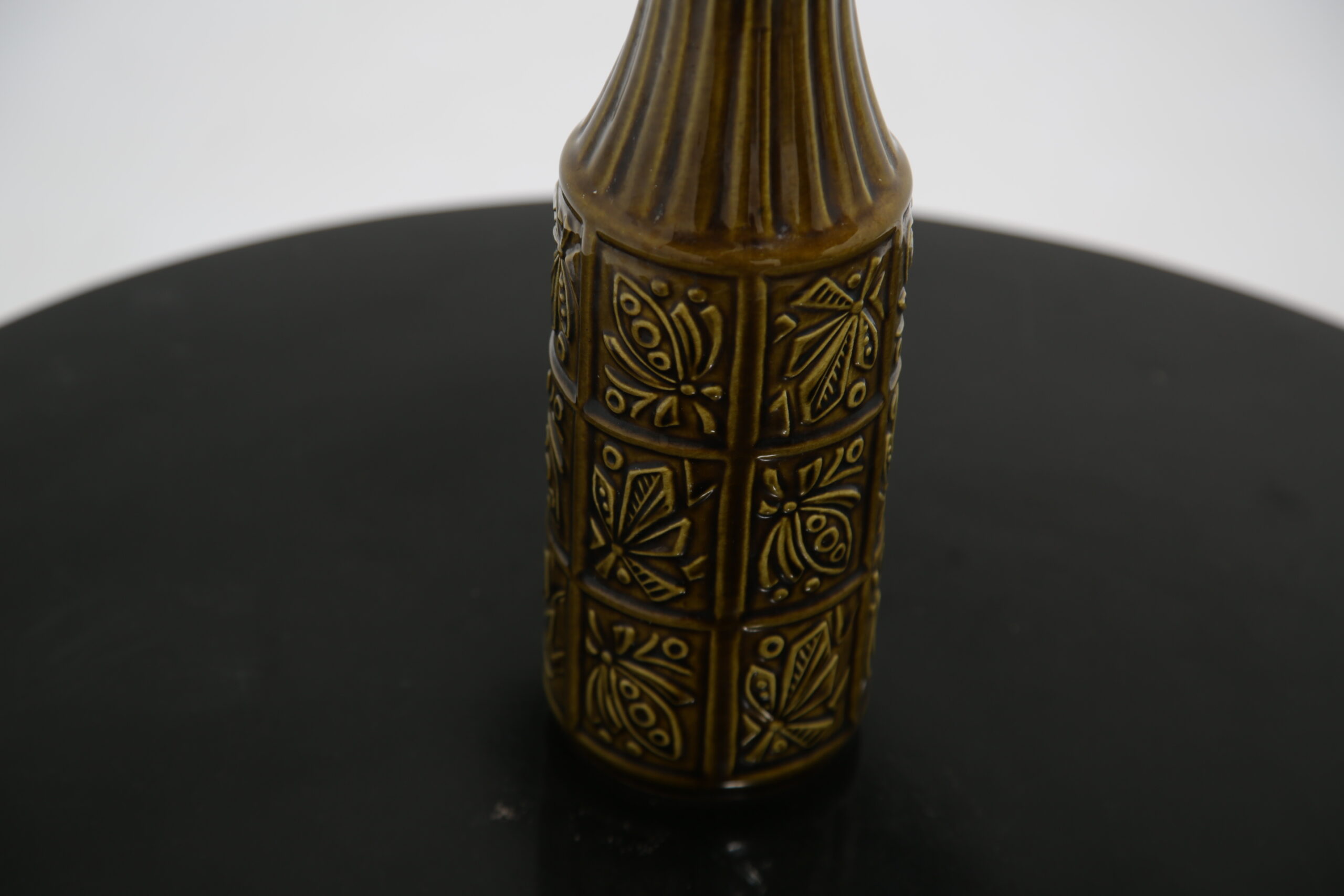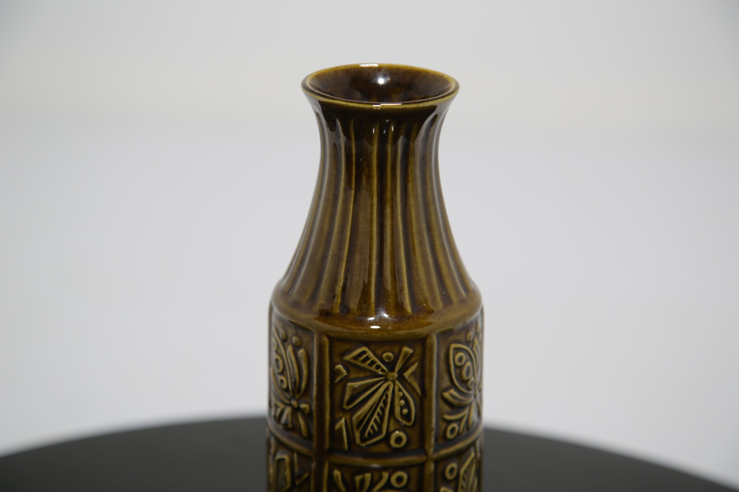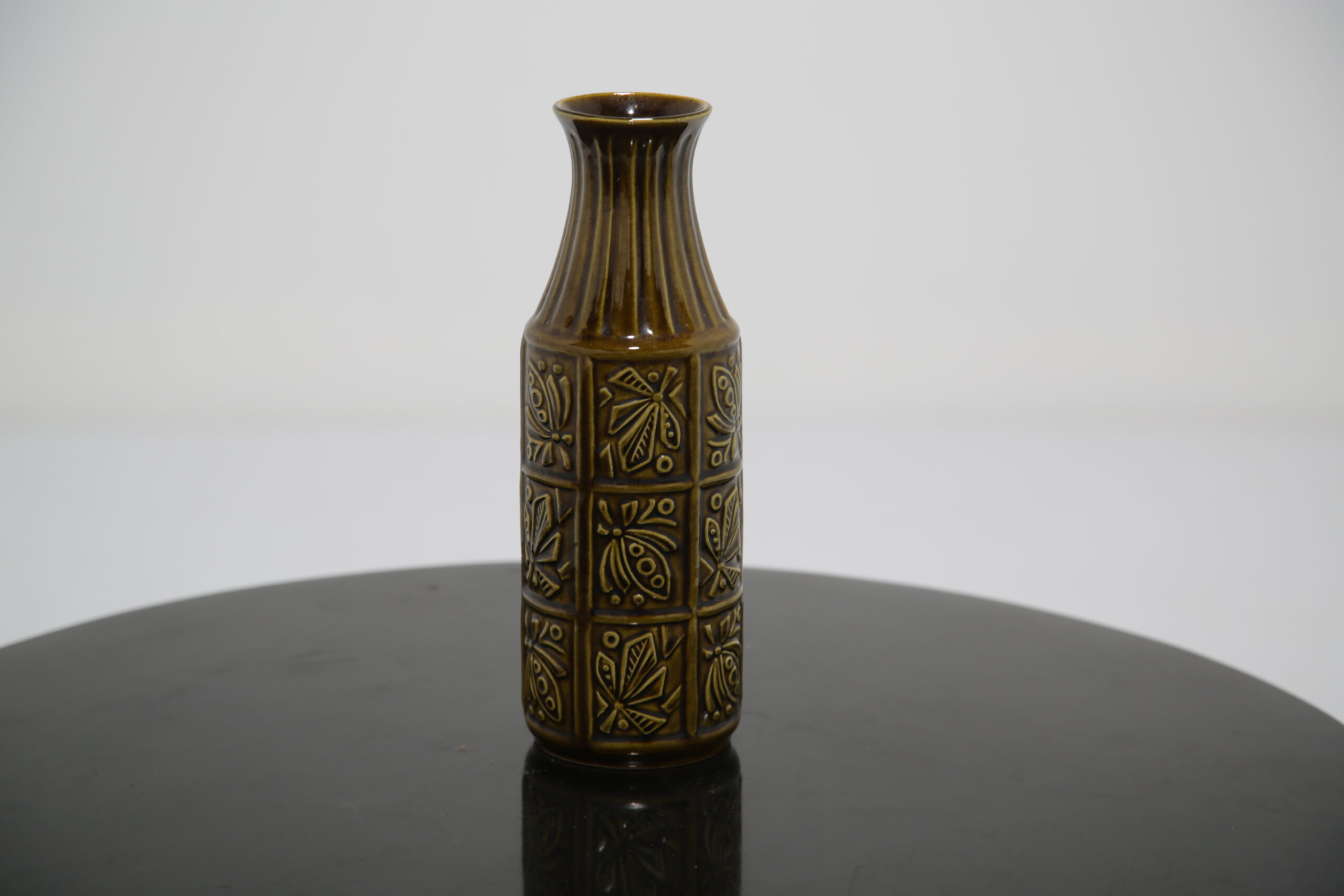 Beautiful brown toned vase with floral relief decor and ribbed design on neck. Stamped “W. Germany” which refers to West German during the time Europe was split between the Western and Eastern bloc.