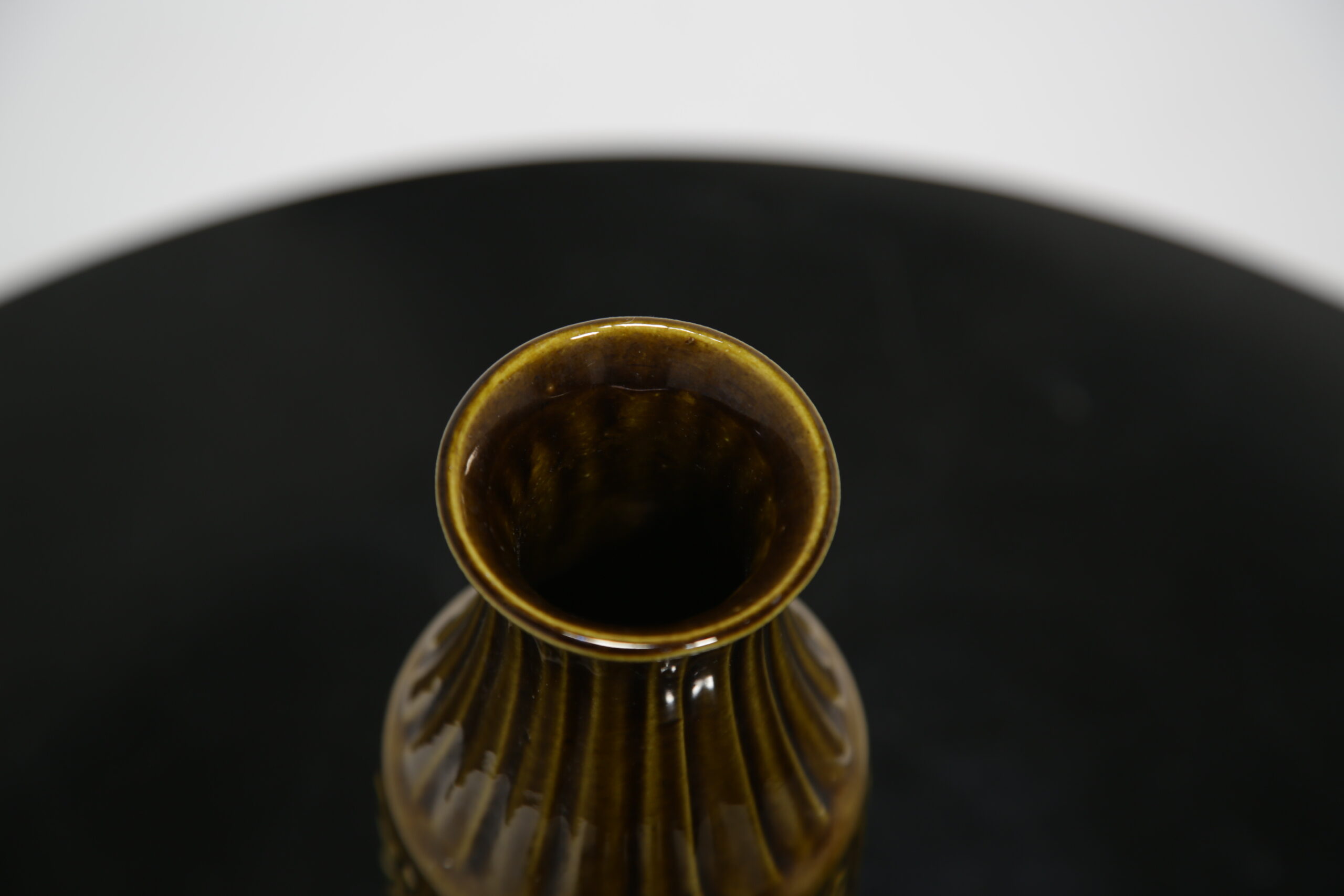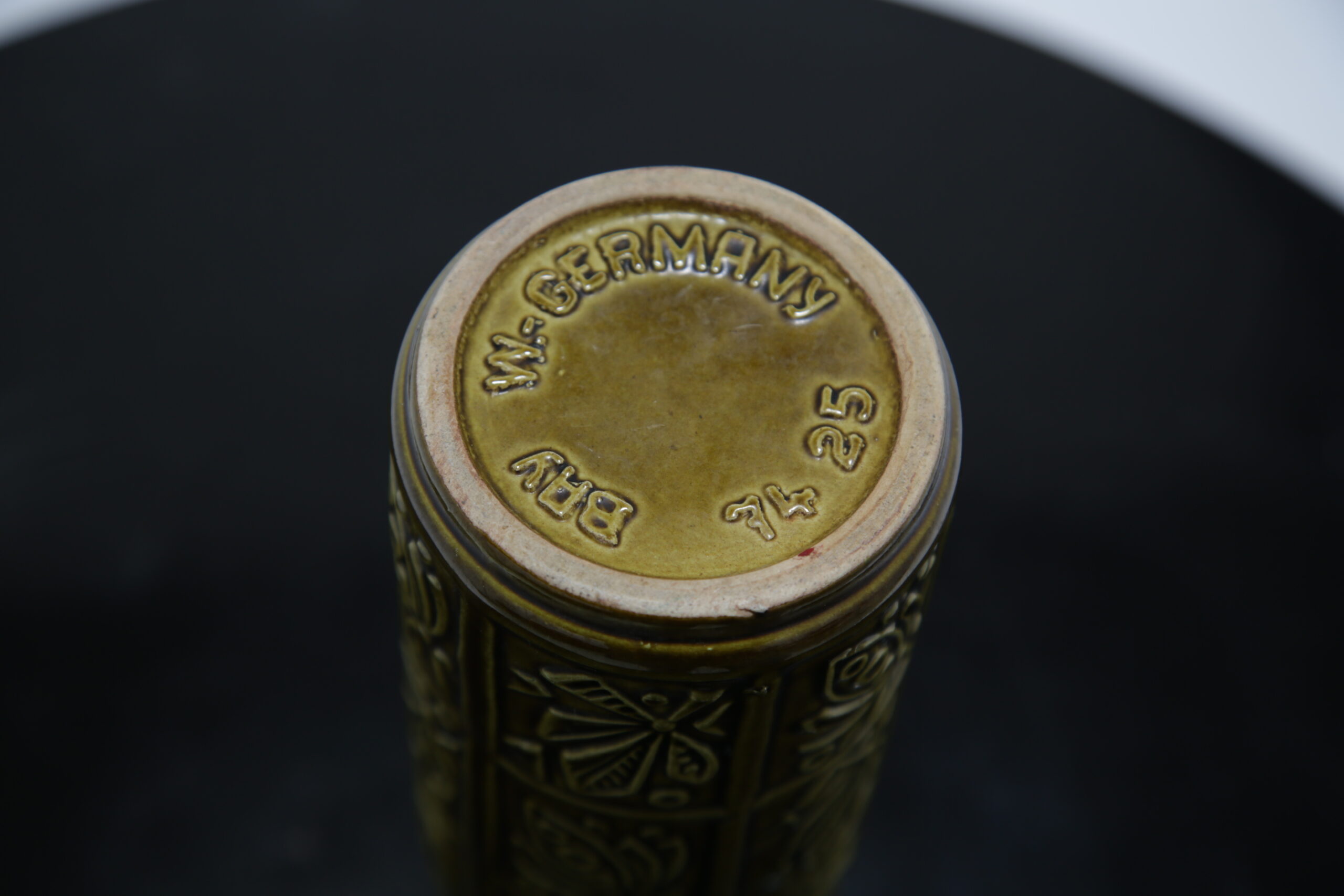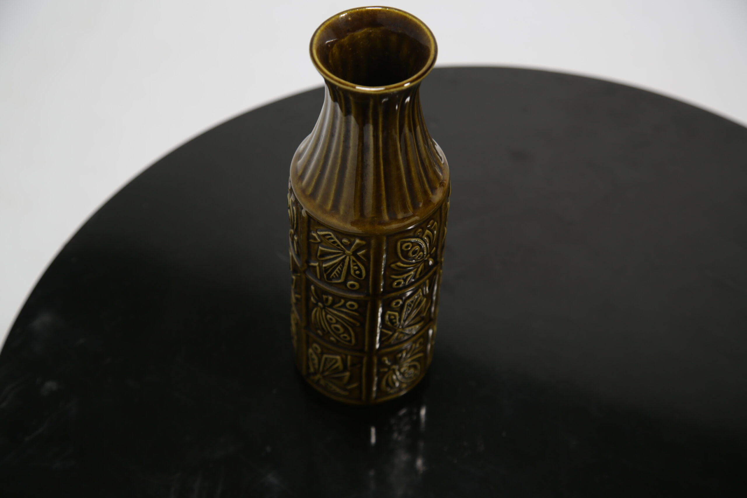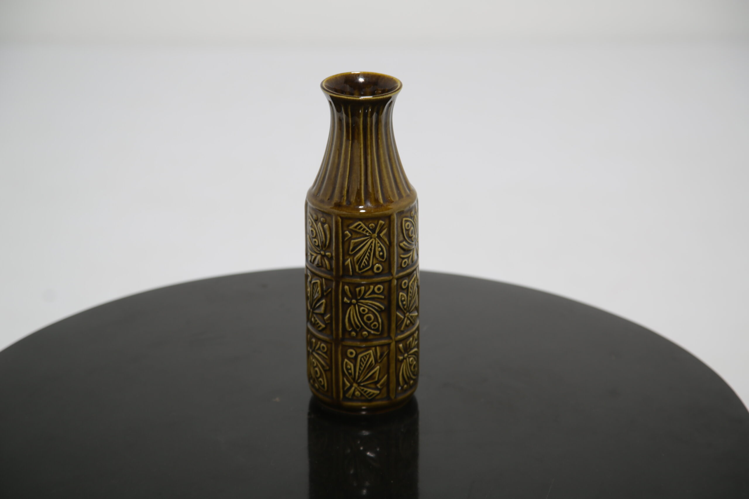 Beautiful brown toned vase with floral relief decor and ribbed design on neck. Stamped “W. Germany” which refers to West German during the time Europe was split between the Western and Eastern bloc.