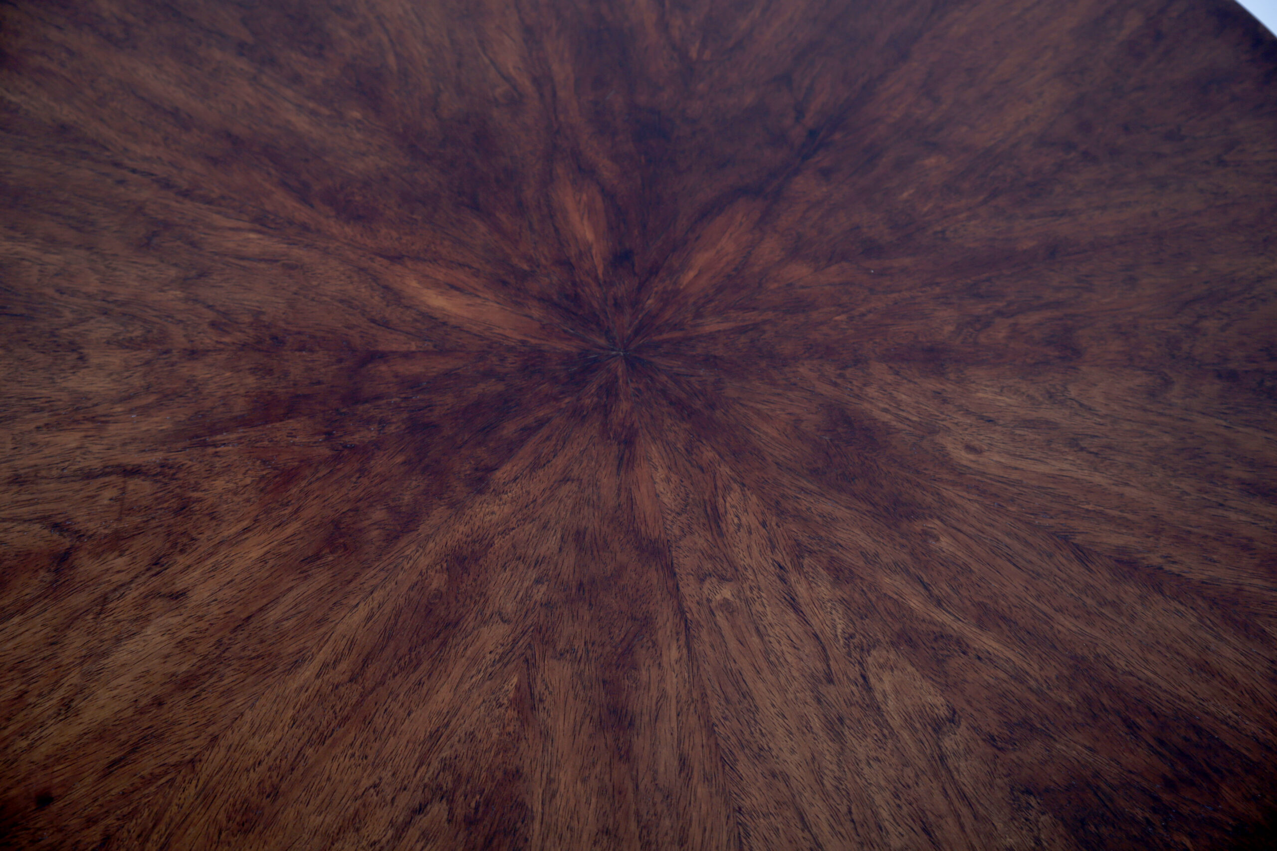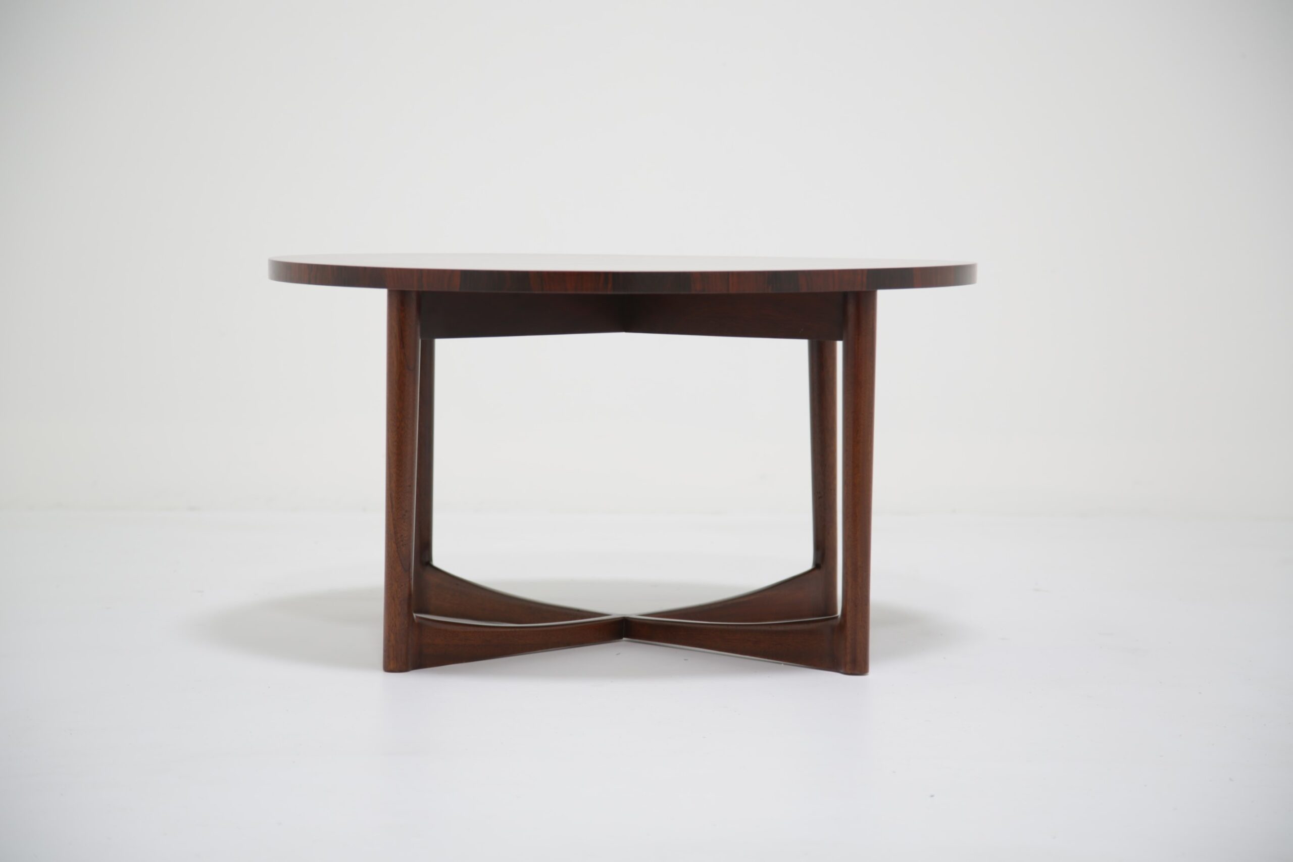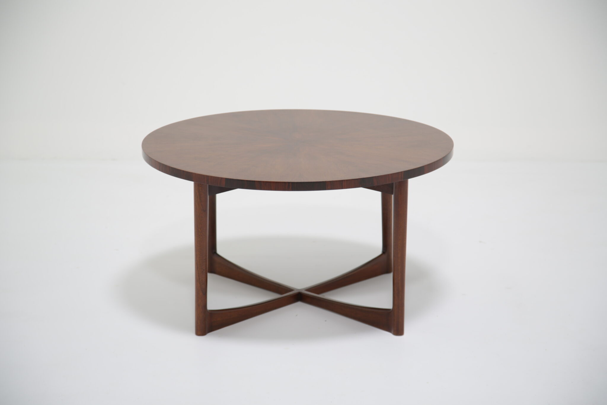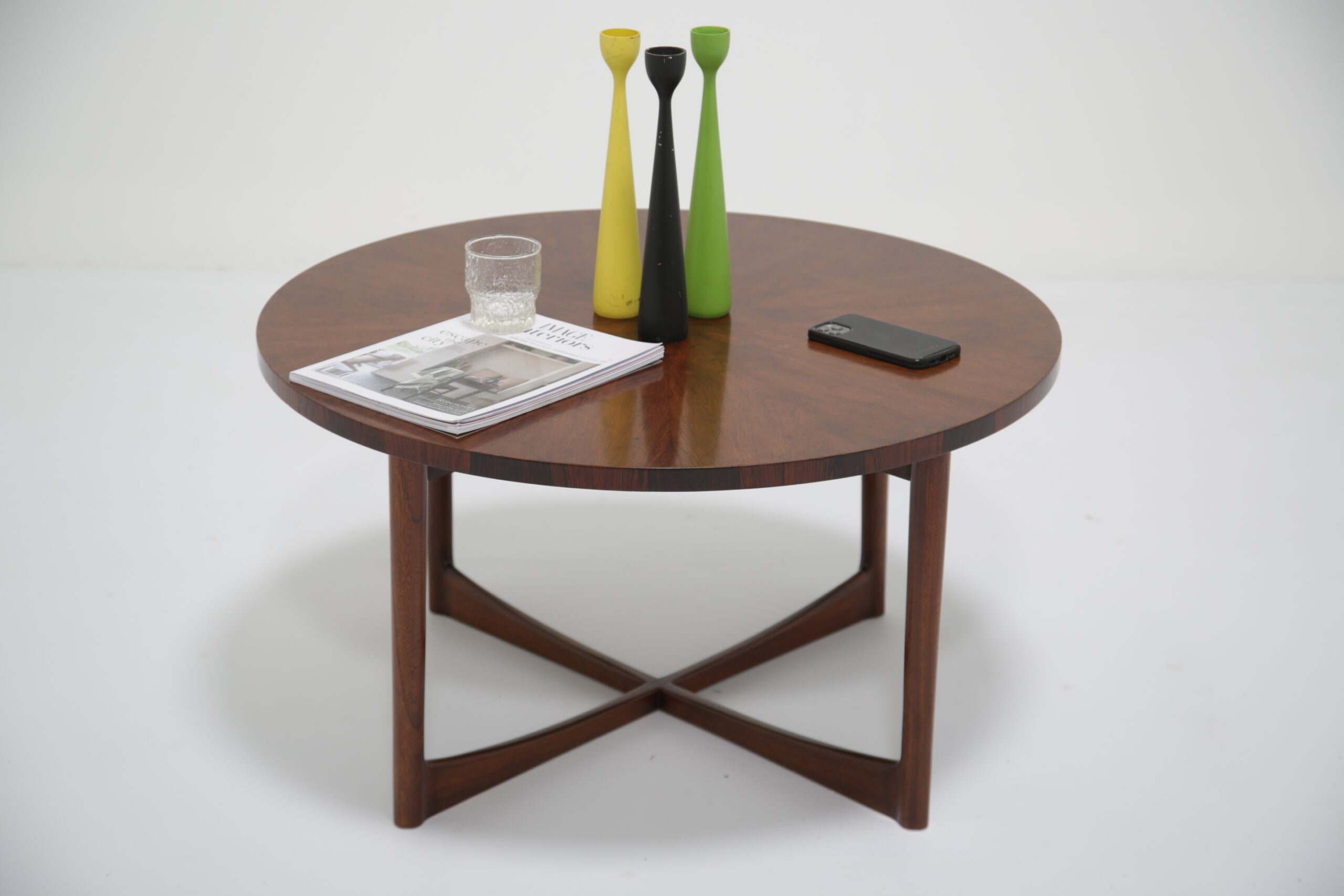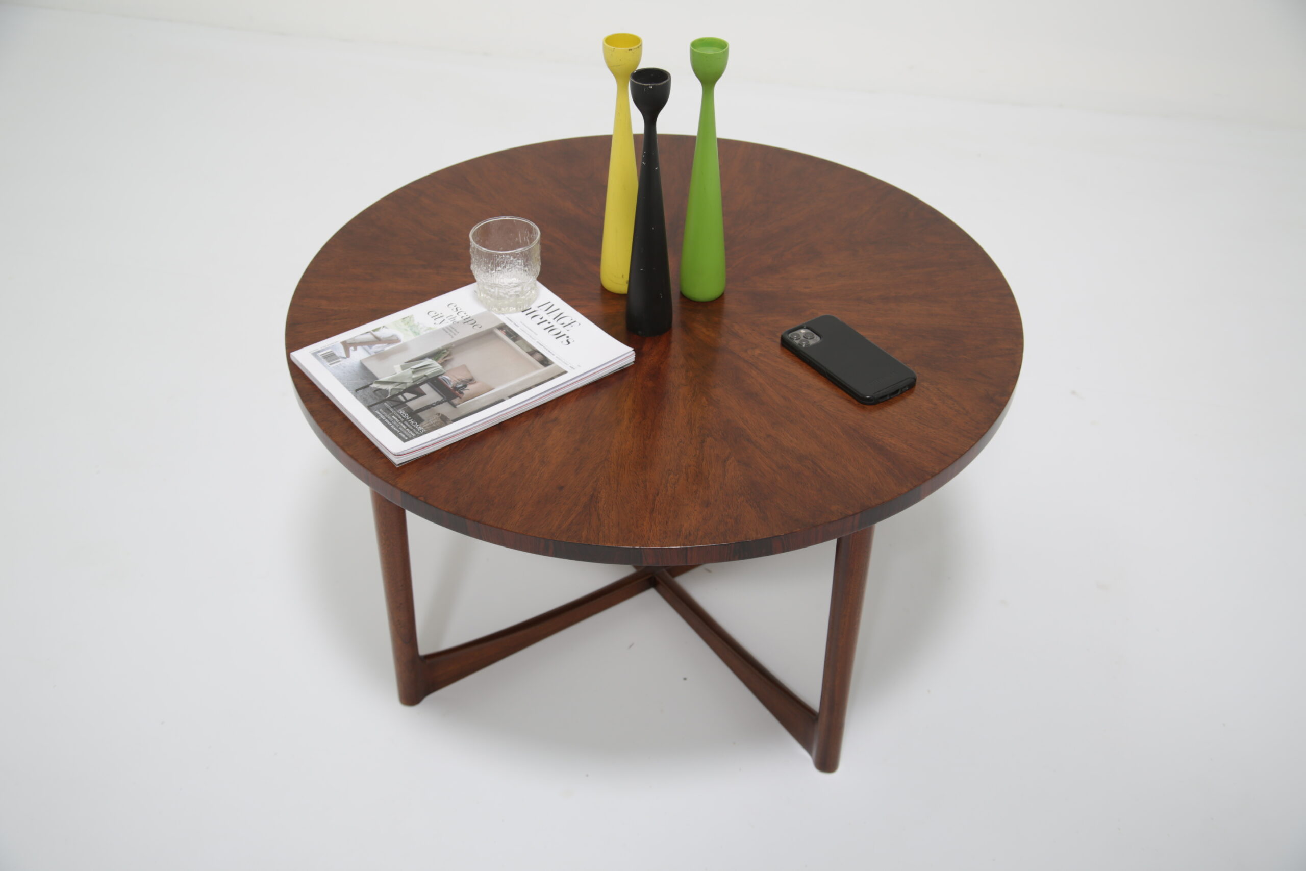 An iconic circular coffee table designed by McIntosh of Kirkcaldy in the 1960s, featuring a stunning sunburst pattern rosewood top. The radiating grain pattern on the top surface is both visually striking and beautifully crafted, making this table a standout example of British mid-century design.