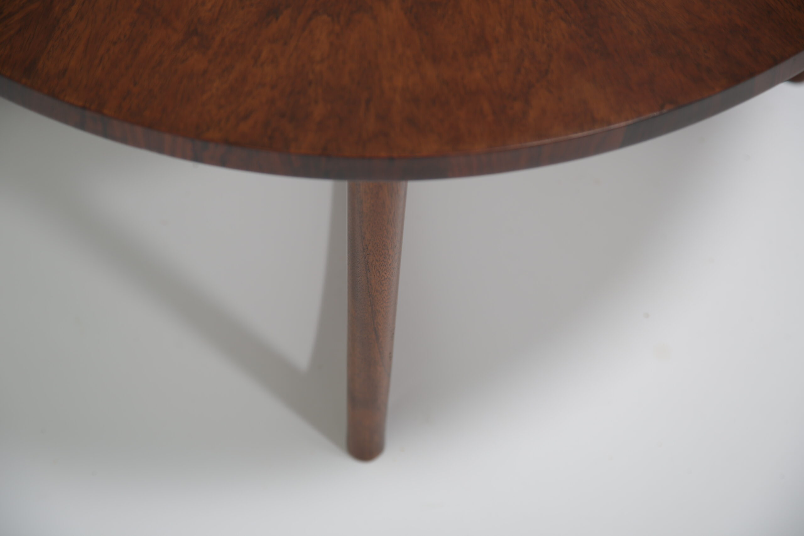 This piece has been professionally restored in-house using our standard restoration process. The table was stripped, hand-sanded then varnished and French polished to enhance the natural warmth of the teak and rosewood. Joints were checked and re-glued or dowelled where needed to ensure lasting structural integrity.