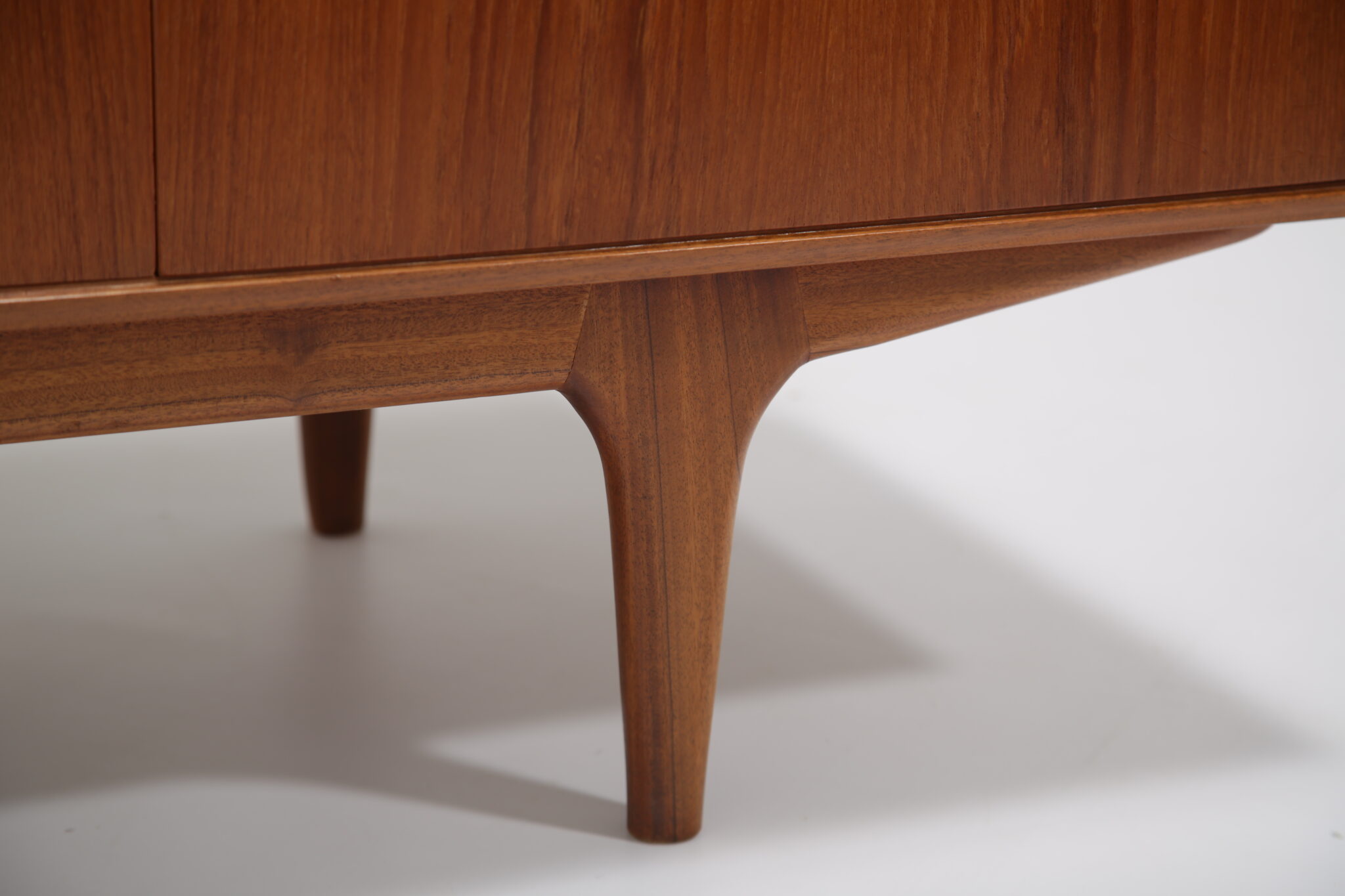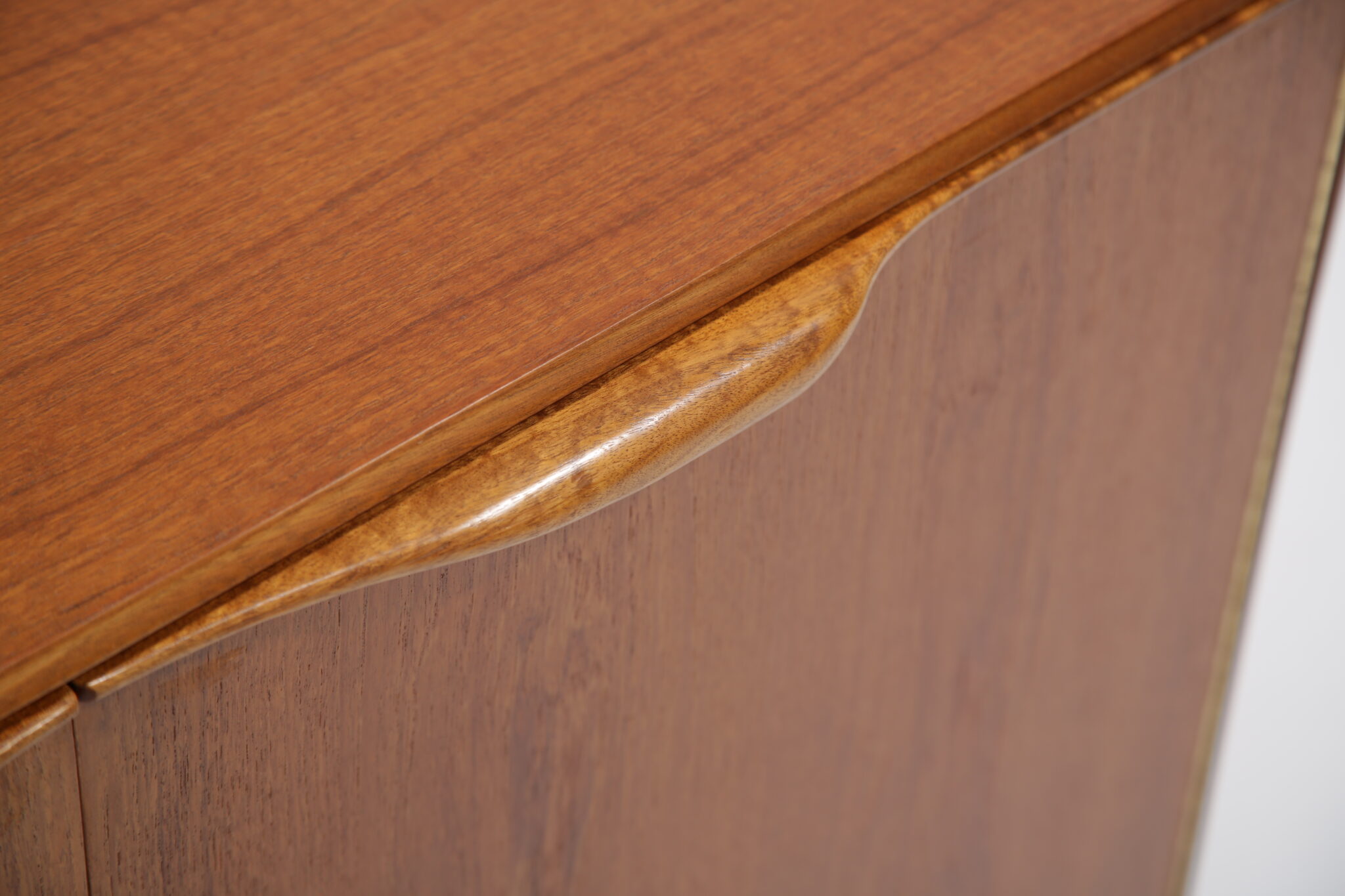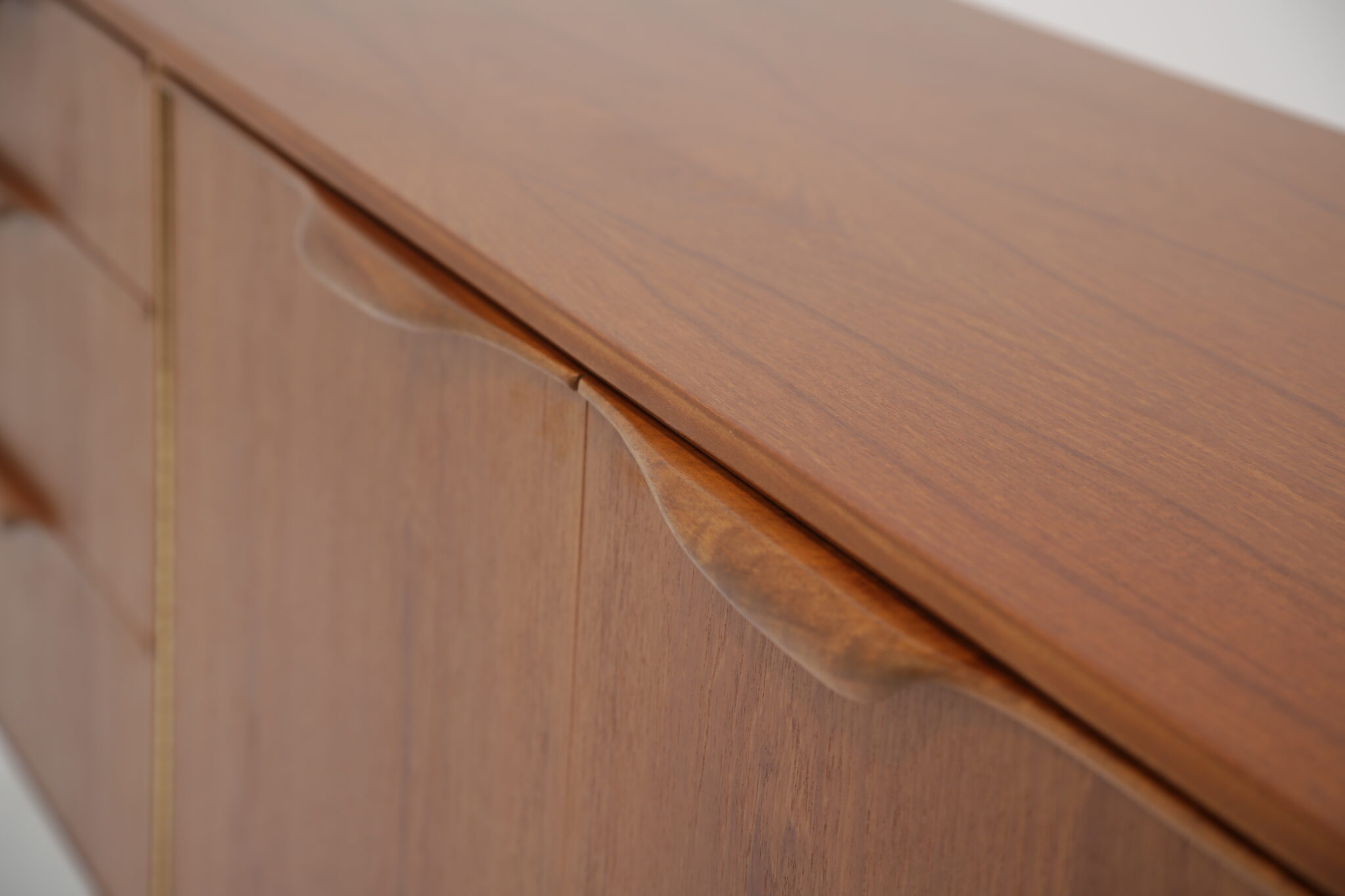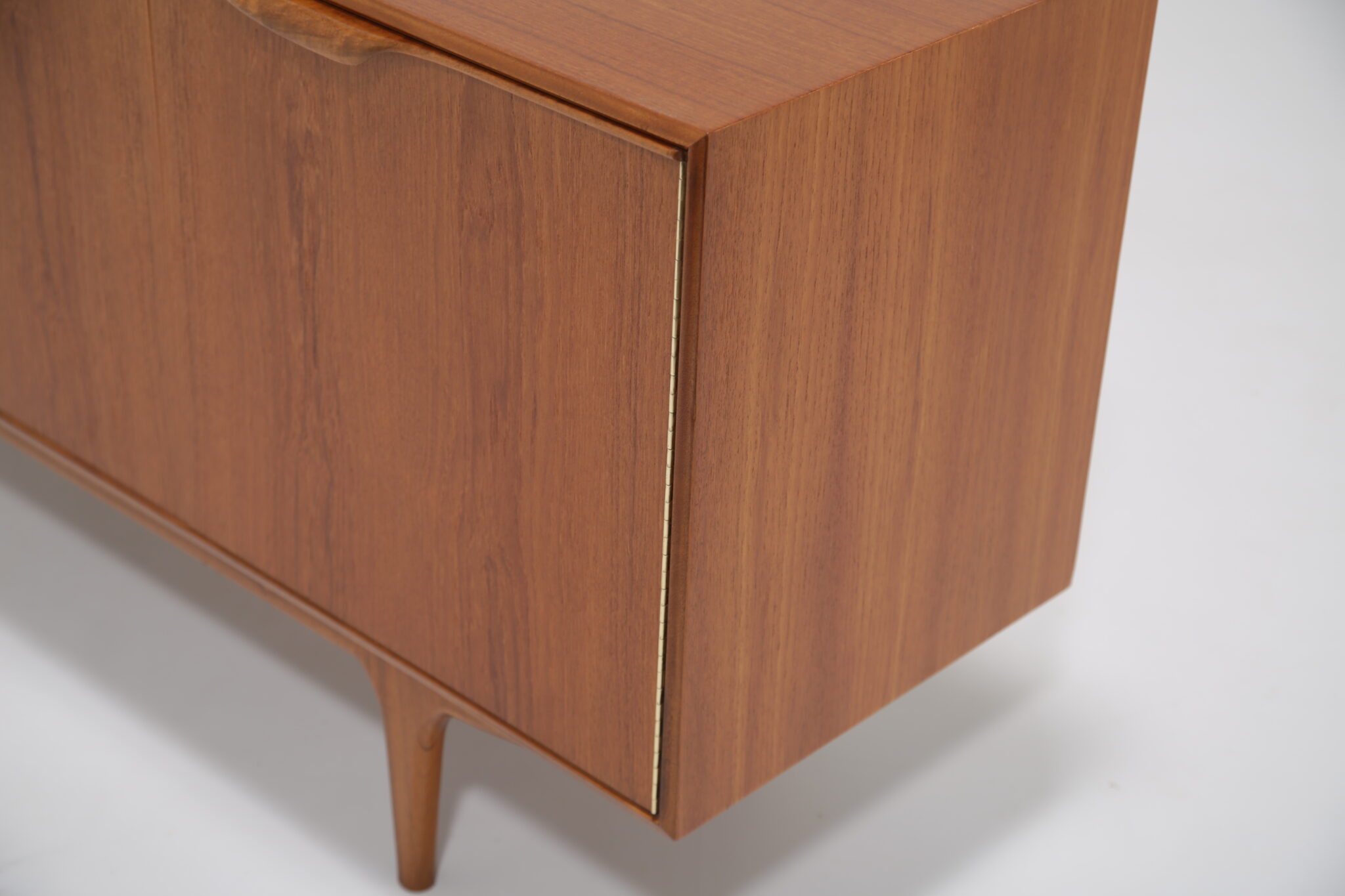 This teak sideboard has undergone a full restoration by our in-house team. The old finish was stripped and the wood was hand-sanded using various grades of paper and finished with French polish to revive its original luster. All joints have been inspected and re-glued when necessary.
