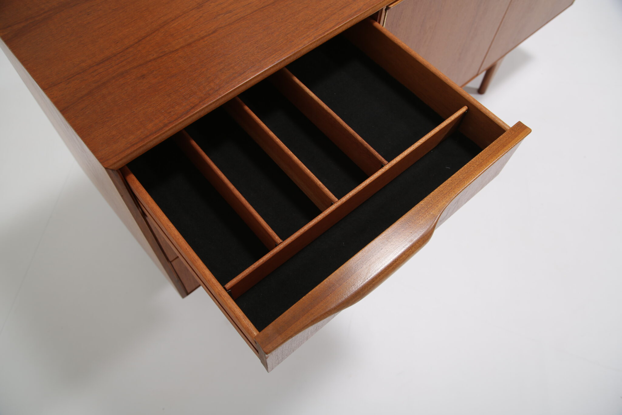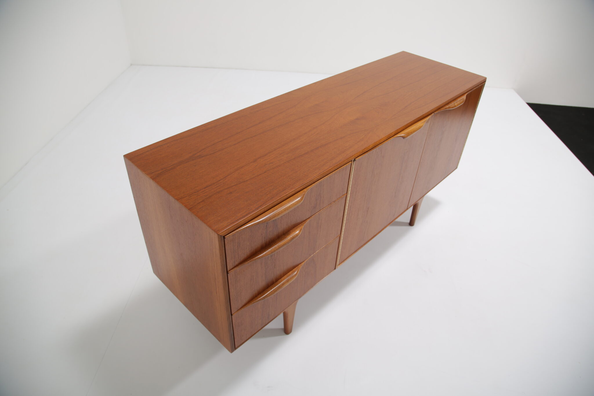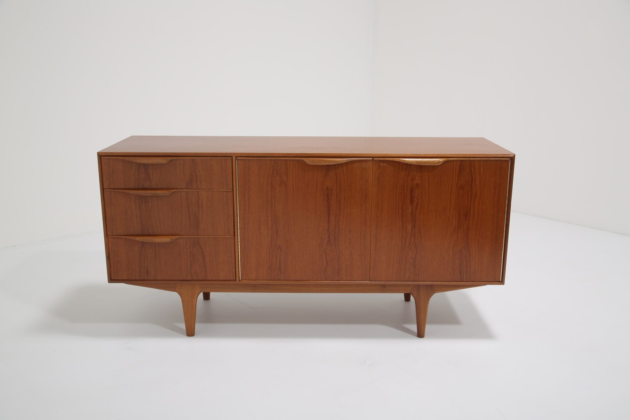 If you are looking for a stylish compact sideboard that would fit into most spaces, this might just be the perfect one for you. Designed by Tom Robertson for McIntosh in the 1960s and sold under the model name “Dunvegan”. The sideboard feature a clean minimalistic design with carved rounded handles and offering it’s user plenty of storage solution at a compact size. There are three spacious drawers, one with a black felt and slots which is for your cutlery and two larger drawers for other essentials. The double doors have a nice cutout shelf that is for holding crockery, glassware and bottles. Perfect for a living room as an entertainment piece or in your dining room.
