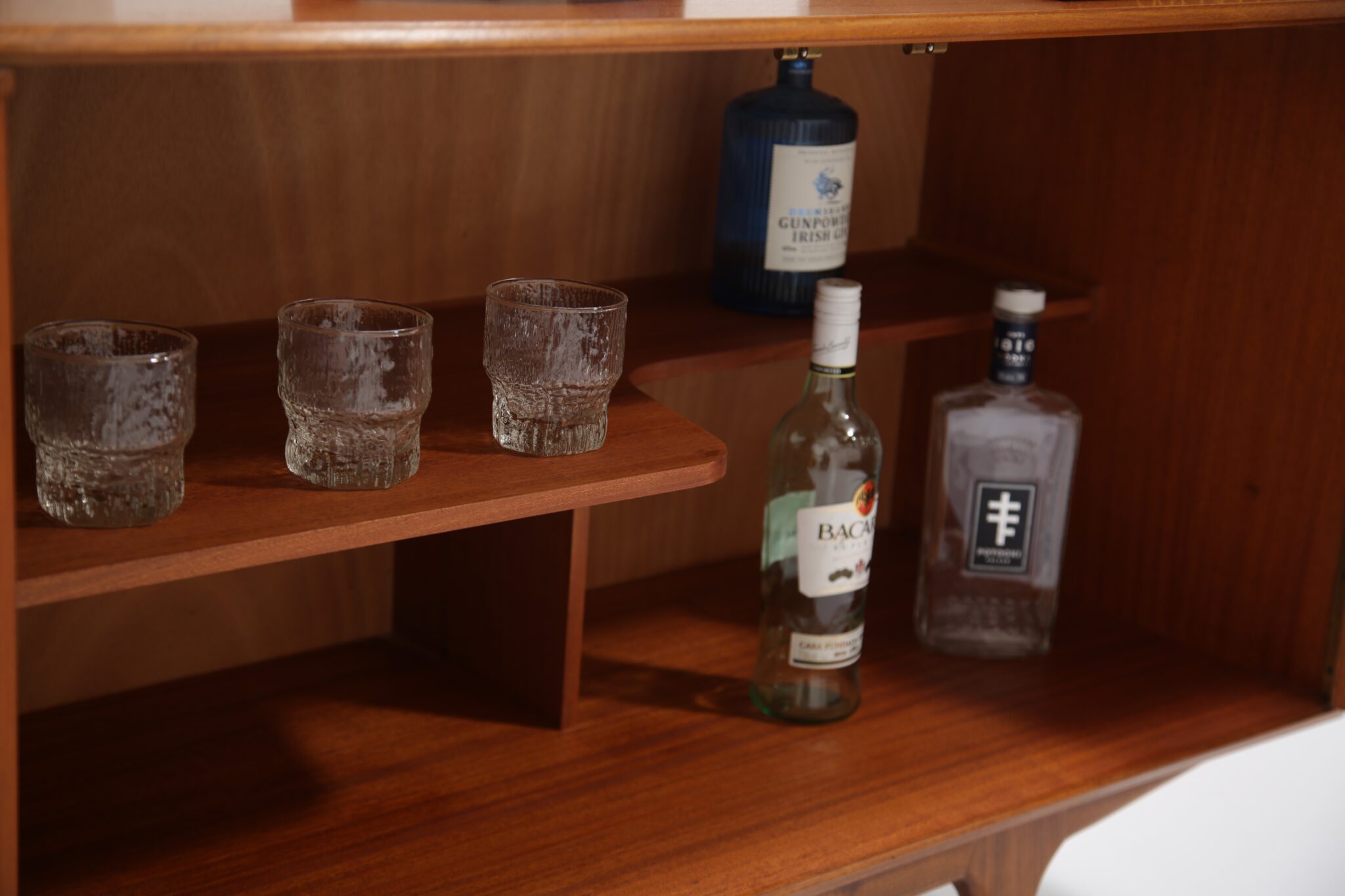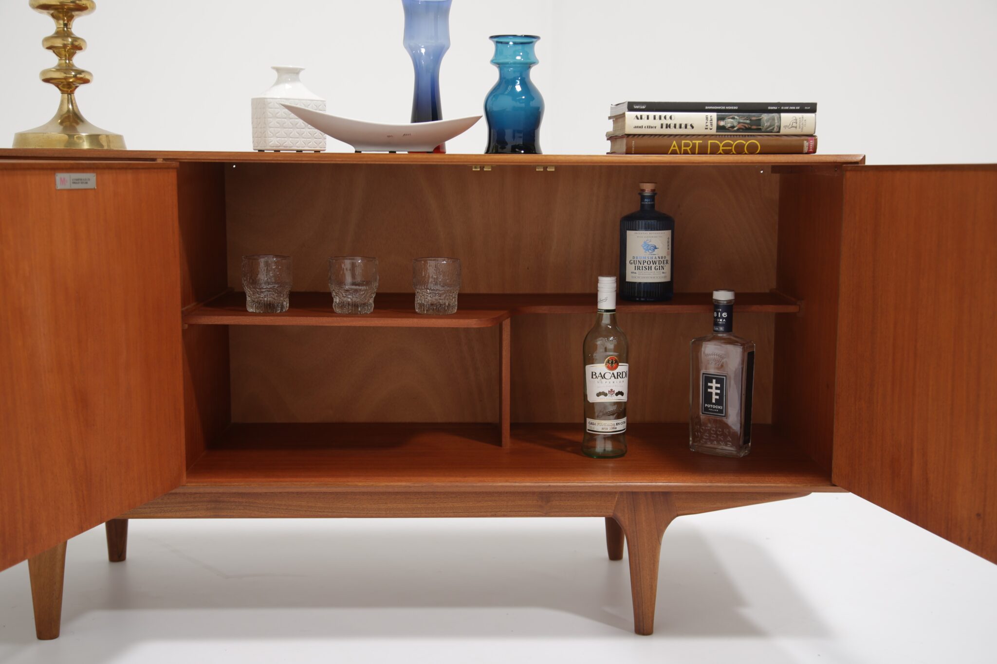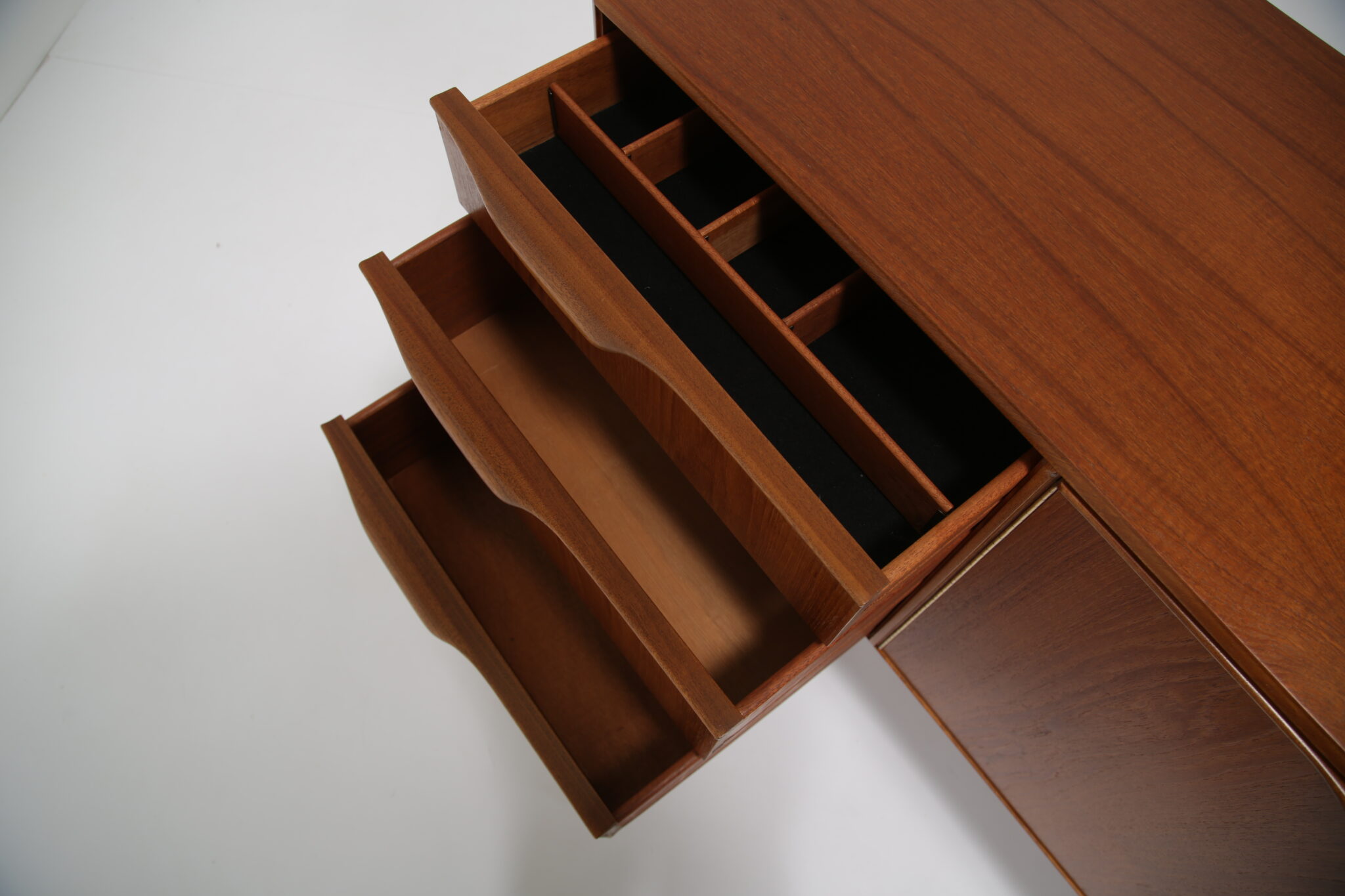 If you are looking for a stylish compact sideboard that would fit into most spaces, this might just be the perfect one for you. Designed by Tom Robertson for McIntosh in the 1960s and sold under the model name “Dunvegan”. The sideboard feature a clean minimalistic design with carved rounded handles and offering it’s user plenty of storage solution at a compact size. There are three spacious drawers, one with a black felt and slots which is for your cutlery and two larger drawers for other essentials. The double doors have a nice cutout shelf that is for holding crockery, glassware and bottles. Perfect for a living room as an entertainment piece or in your dining room.
