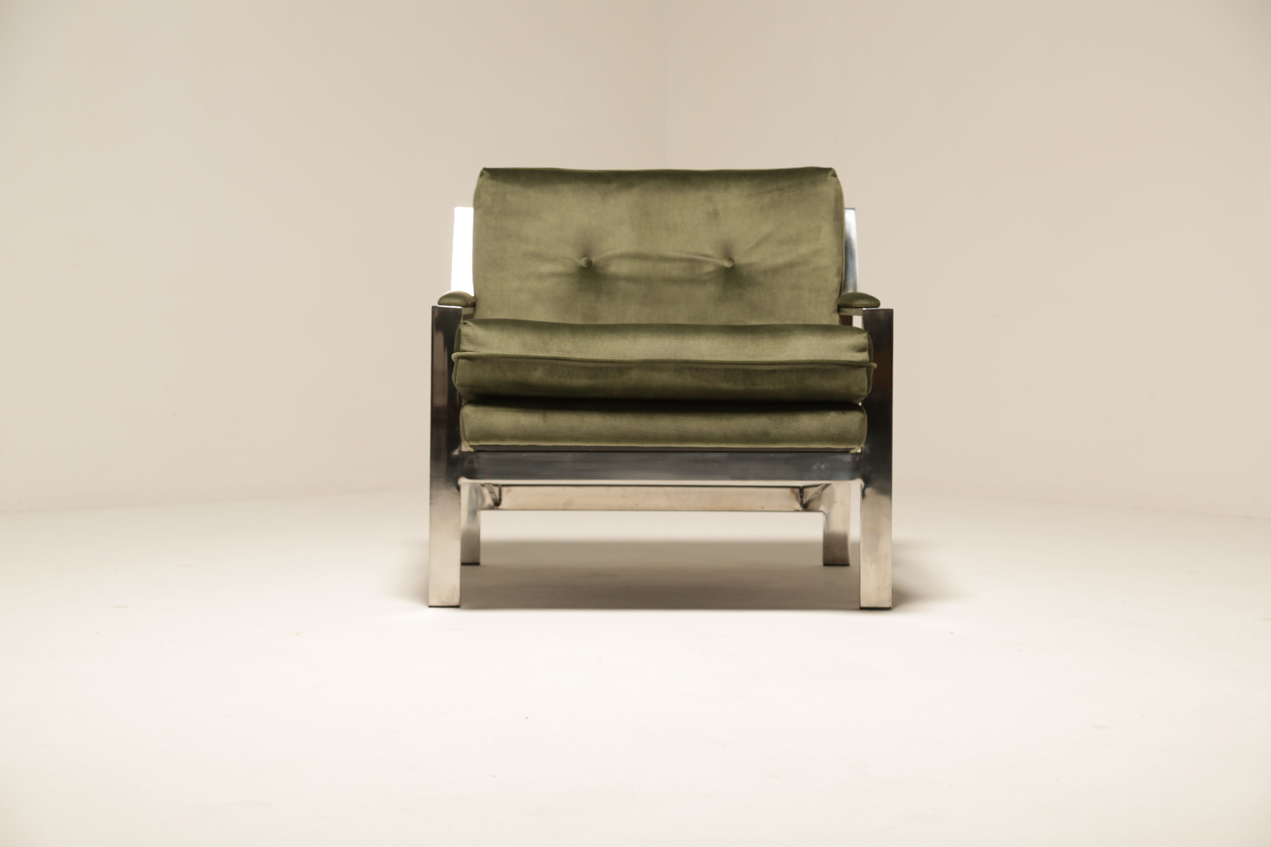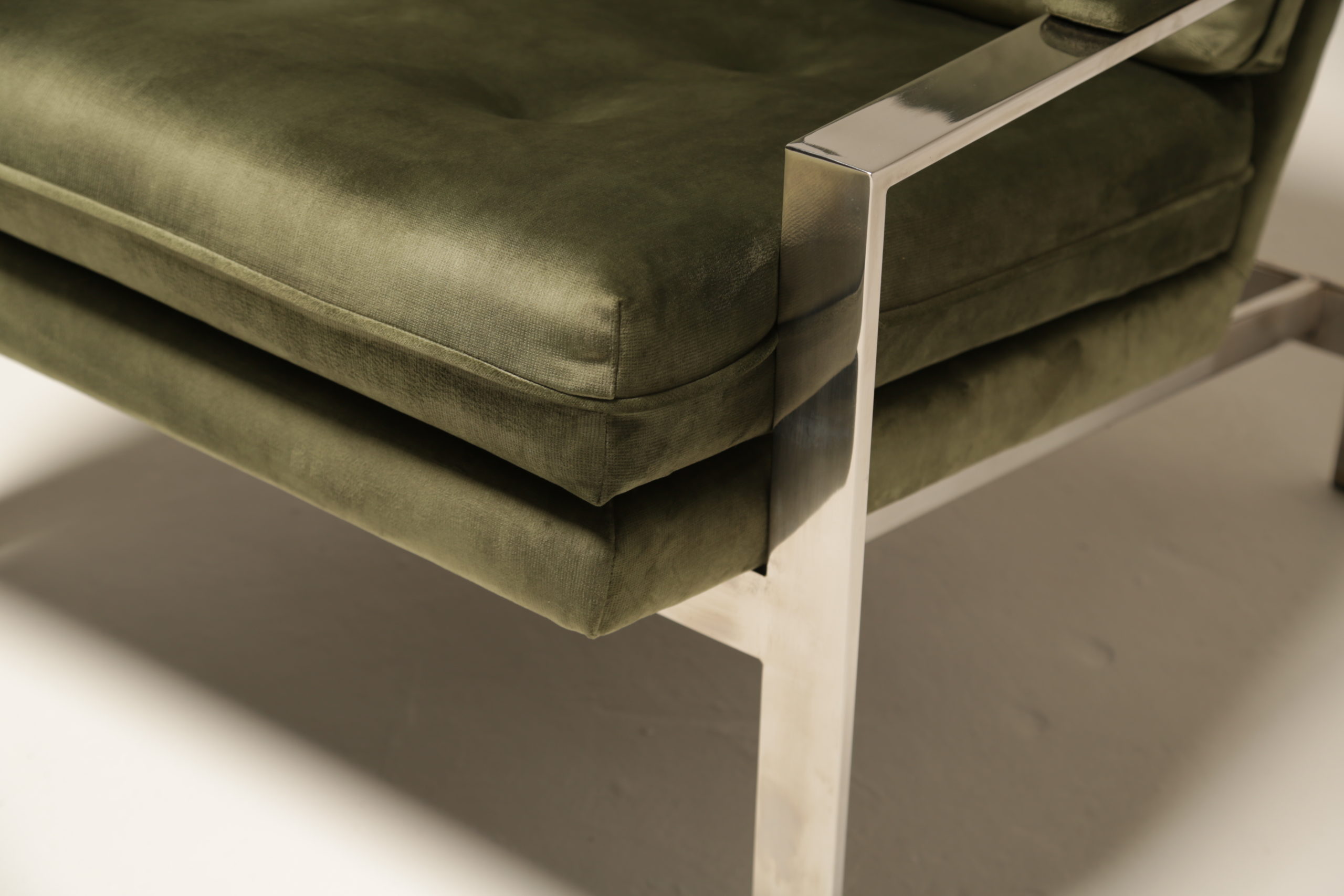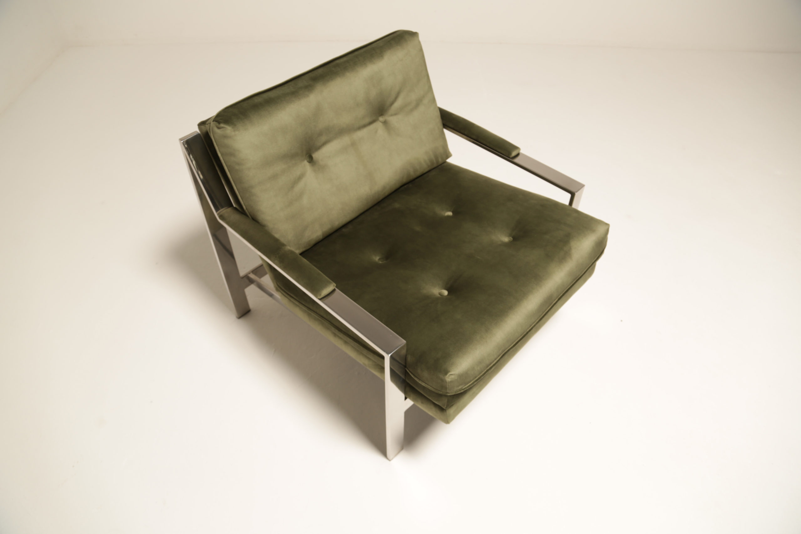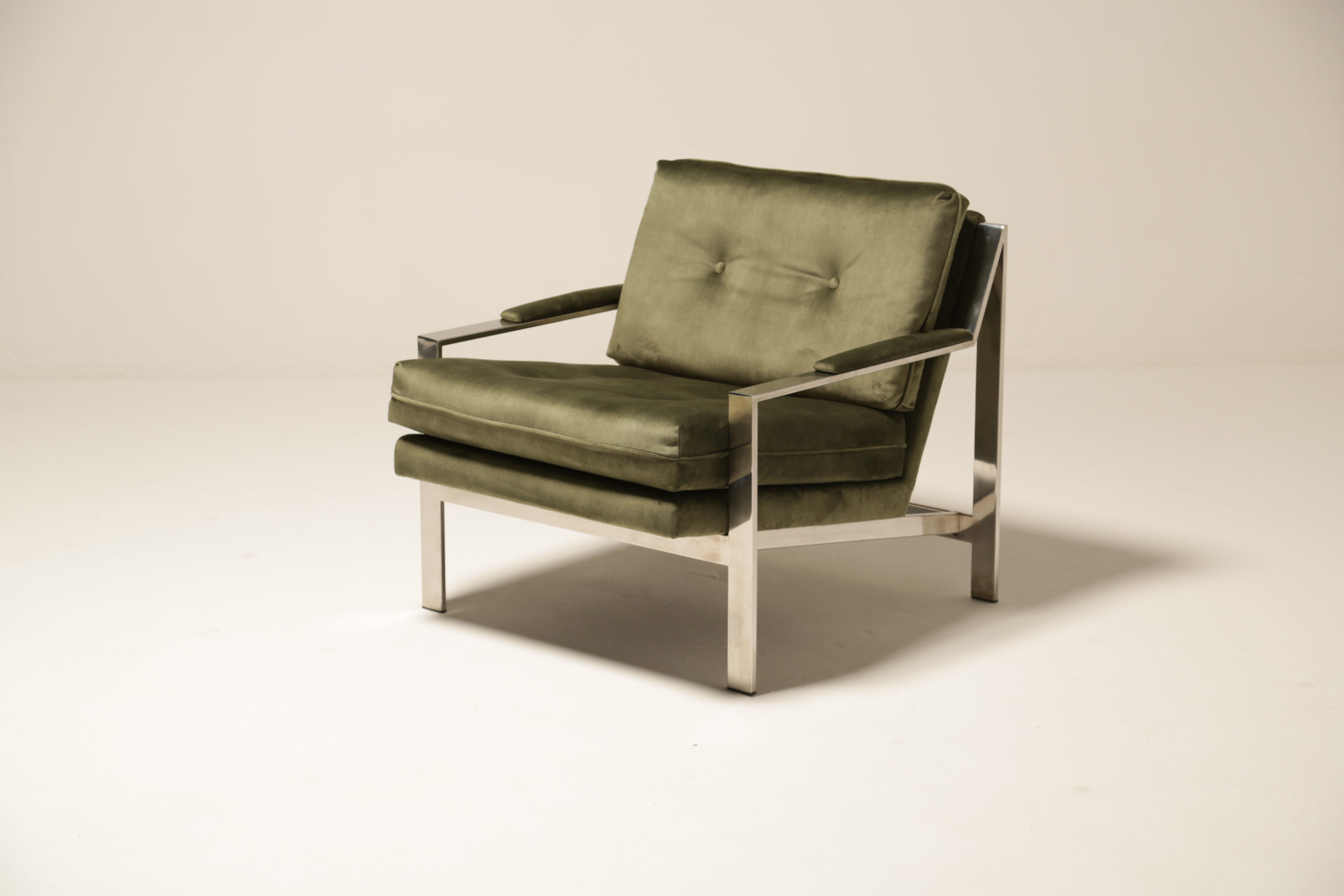 An American mid-century design classic. This flat bar chrome frame chair by Cy Mann is visually a well known classic American design but its only in the last few years that the correct attribution to Cy Mann has begun to become more widespread. For years this chair was often touted as a Milo Baughman design and we can certainly see why as it has some similarities to Baughman’s work. However it is a stand alone piece of design. Its solidly built, comfortable, stylish and made with quality materials. We have recovered this chair in a modern durable and easy to maintain velvet fabric.