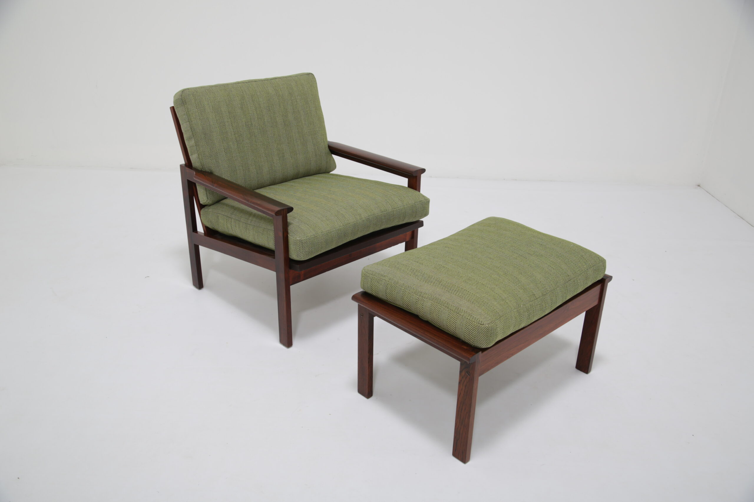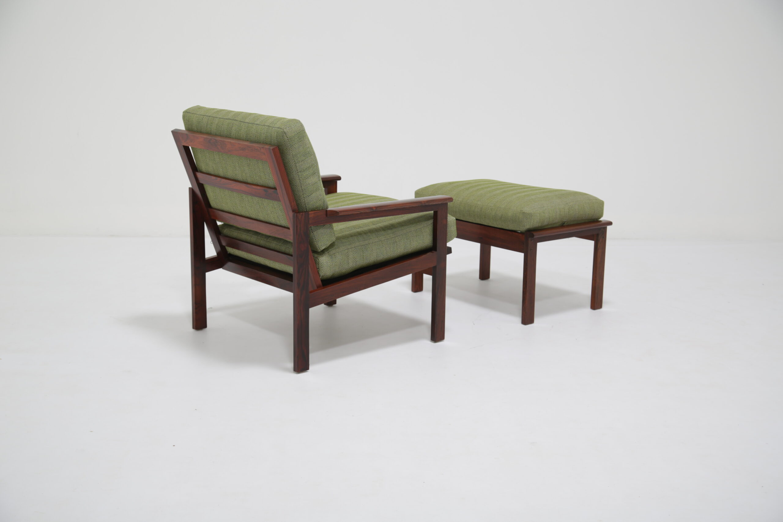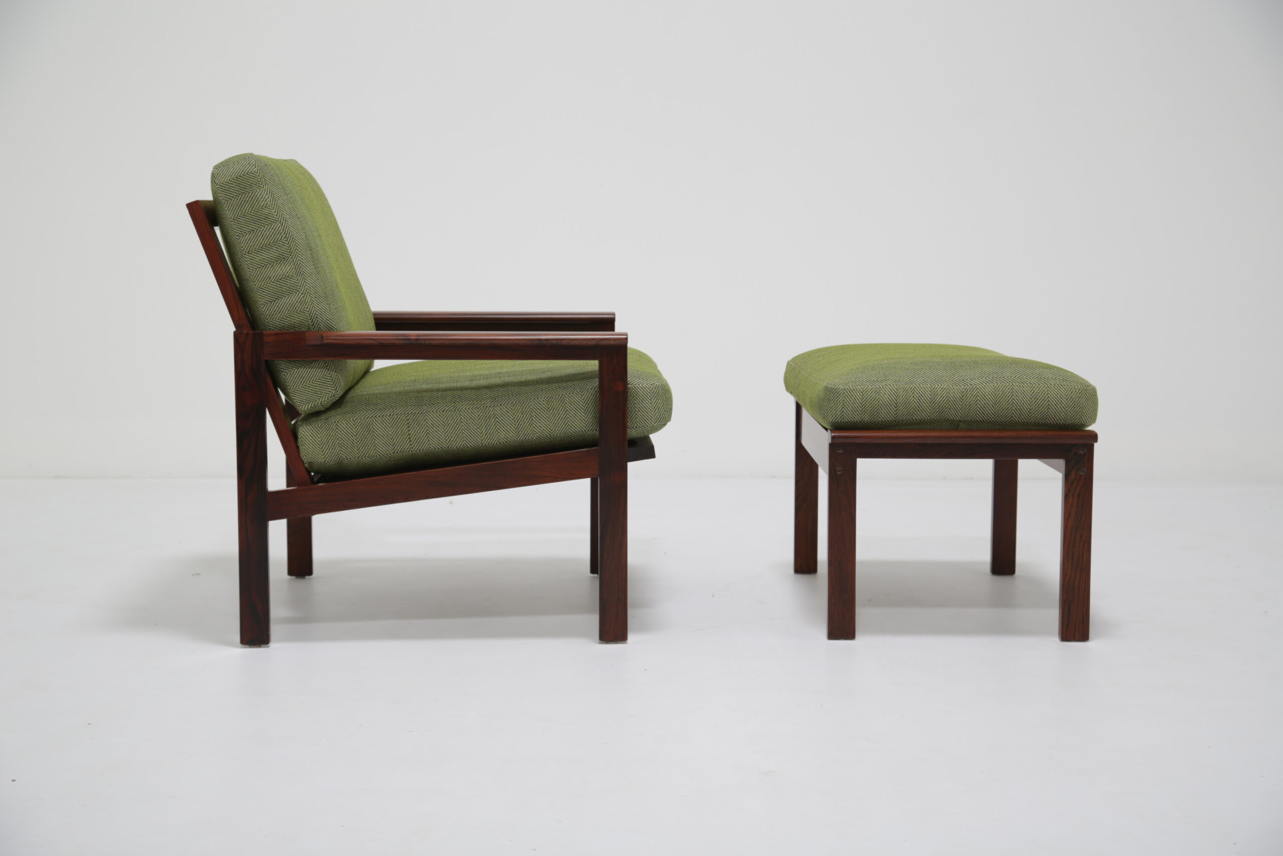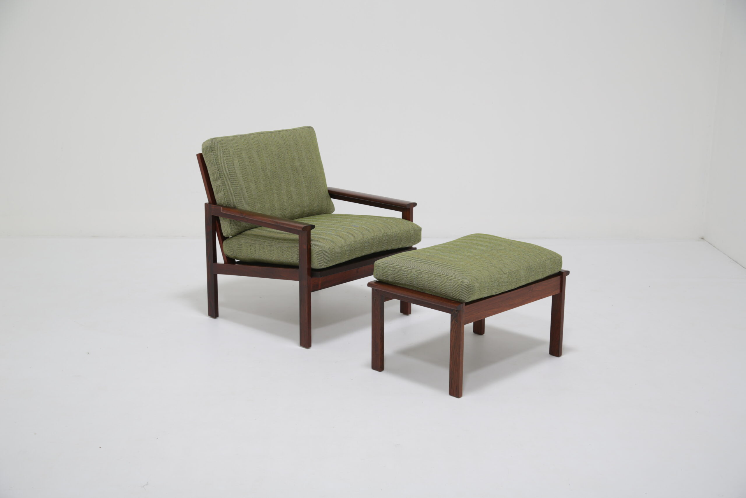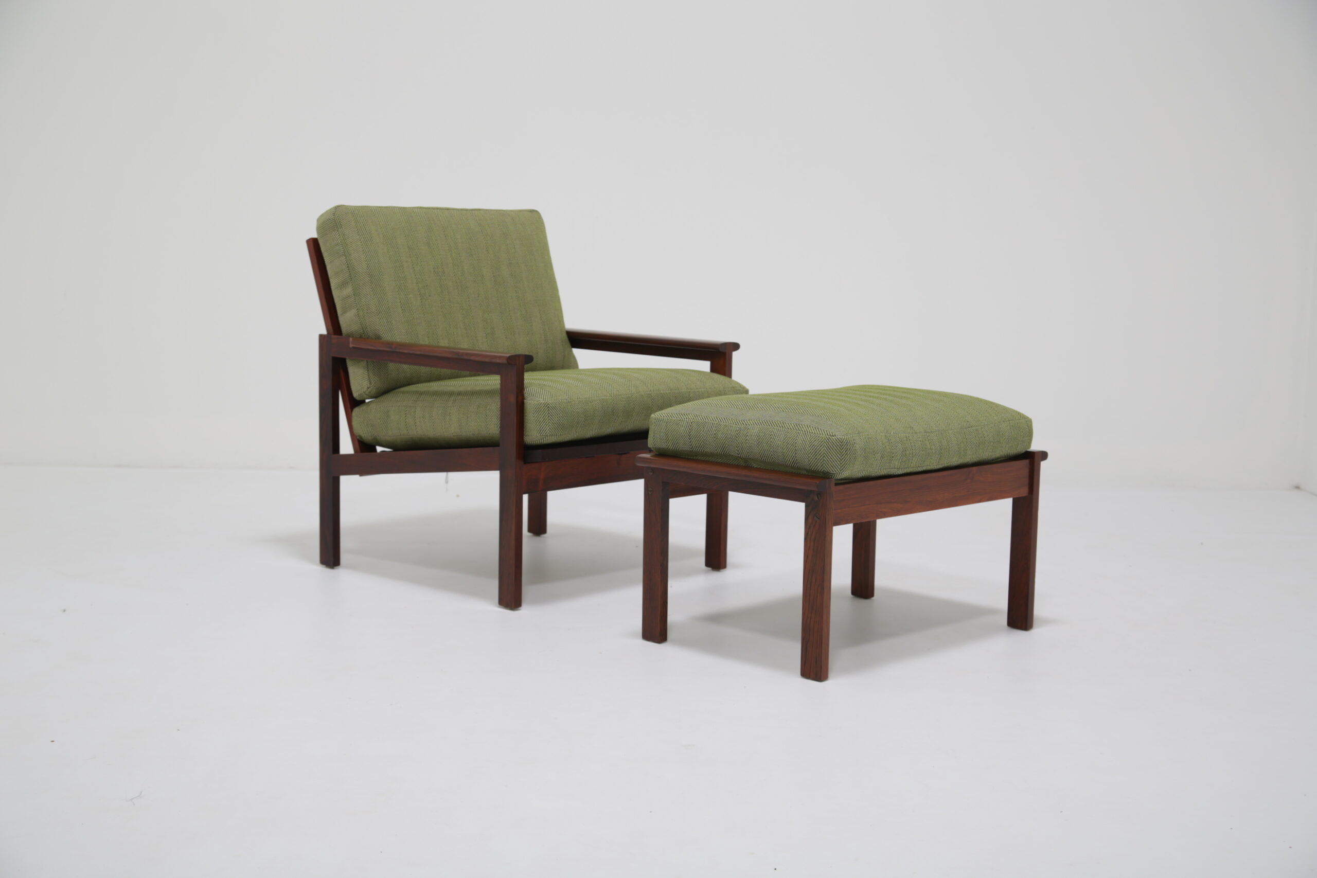 Just added to our collection is this stunning armchair with matching footstool designed by the renowned Danish designer Illum Wikkelso in the 1950s. Sold under the name “Capella”, the idea for this chair was formed when Illum Wikkelso had spare wood leftover from a previous project, he formed the arms which resembles a cricket bat, the rest of the process involved joining other pieces together and the Capella chair was born. The design is clean, minimalistic with rectangular shaped legs, a slatted back configuration and an overall beautiful and simple design.