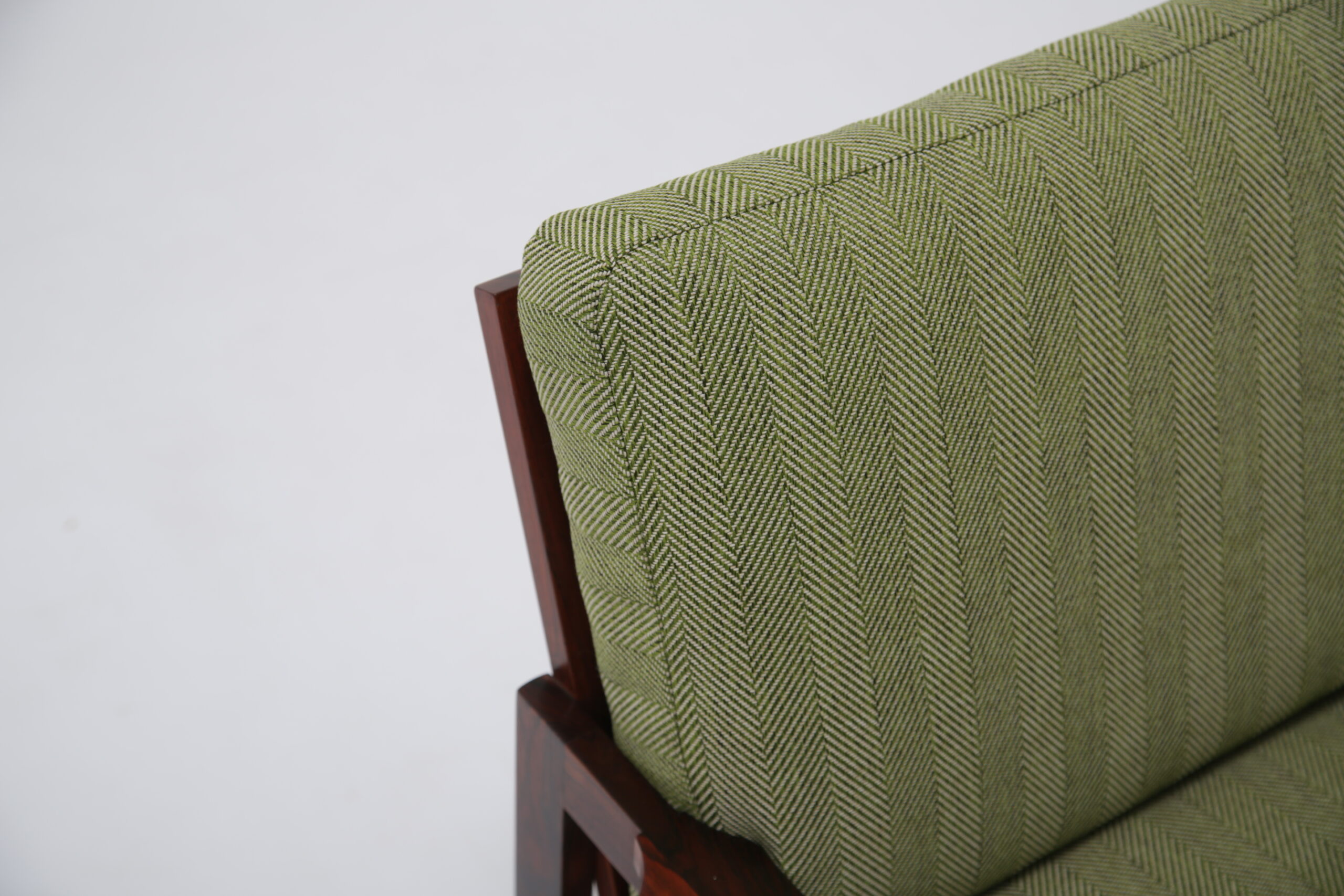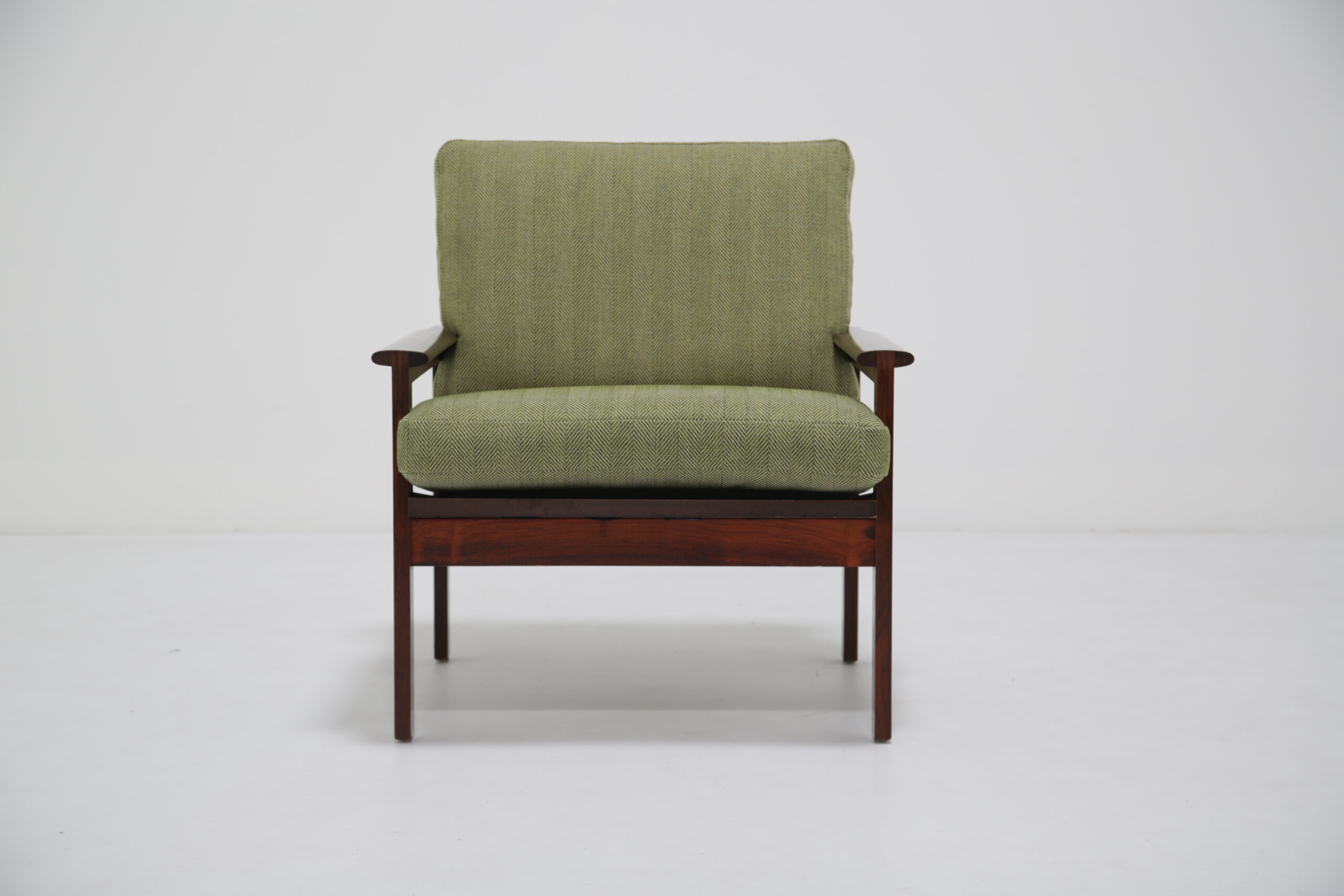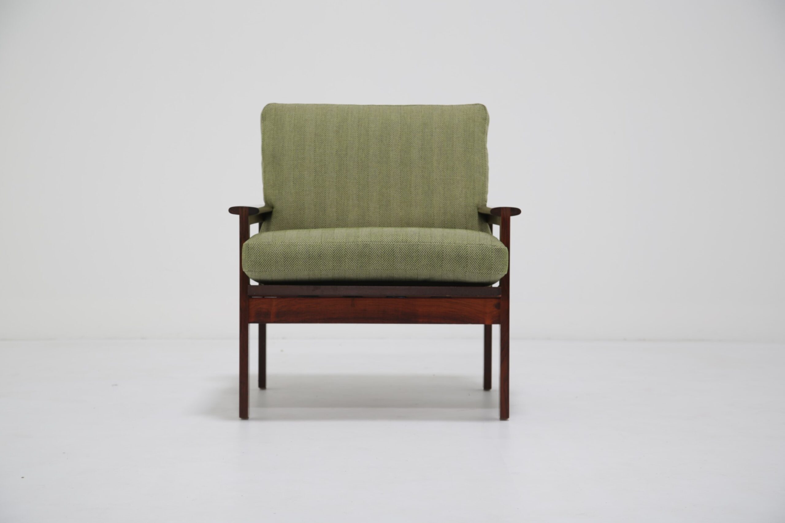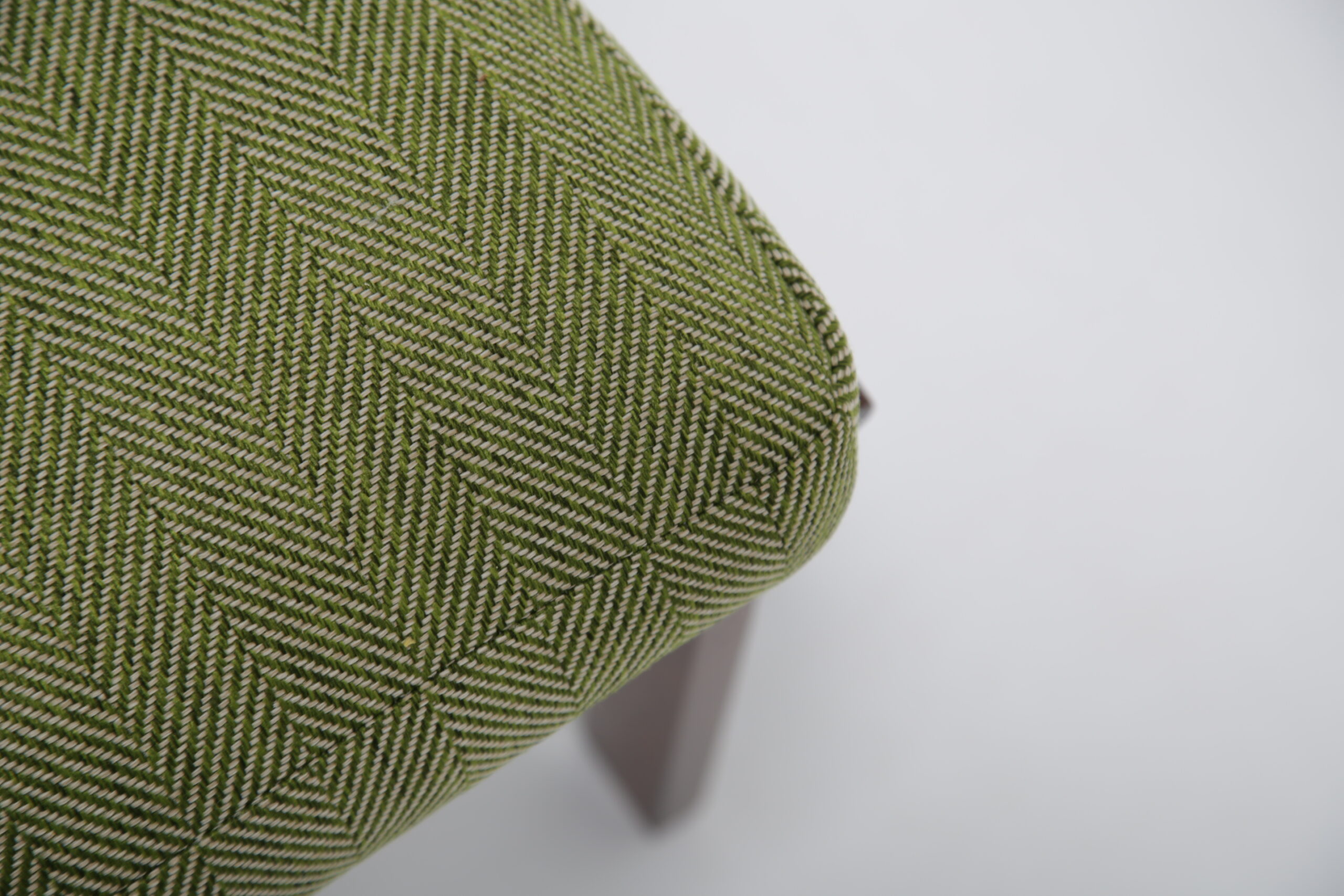 The chair is manufactured in rosewood which has a lovely deep and rich grain, evident throughout the armchair and has been upholstered in a lovely green herringbone fabric. This armchair would be the perfect addition to any living room, lounge area or office requiring a comfortable chair to sit in to relax, read or just simply watch TV.