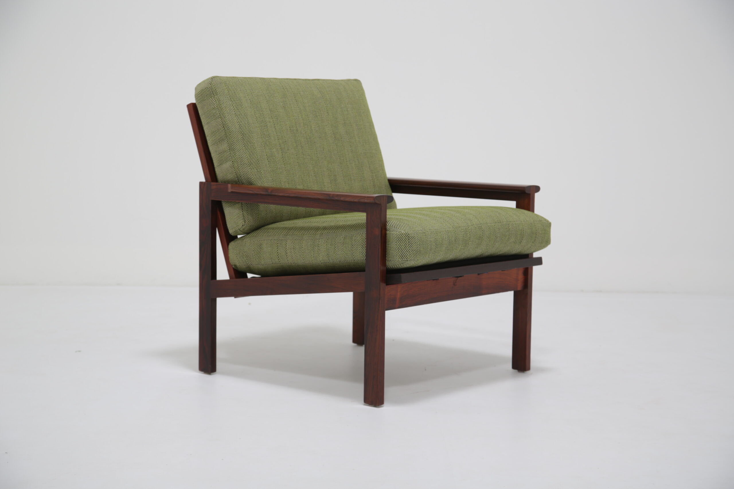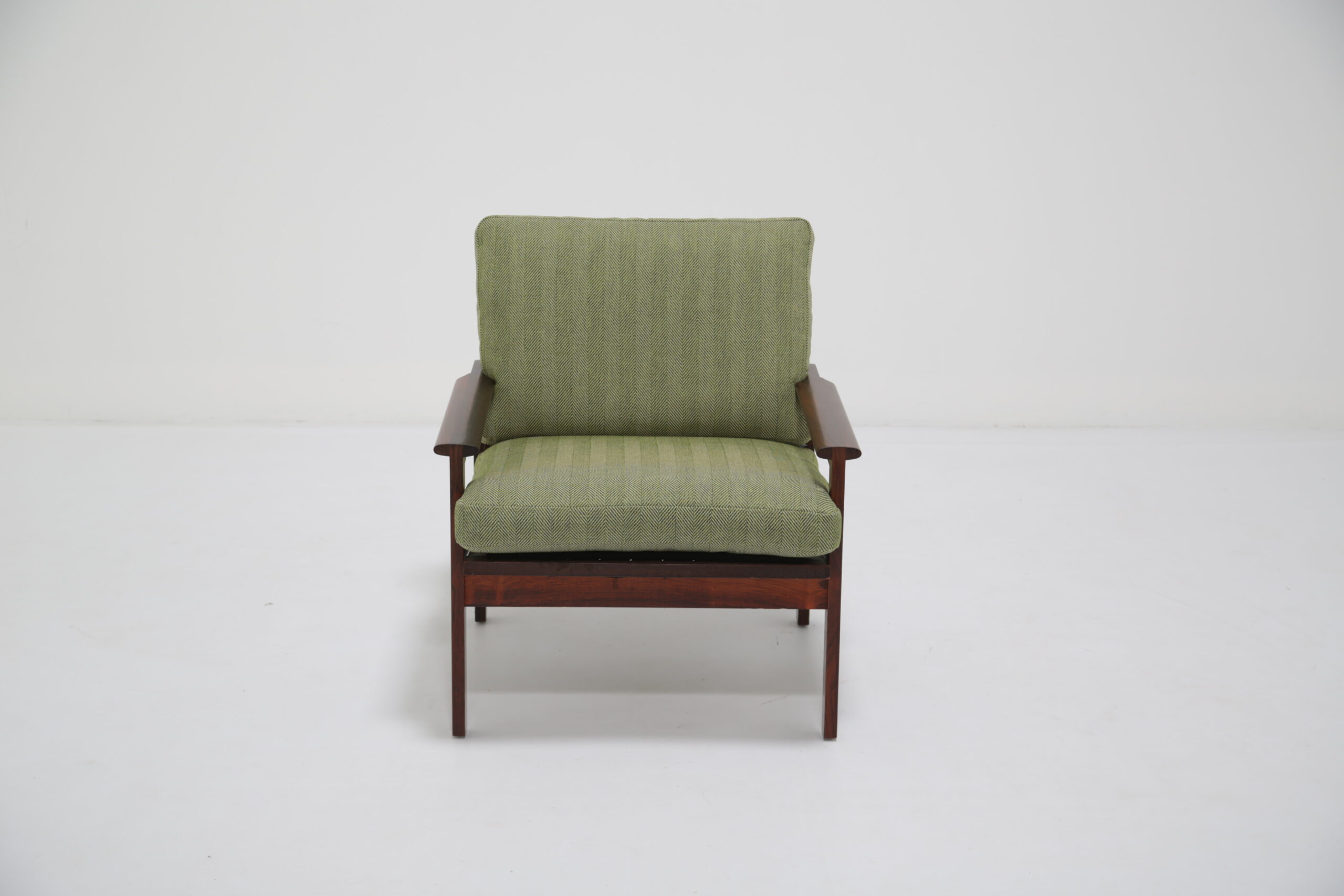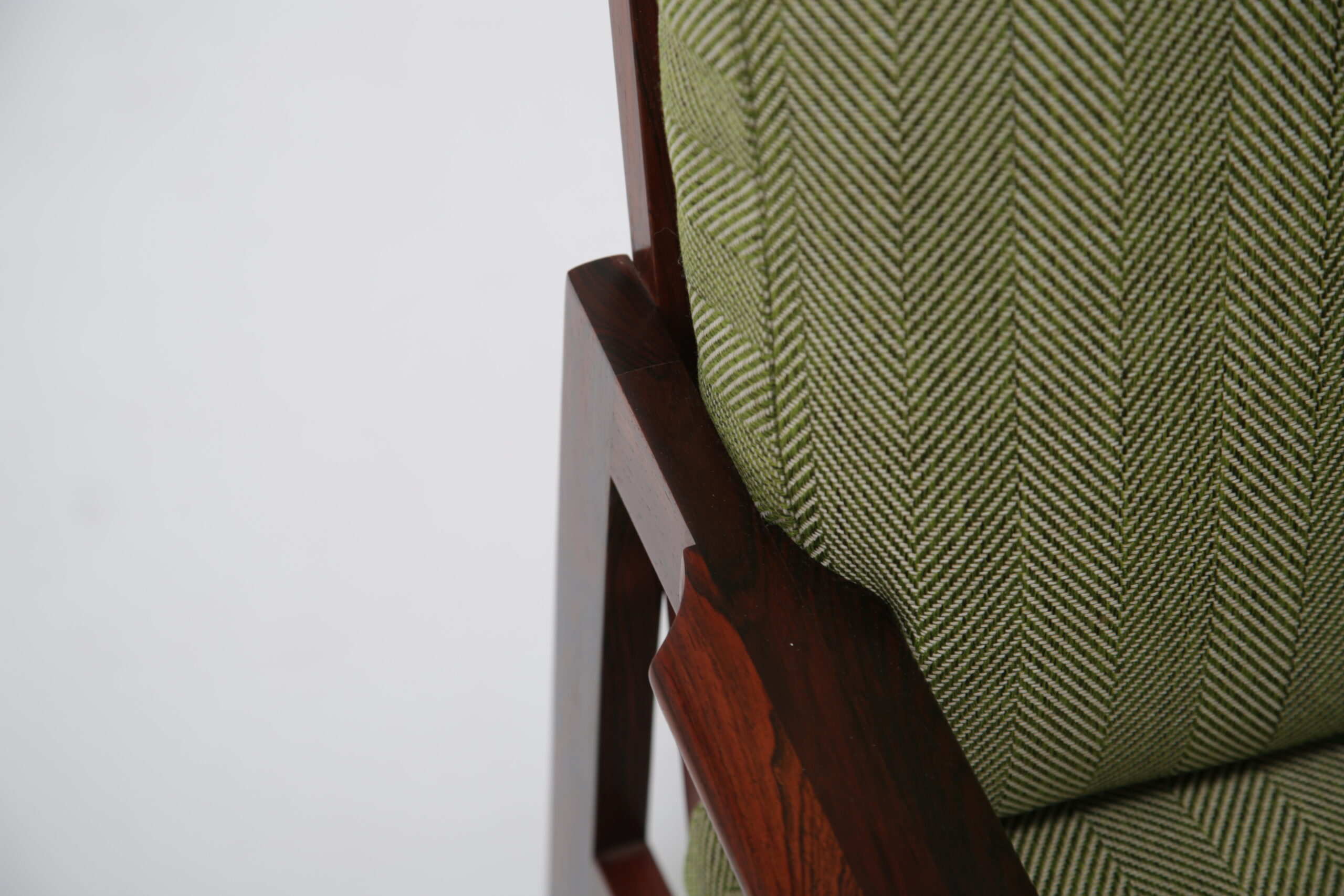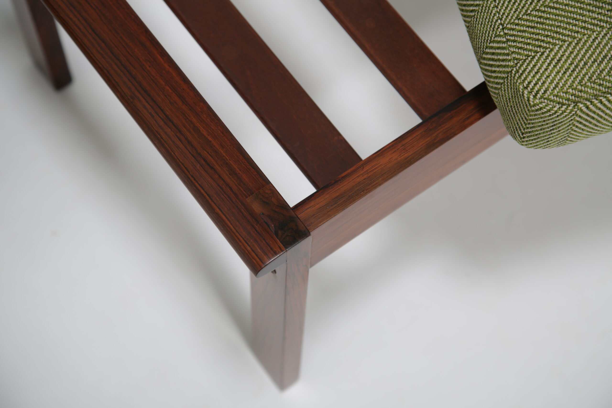 The chair is manufactured in rosewood which has a lovely deep and rich grain, evident throughout the armchair and has been upholstered in a lovely green herringbone fabric. This armchair would be the perfect addition to any living room, lounge area or office requiring a comfortable chair to sit in to relax, read or just simply watch TV.