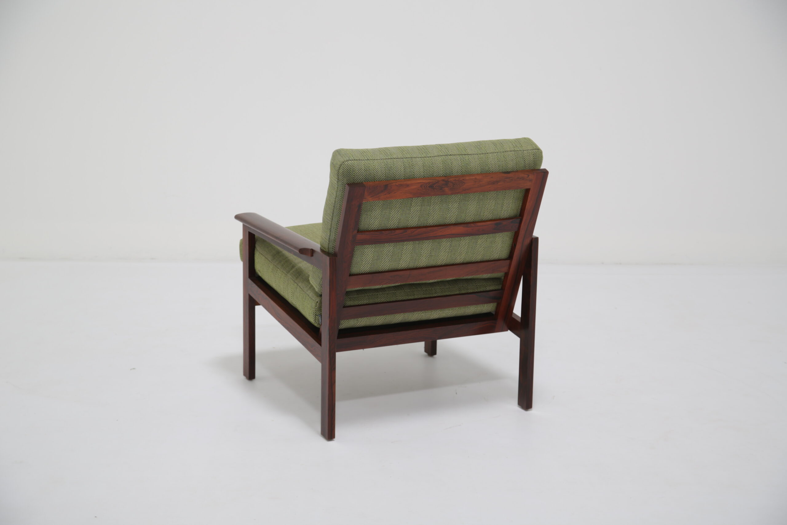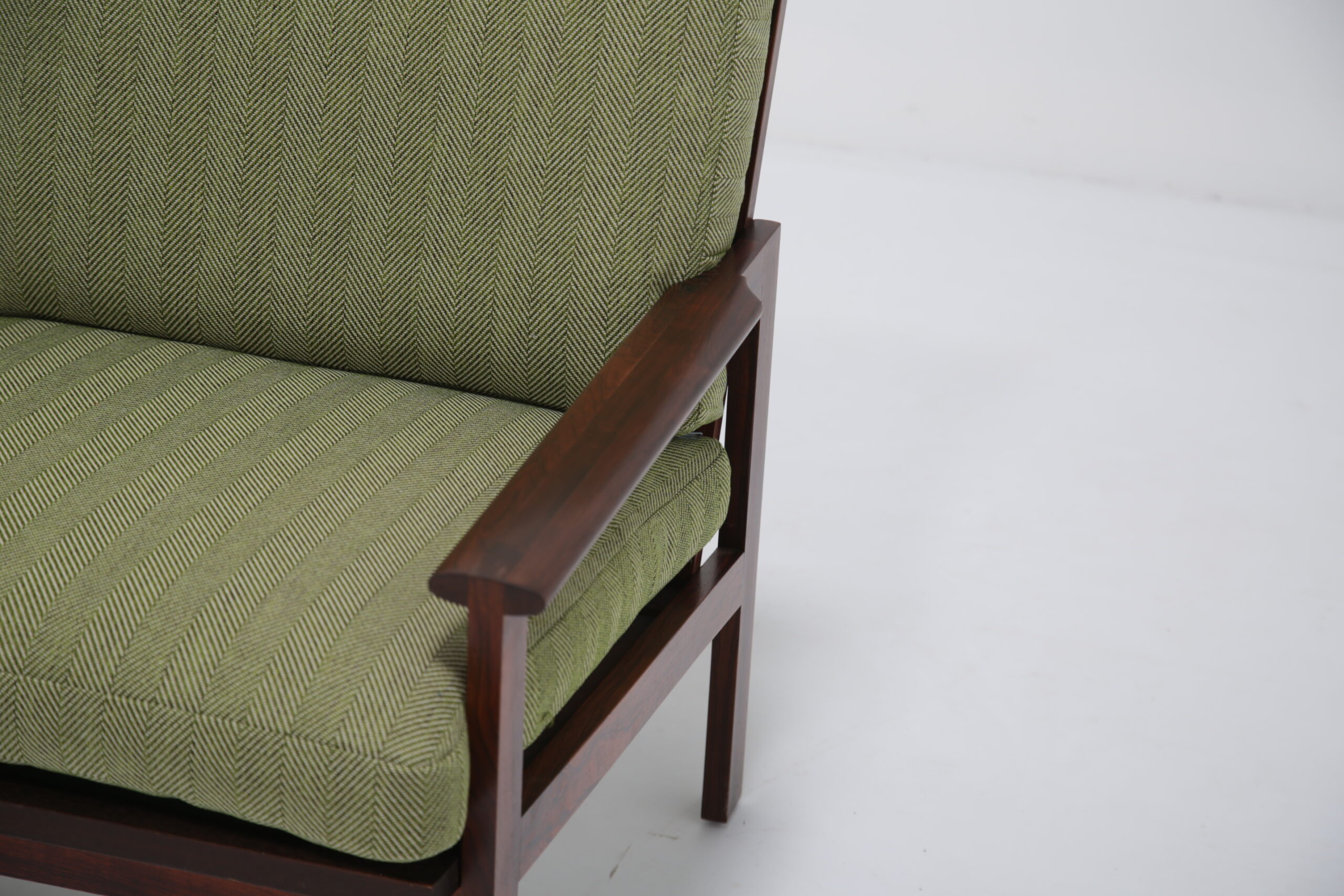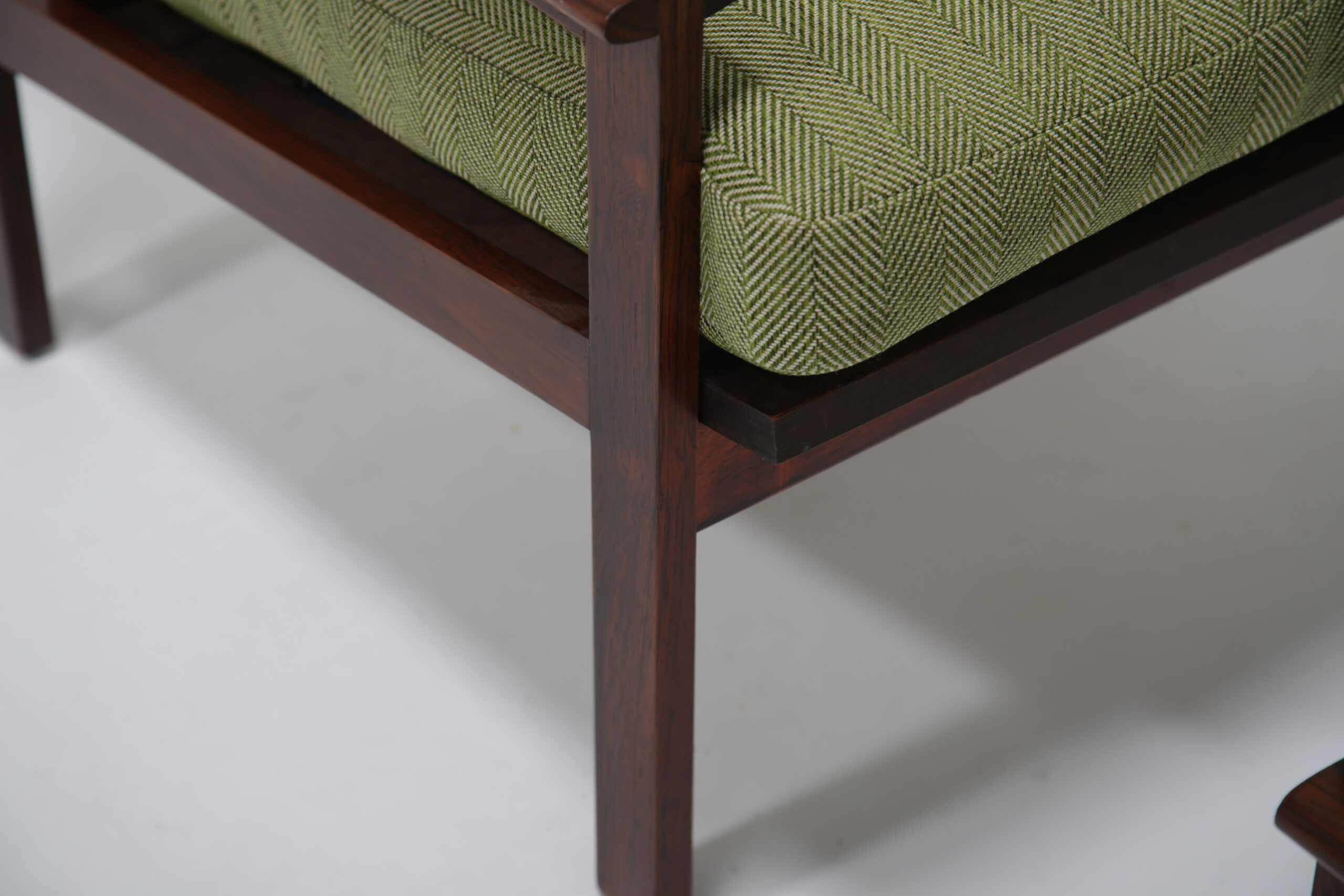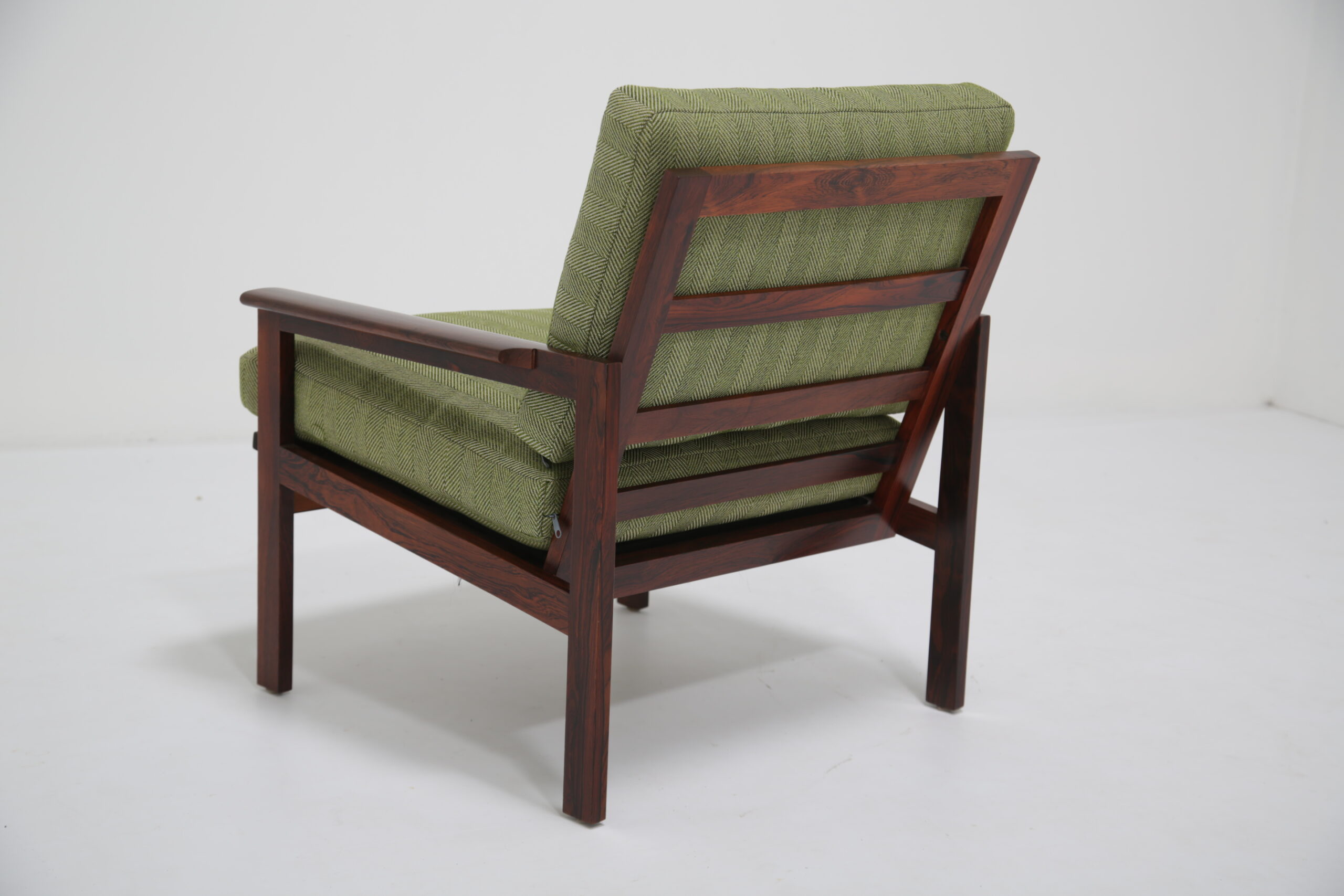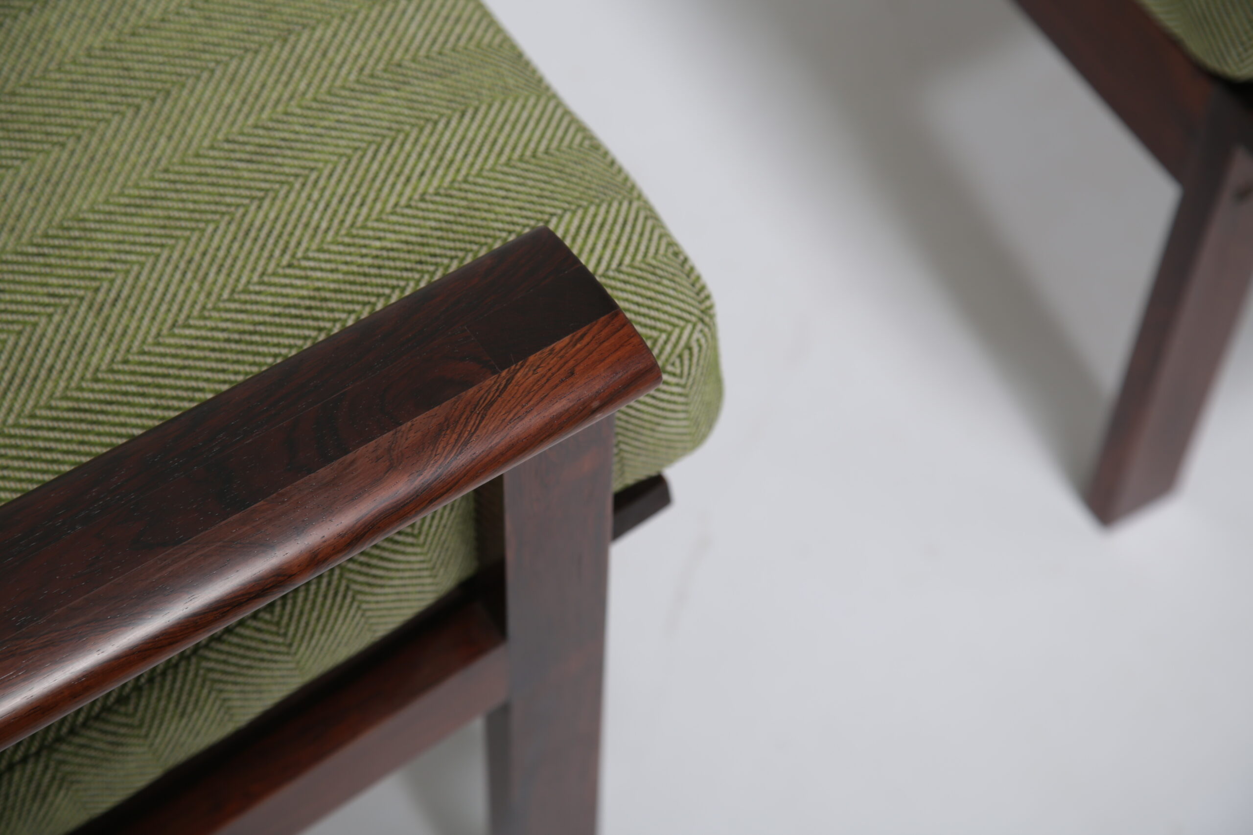 The chair is manufactured in rosewood which has a lovely deep and rich grain, evident throughout the armchair and has been upholstered in a lovely green herringbone fabric. This armchair would be the perfect addition to any living room, lounge area or office requiring a comfortable chair to sit in to relax, read or just simply watch TV.