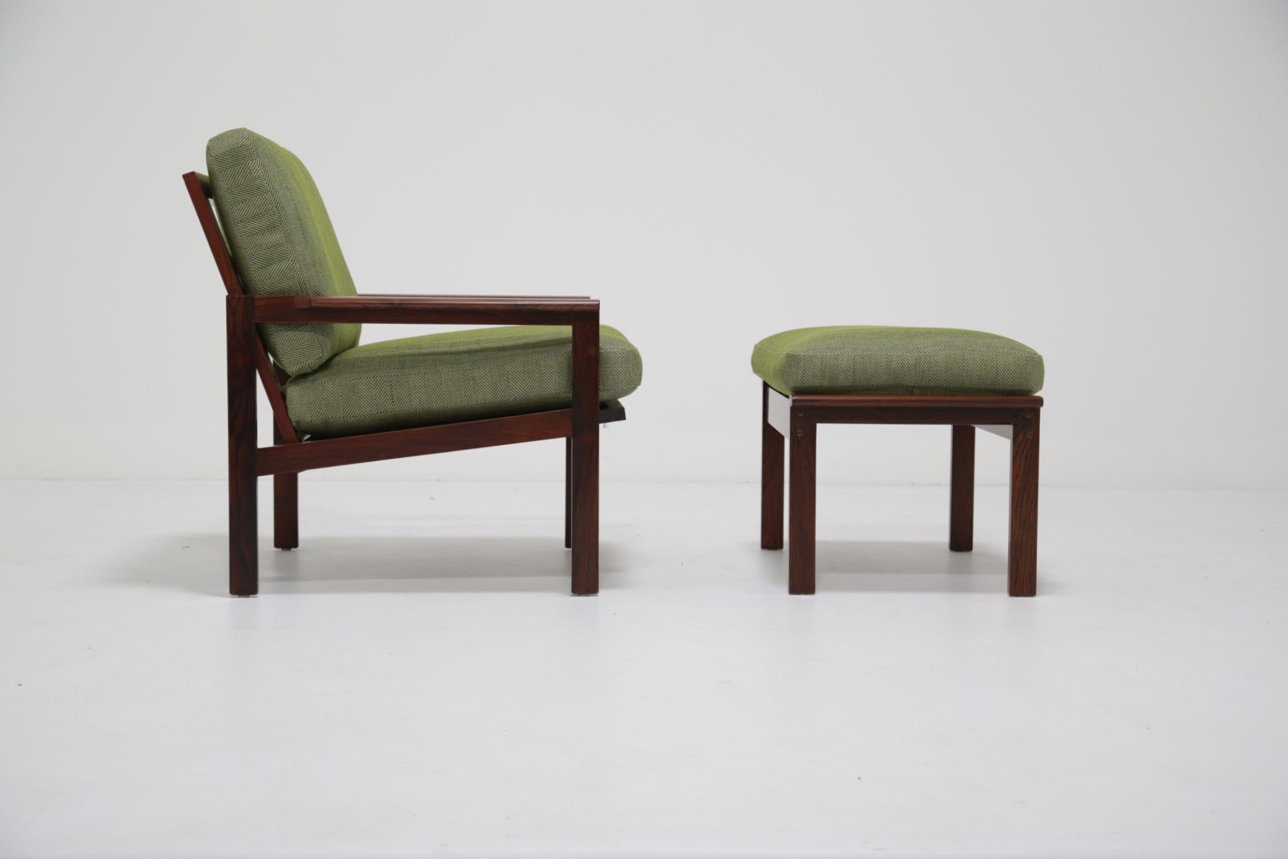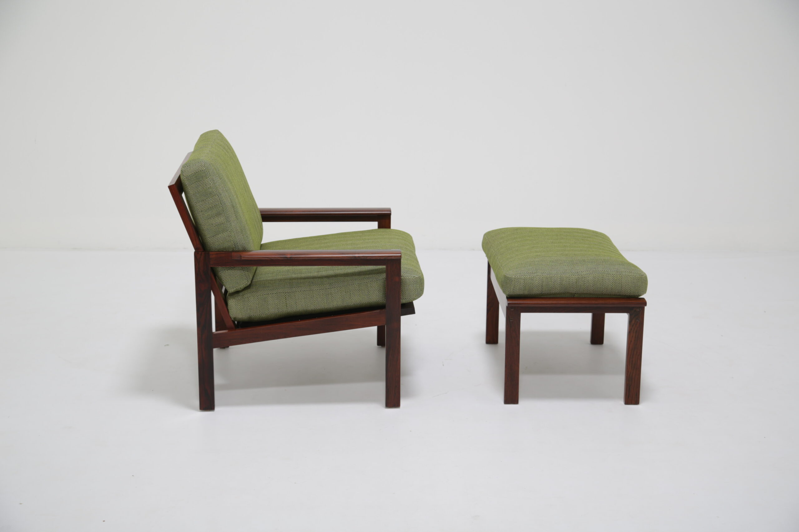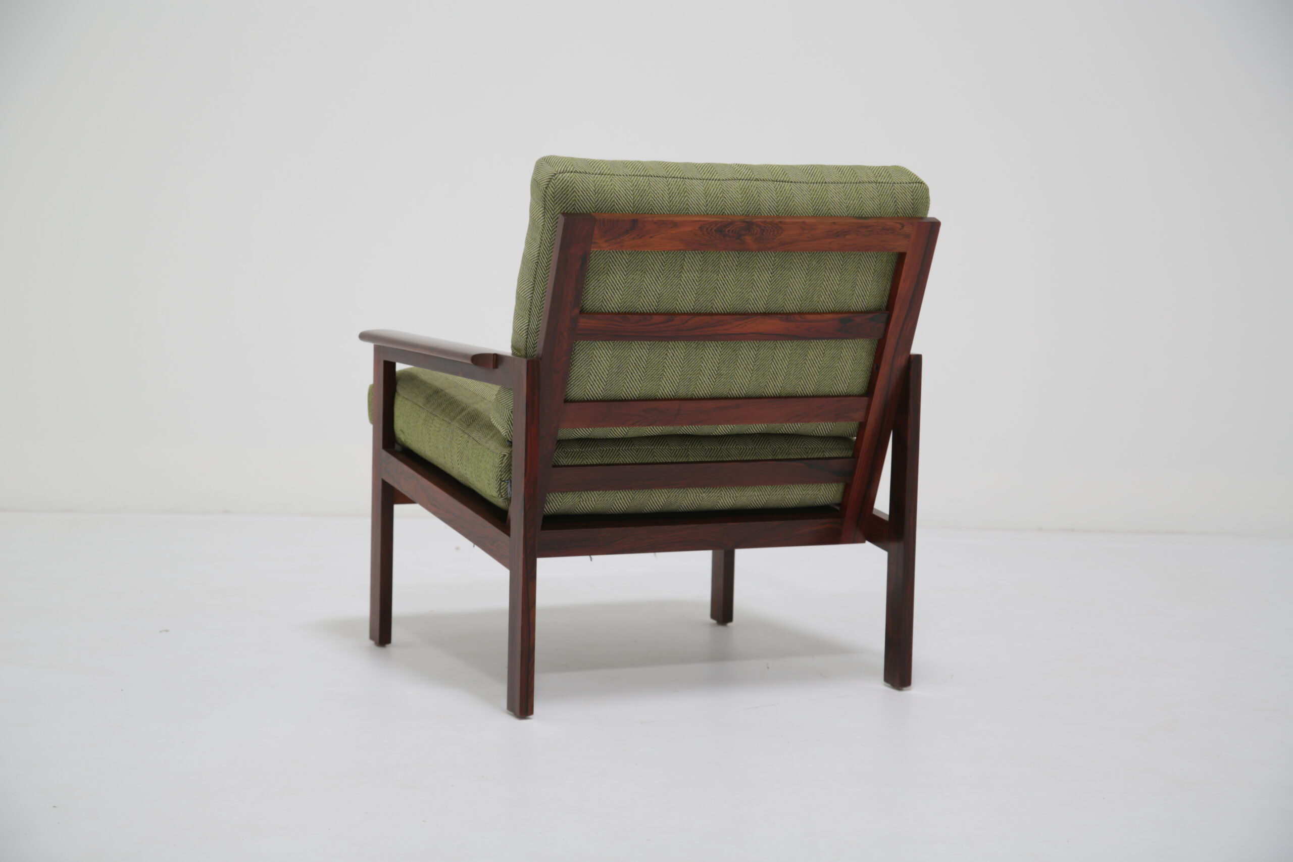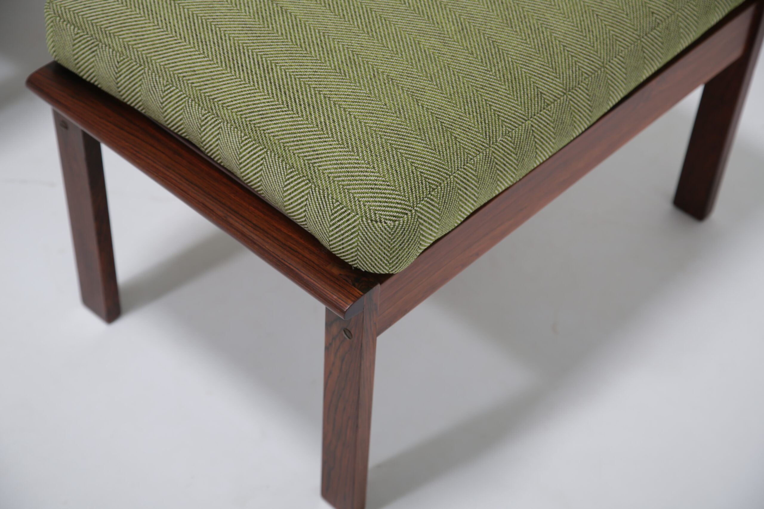 The chair is manufactured in rosewood which has a lovely deep and rich grain, evident throughout the armchair and has been upholstered in a lovely green herringbone fabric. This armchair would be the perfect addition to any living room, lounge area or office requiring a comfortable chair to sit in to relax, read or just simply watch TV.