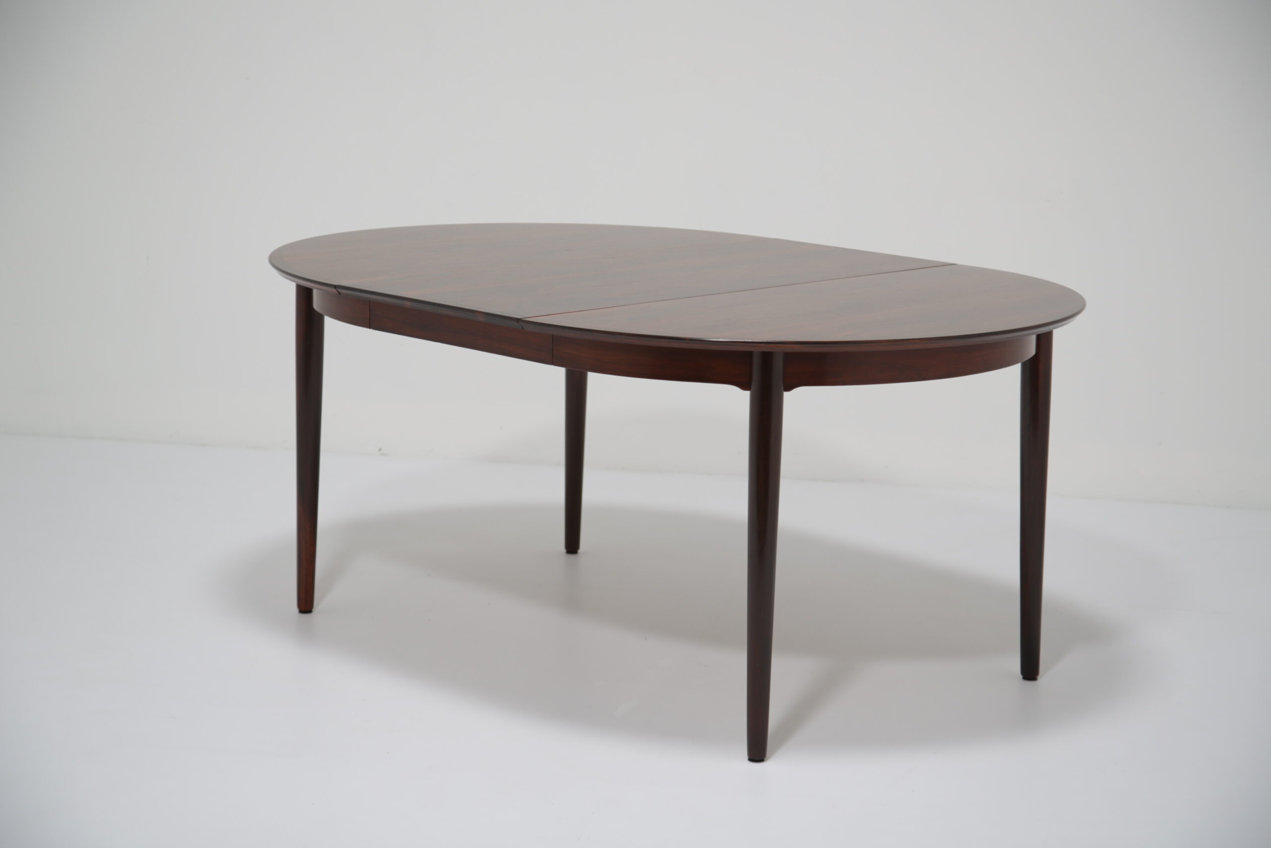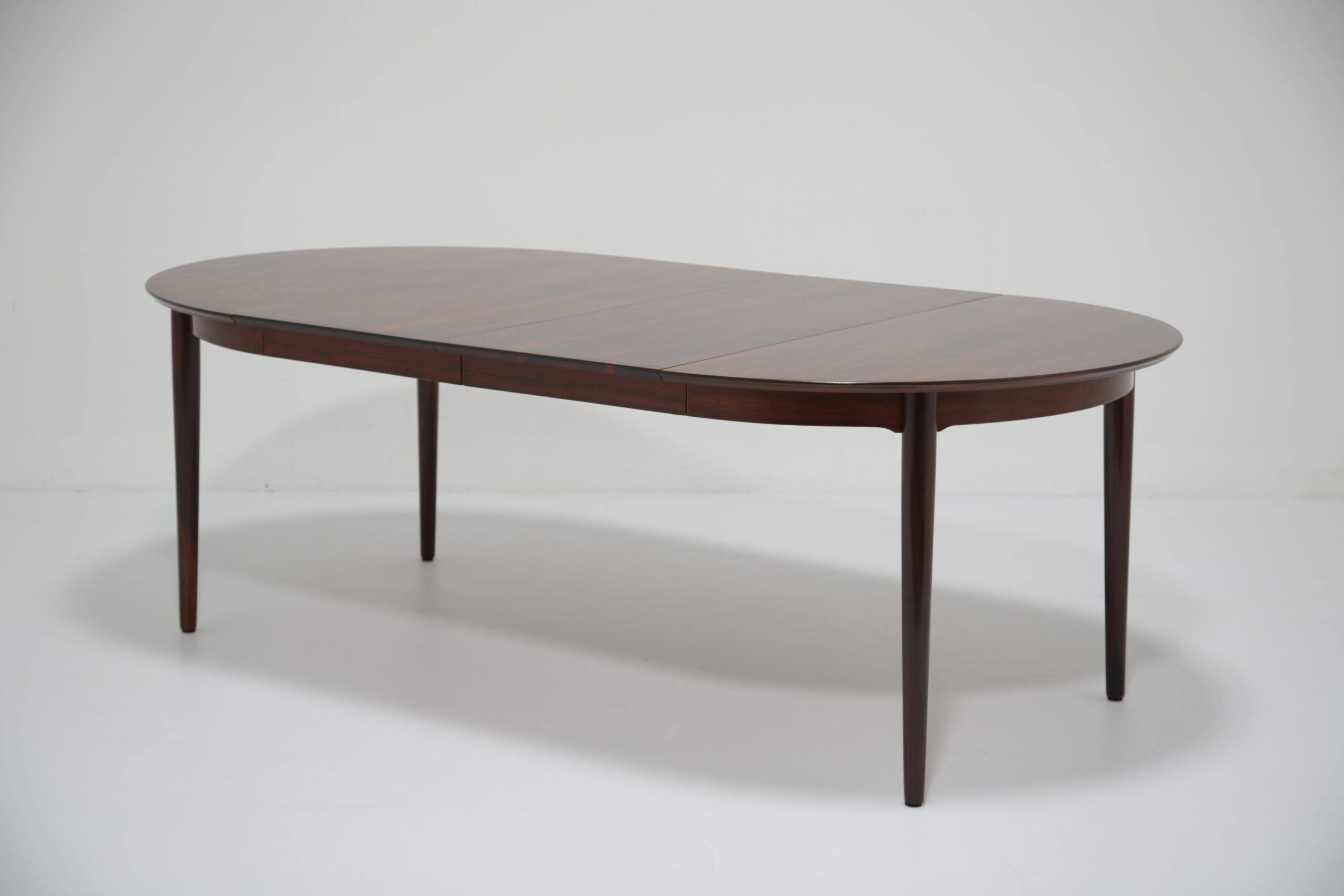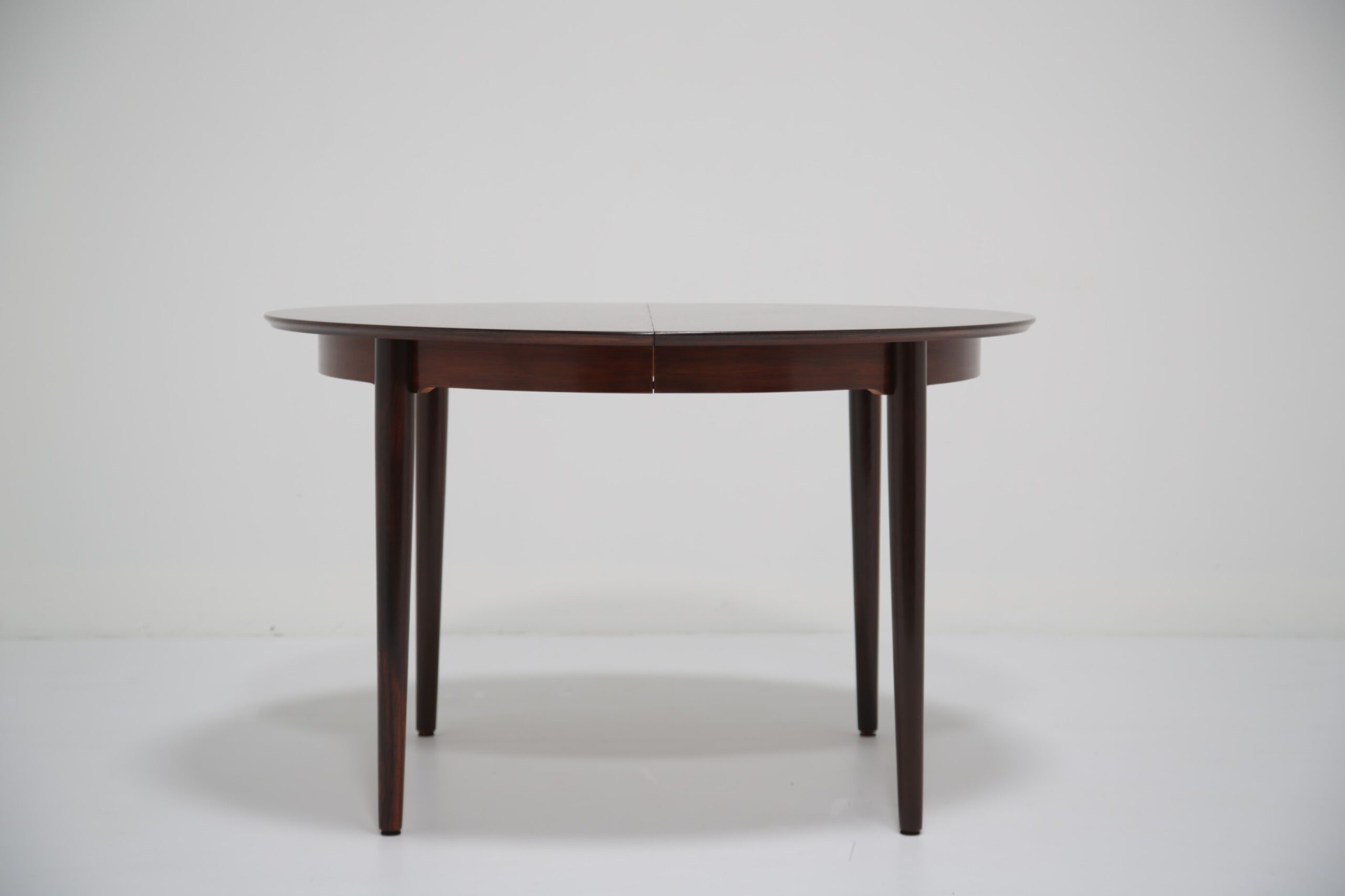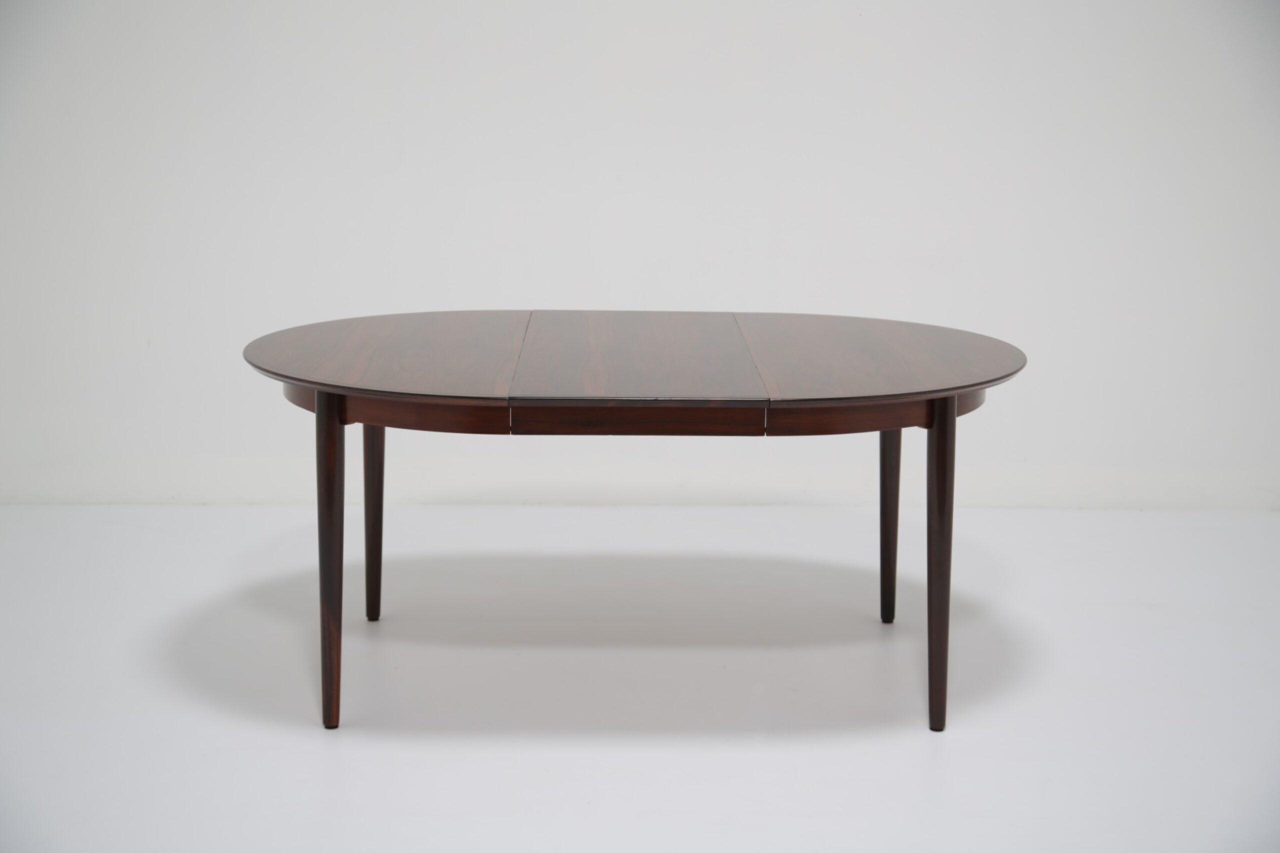 This gorgeous rosewood dining table has been beautifully and expertly restored by our professional in-house restoration team and features a minimalistic design with gently curved edges and rounded legs. Extending from a nice round table to a large oval dining table that can seat up to 8 guests comfortably. The table has two extension leaves, allowing you to adjust the table to accommodate extra guests when needed. Designed by the renowned Danish designer Arne Vodder for Sibast Furniture in 1955.