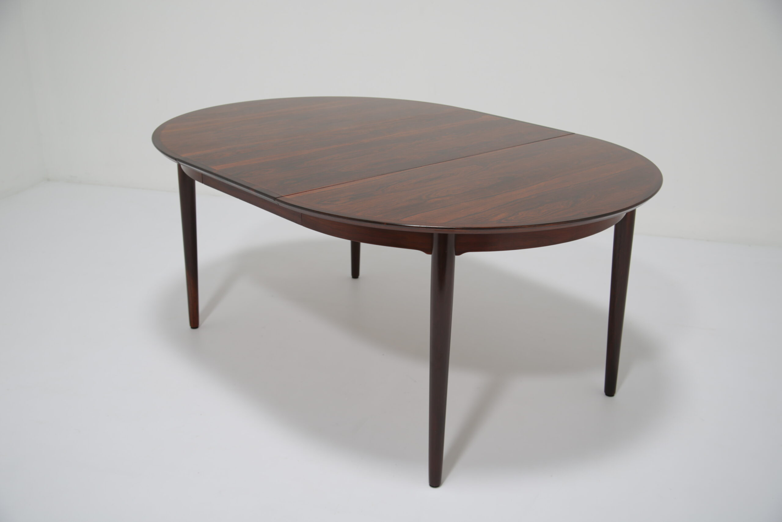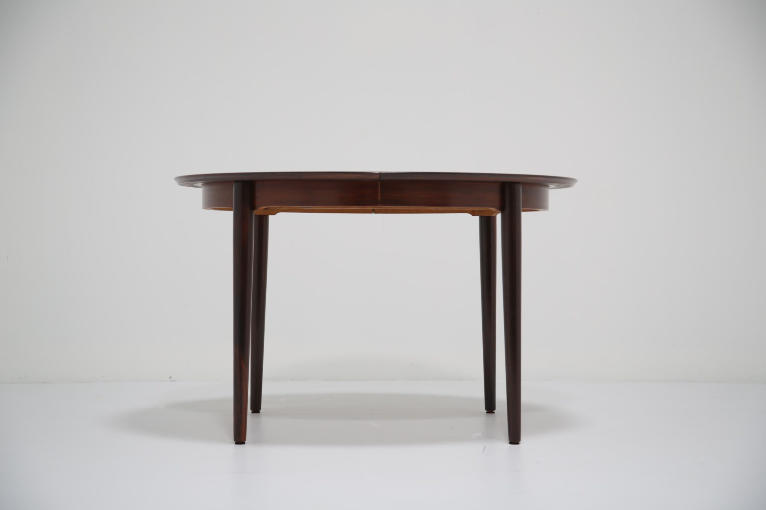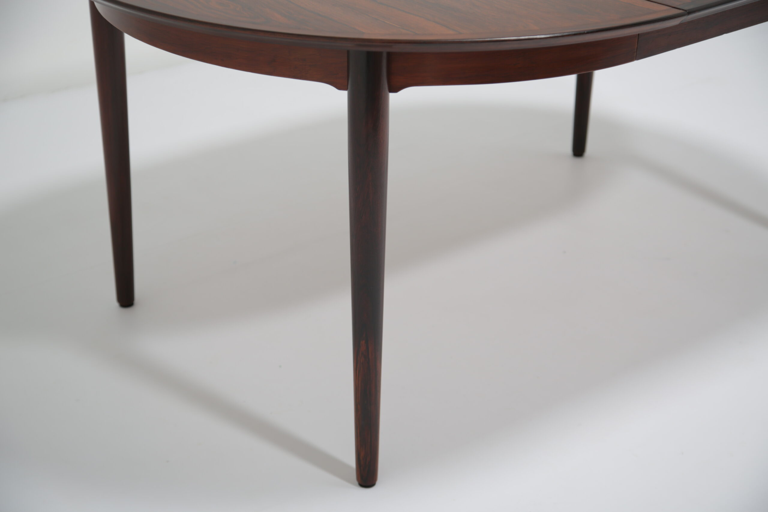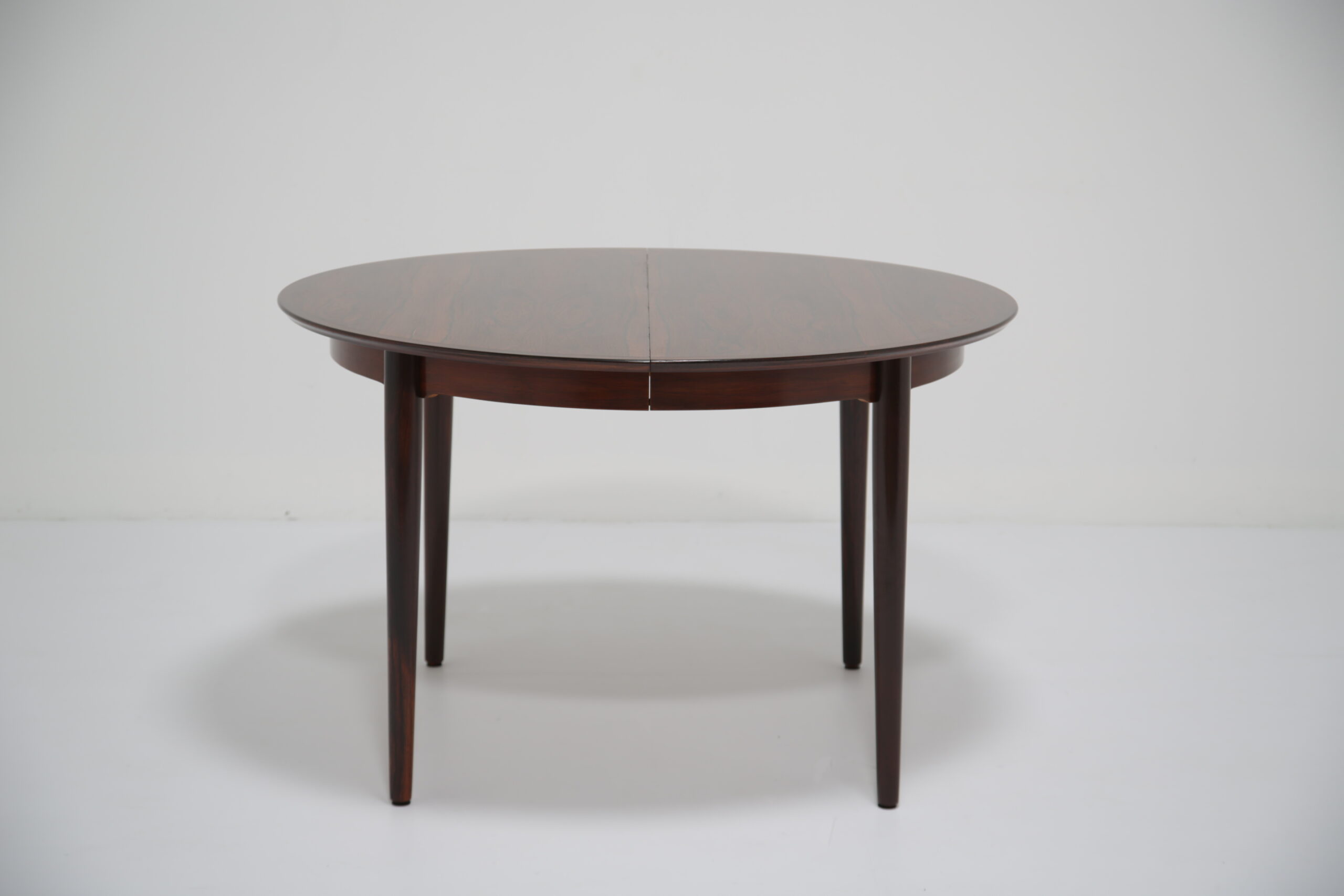 This gorgeous rosewood dining table has been beautifully and expertly restored by our professional in-house restoration team and features a minimalistic design with gently curved edges and rounded legs. Extending from a nice round table to a large oval dining table that can seat up to 8 guests comfortably. The table has two extension leaves, allowing you to adjust the table to accommodate extra guests when needed. Designed by the renowned Danish designer Arne Vodder for Sibast Furniture in 1955.