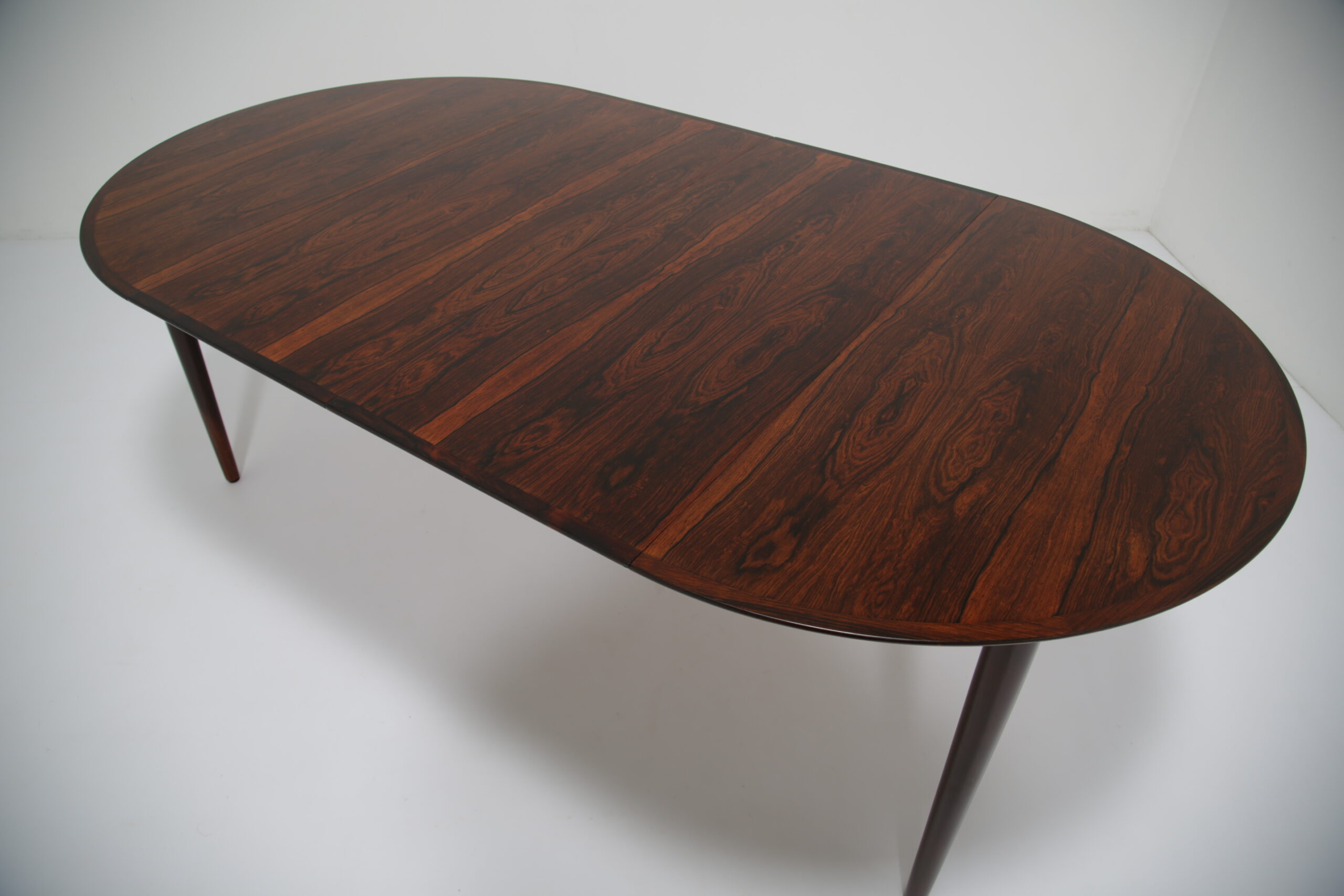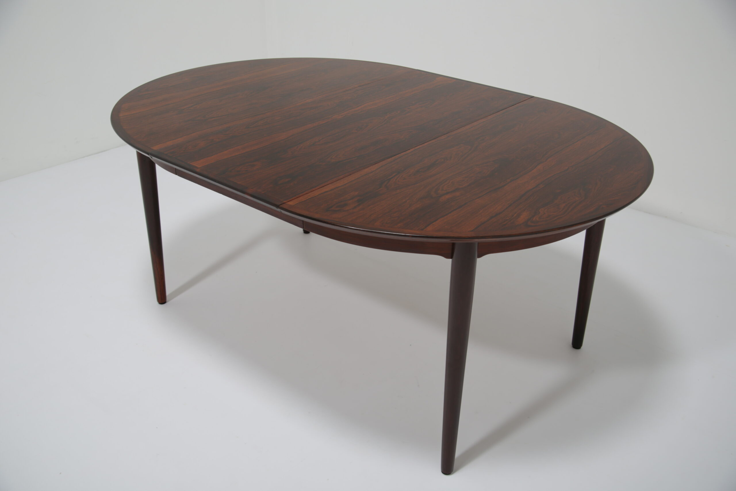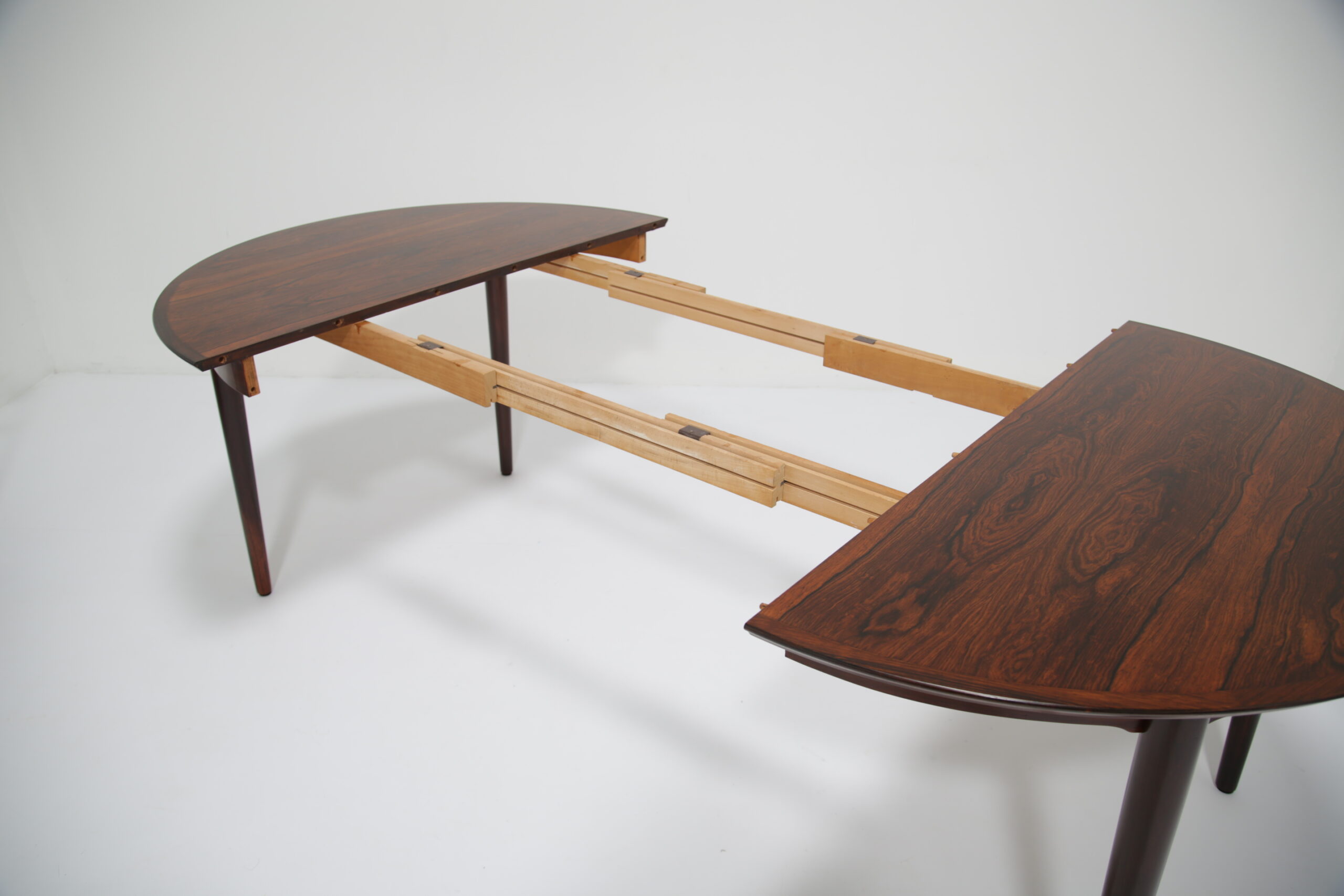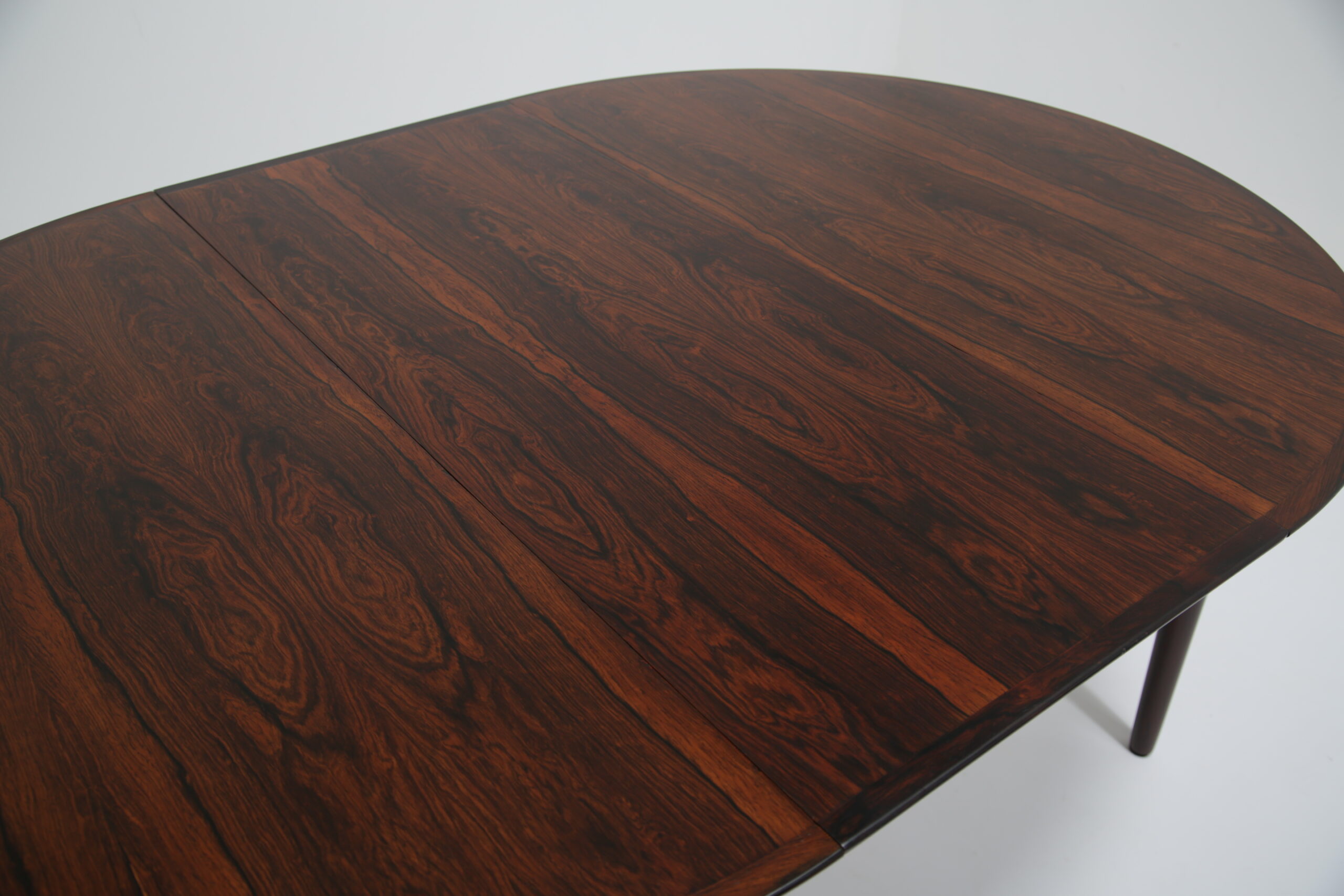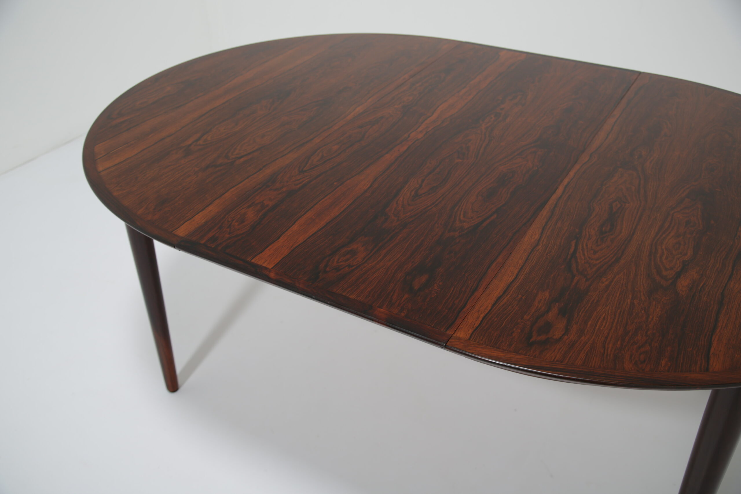 This gorgeous rosewood dining table has been beautifully and expertly restored by our professional in-house restoration team and features a minimalistic design with gently curved edges and rounded legs. Extending from a nice round table to a large oval dining table that can seat up to 8 guests comfortably. The table has two extension leaves, allowing you to adjust the table to accommodate extra guests when needed. Designed by the renowned Danish designer Arne Vodder for Sibast Furniture in 1955.