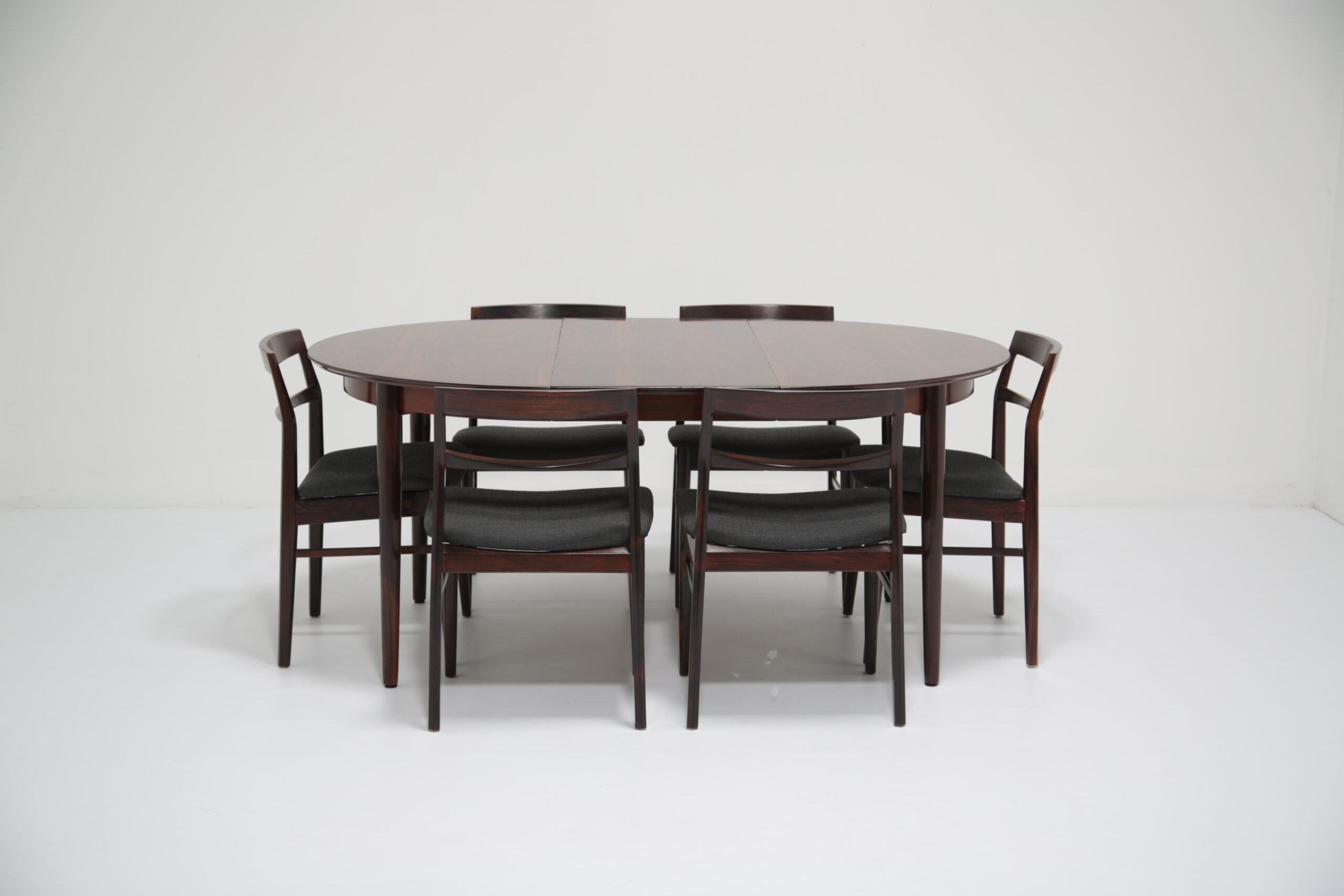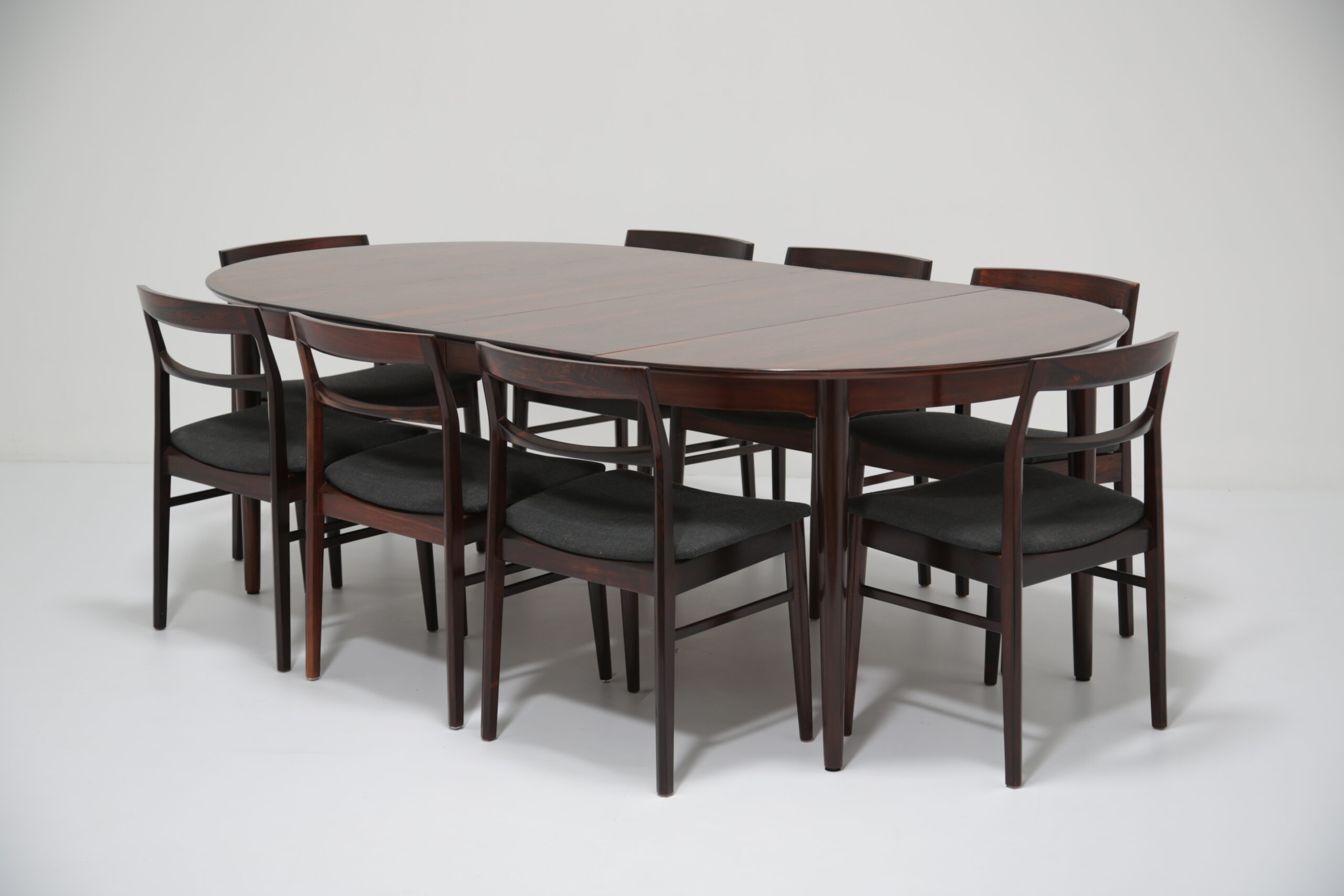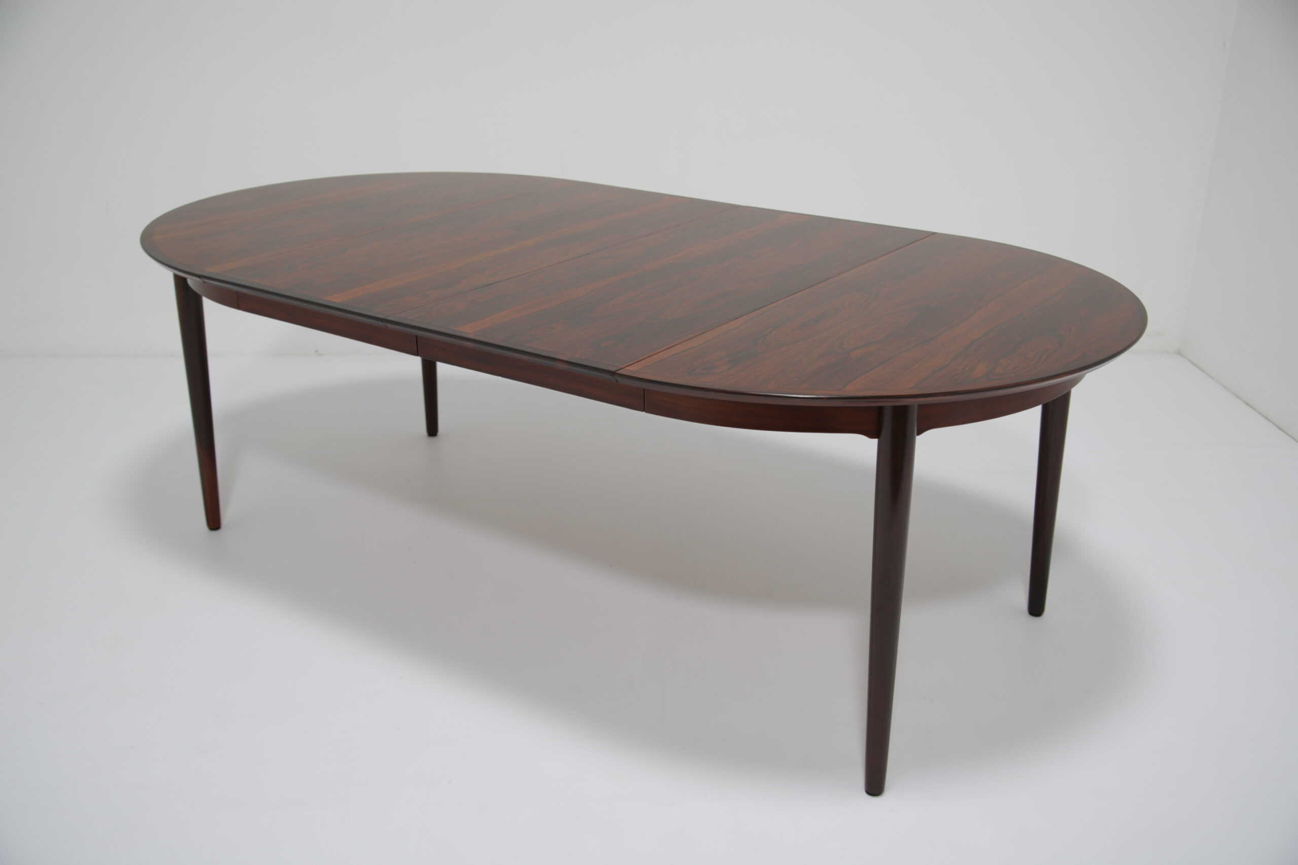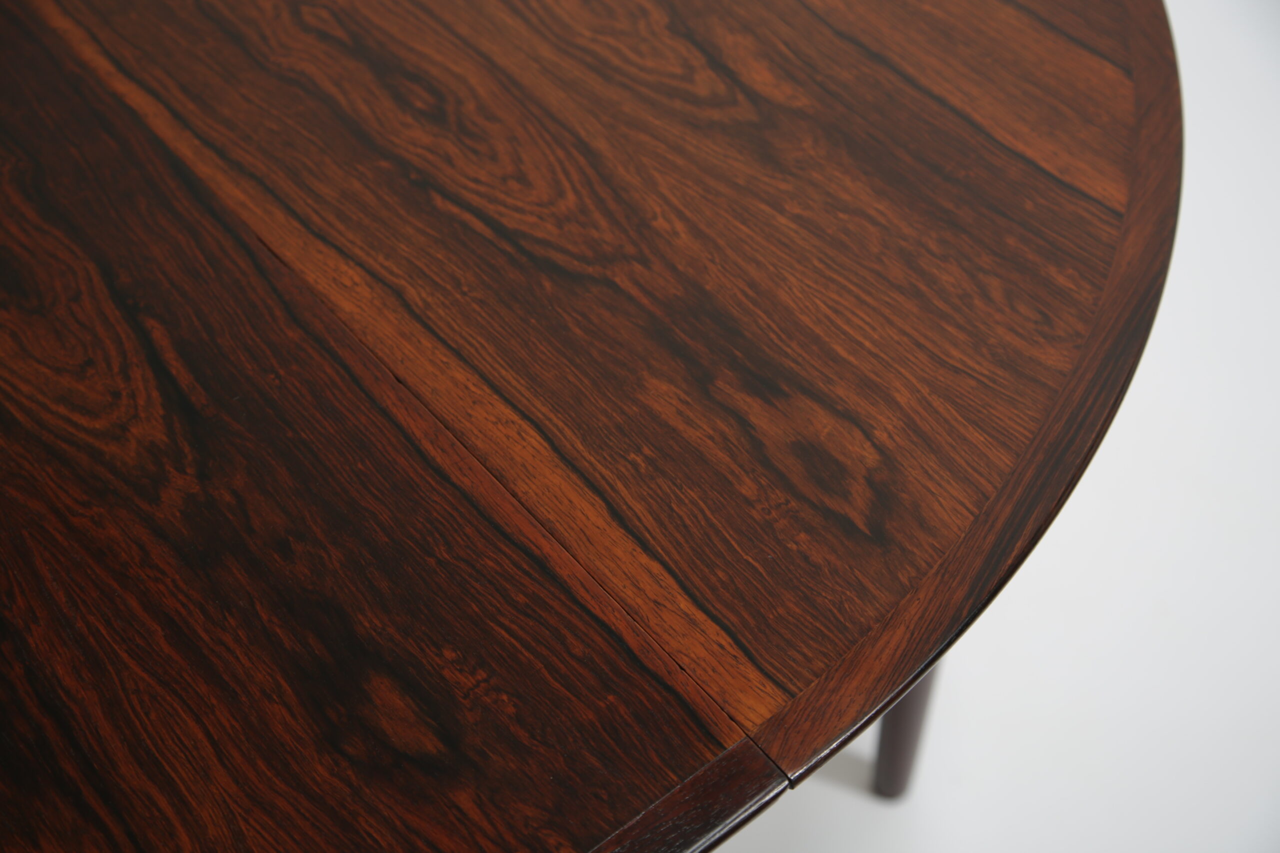 This gorgeous rosewood dining table has been beautifully and expertly restored by our professional in-house restoration team and features a minimalistic design with gently curved edges and rounded legs. Extending from a nice round table to a large oval dining table that can seat up to 8 guests comfortably. The table has two extension leaves, allowing you to adjust the table to accommodate extra guests when needed. Designed by the renowned Danish designer Arne Vodder for Sibast Furniture in 1955.
