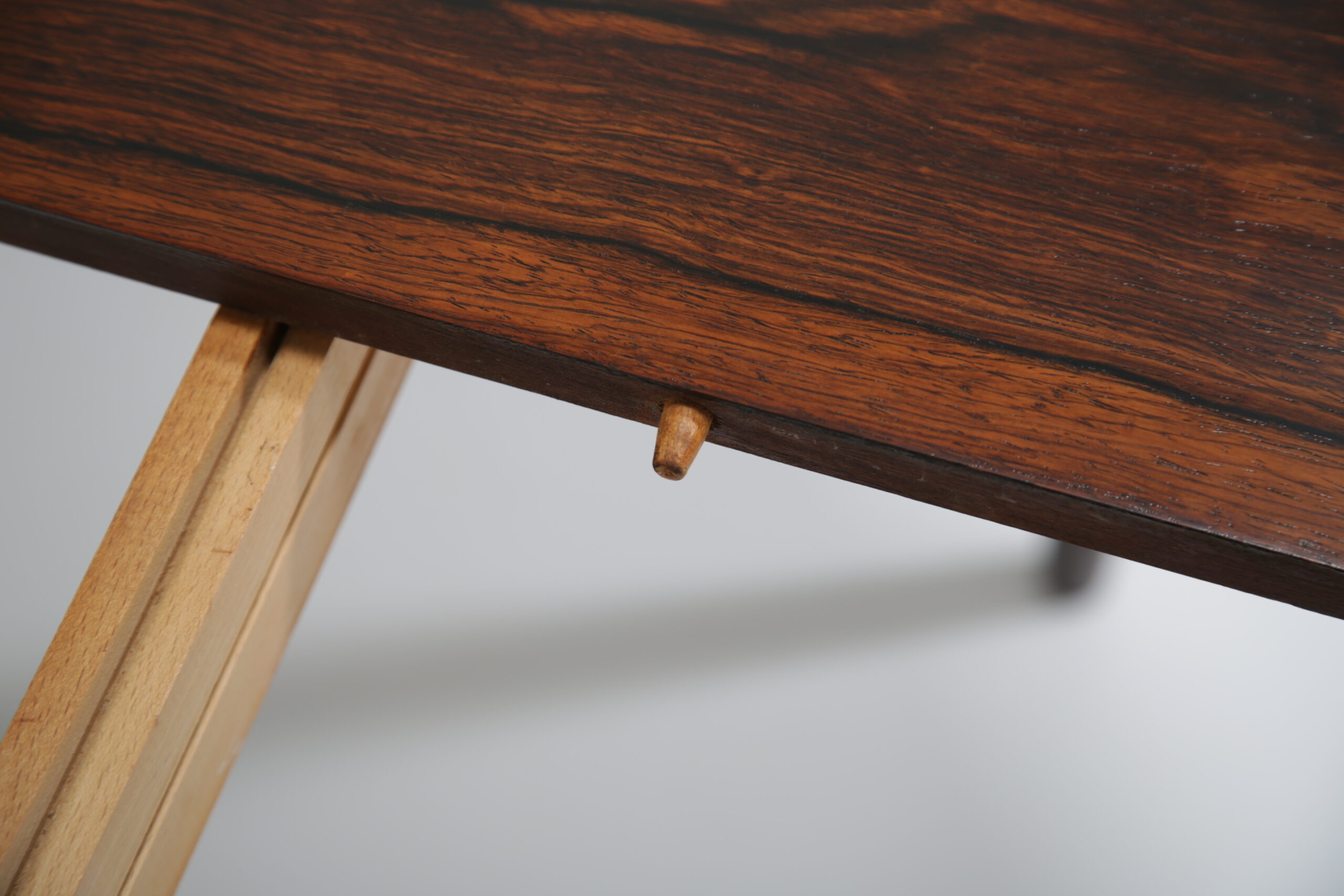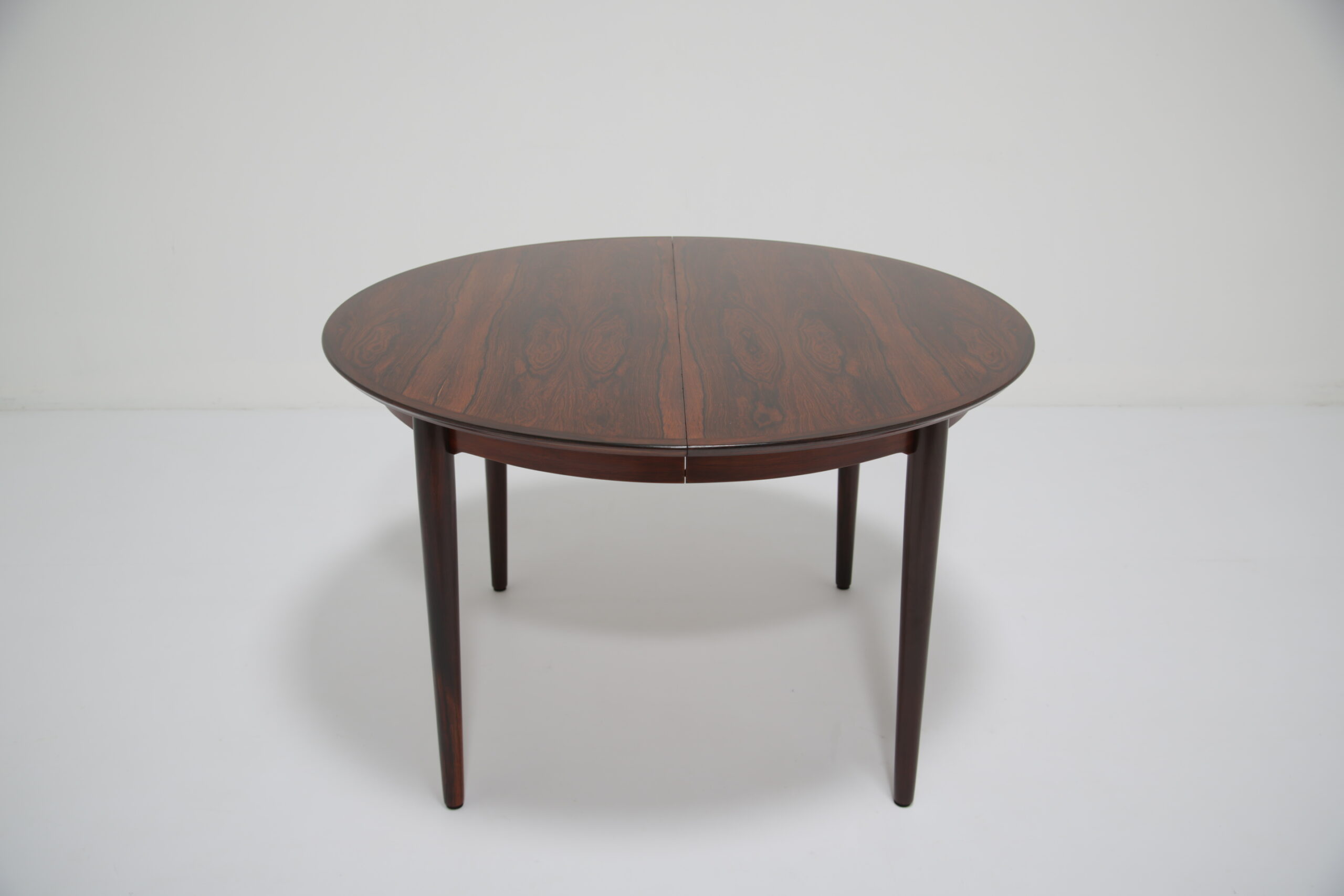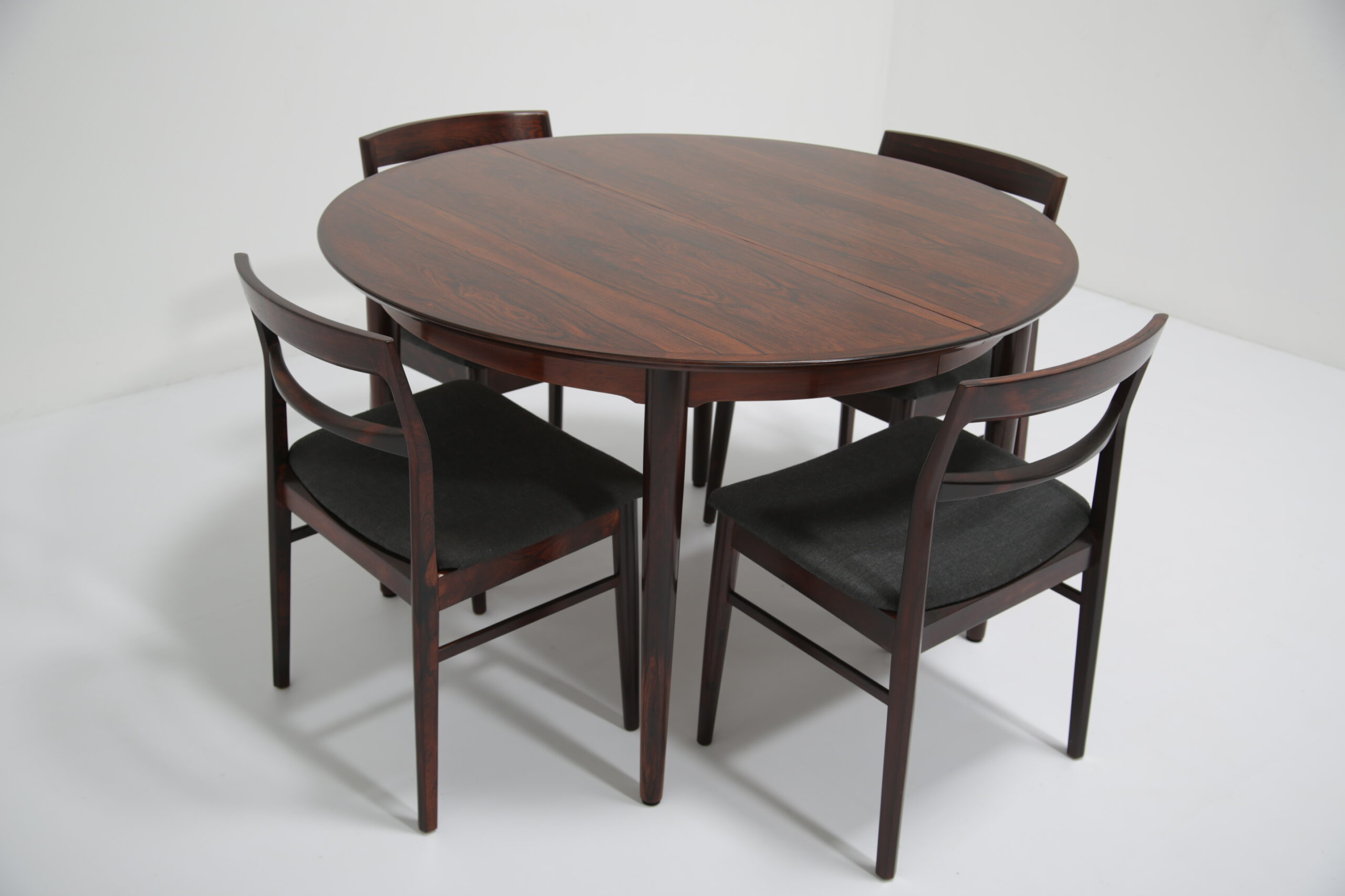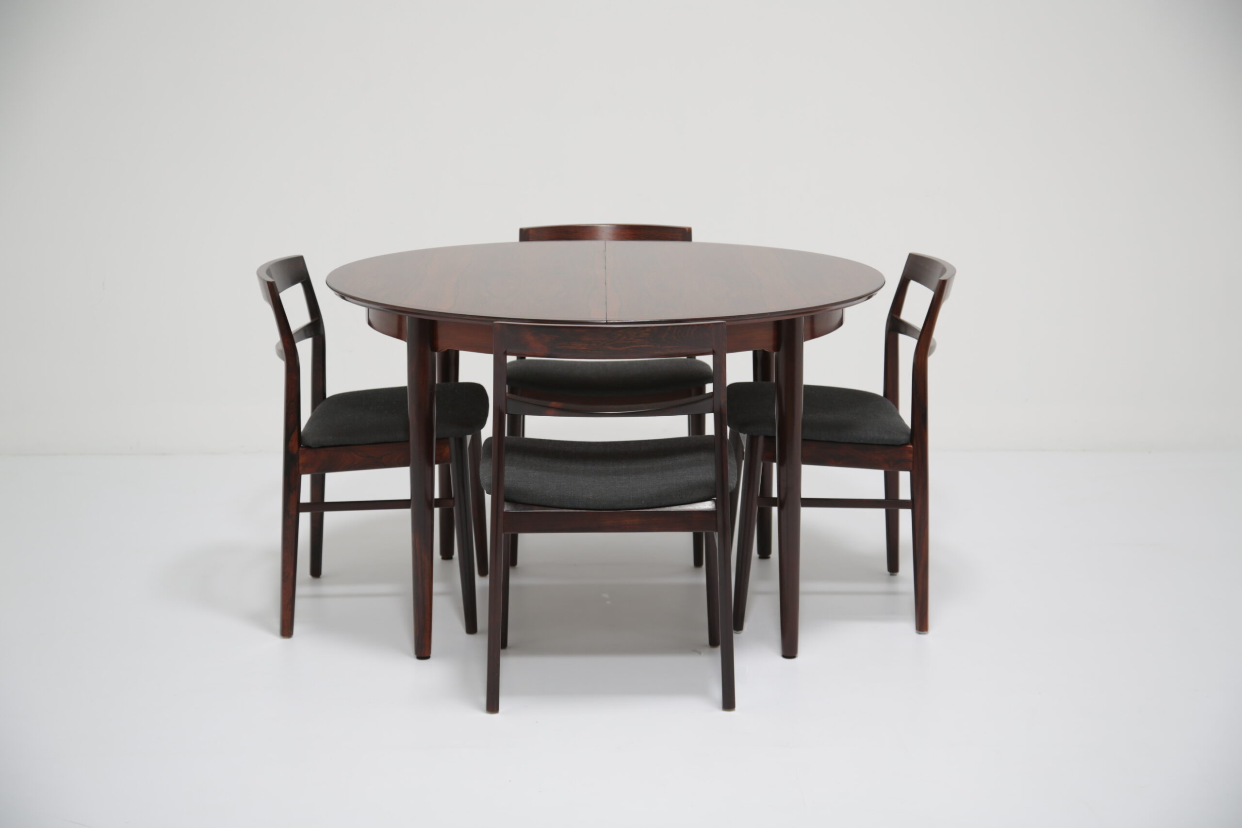 This gorgeous rosewood dining table has been beautifully and expertly restored by our professional in-house restoration team and features a minimalistic design with gently curved edges and rounded legs. Extending from a nice round table to a large oval dining table that can seat up to 8 guests comfortably. The table has two extension leaves, allowing you to adjust the table to accommodate extra guests when needed. Designed by the renowned Danish designer Arne Vodder for Sibast Furniture in 1955.