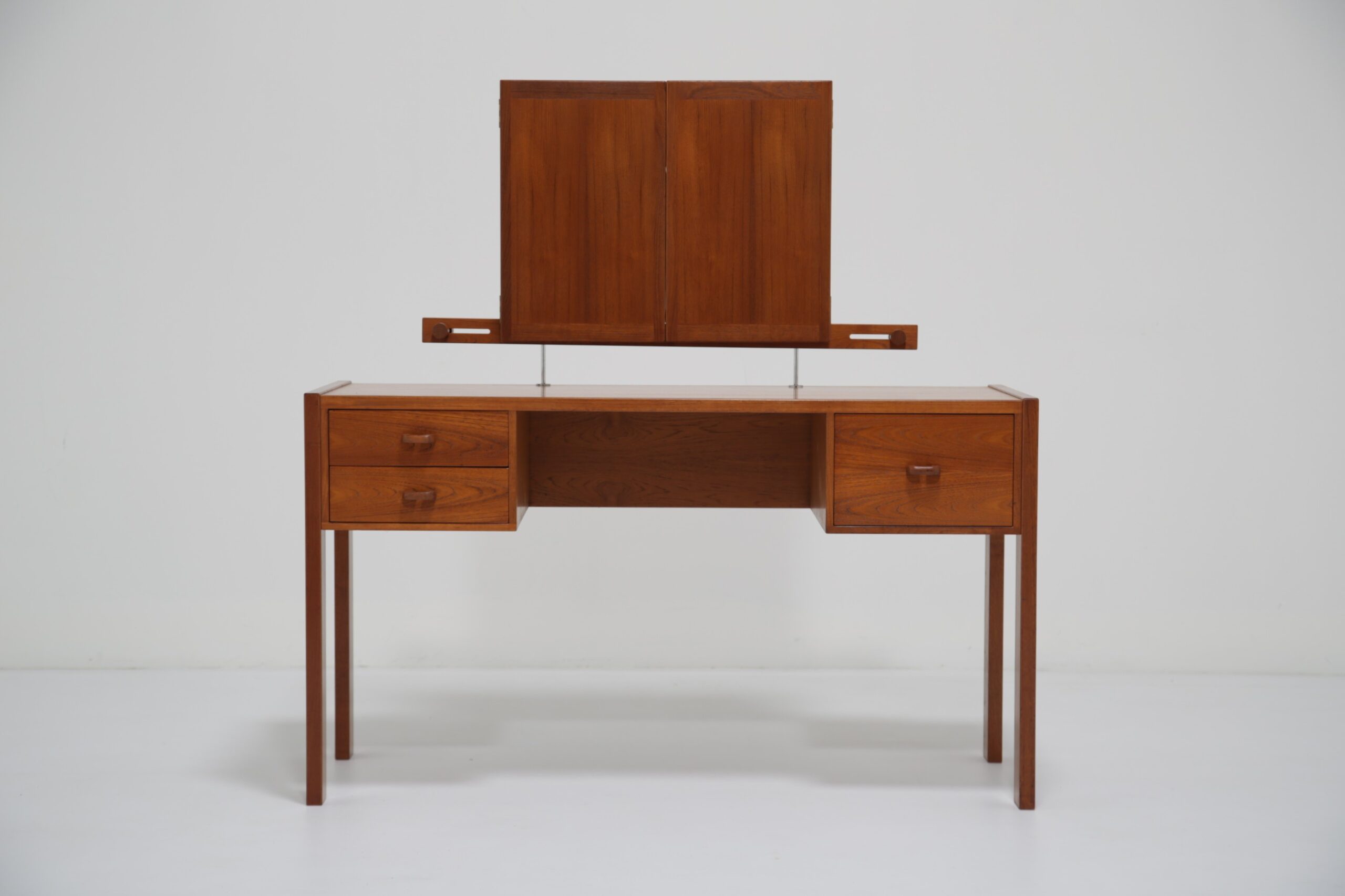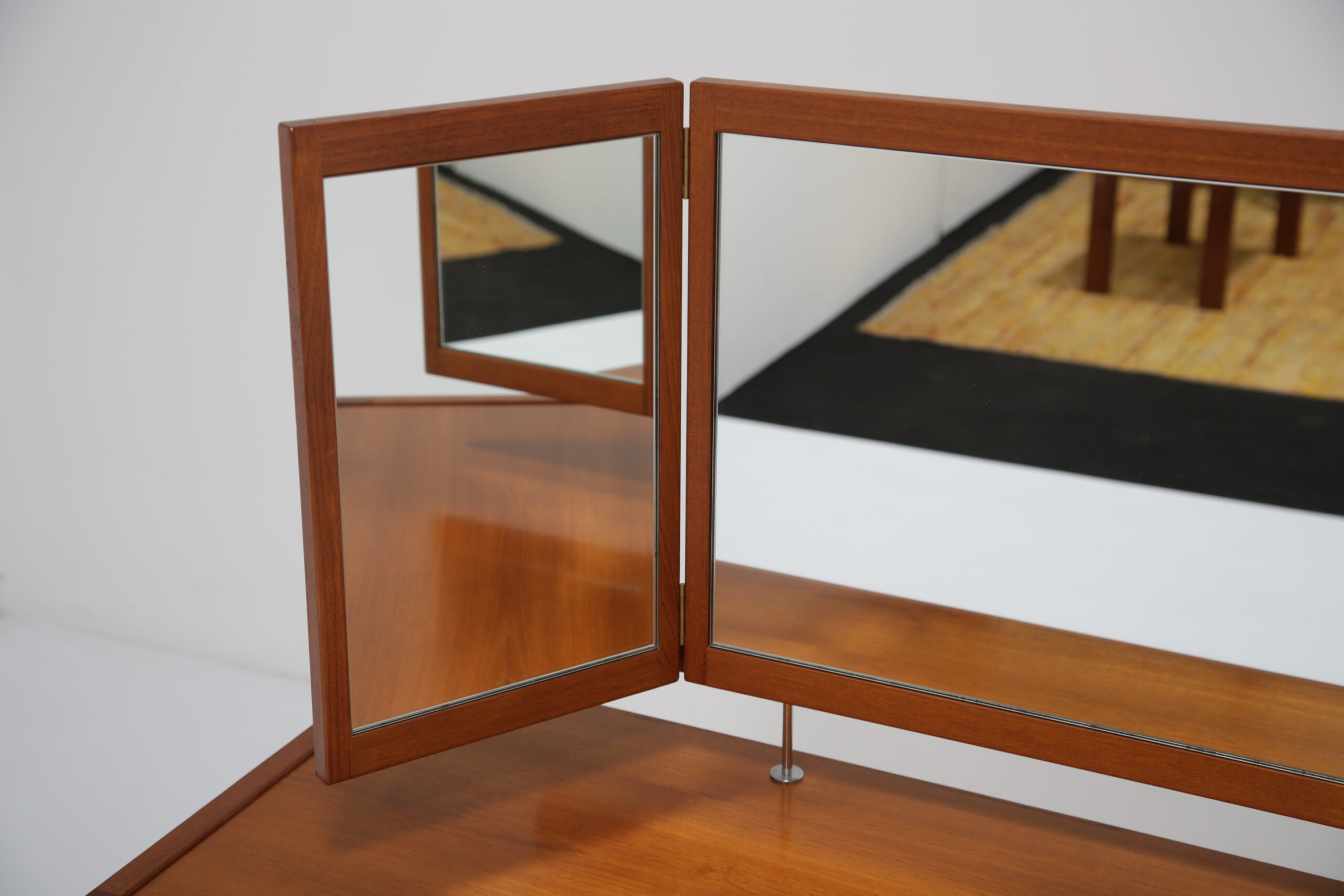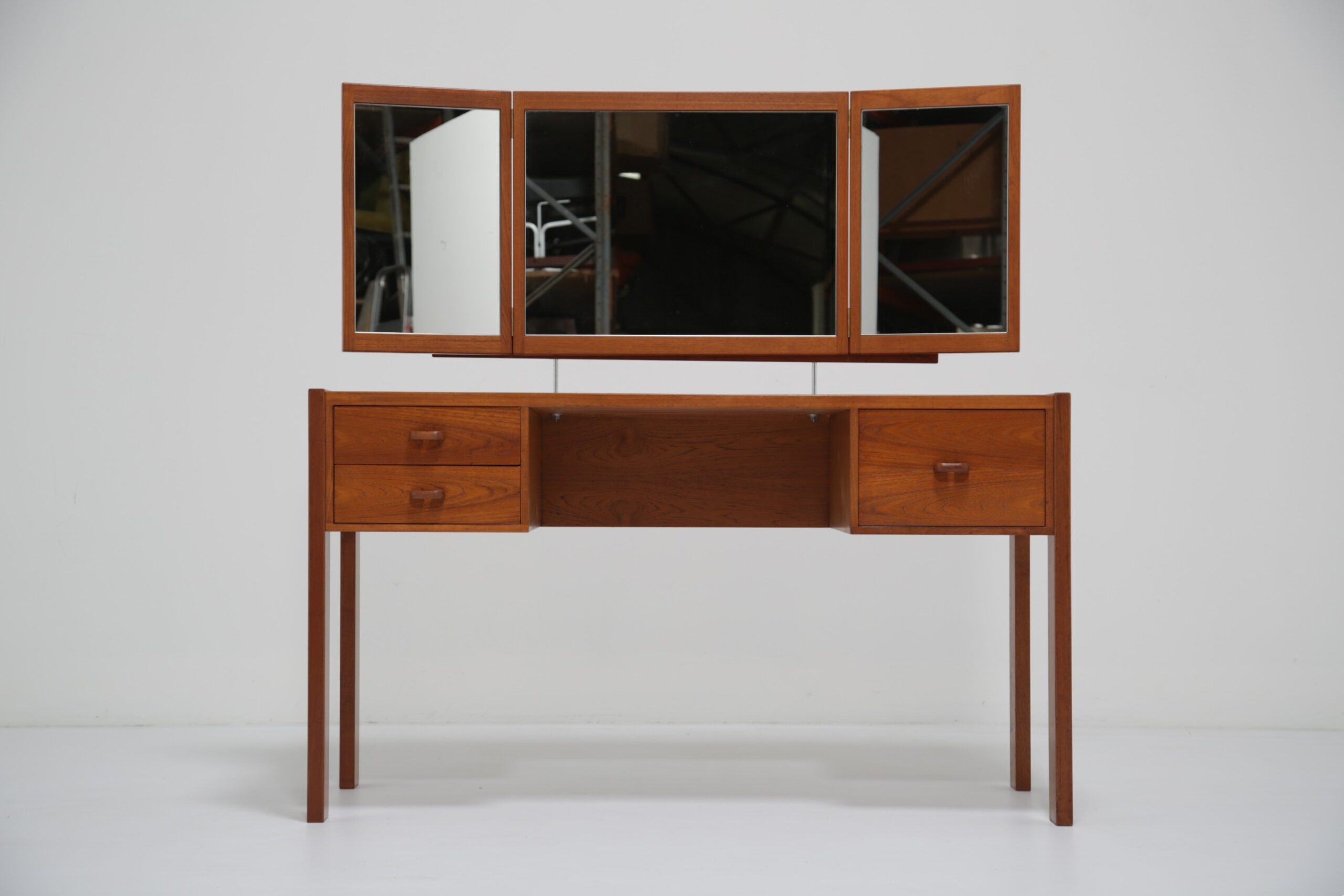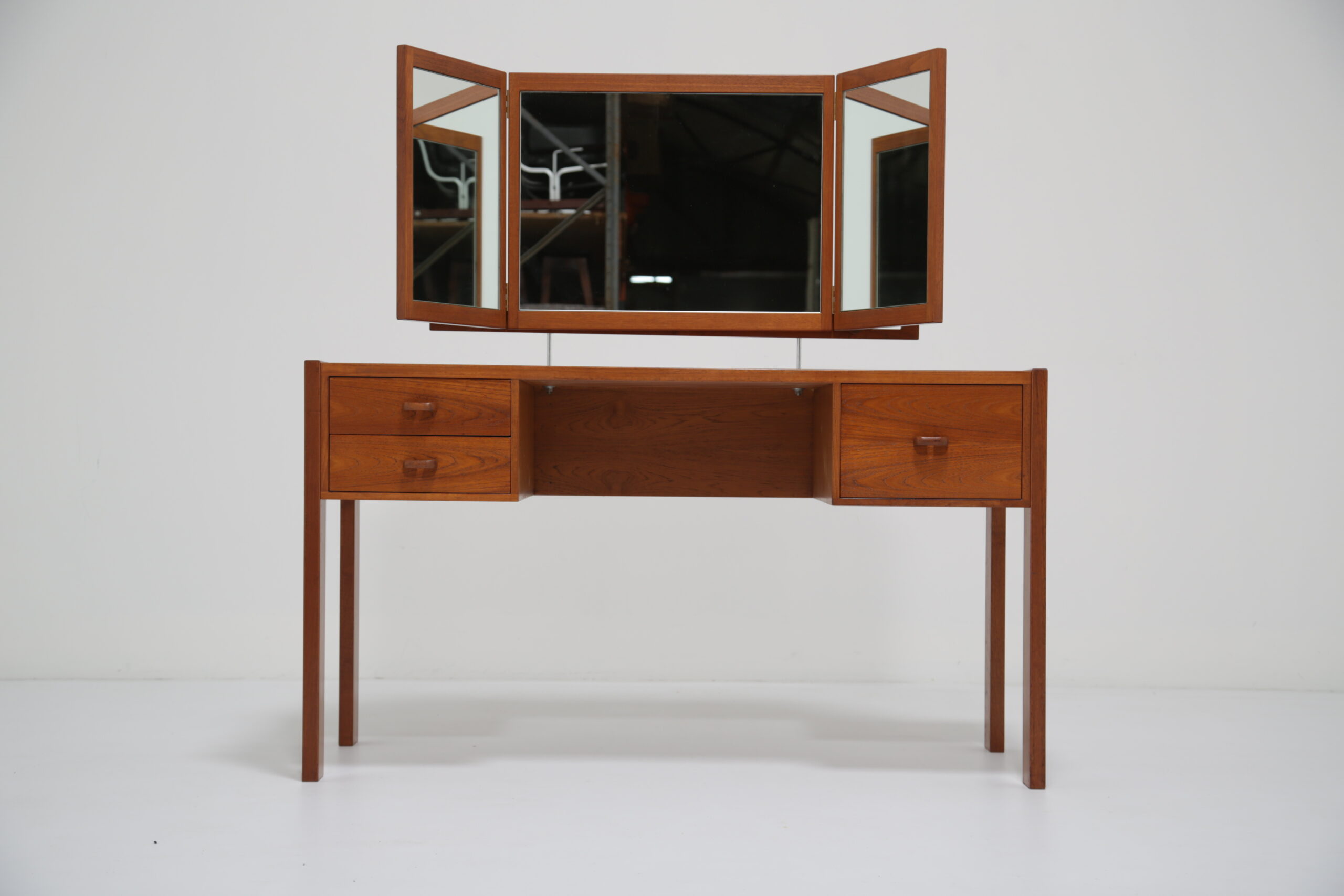 This beautifully crafted teak dressing table was designed by the Danish designer Aksel Kjersgaard and manufactured by Odder in the 1960s. The vanity features three drawers with a sturdy birch frame, dovetail joints, and elegant sculptural teak knobs. The striking tri-fold mirror appears to float, supported by slender aluminum rods. A clever design element allows the two teak cylinders on the vertical brace to slide along a track, letting you adjust the side mirrors to your preferred angle or close them when not in use. With its open, architectural feel, this piece is as functional as it is stylish—a true joy to use every day.