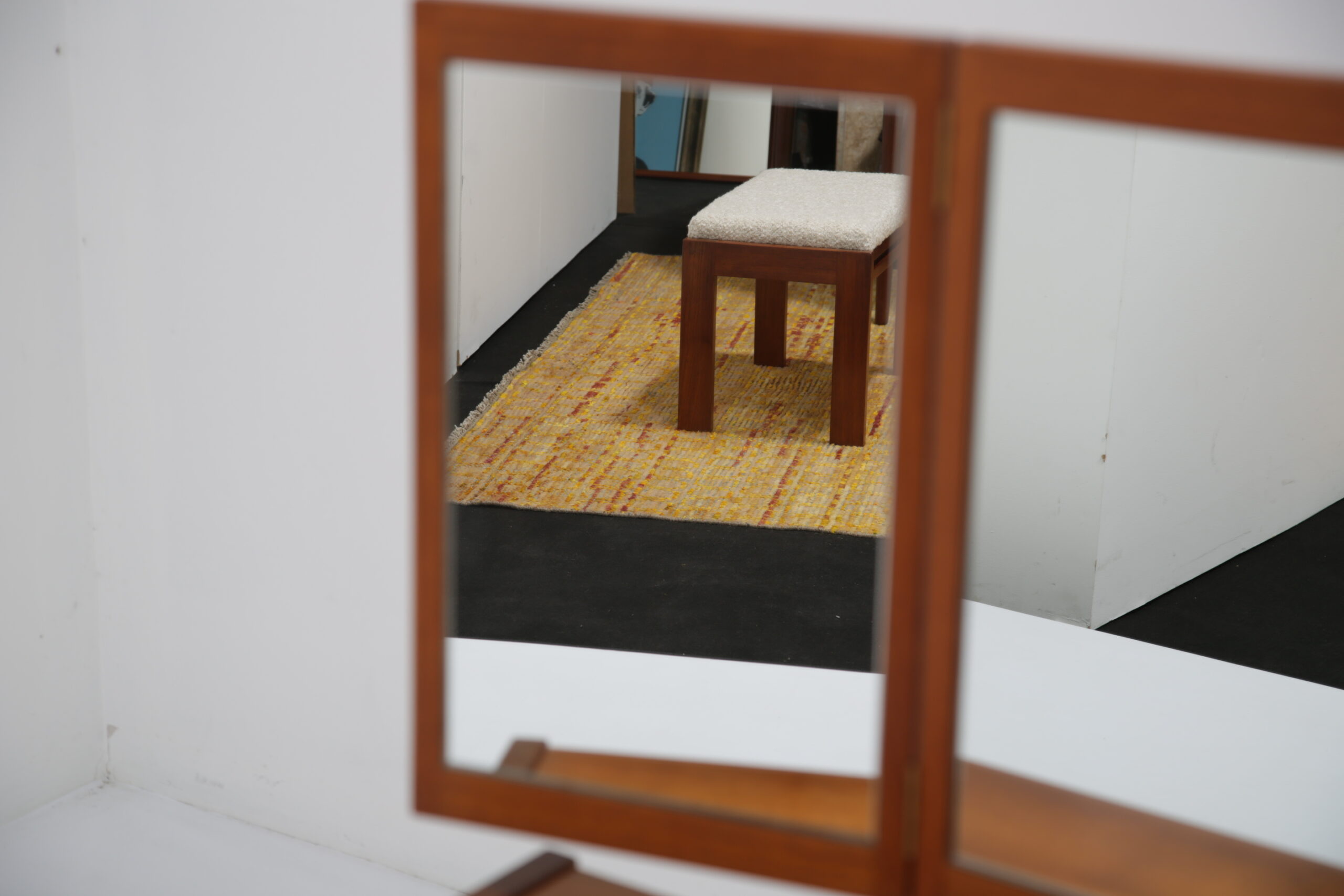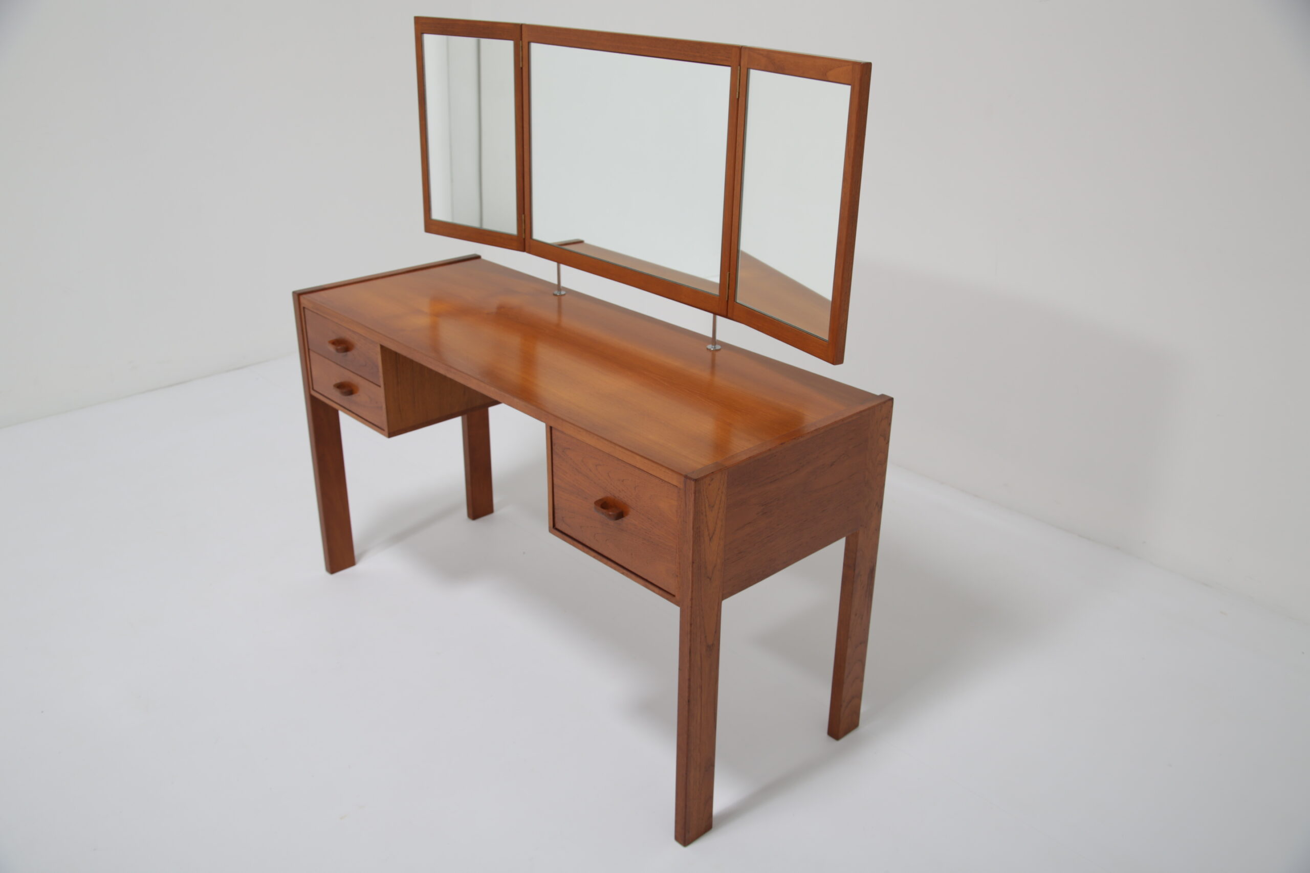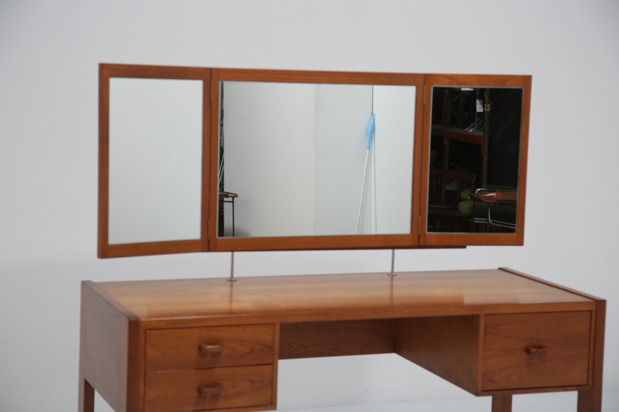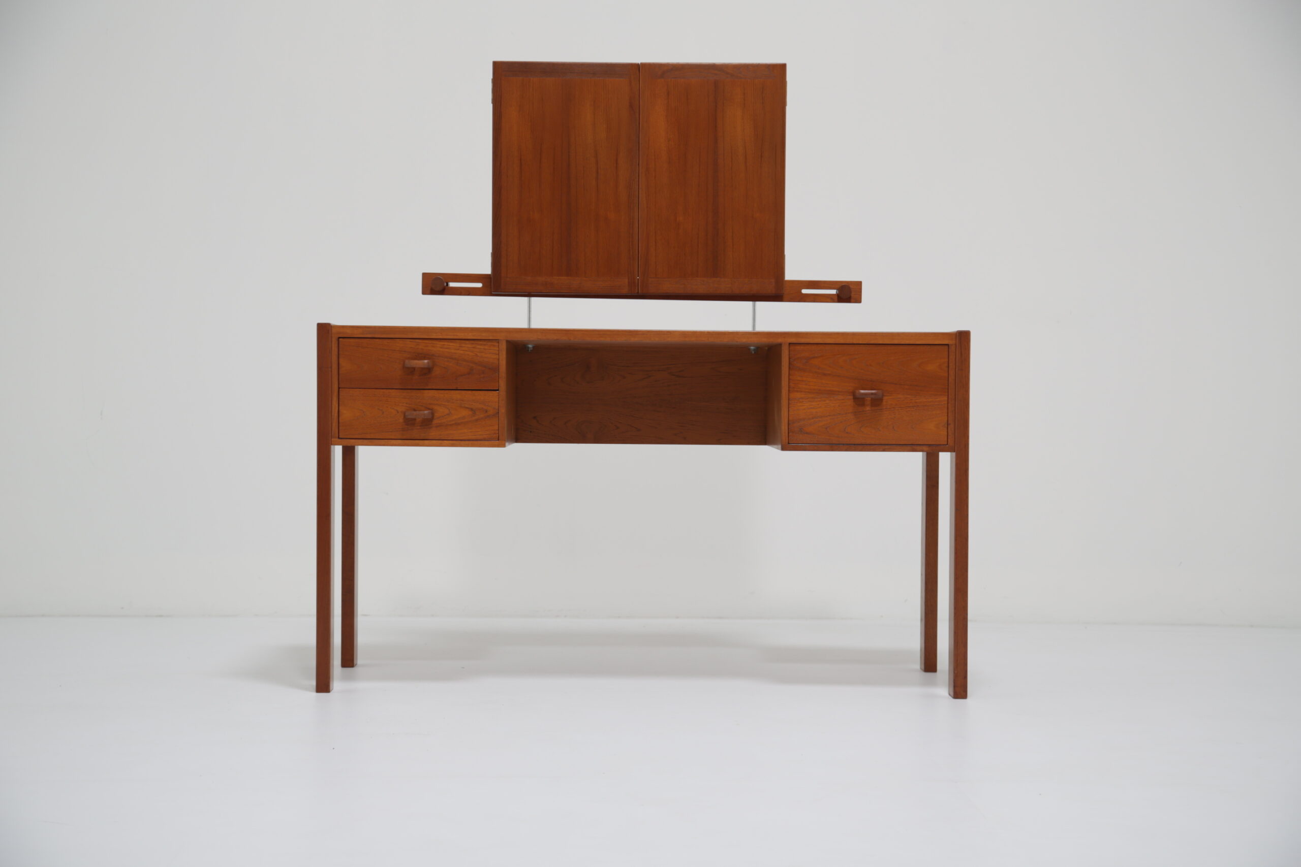 This beautifully crafted teak dressing table was designed by the Danish designer Aksel Kjersgaard and manufactured by Odder in the 1960s. The vanity features three drawers with a sturdy birch frame, dovetail joints, and elegant sculptural teak knobs. The striking tri-fold mirror appears to float, supported by slender aluminum rods. A clever design element allows the two teak cylinders on the vertical brace to slide along a track, letting you adjust the side mirrors to your preferred angle or close them when not in use. With its open, architectural feel, this piece is as functional as it is stylish—a true joy to use every day.