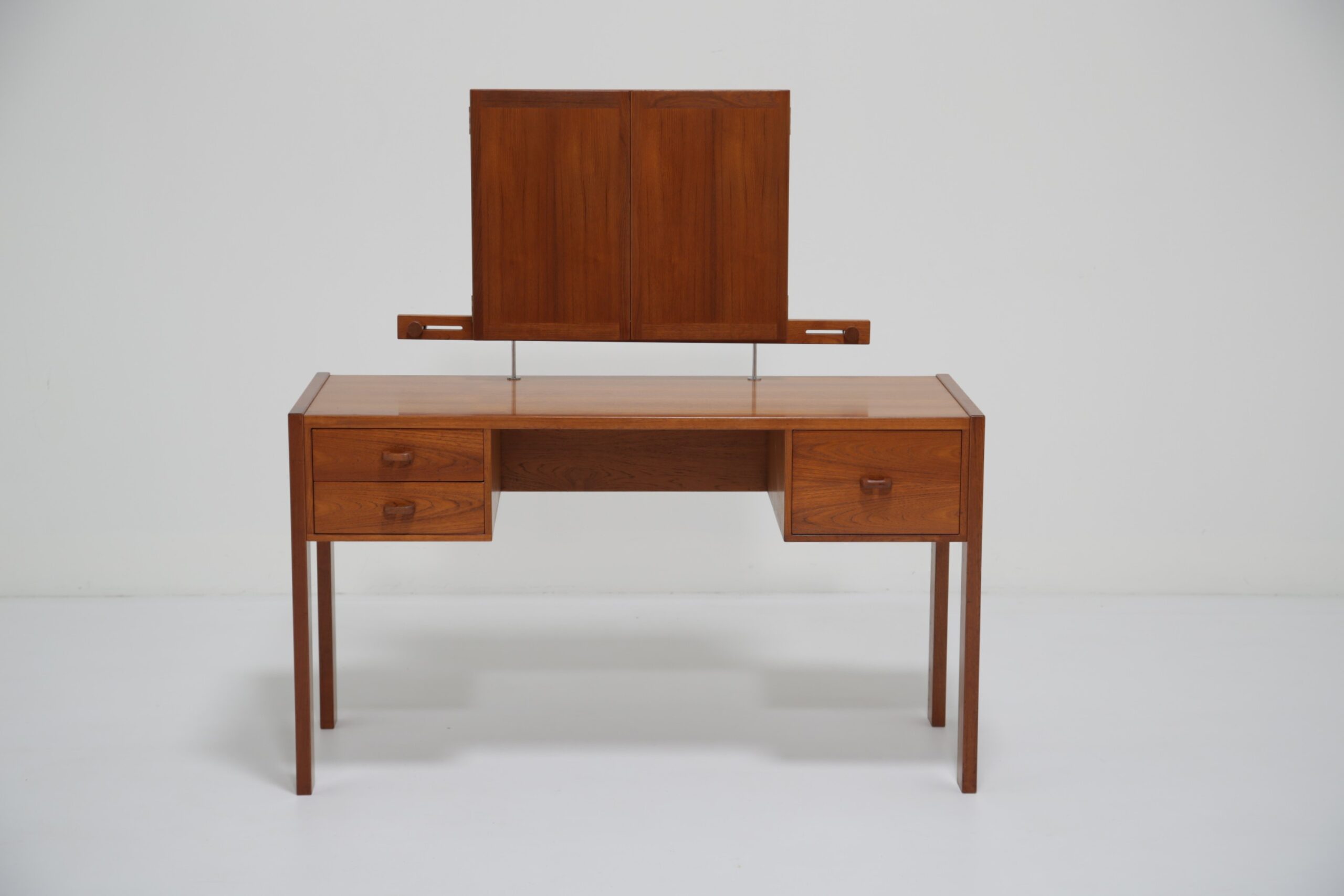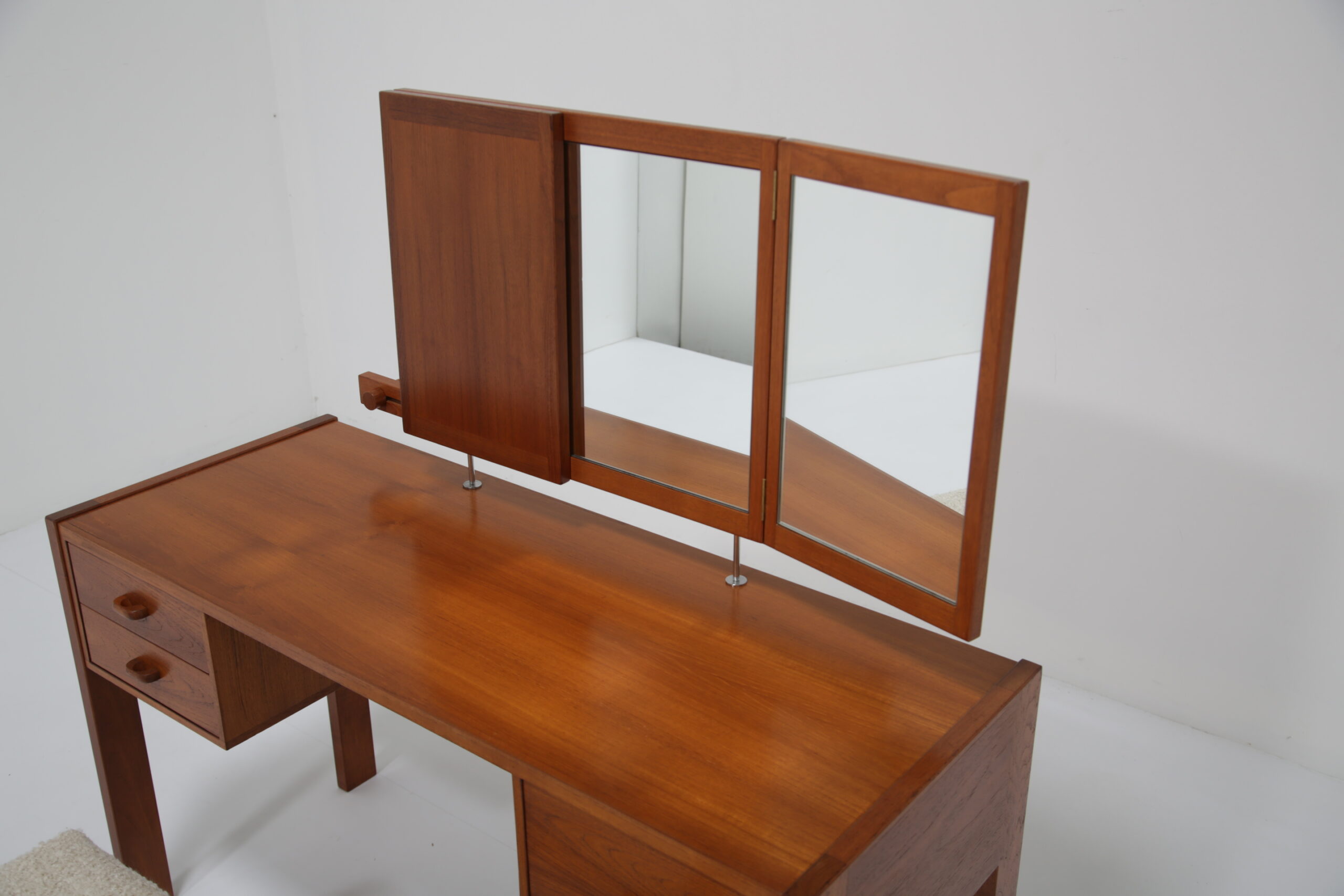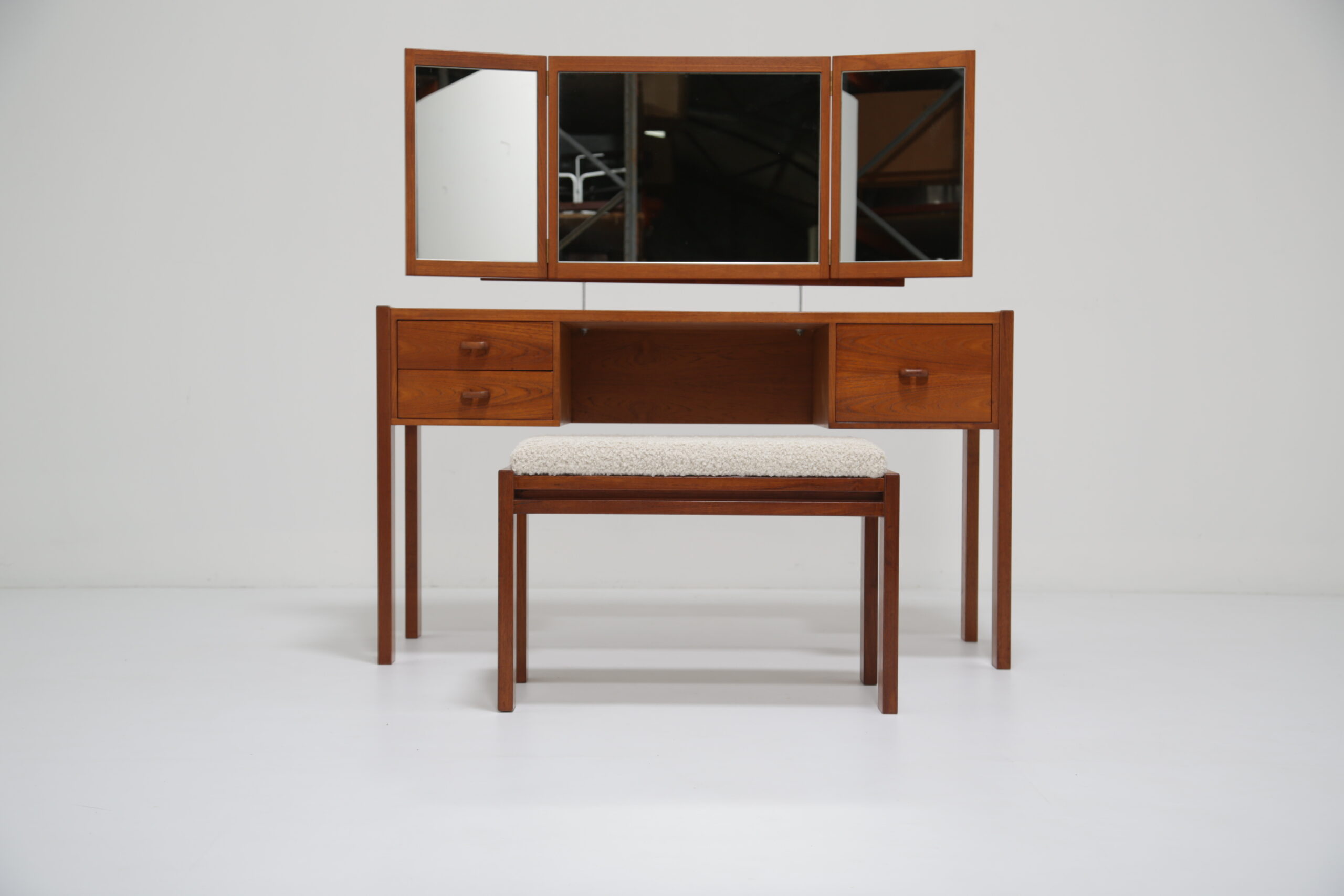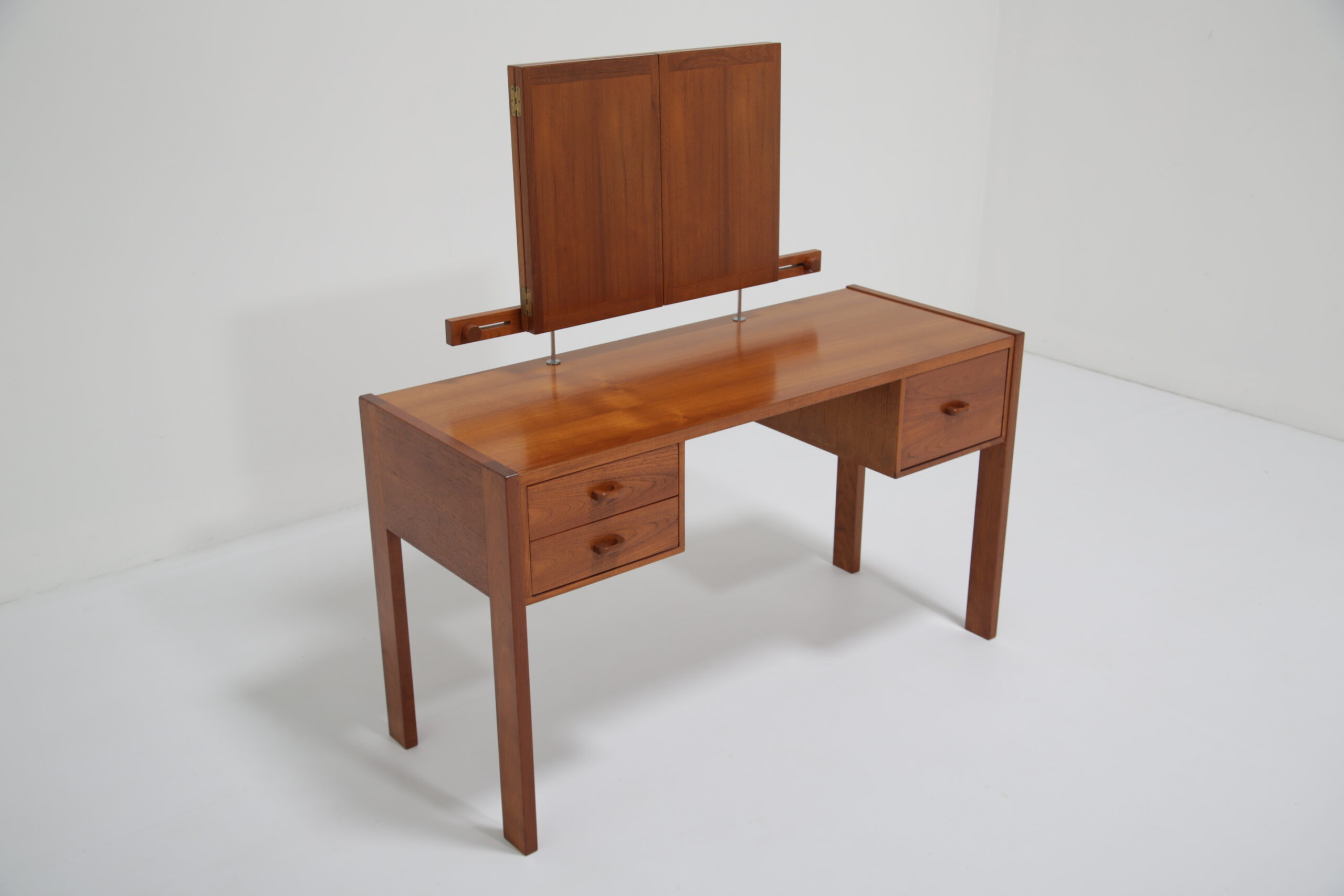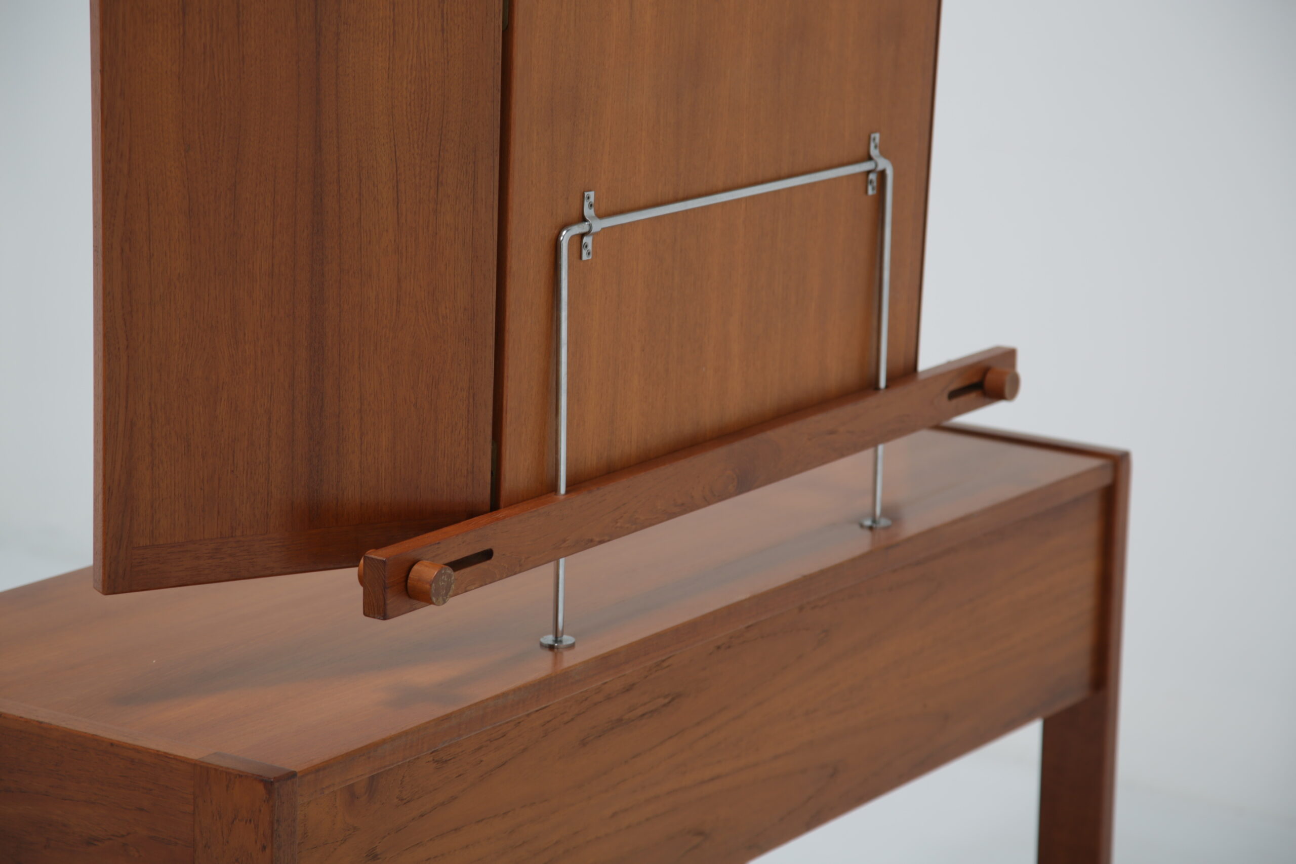 This beautifully crafted teak dressing table was designed by the Danish designer Aksel Kjersgaard and manufactured by Odder in the 1960s. The vanity features three drawers with a sturdy birch frame, dovetail joints, and elegant sculptural teak knobs. The striking tri-fold mirror appears to float, supported by slender aluminum rods. A clever design element allows the two teak cylinders on the vertical brace to slide along a track, letting you adjust the side mirrors to your preferred angle or close them when not in use. With its open, architectural feel, this piece is as functional as it is stylish—a true joy to use every day.
