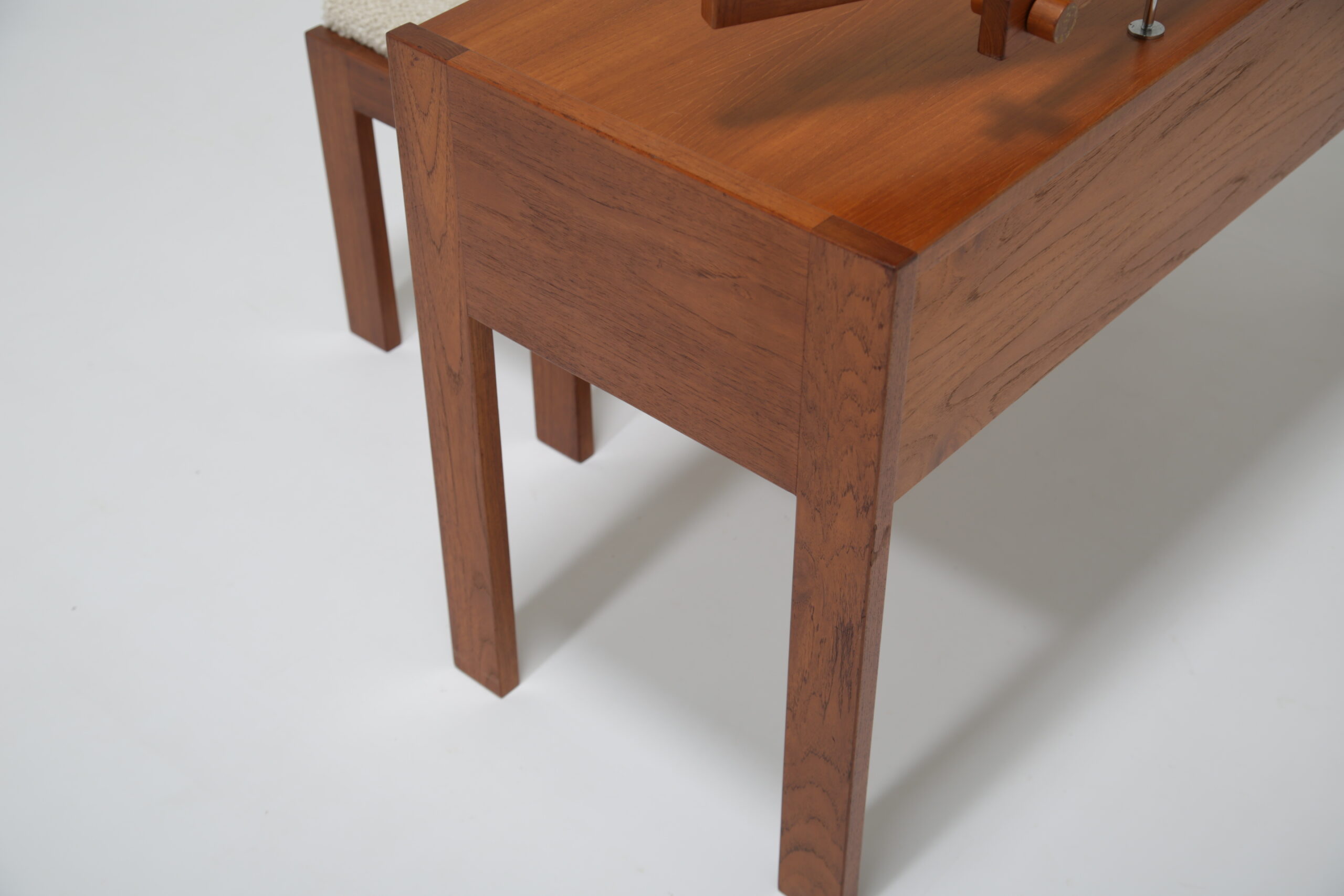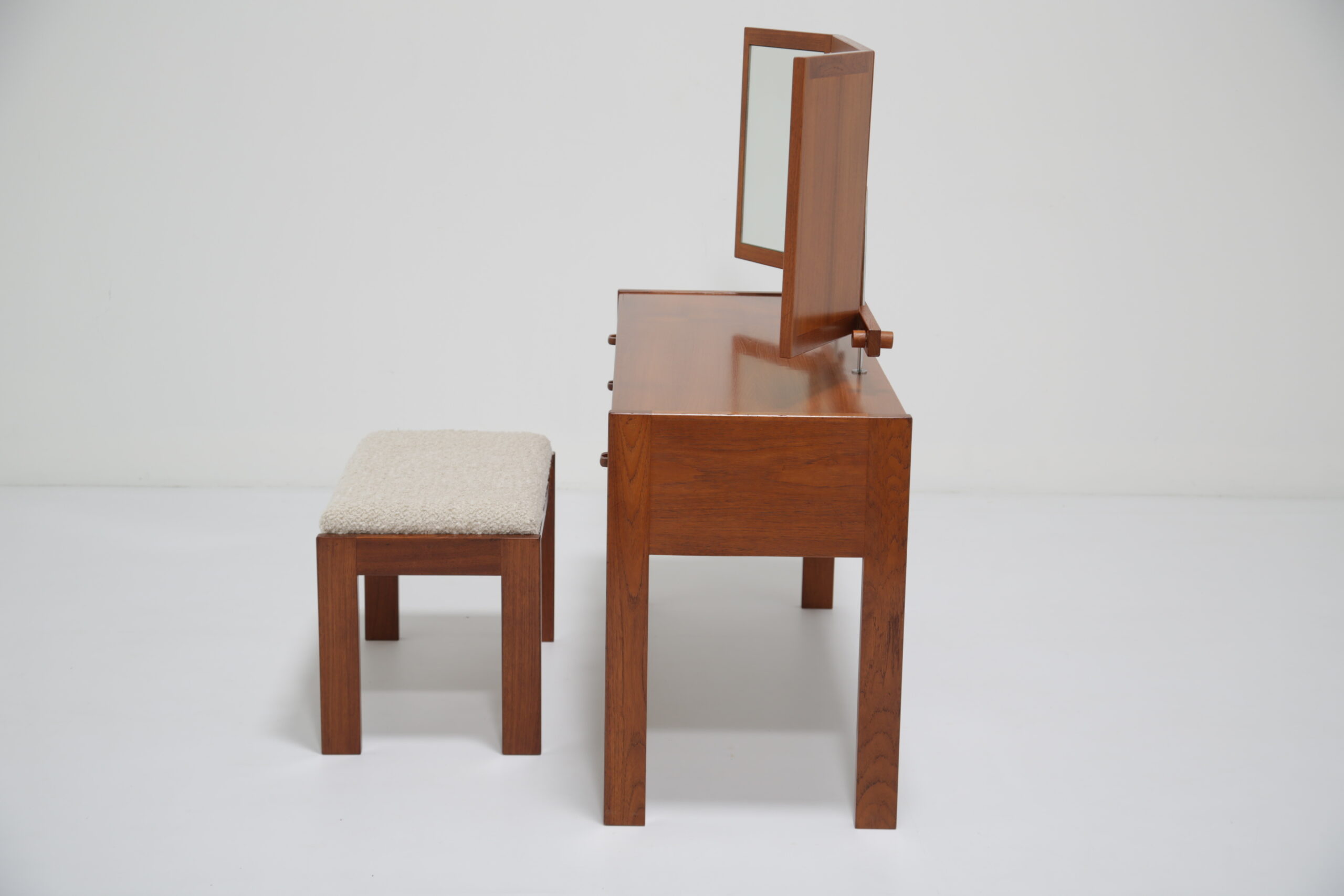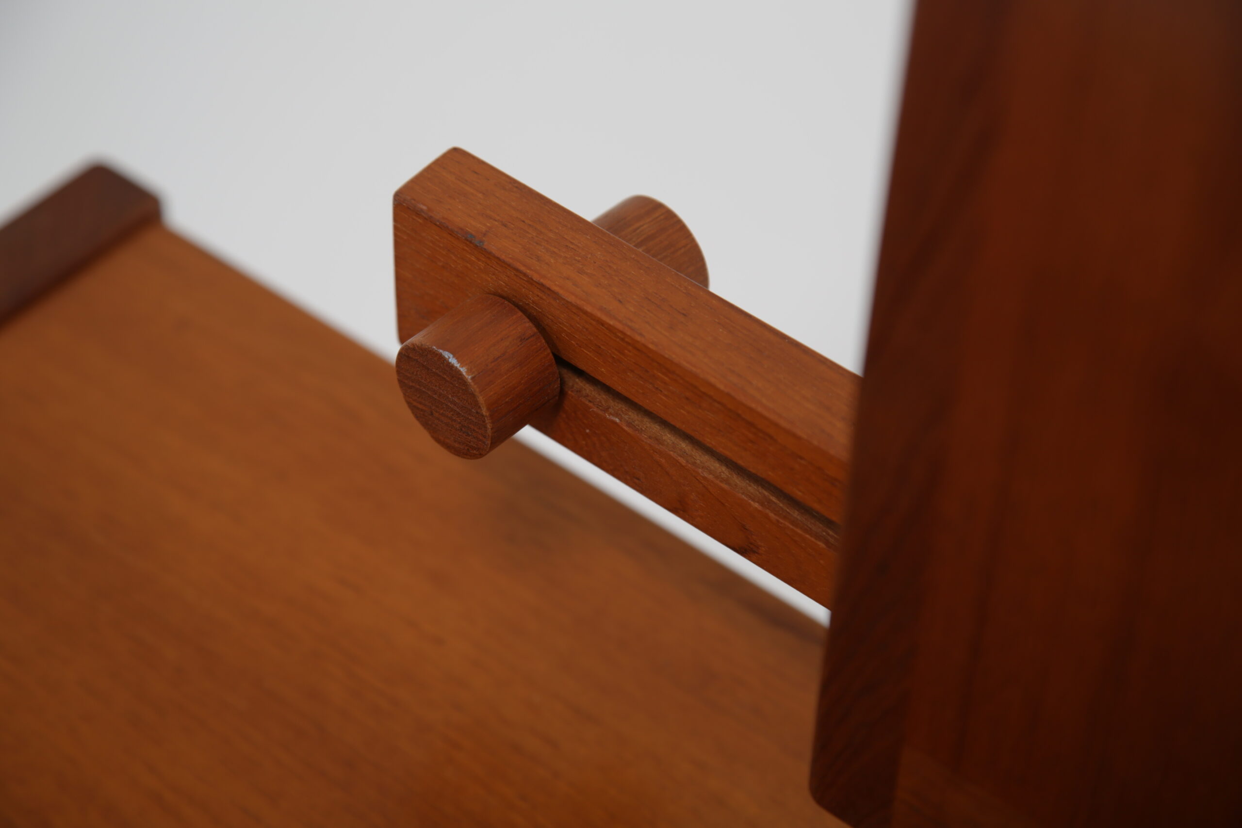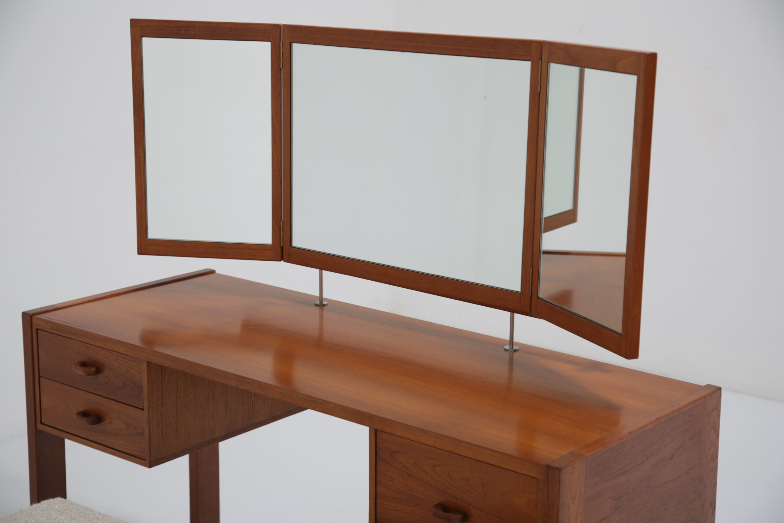 This beautifully crafted teak dressing table was designed by the Danish designer Aksel Kjersgaard and manufactured by Odder in the 1960s. The vanity features three drawers with a sturdy birch frame, dovetail joints, and elegant sculptural teak knobs. The striking tri-fold mirror appears to float, supported by slender aluminum rods. A clever design element allows the two teak cylinders on the vertical brace to slide along a track, letting you adjust the side mirrors to your preferred angle or close them when not in use. With its open, architectural feel, this piece is as functional as it is stylish—a true joy to use every day.
