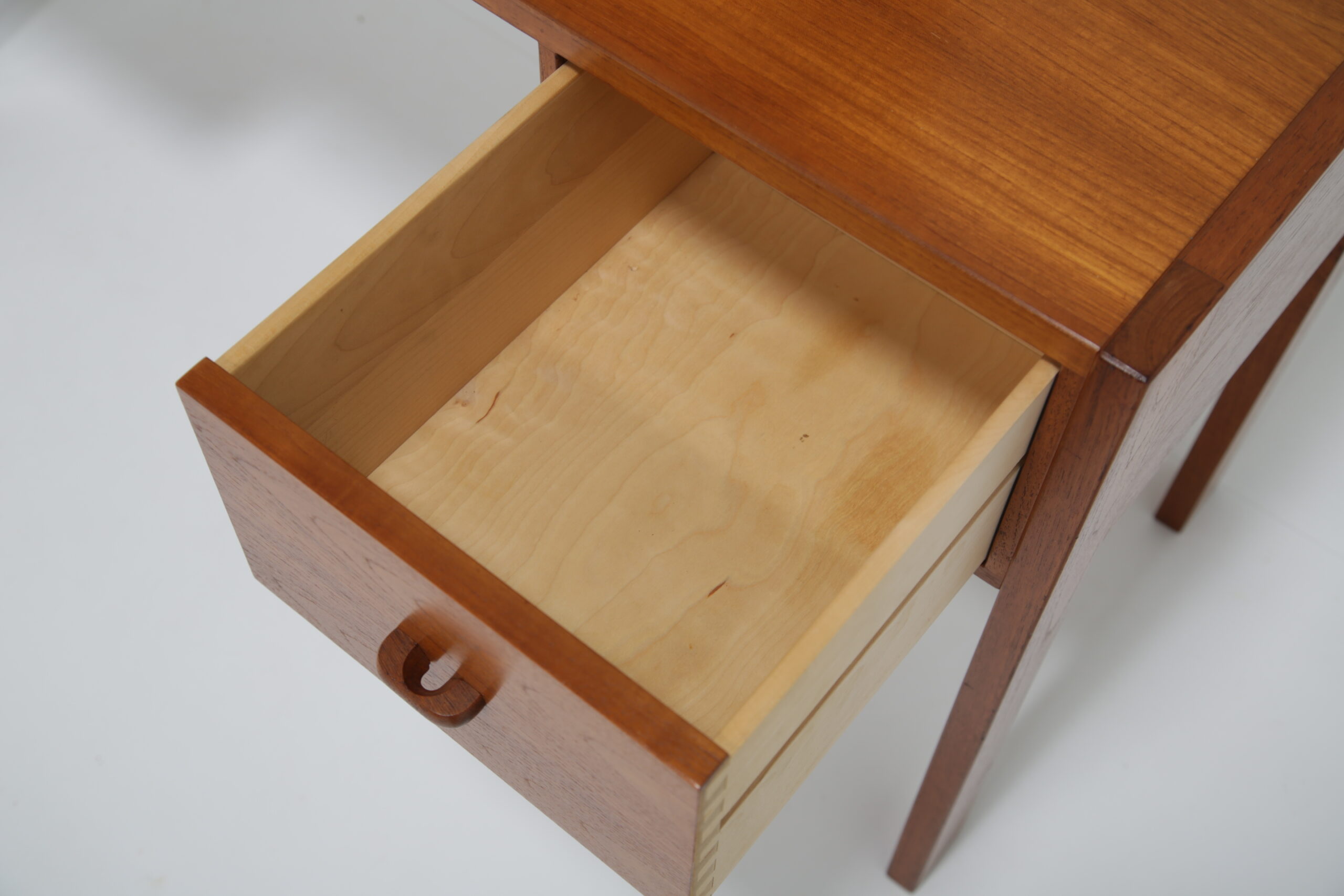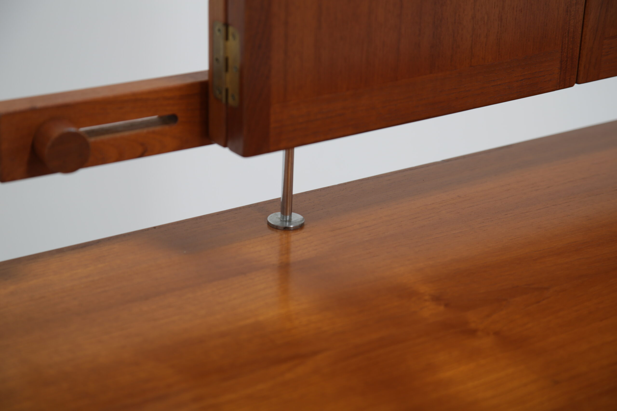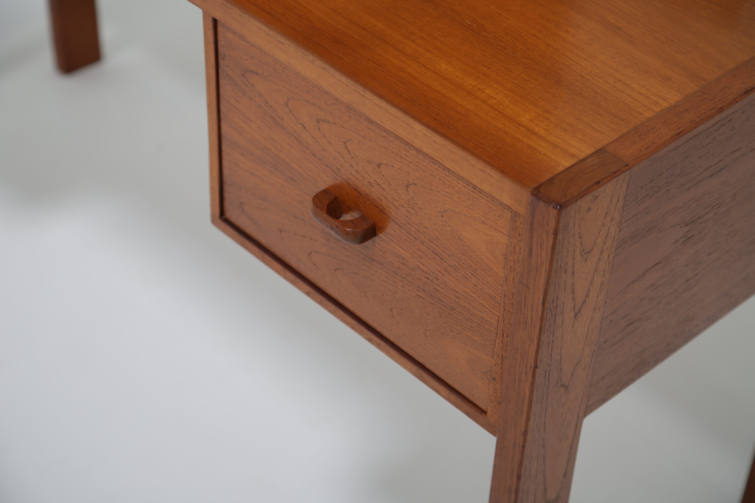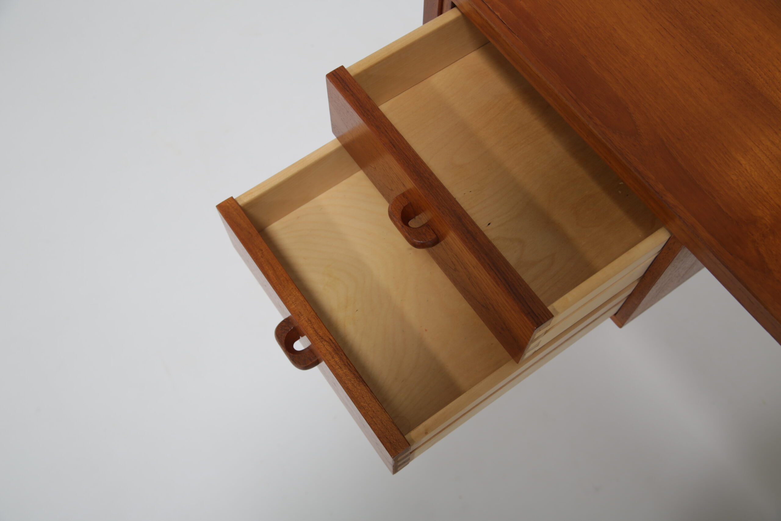 This beautifully crafted teak dressing table was designed by the Danish designer Aksel Kjersgaard and manufactured by Odder in the 1960s. The vanity features three drawers with a sturdy birch frame, dovetail joints, and elegant sculptural teak knobs. The striking tri-fold mirror appears to float, supported by slender aluminum rods. A clever design element allows the two teak cylinders on the vertical brace to slide along a track, letting you adjust the side mirrors to your preferred angle or close them when not in use. With its open, architectural feel, this piece is as functional as it is stylish—a true joy to use every day.