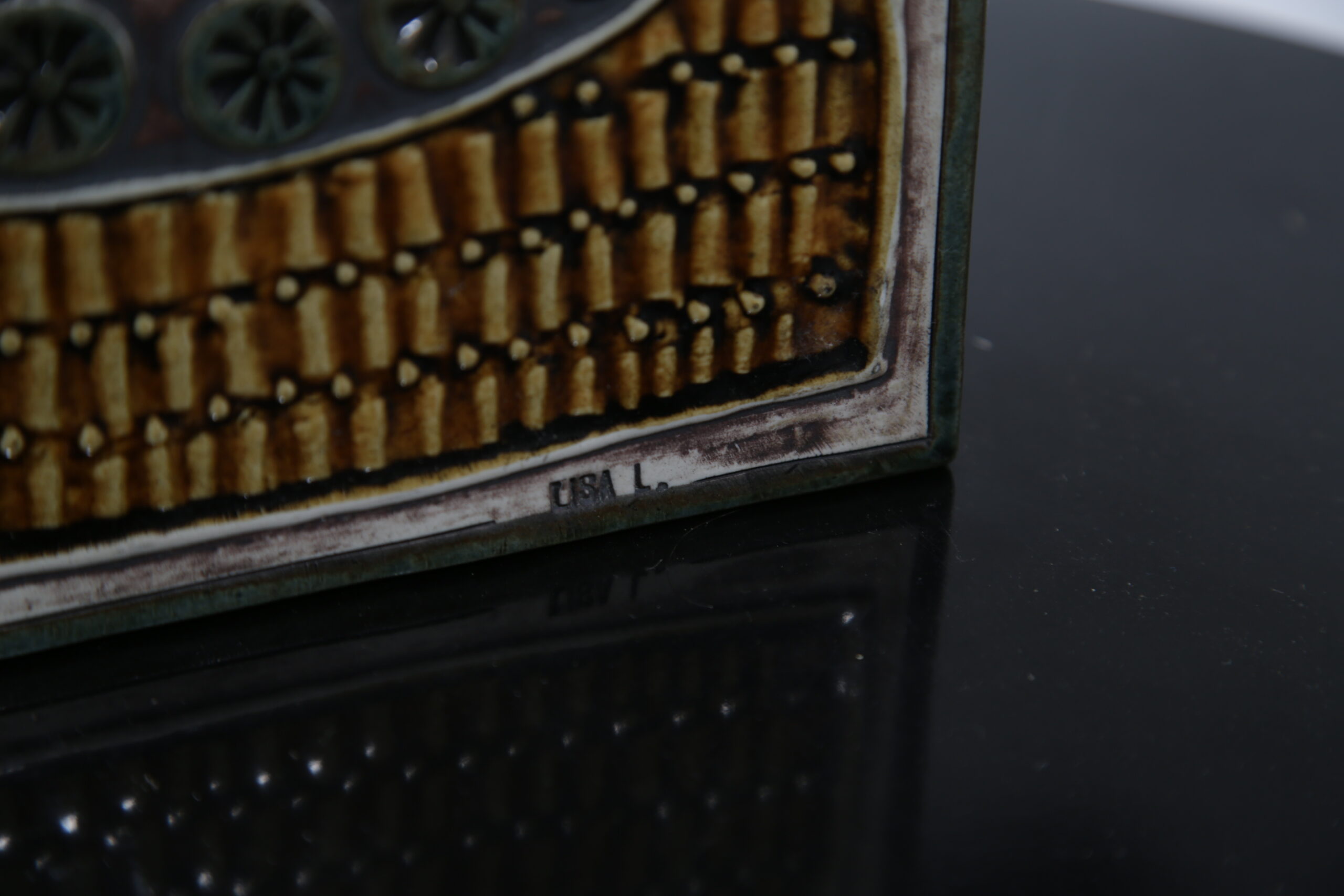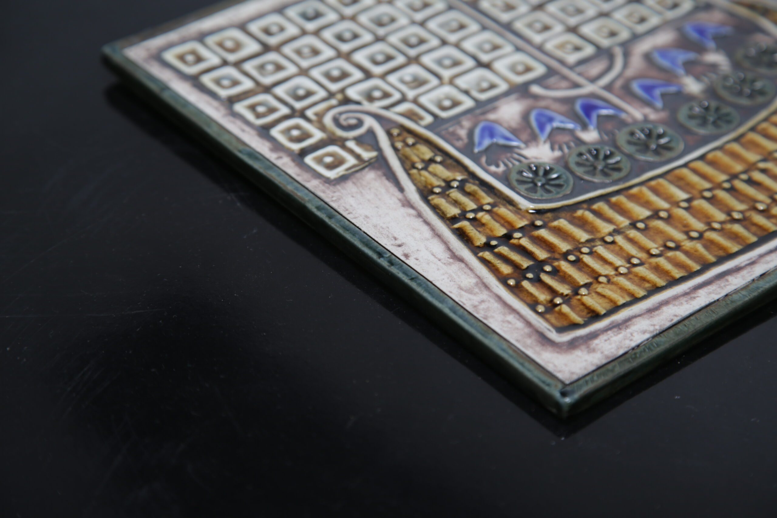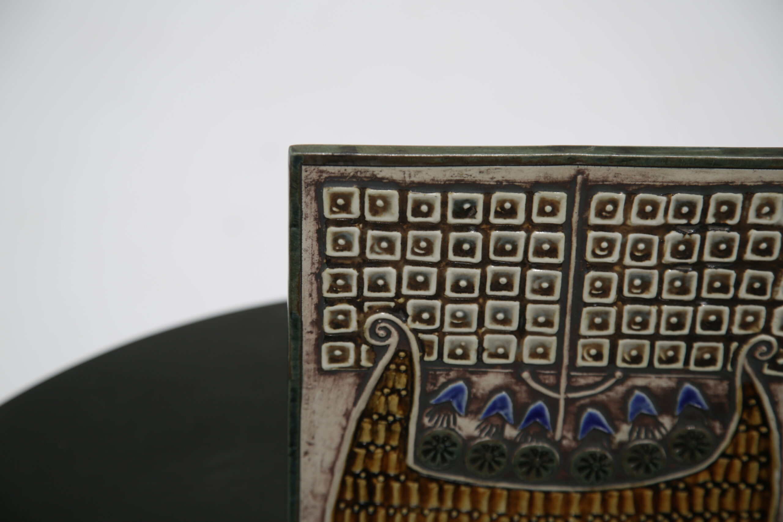 Loved and adored by collectors and admirers world-wide, renowned for her works of ceramic ornaments, sculptures and figurines, Lisa Larson is best known for her work with the famous Swedish ceramics company Gustavsberg. Her work is widely admired for its playful, whimsical style, often incorporating animal and human figures that exude warmth and charm. This wall hanging tile is no different, featuring a Viking ship with a group of Vikings with the sail set high.