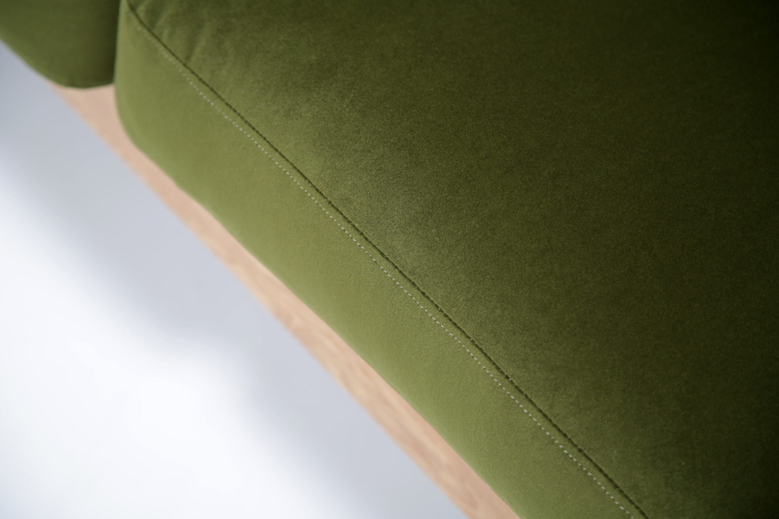 This piece has been meticulously restored by our in-house restoration team, bringing this piece back to it’s former glory or as we like to call it “factory standard”. The seat and back cushions has been freshly upholstered in a easy to maintain, durable polyester velvet which is child and pet friendly but also friendly to people with allergies. Each cushion has brand new foam and dacron and the sofa has a new lining and webbing, in theory making it a brand new piece on a vintage frame.