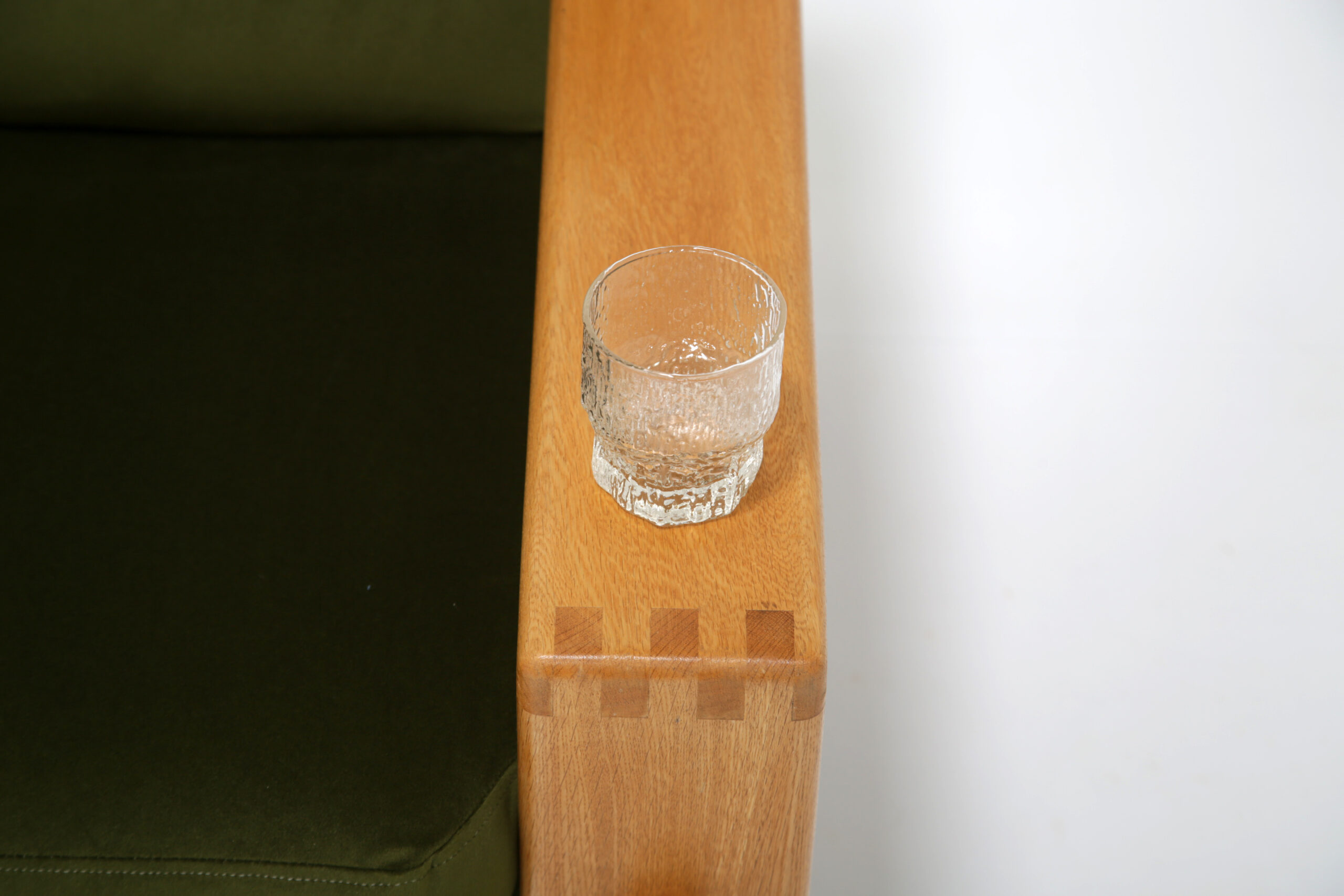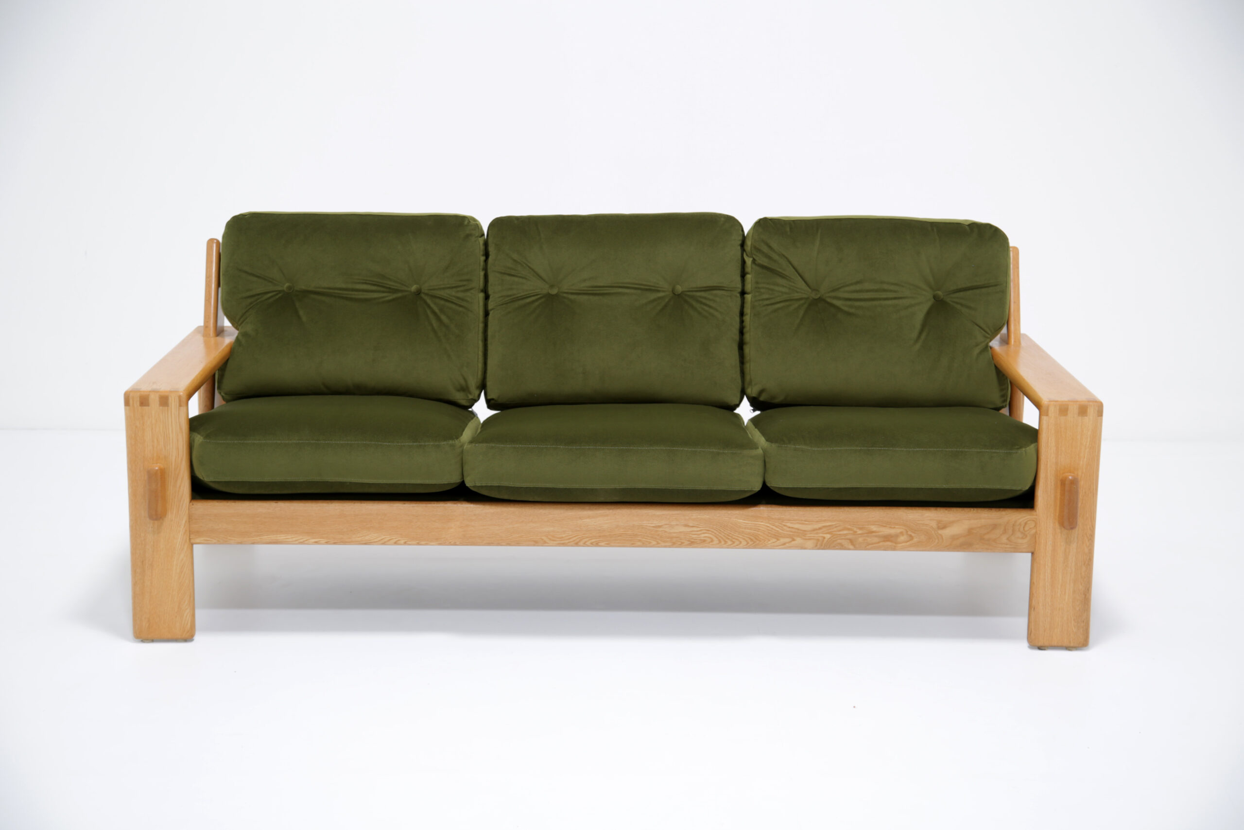 This gorgeous three seat sofa features a solid oak frame with wide plank arms, exposed joints and beautiful angled supports which protrudes on the front rectangular front legs, creating a unique but stunning minimalistic design.