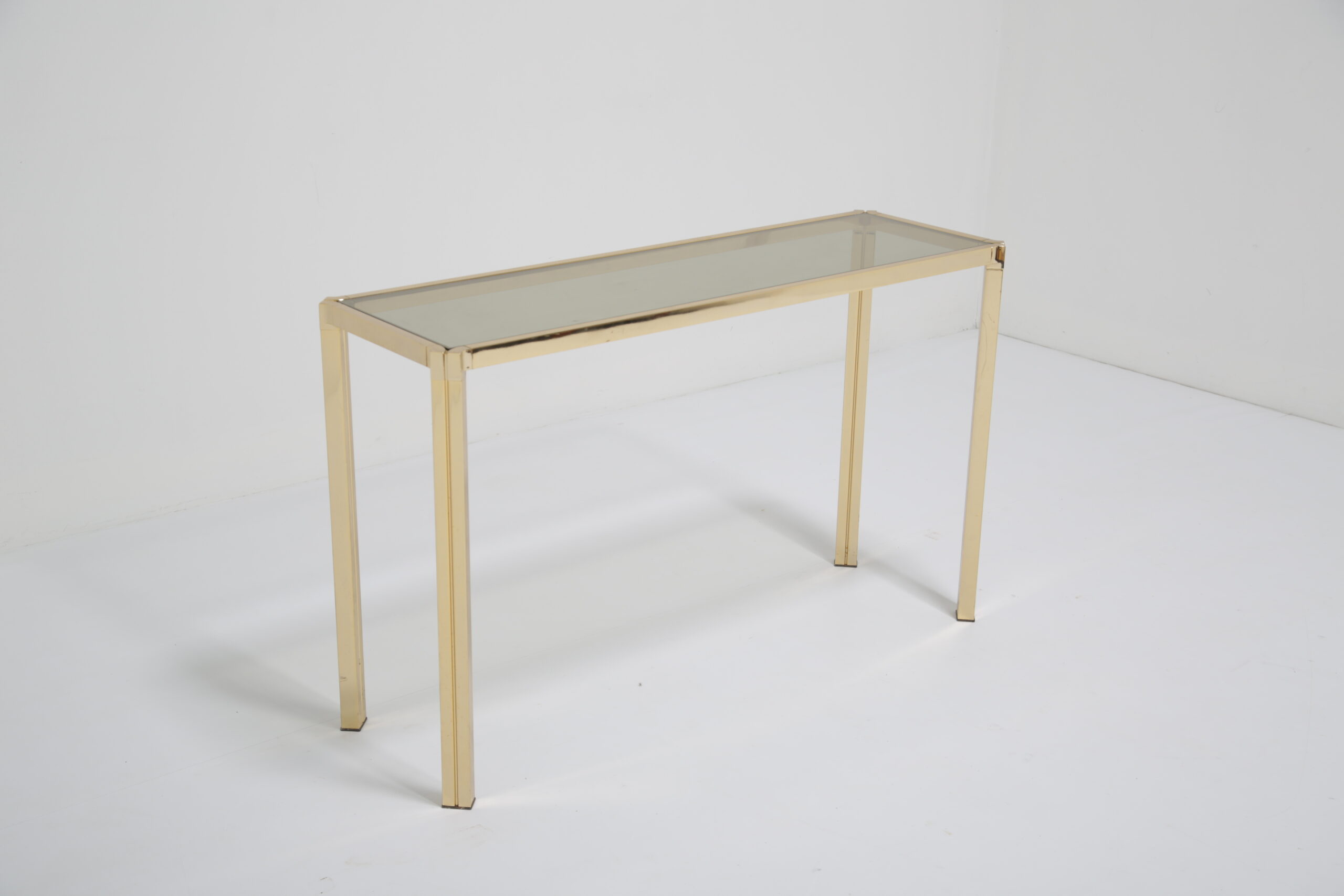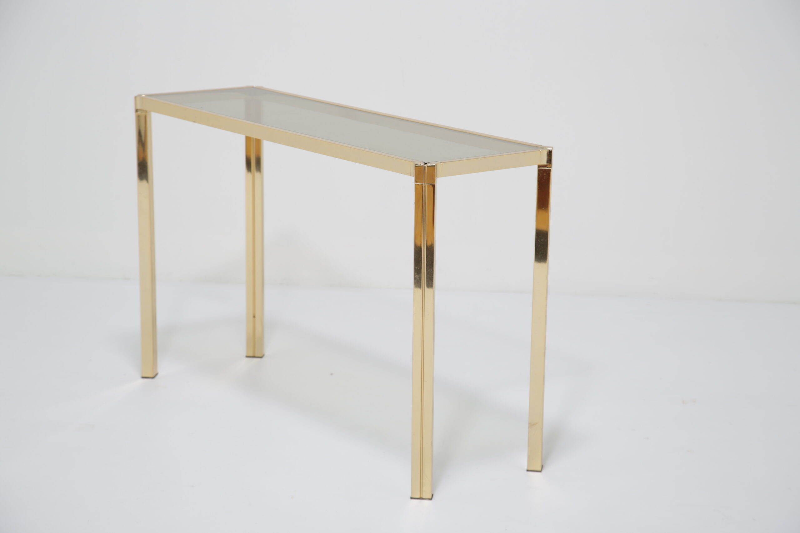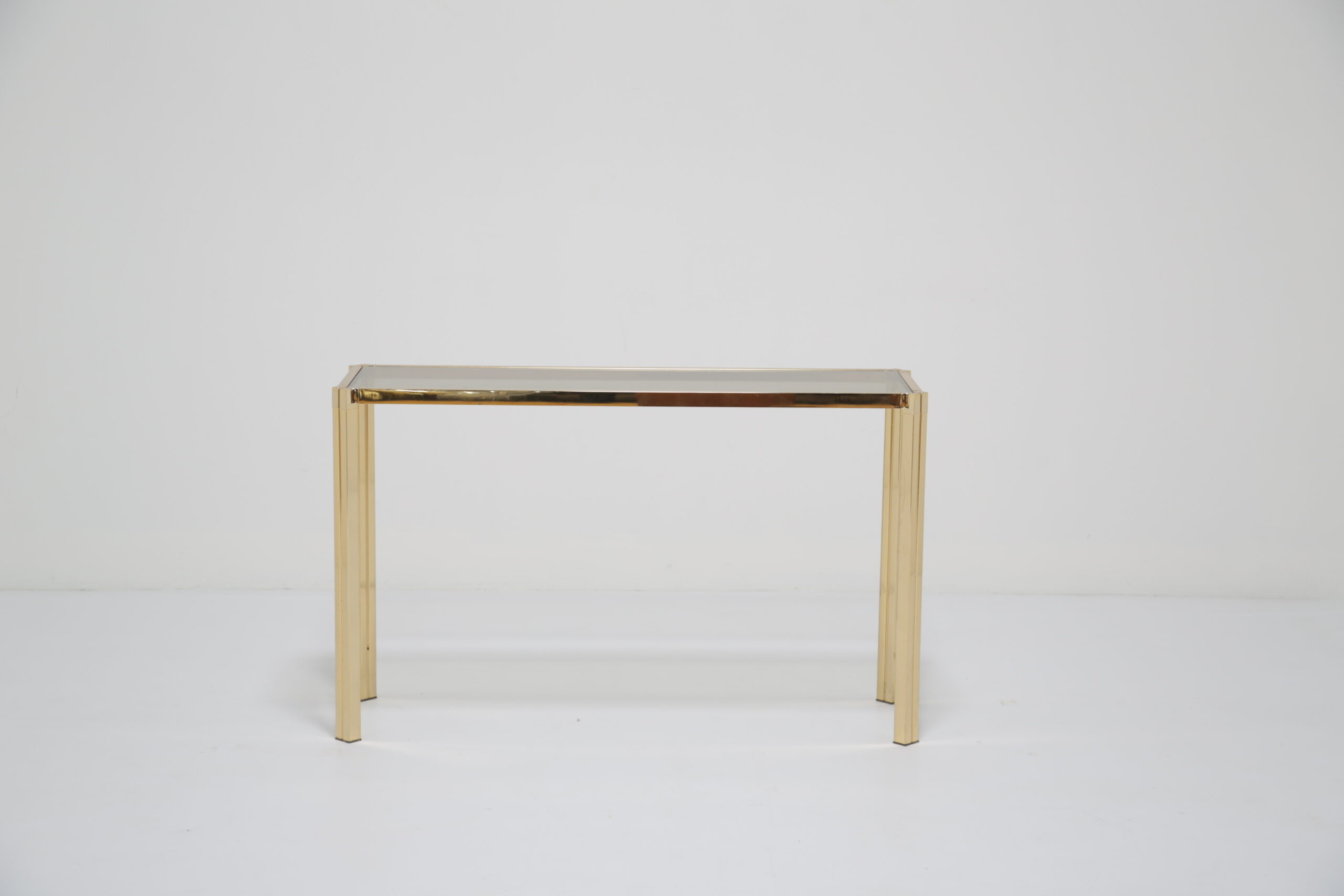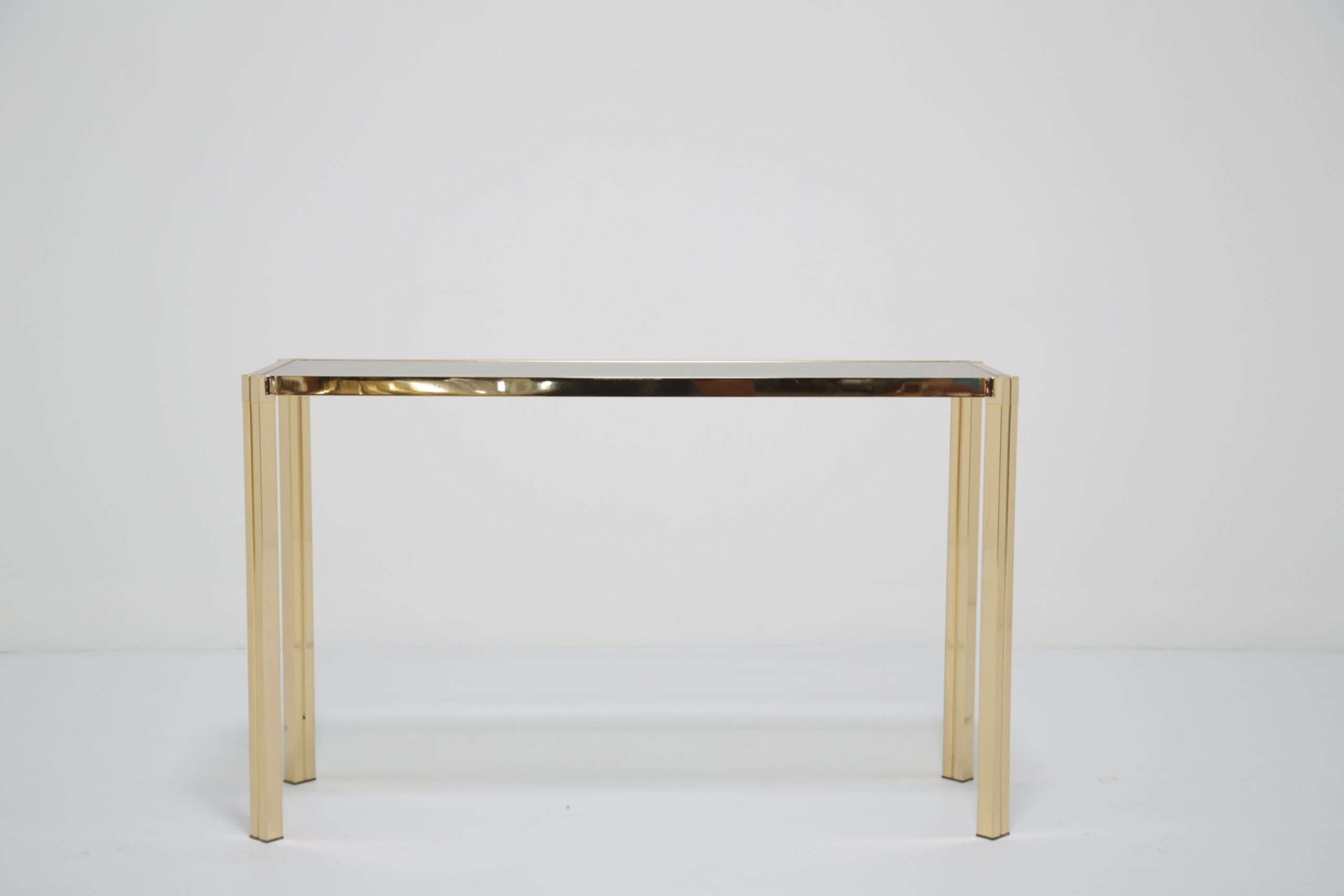 Just added to our extensive collection is this beautiful minimalist console table featuring a sleek modern profile with stepped out and angled legs. Manufactured in Italy, this console is brass plated and will suit a range of interiors and would be perfect in a hall or living room space.