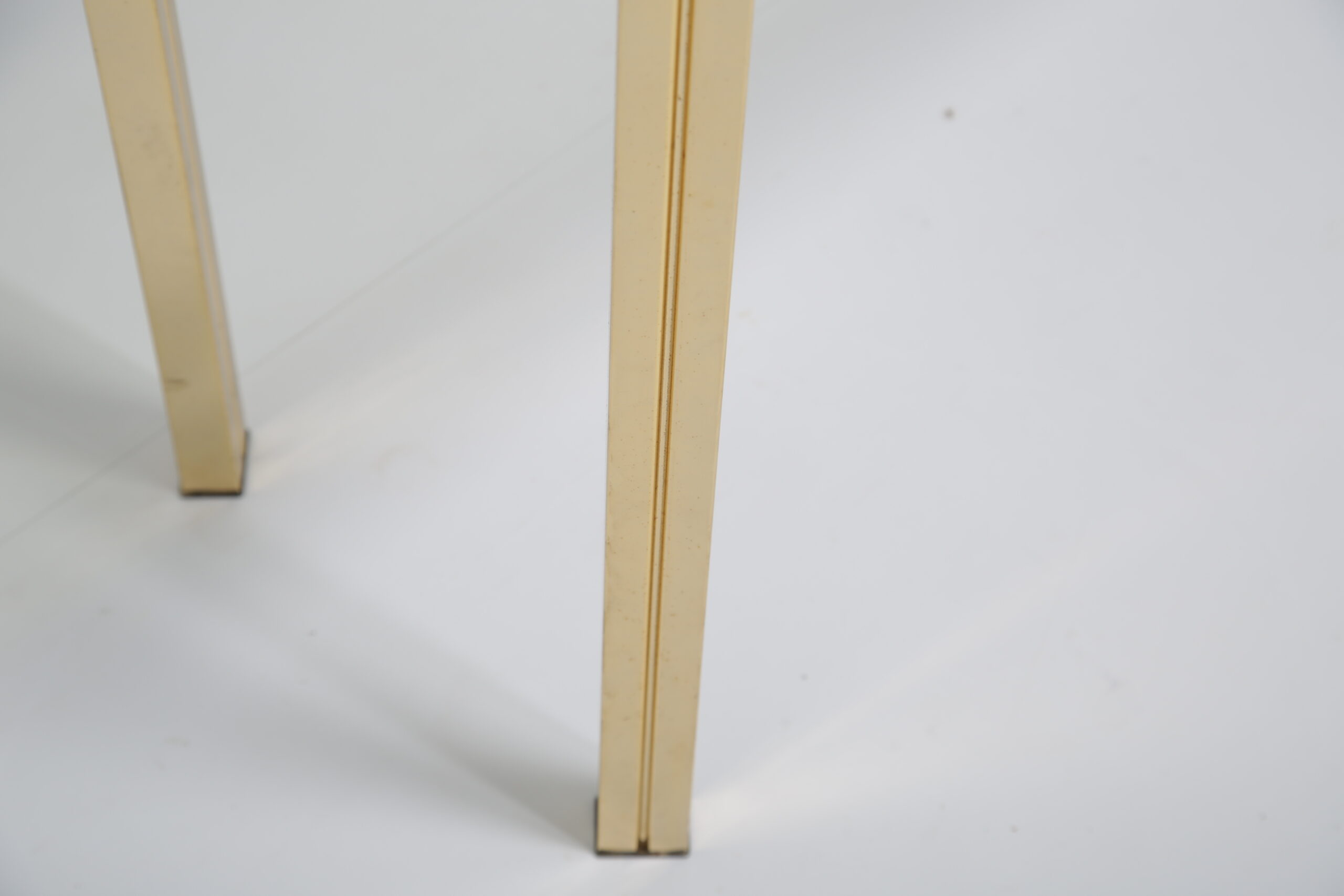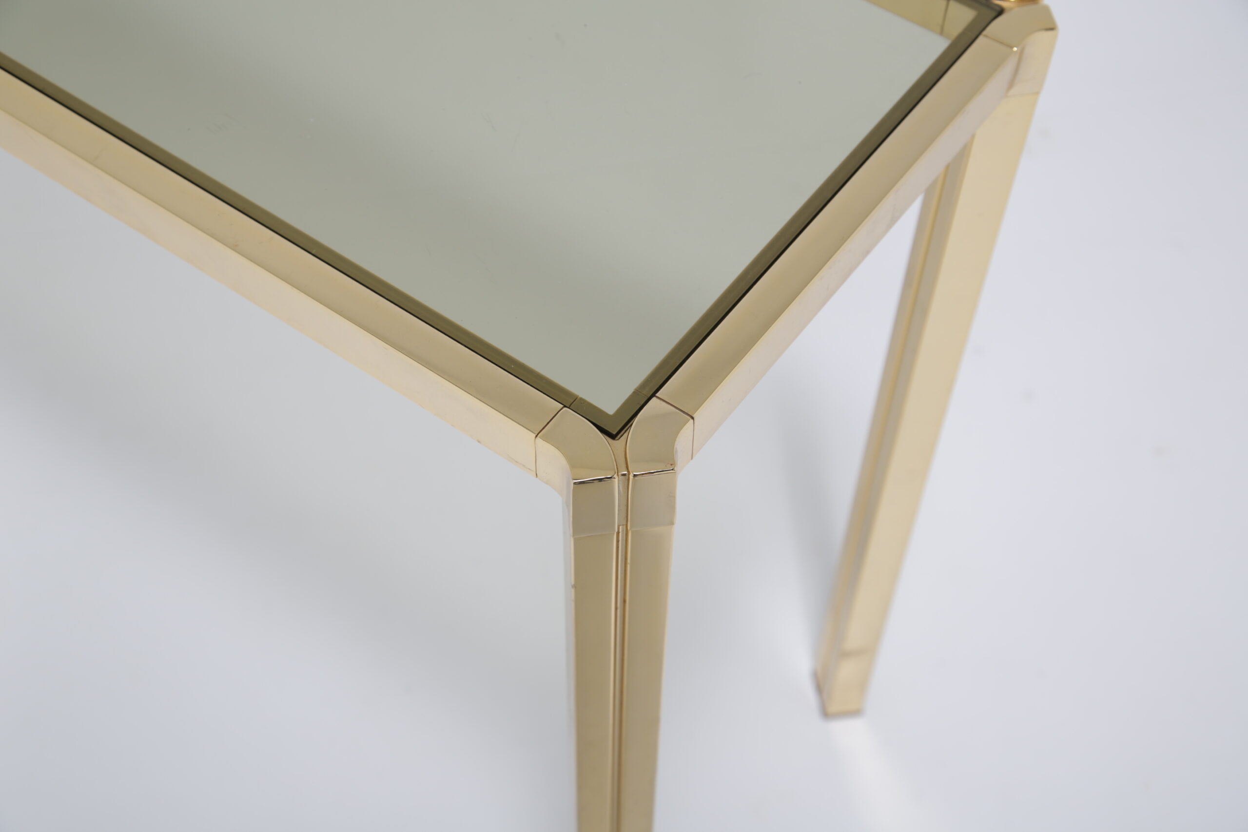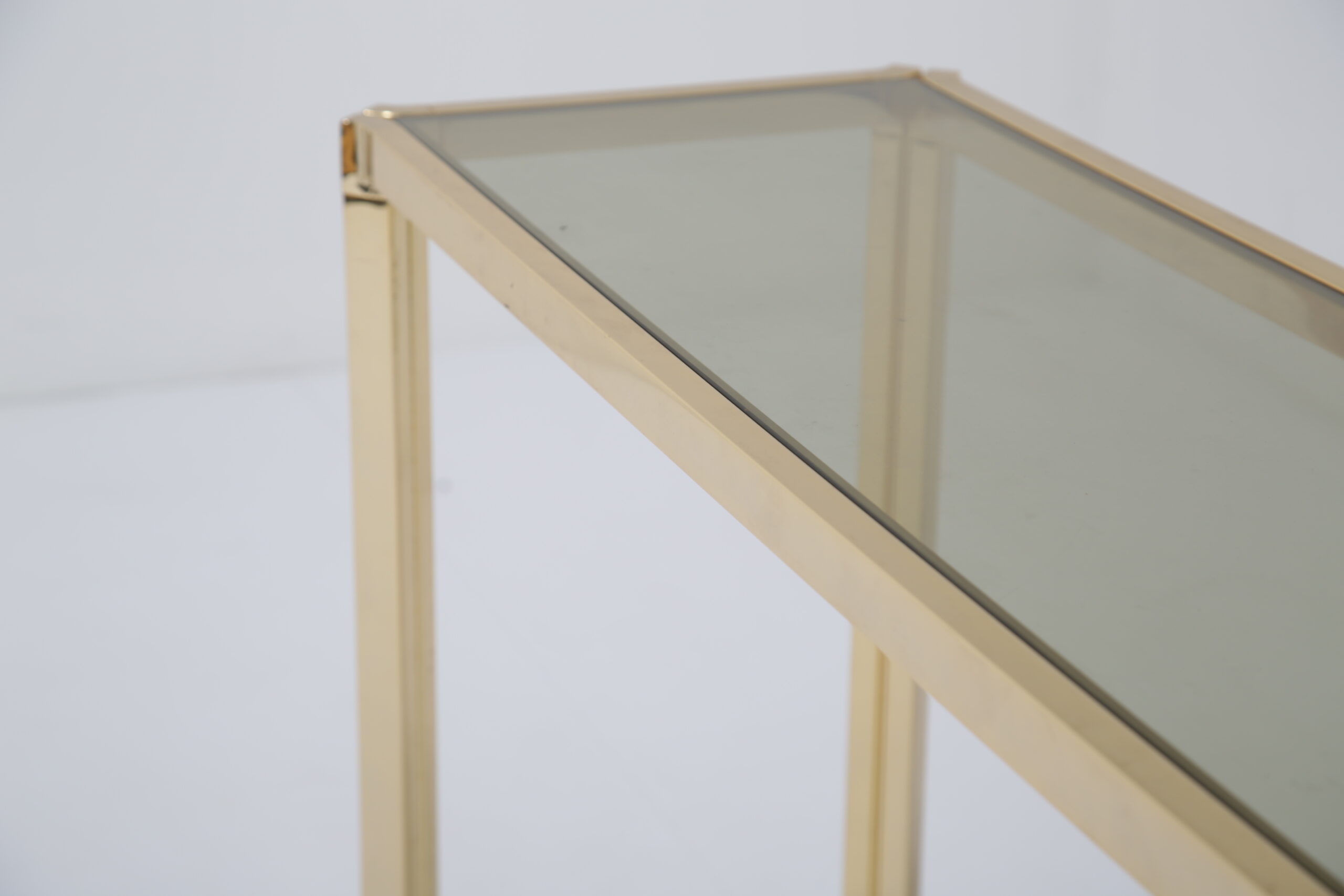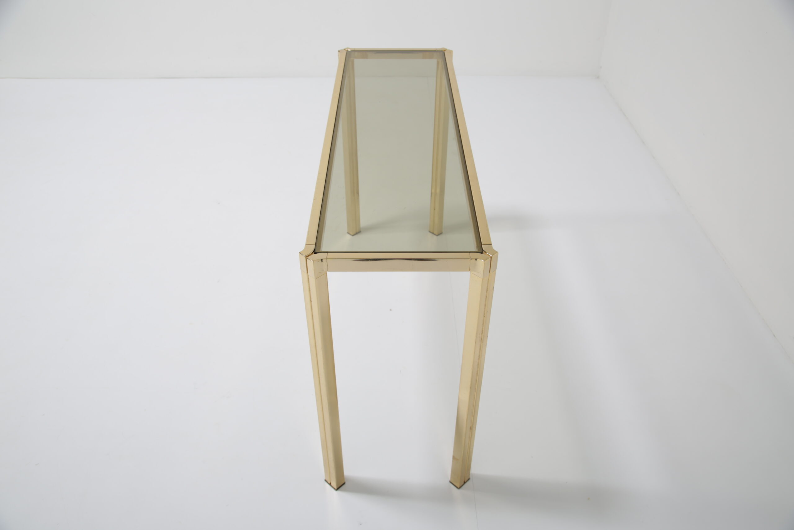 Just added to our extensive collection is this beautiful minimalist console table featuring a sleek modern profile with stepped out and angled legs. Manufactured in Italy, this console is brass plated and will suit a range of interiors and would be perfect in a hall or living room space.