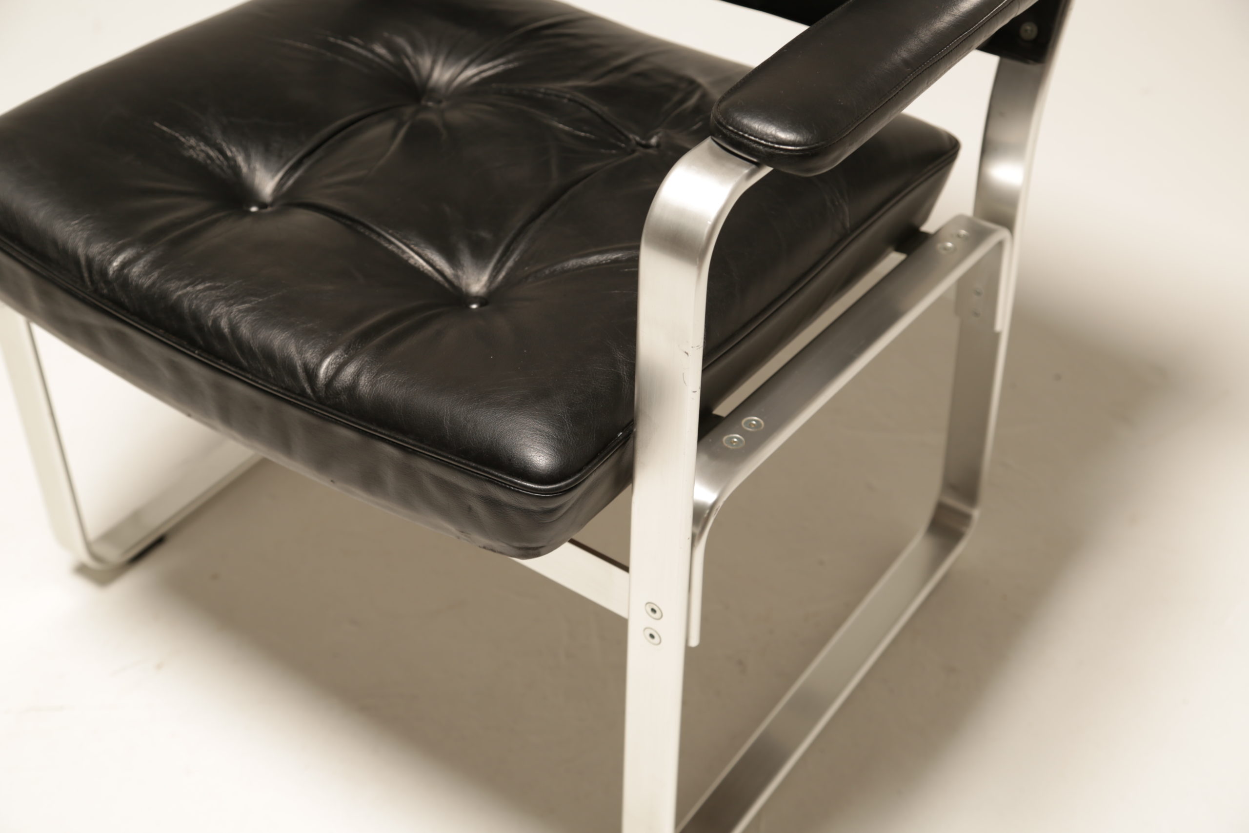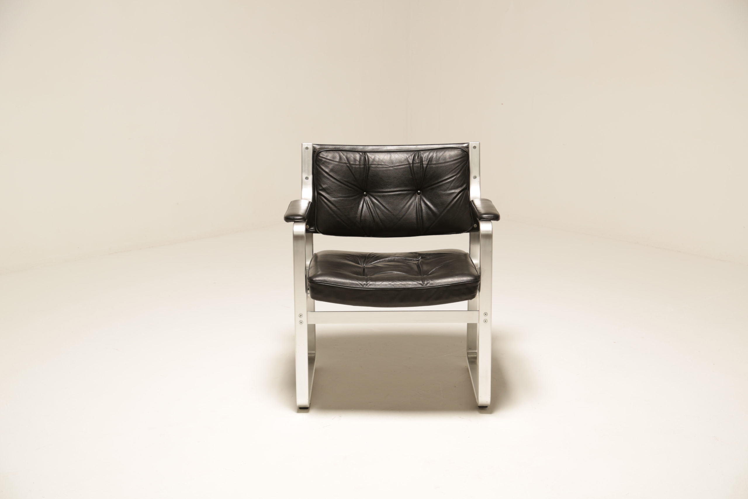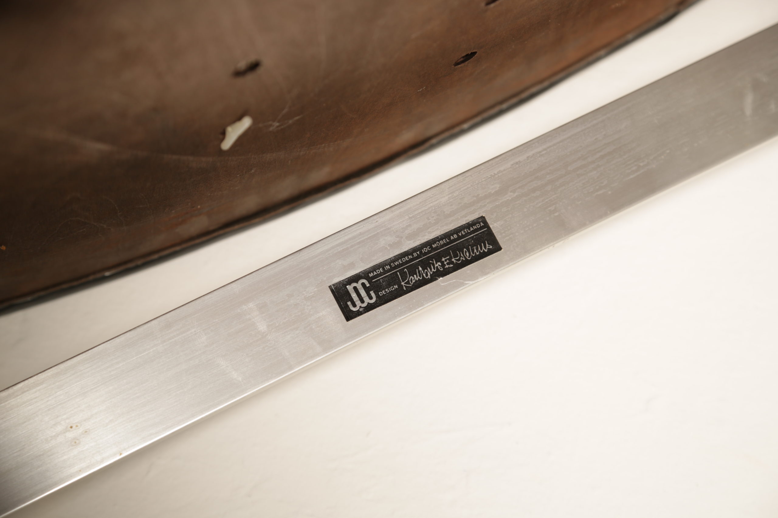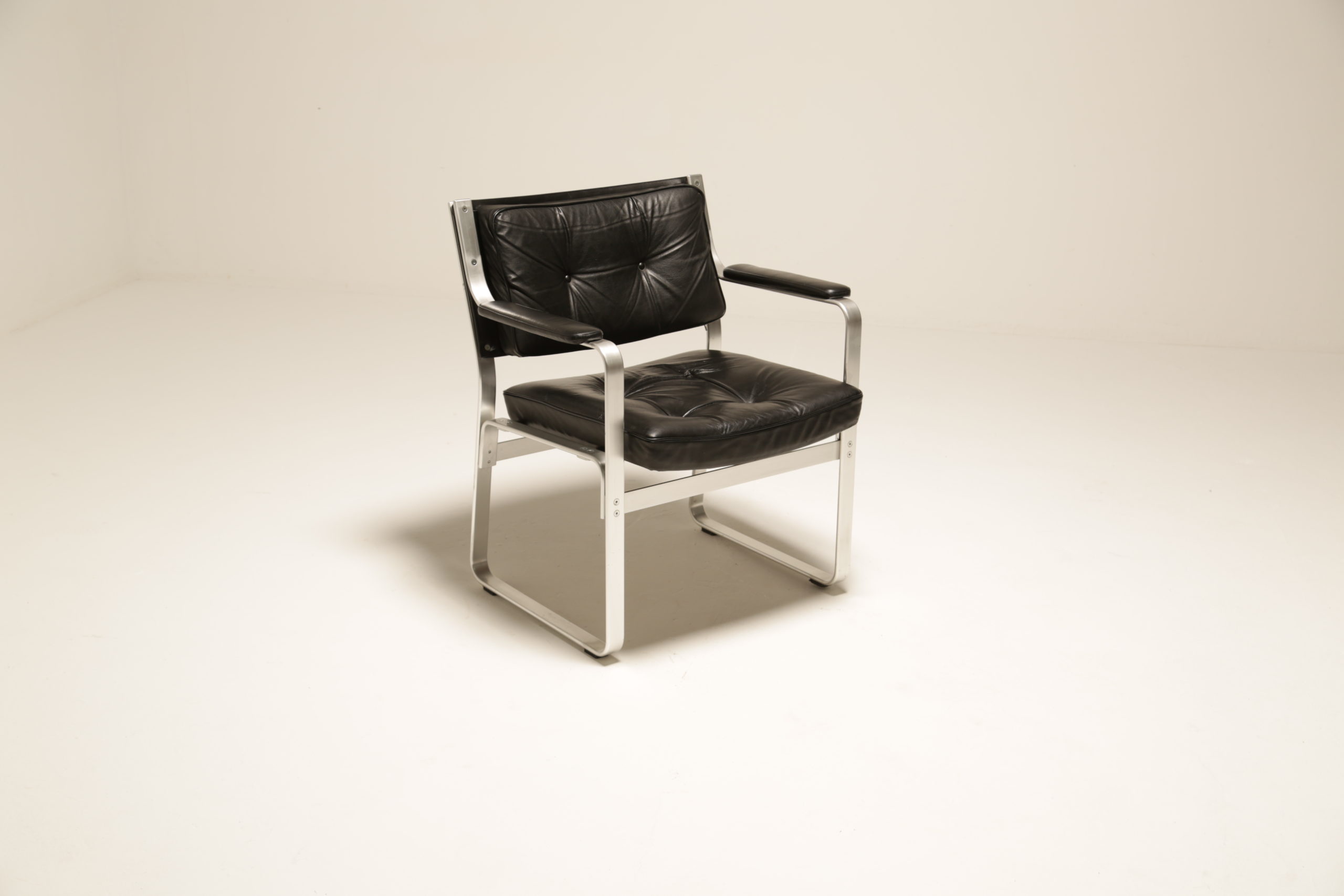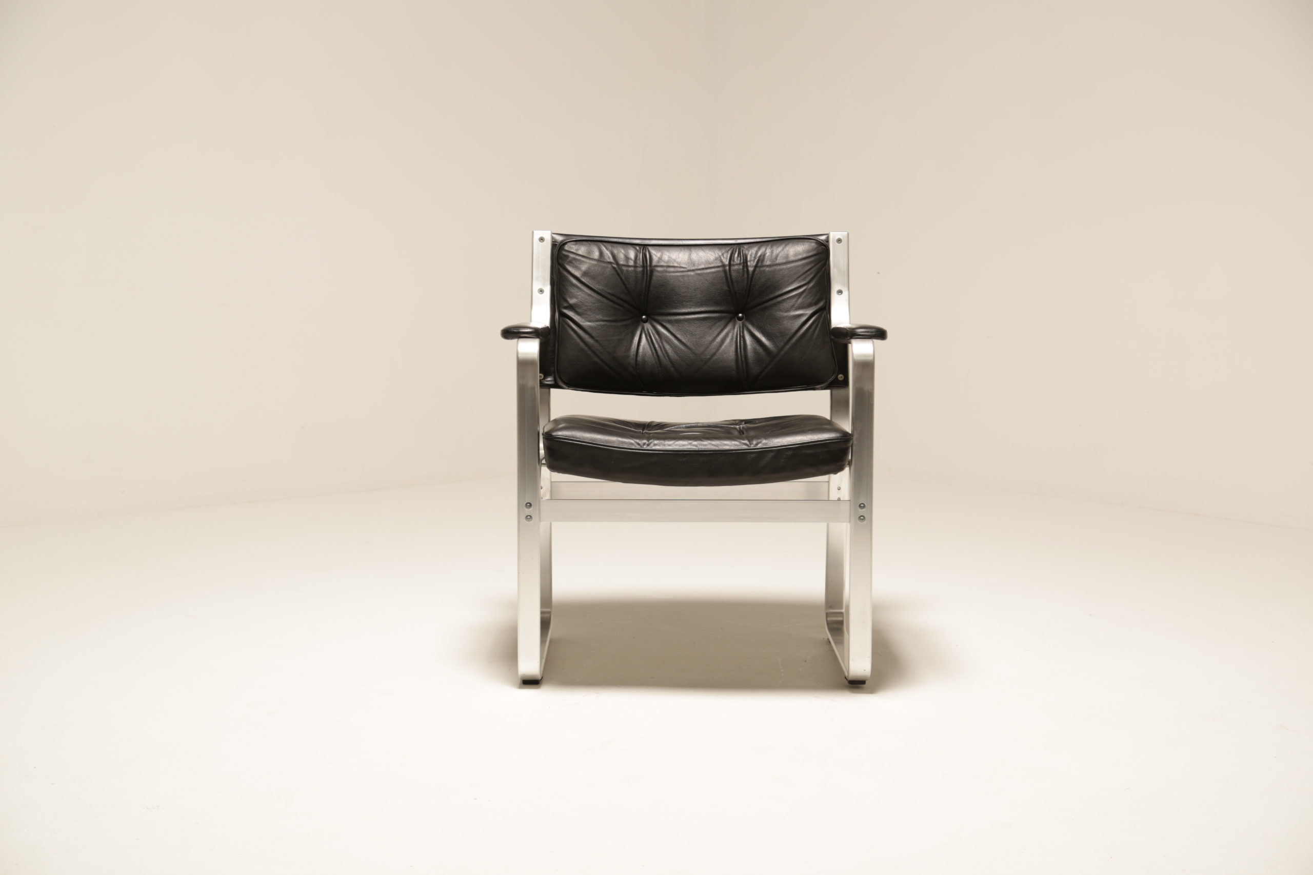 Super comfortable and stylish desk chair by Karl Ekselius for JOC Vetlanda, Sweden 1970s in black leather and robust aluminum frame. Suitable for a home or commercial office setting this stunning chair will not only have you sit comfortably but look stylish at the same time. We have used a leather balm to restore the color of the leather and applied a protection cream. Chair has an attribution mark on the underside as highlighted in the photograph.