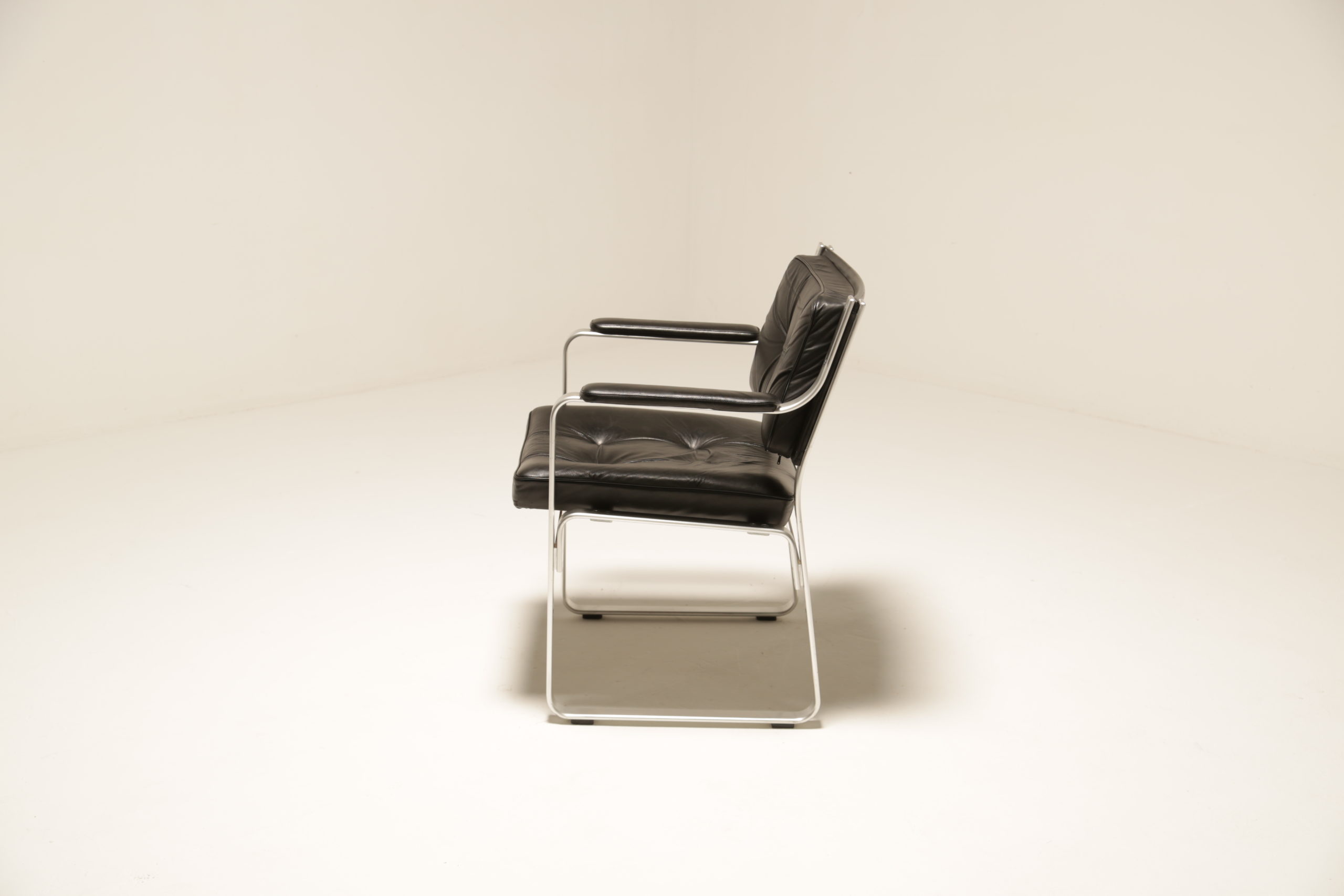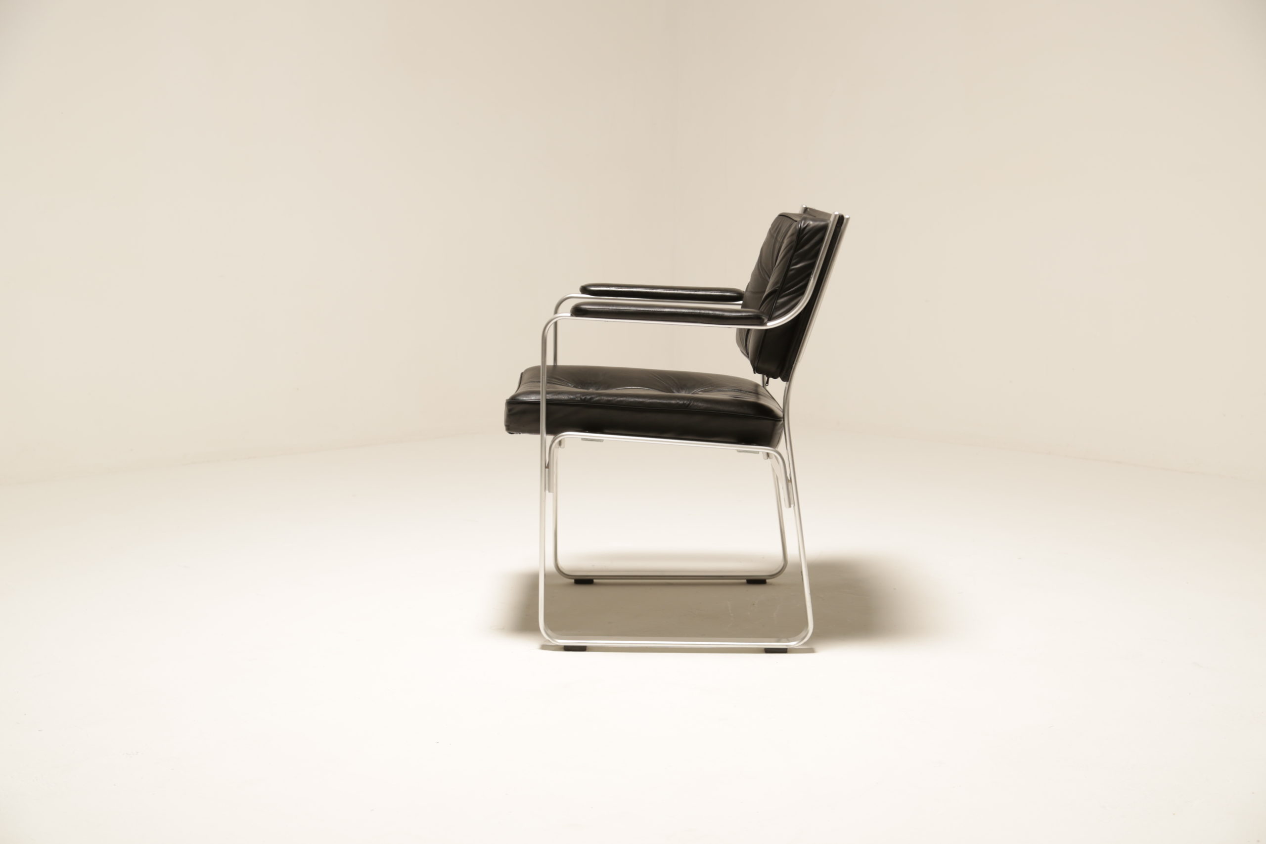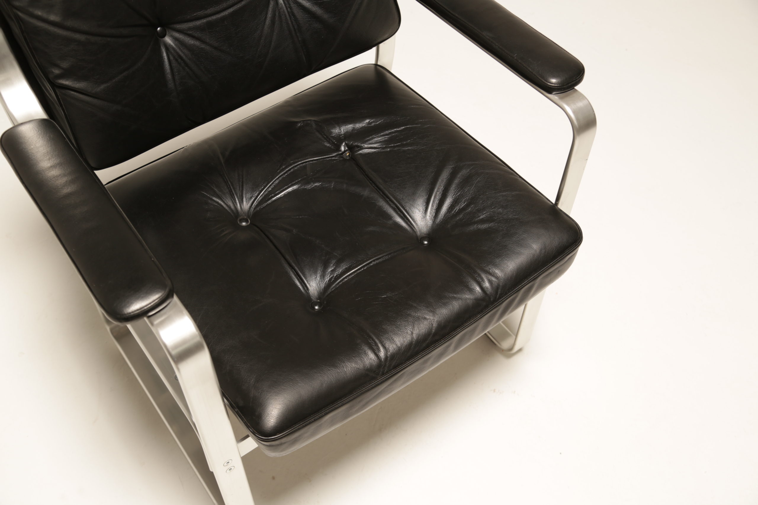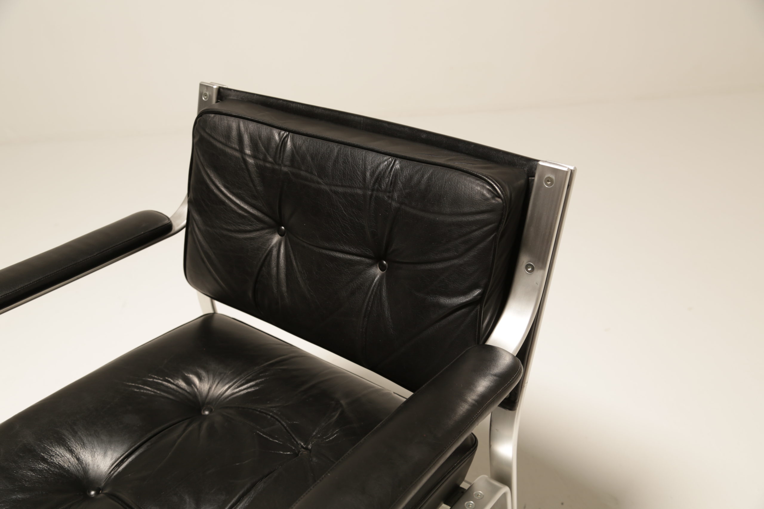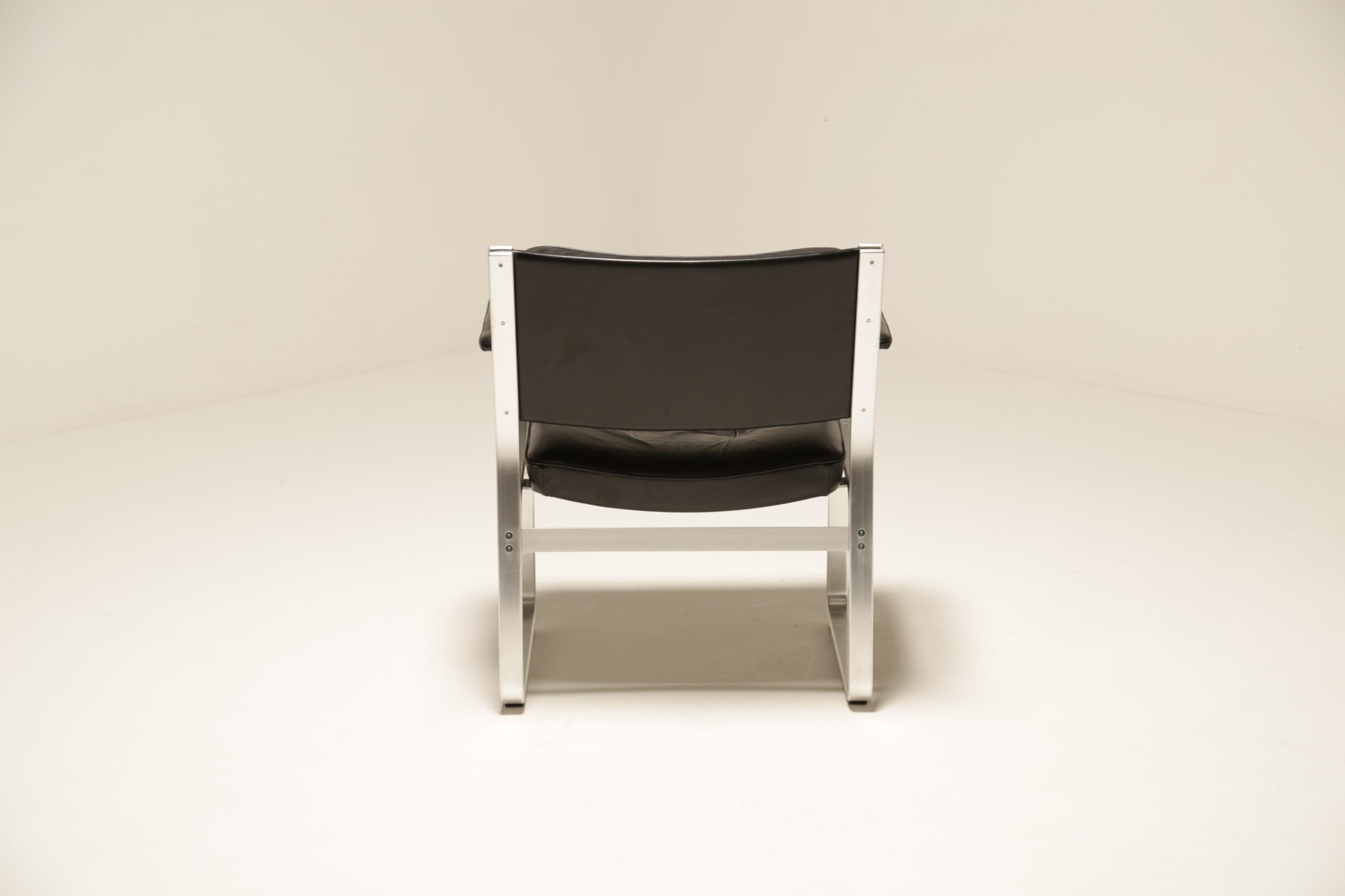 Super comfortable and stylish desk chair by Karl Ekselius for JOC Vetlanda, Sweden 1970s in black leather and robust aluminum frame. Suitable for a home or commercial office setting this stunning chair will not only have you sit comfortably but look stylish at the same time. We have used a leather balm to restore the color of the leather and applied a protection cream. Chair has an attribution mark on the underside as highlighted in the photograph.